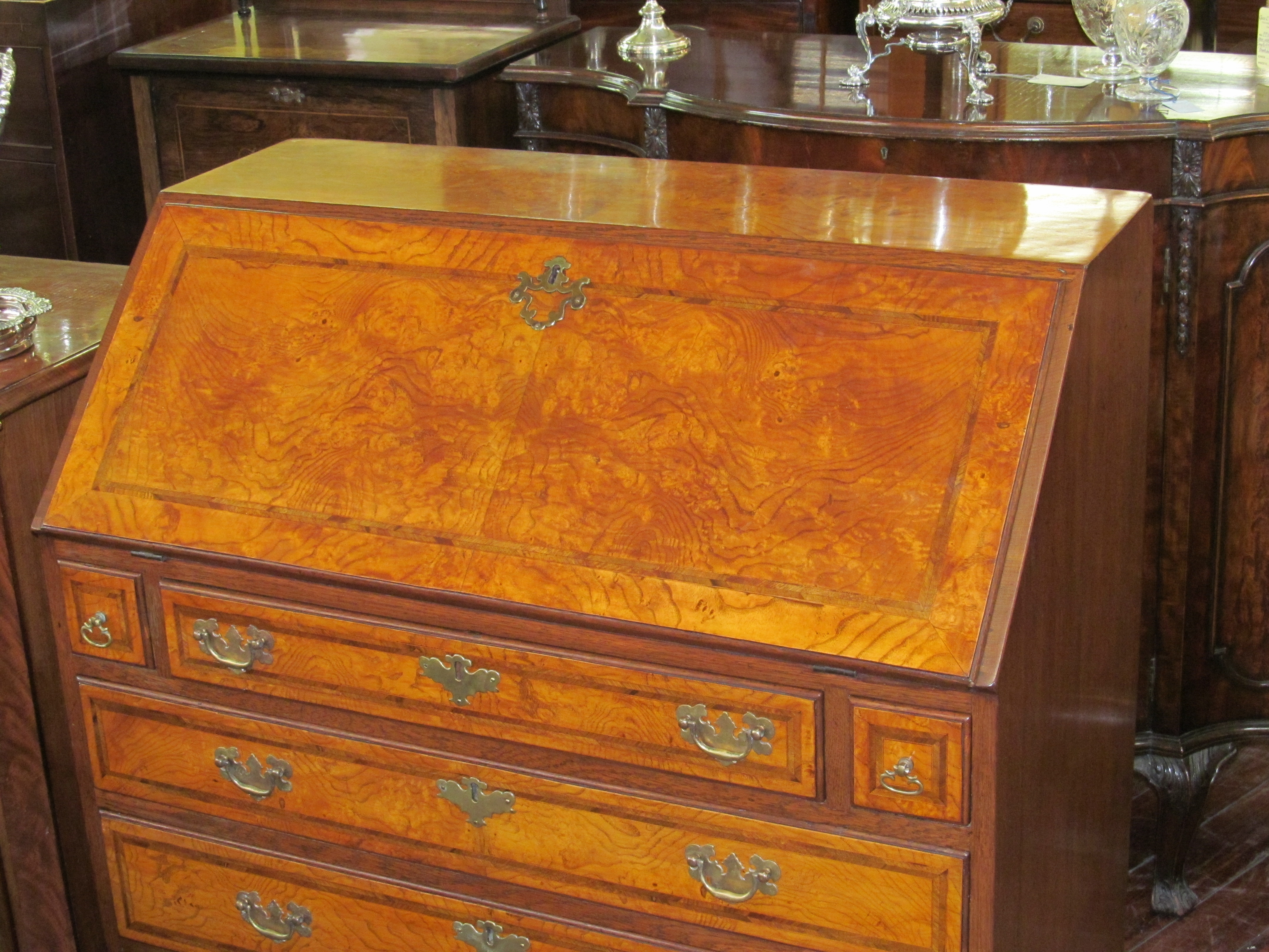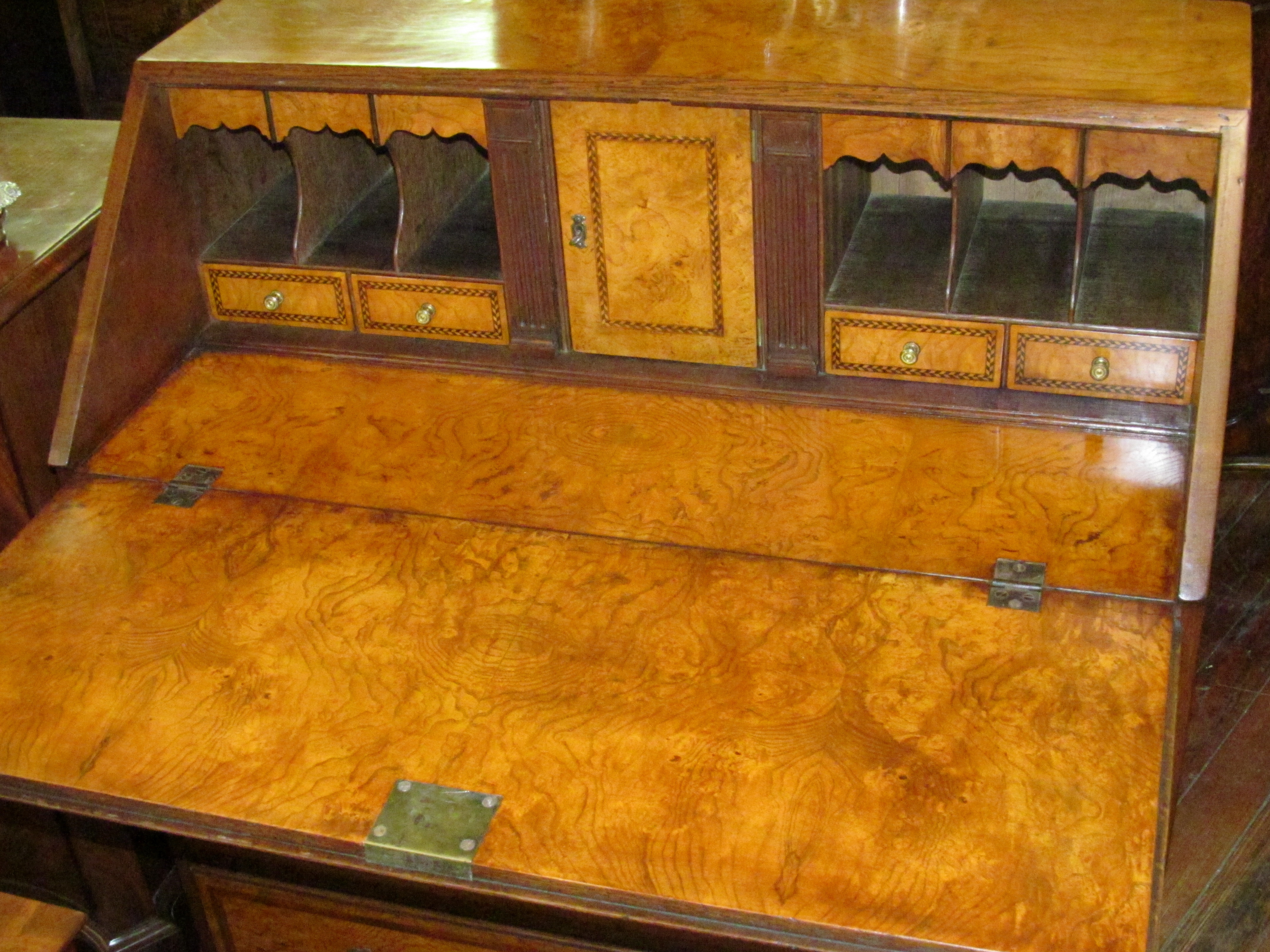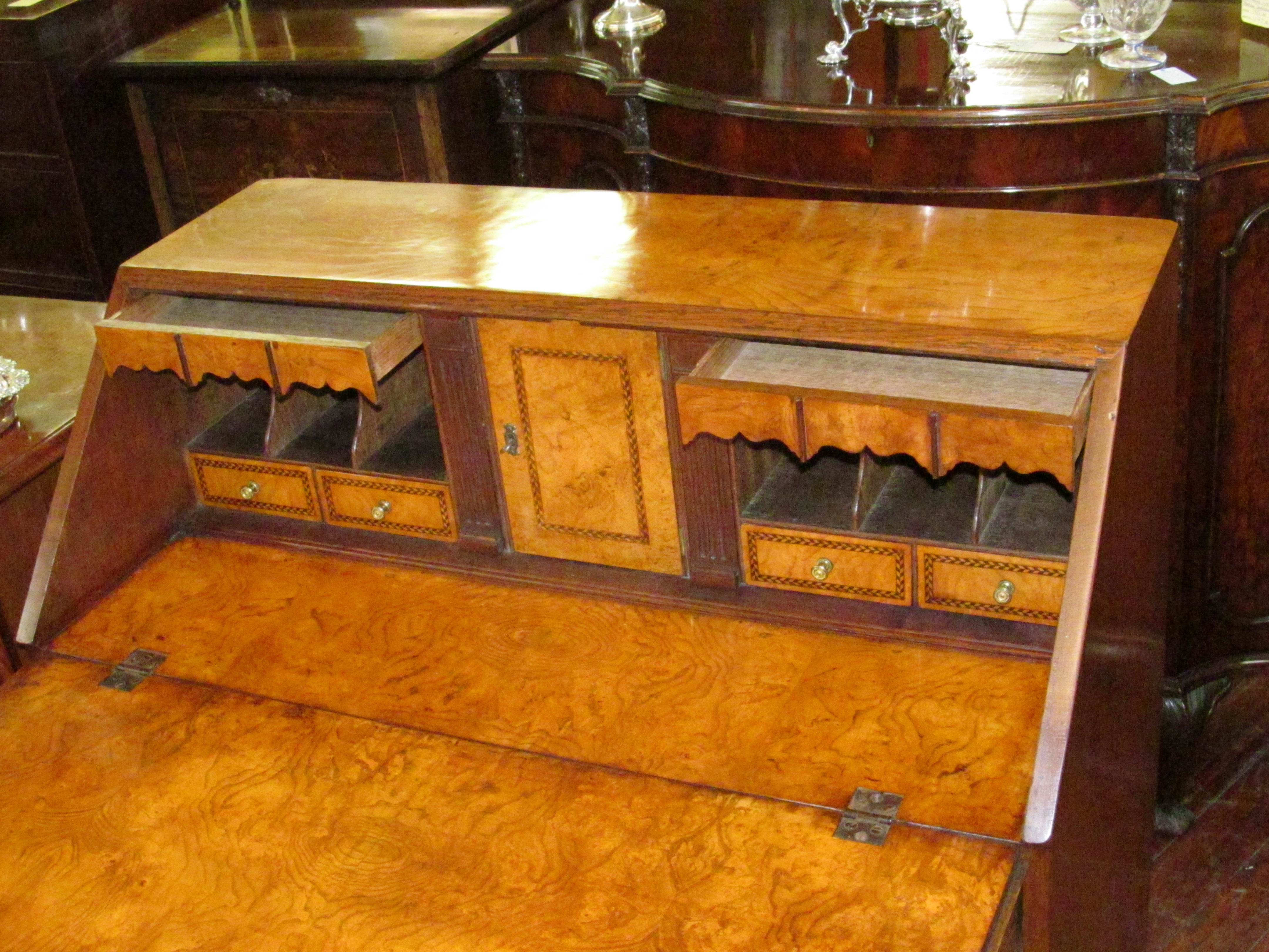 Superb Quality Antique English Geo. III Inlaid Burr ash and quarter sawn Oak Chippendale Style Slantfront Bureau with handsome inlaid and fitted interior