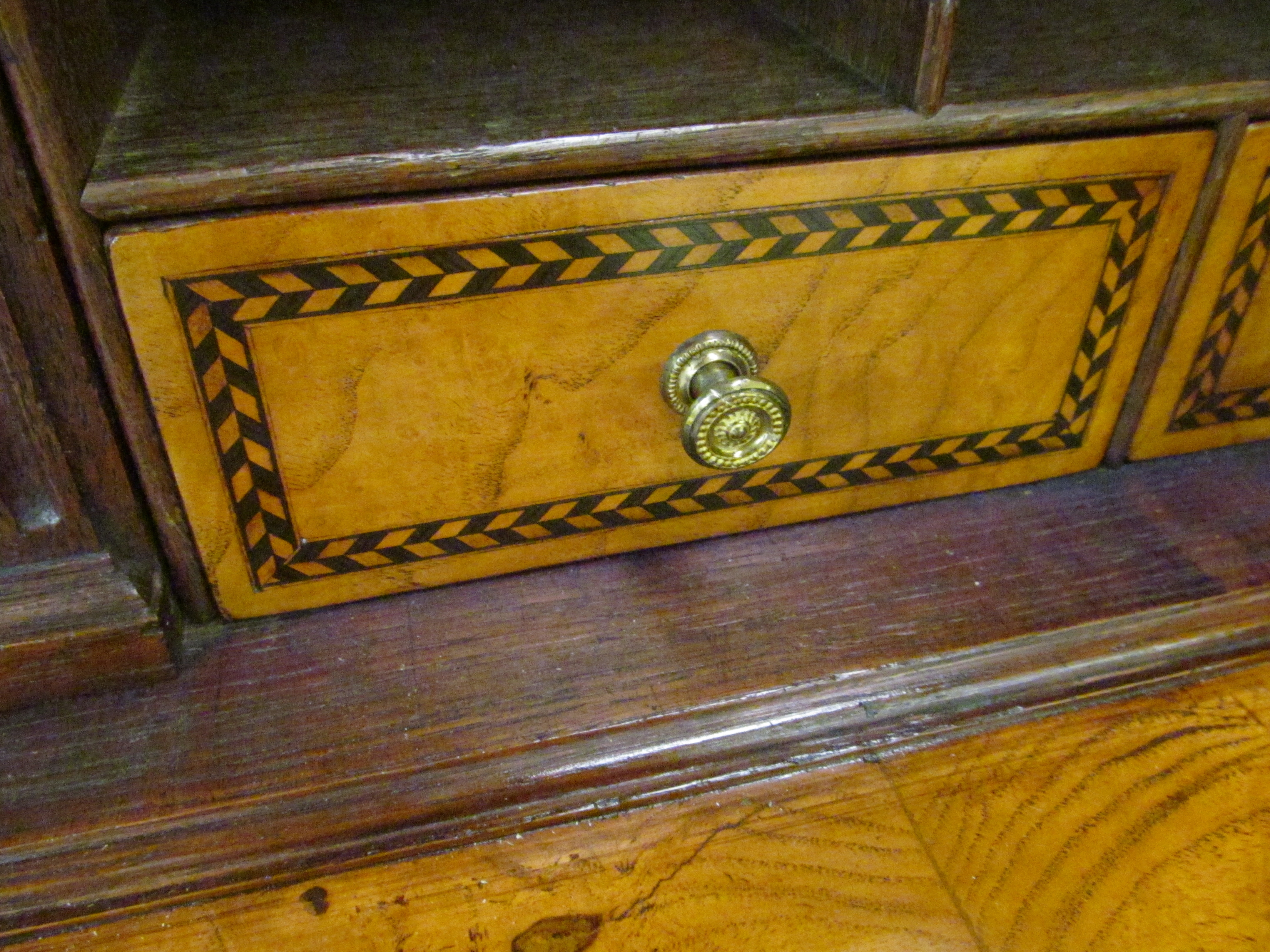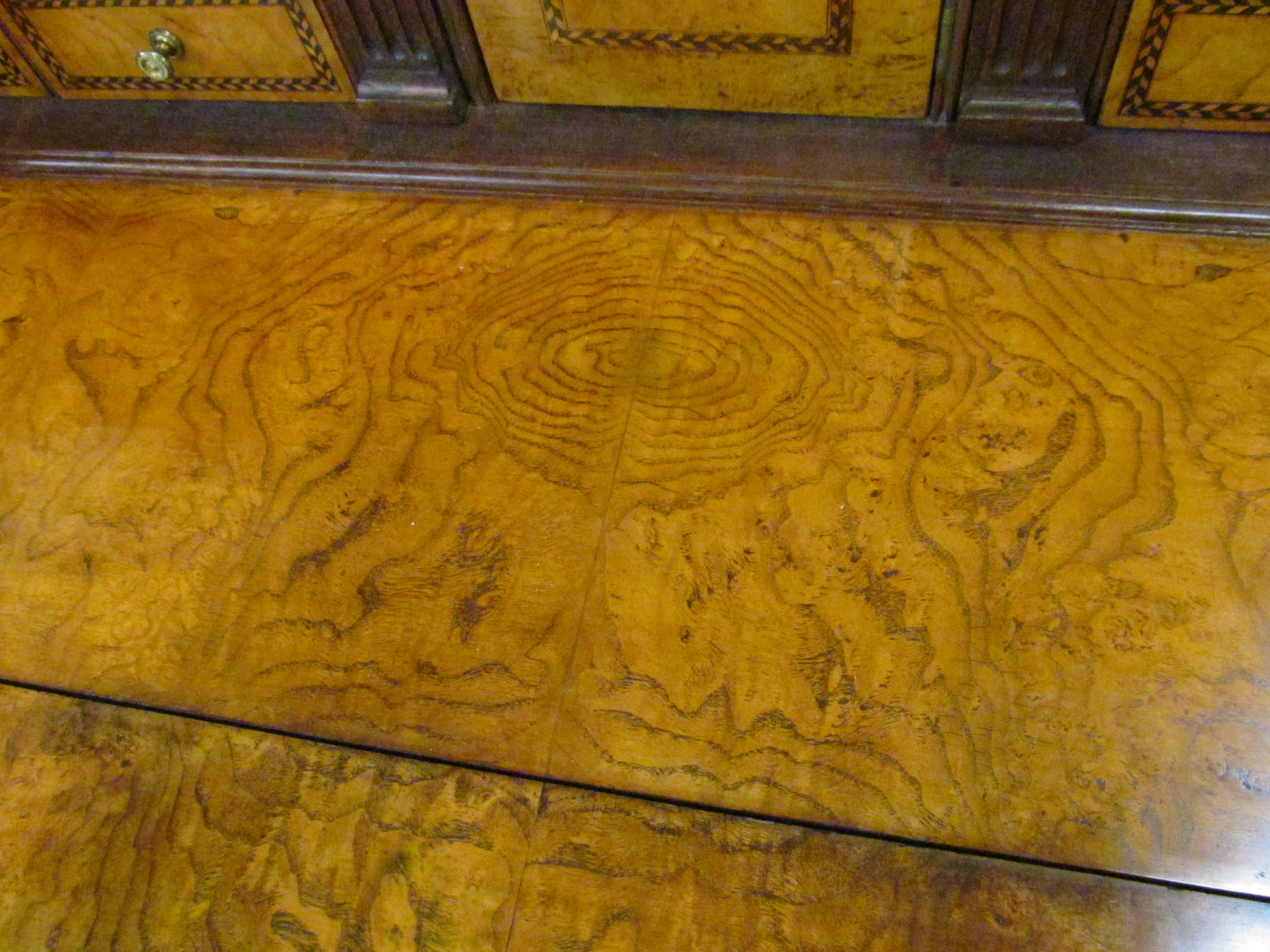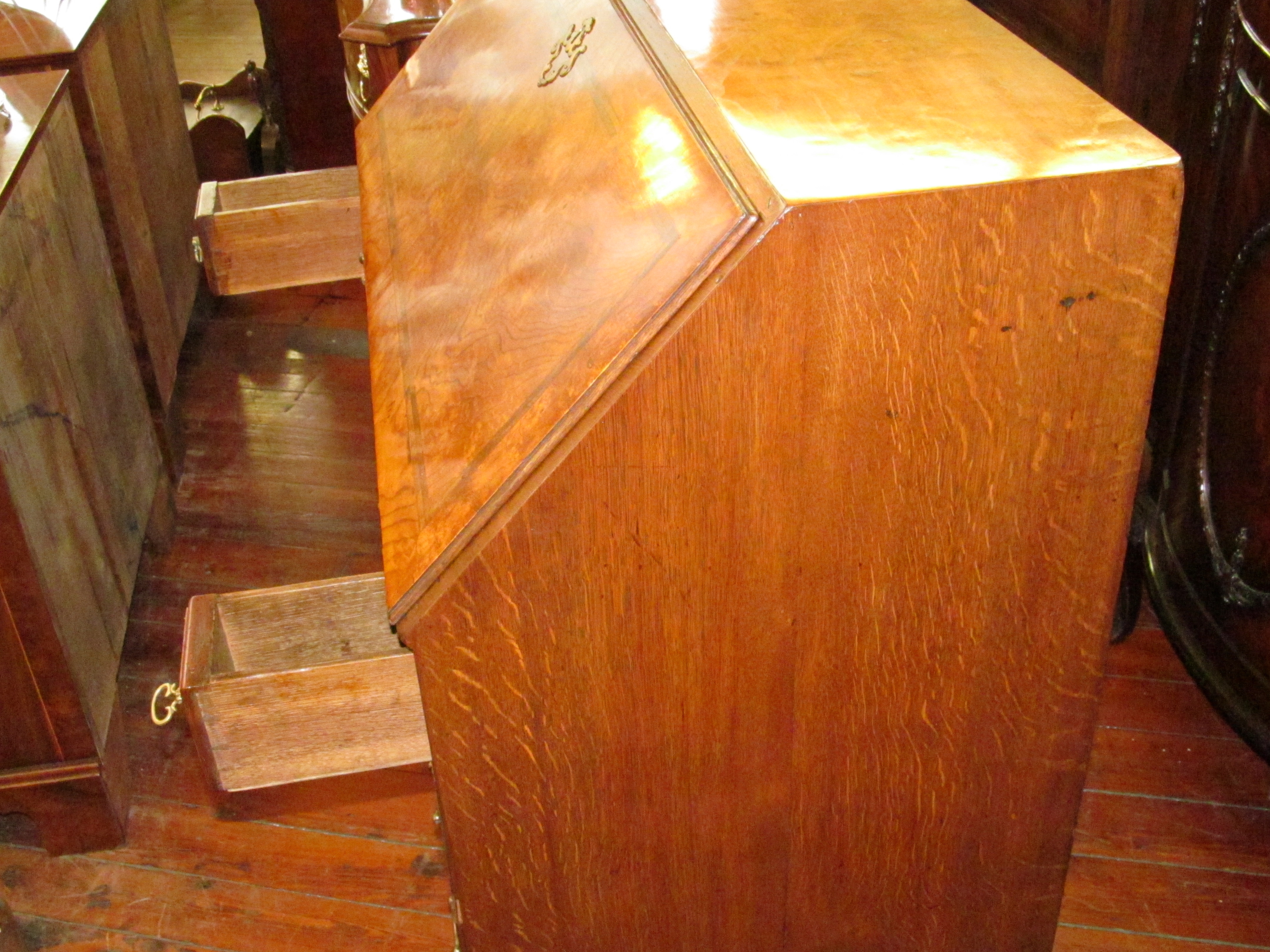 Superb Quality Antique English Geo. III Inlaid Burr ash and quarter sawn Oak Chippendale Style Slantfront Bureau with handsome inlaid and fitted interior