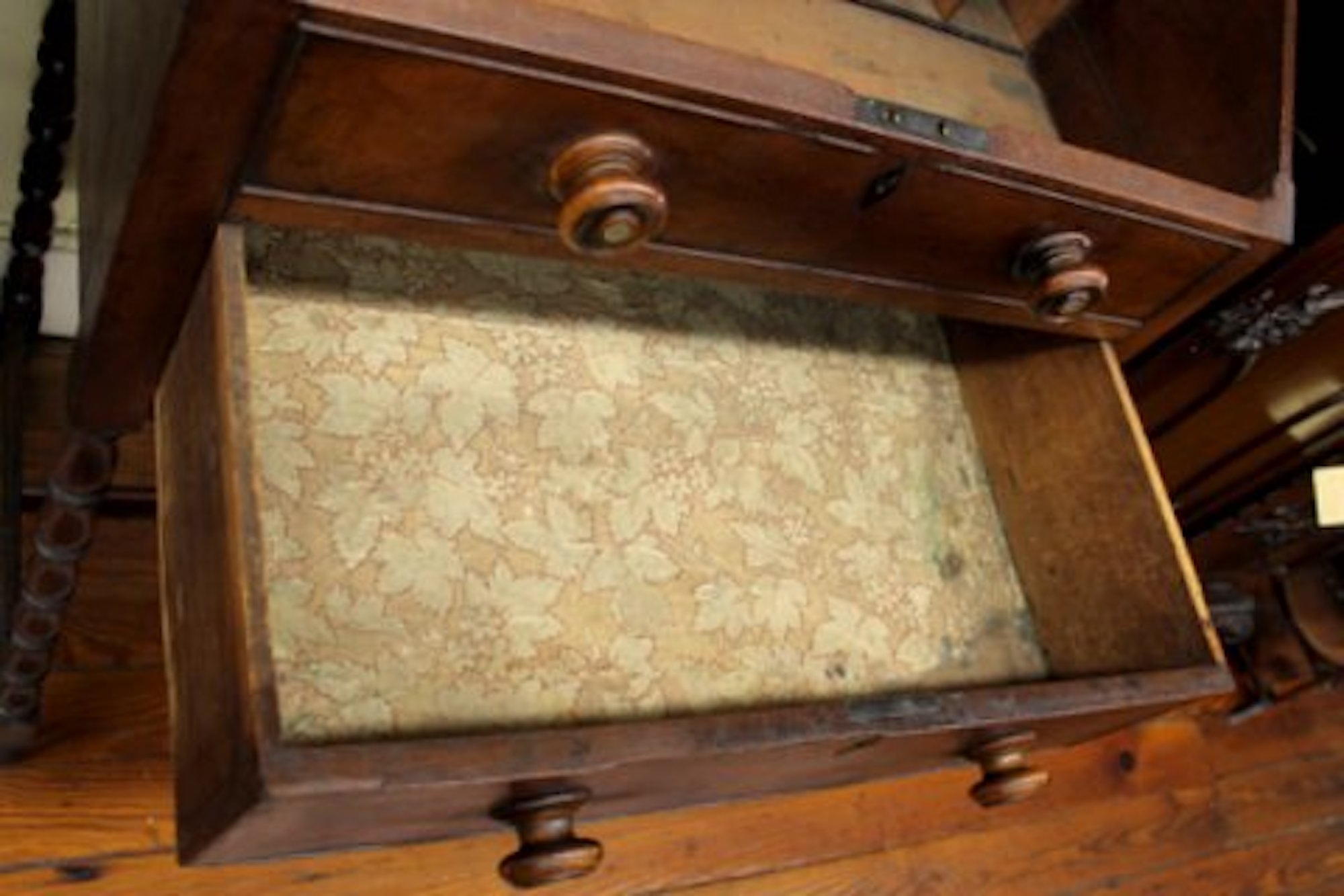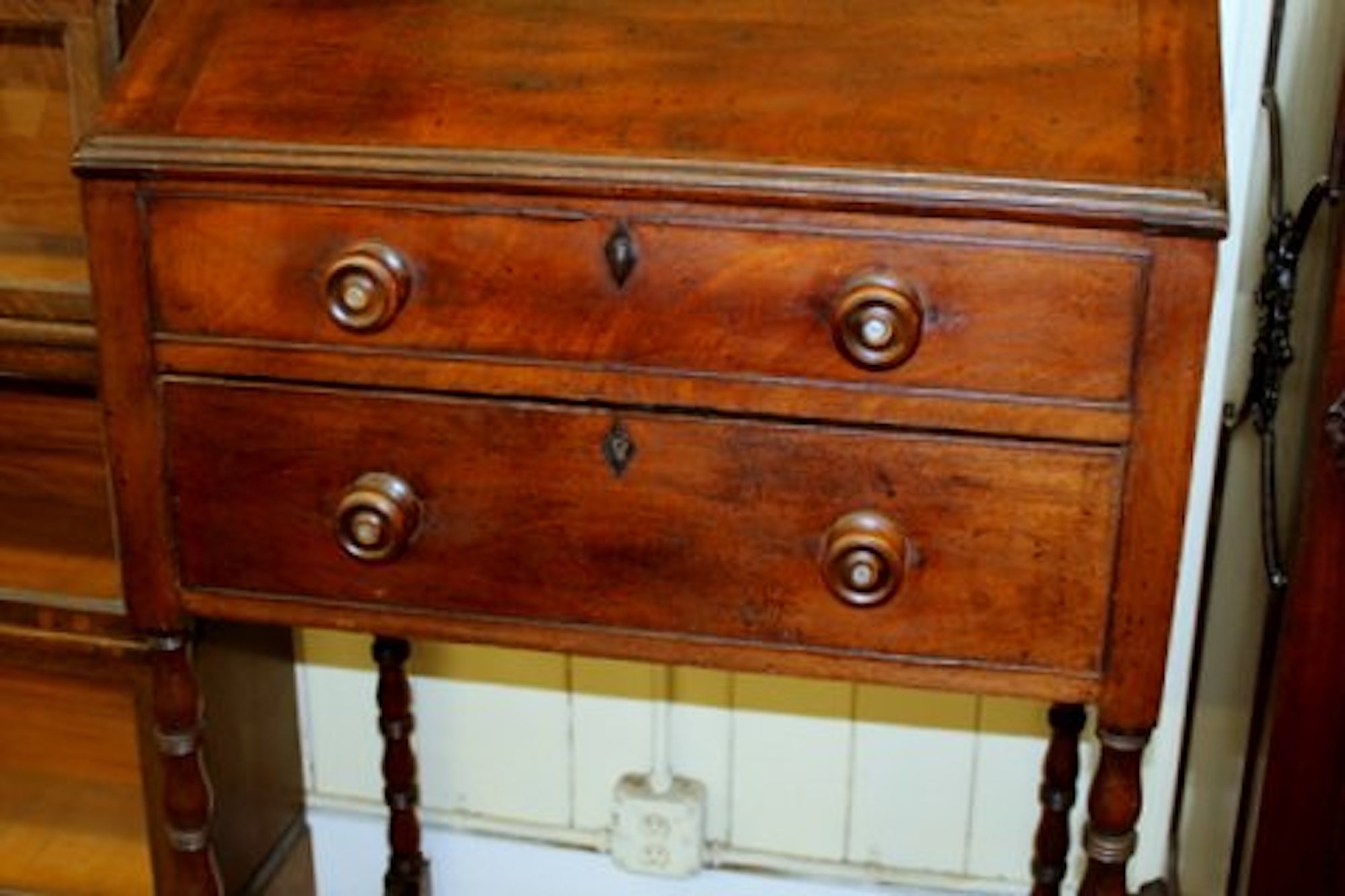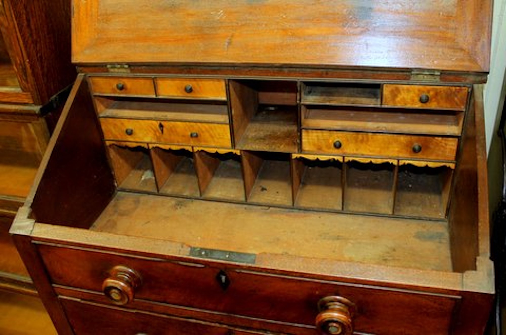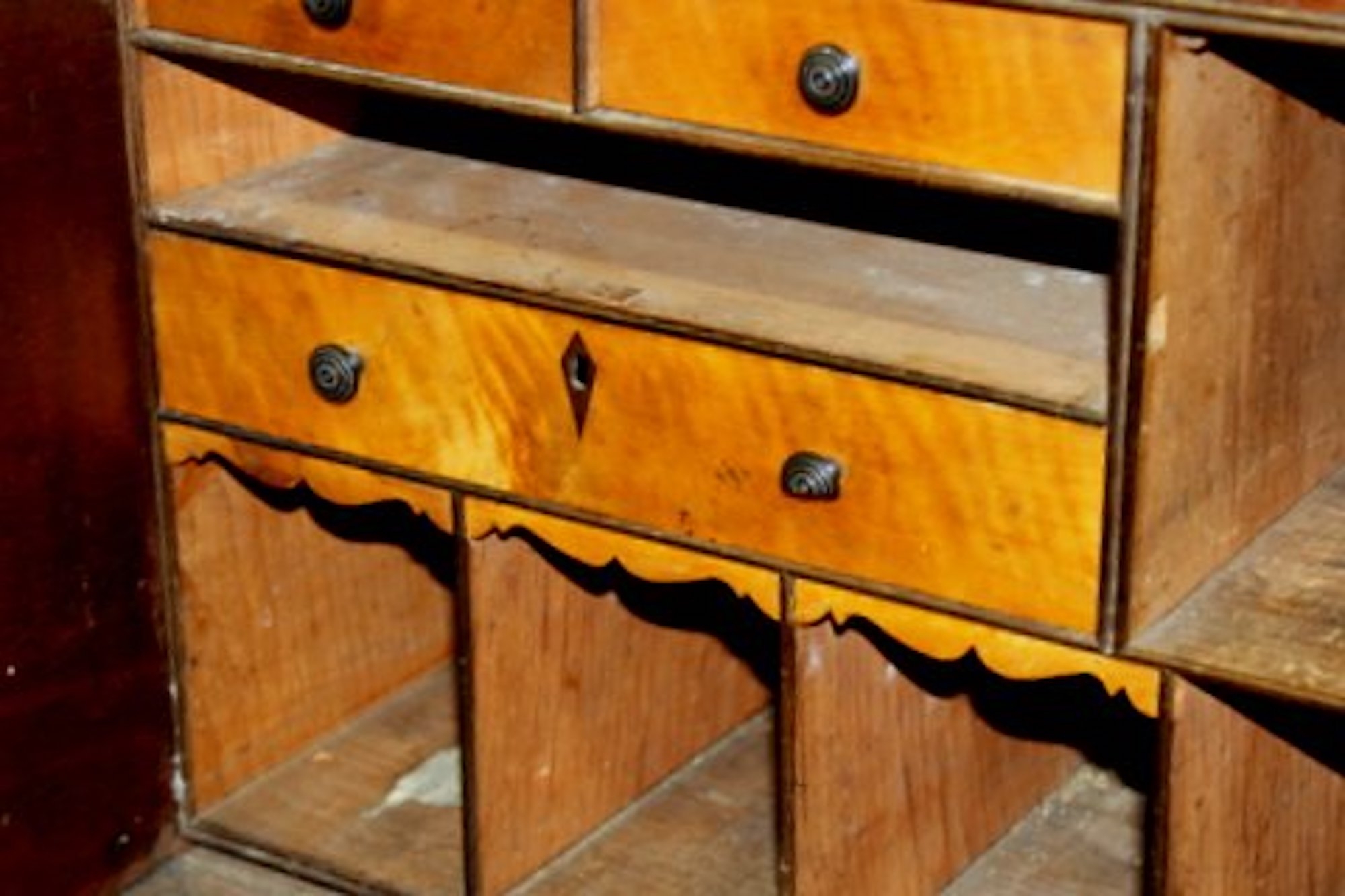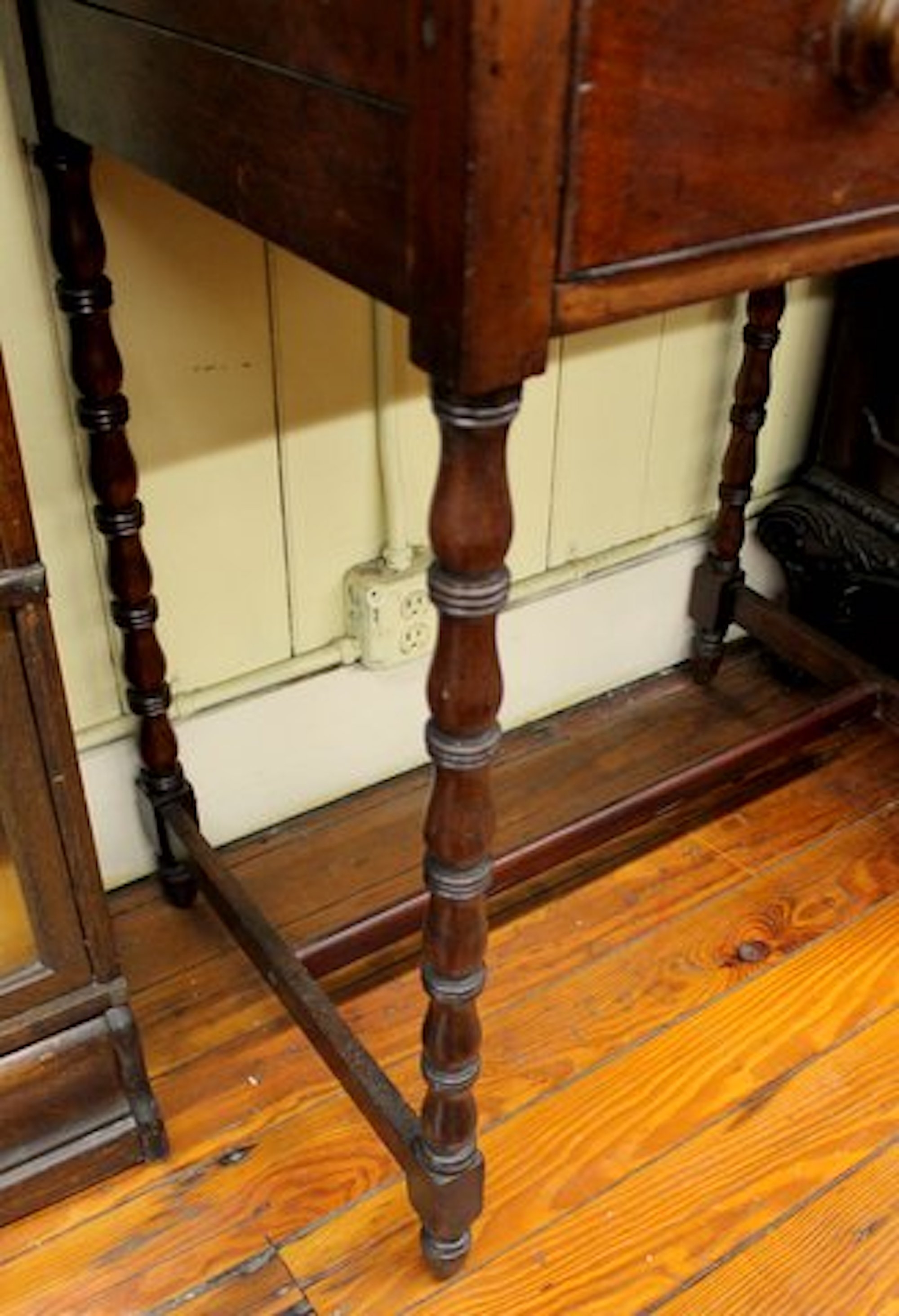 Please note handsome Bobbin or spool-turned legs. Also, note several interior drawers are missing as is the center prospect cupboard door and some of the cock-beading, but all of this has been accounted for in the price of this rare and original Clerk’s Desk.