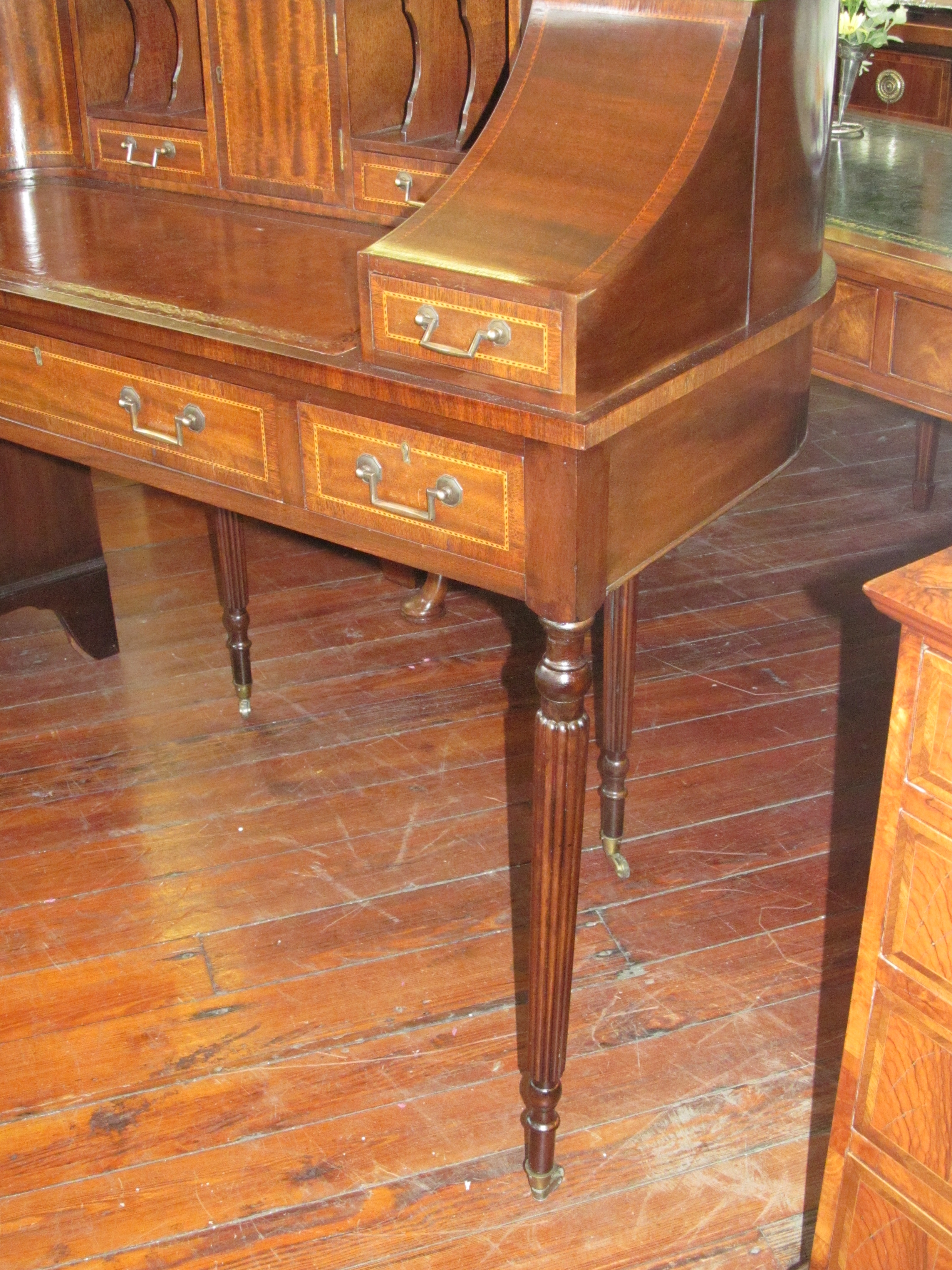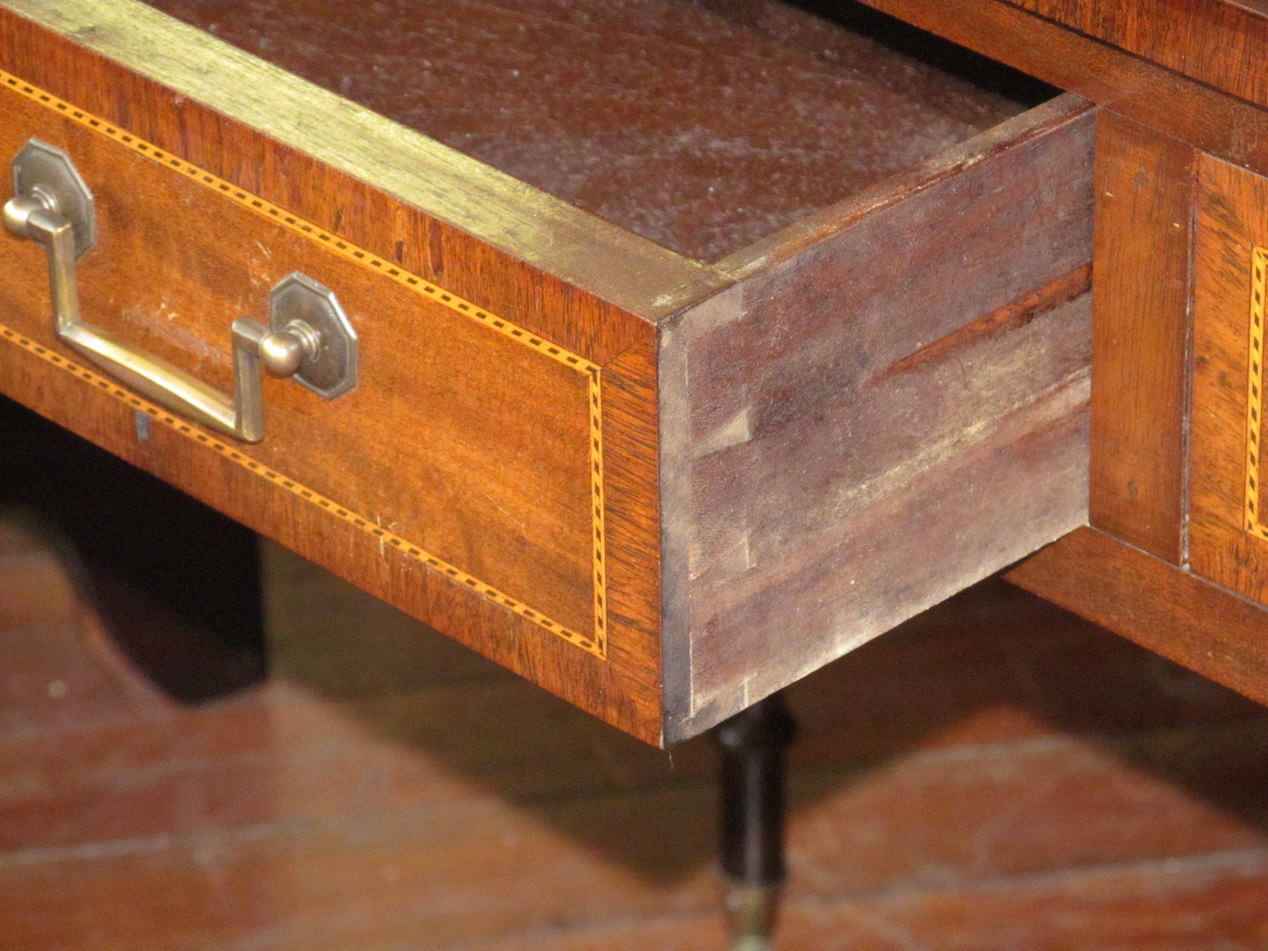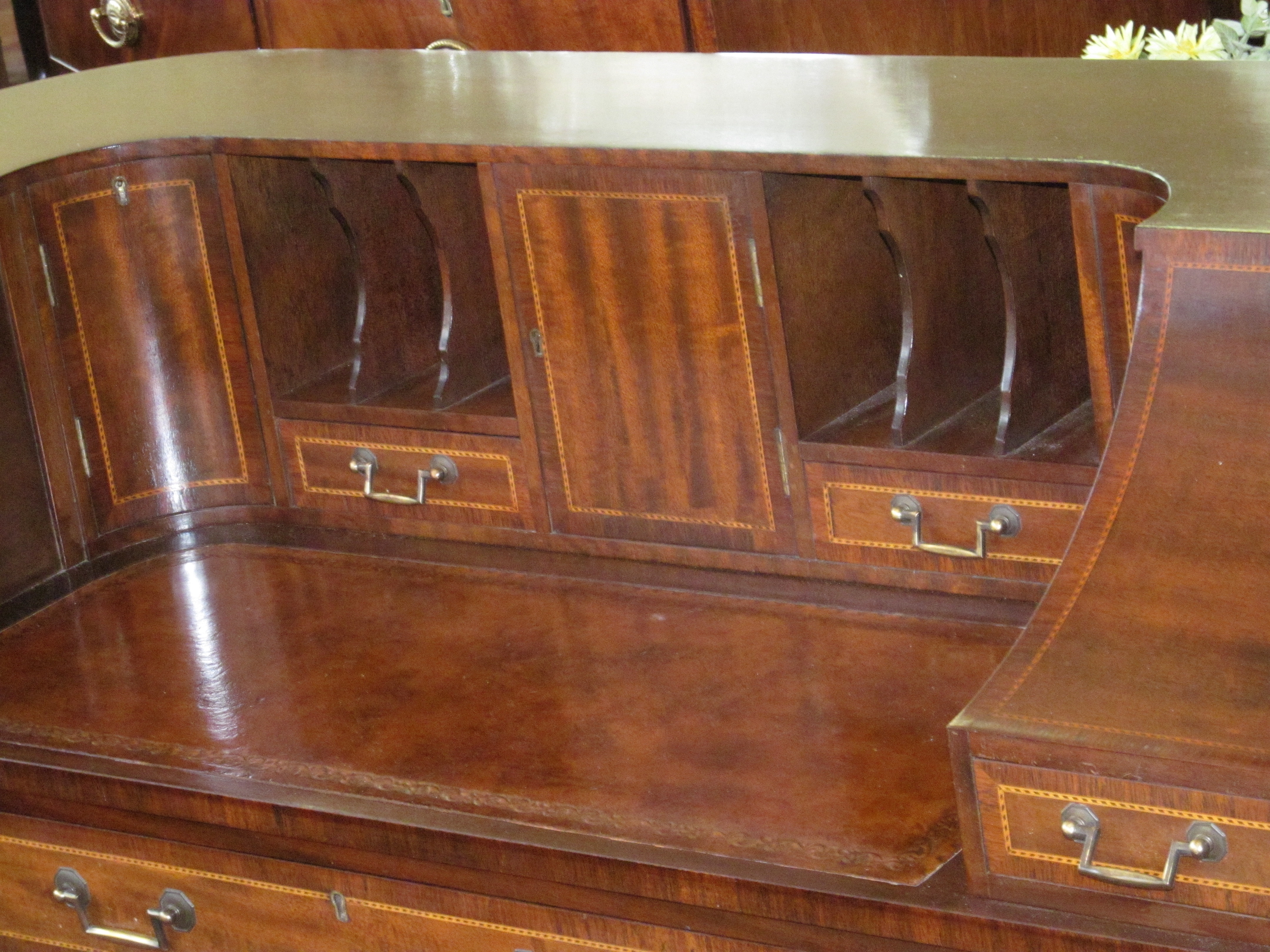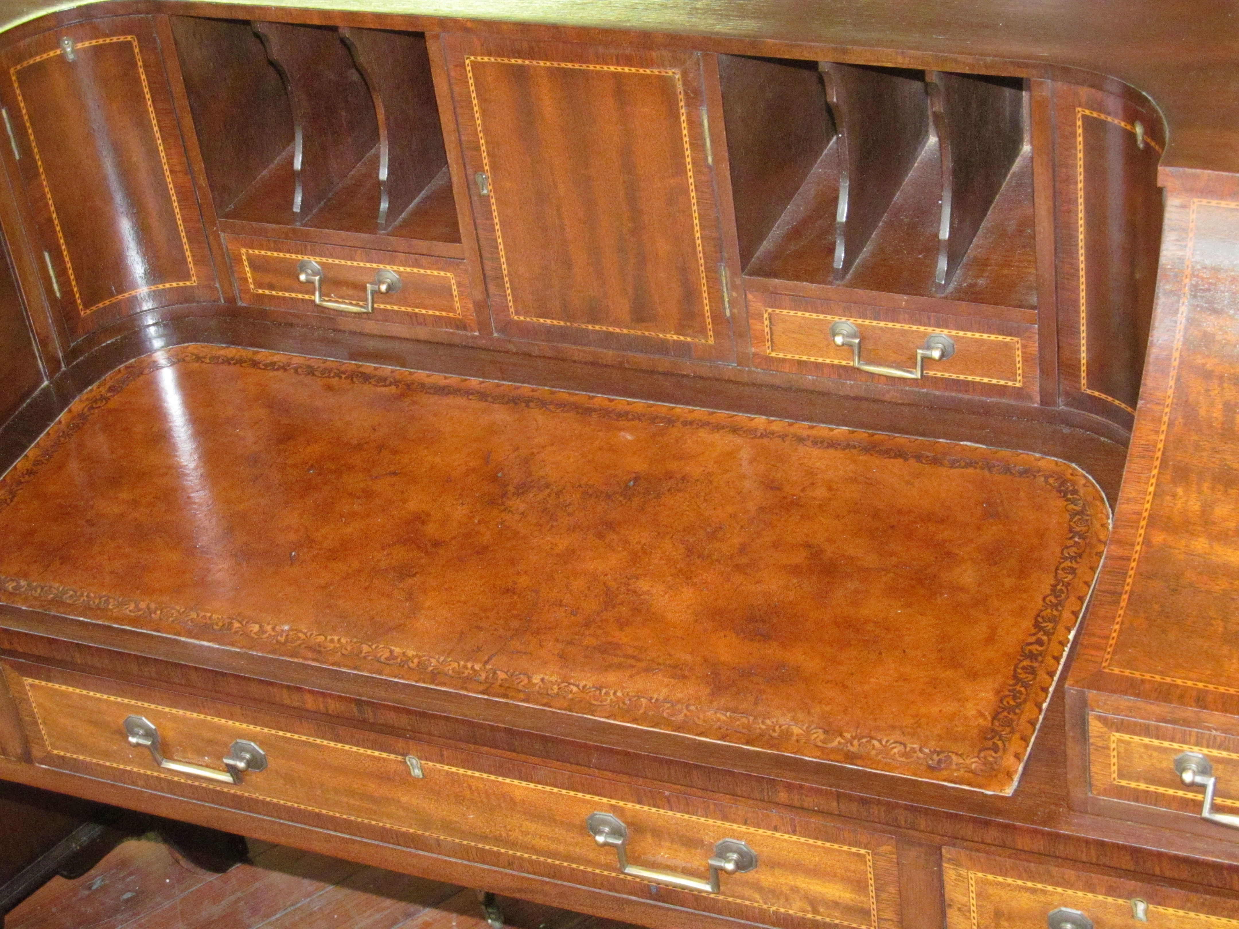 Superb Quality Old English Inlaid Mahogany Sheraton Style tooled and gift leather top Carlton House Desk.
