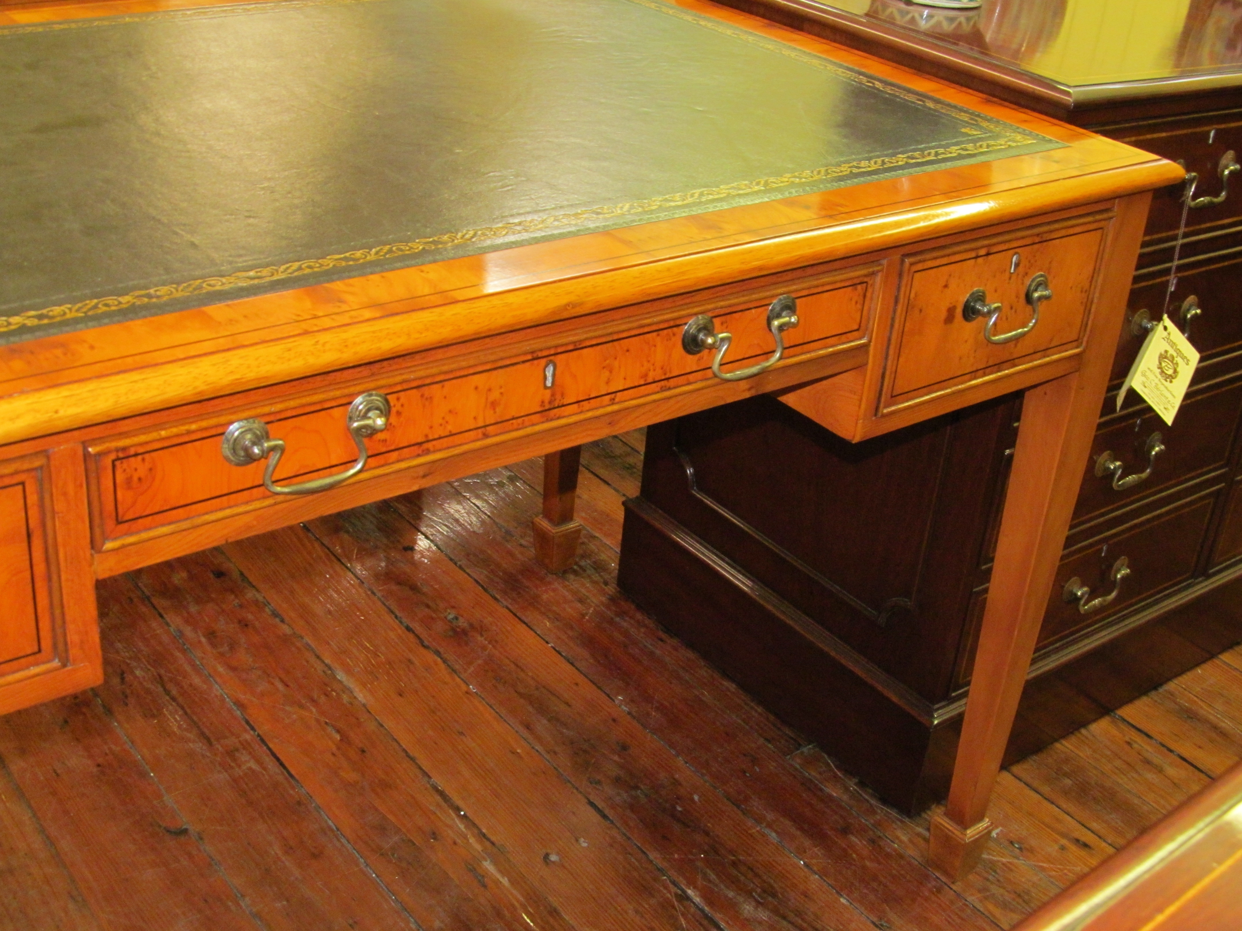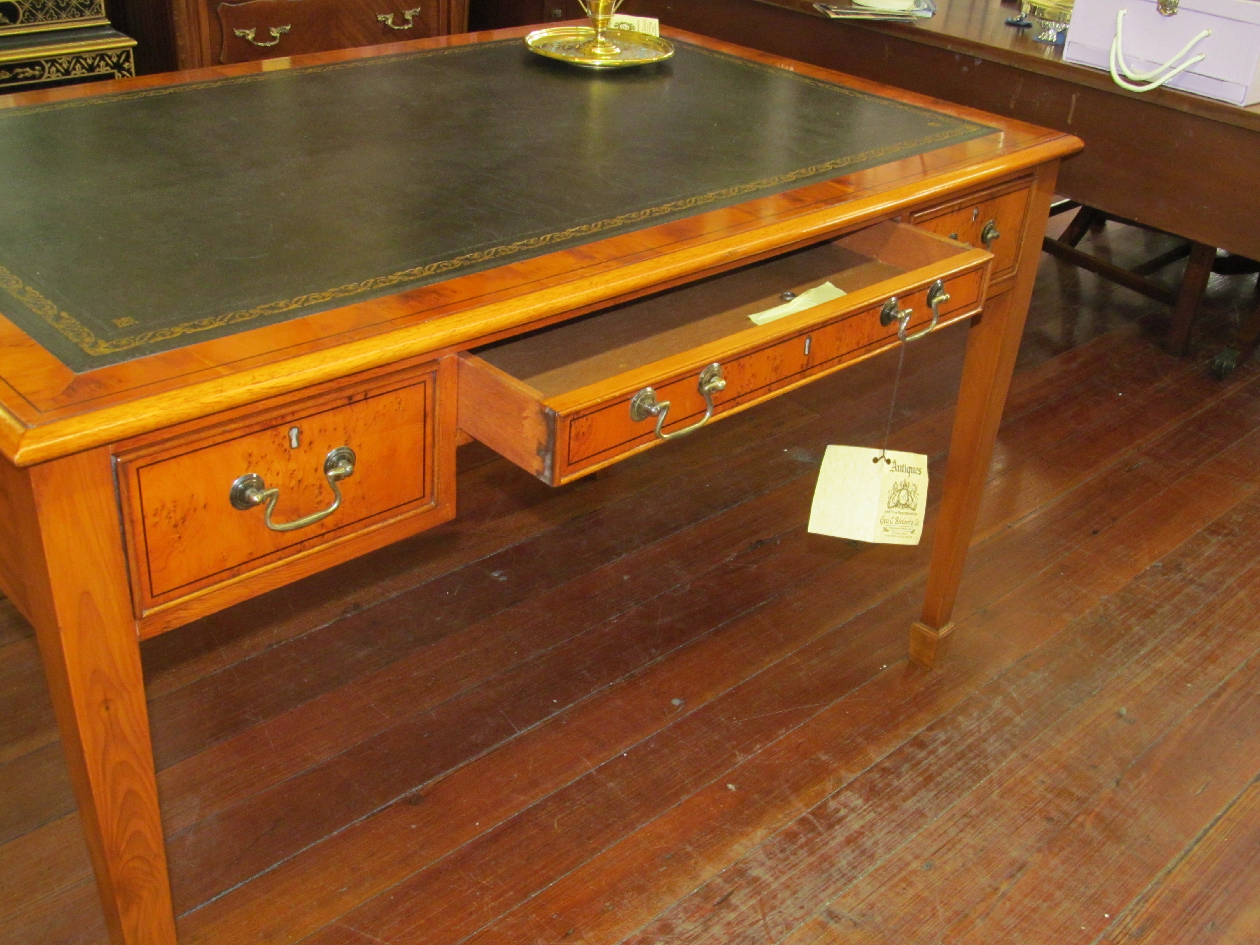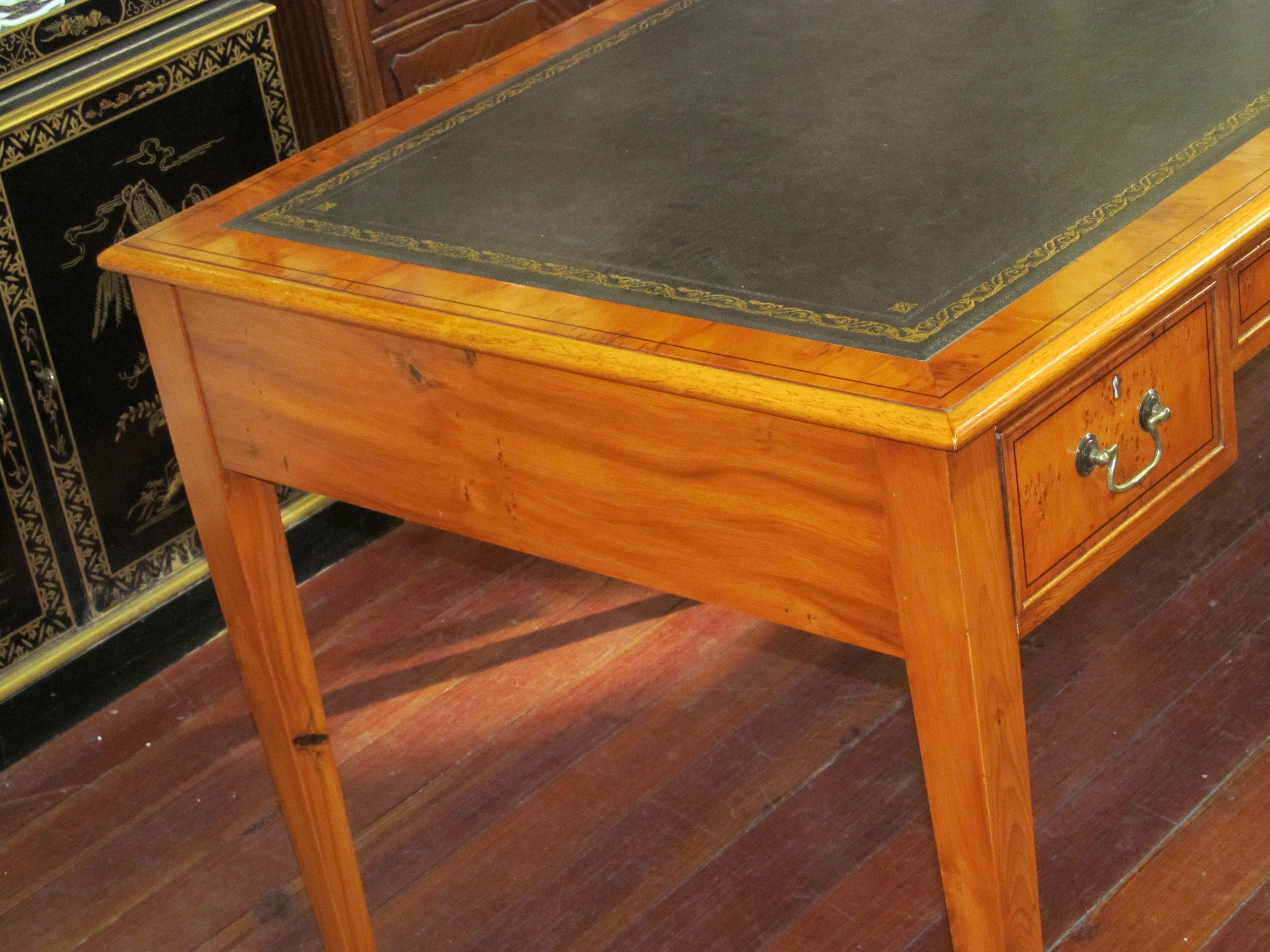 Superb Quality English Bench Made Inlaid “Pippy” Yewwood Hepplewhite Style Freestanding Writing Table with tooled and gilt leather.
