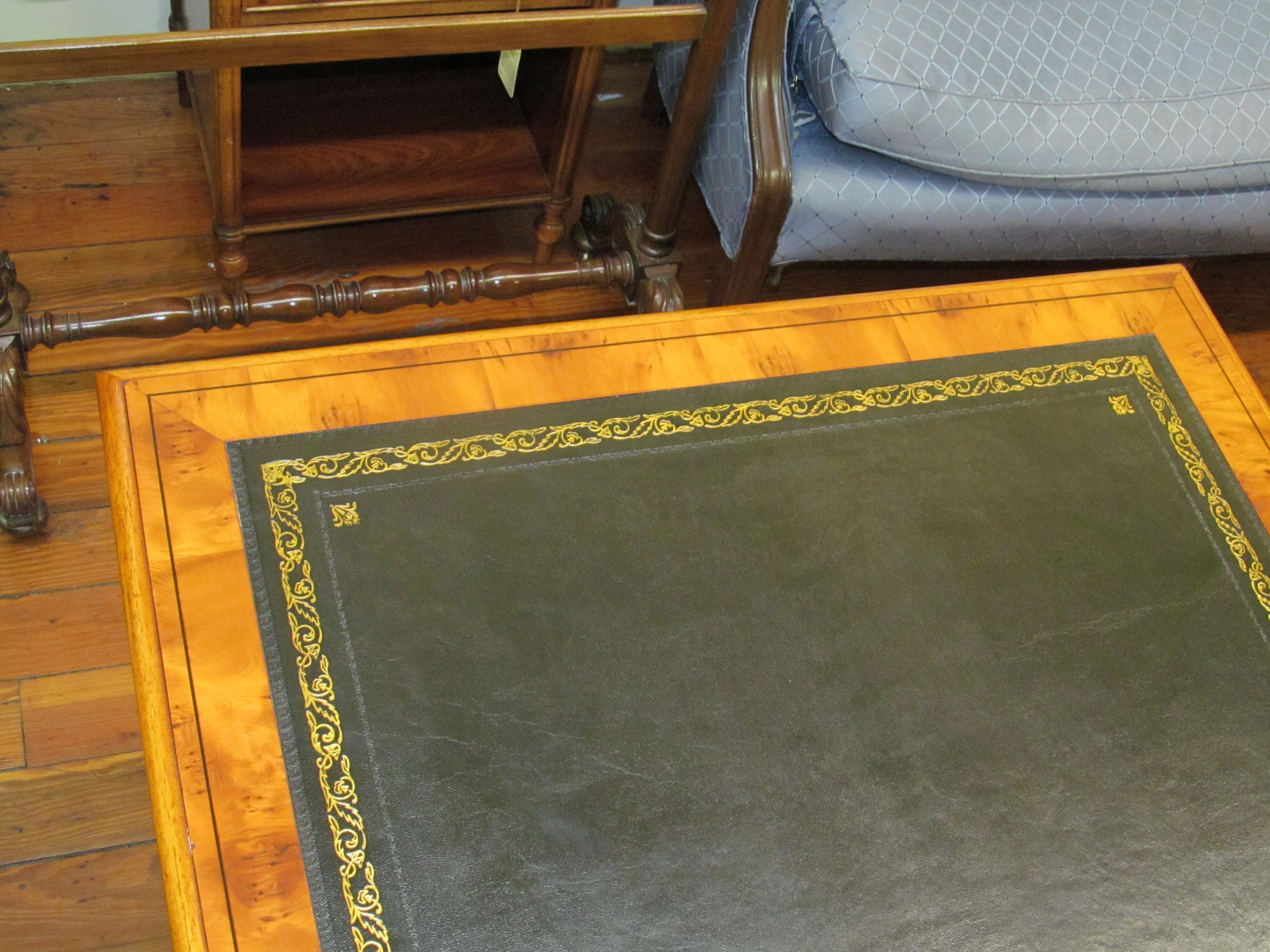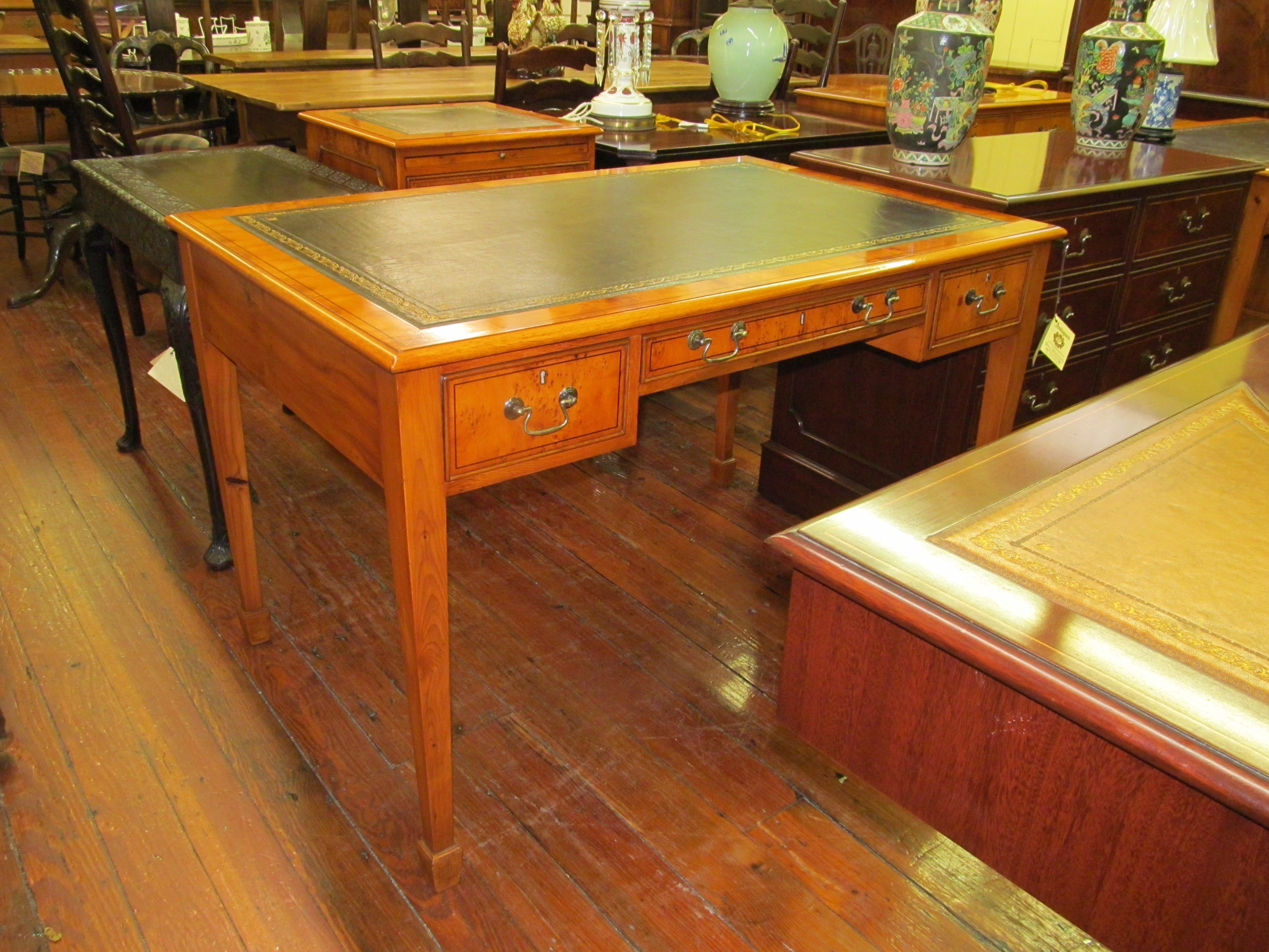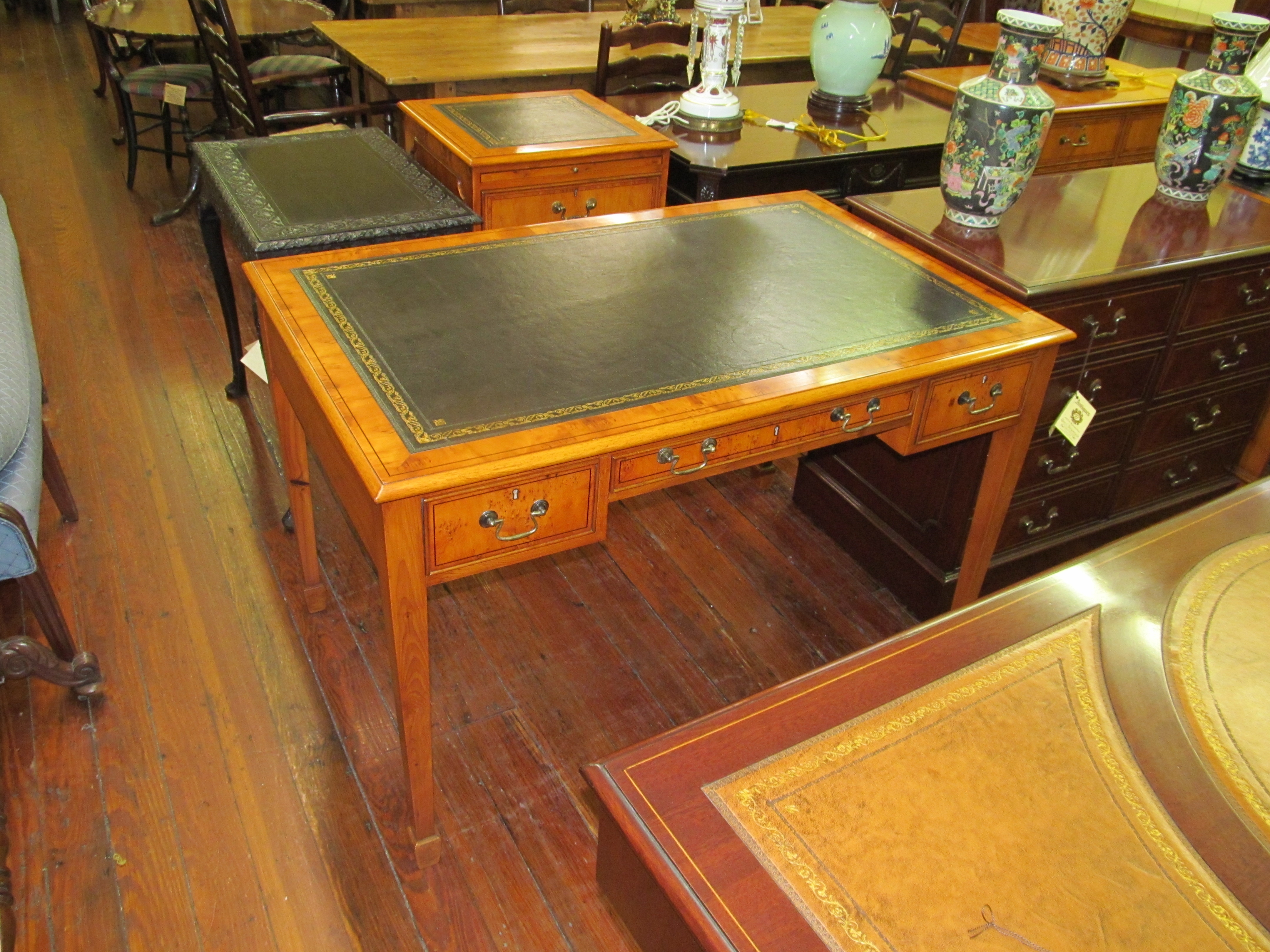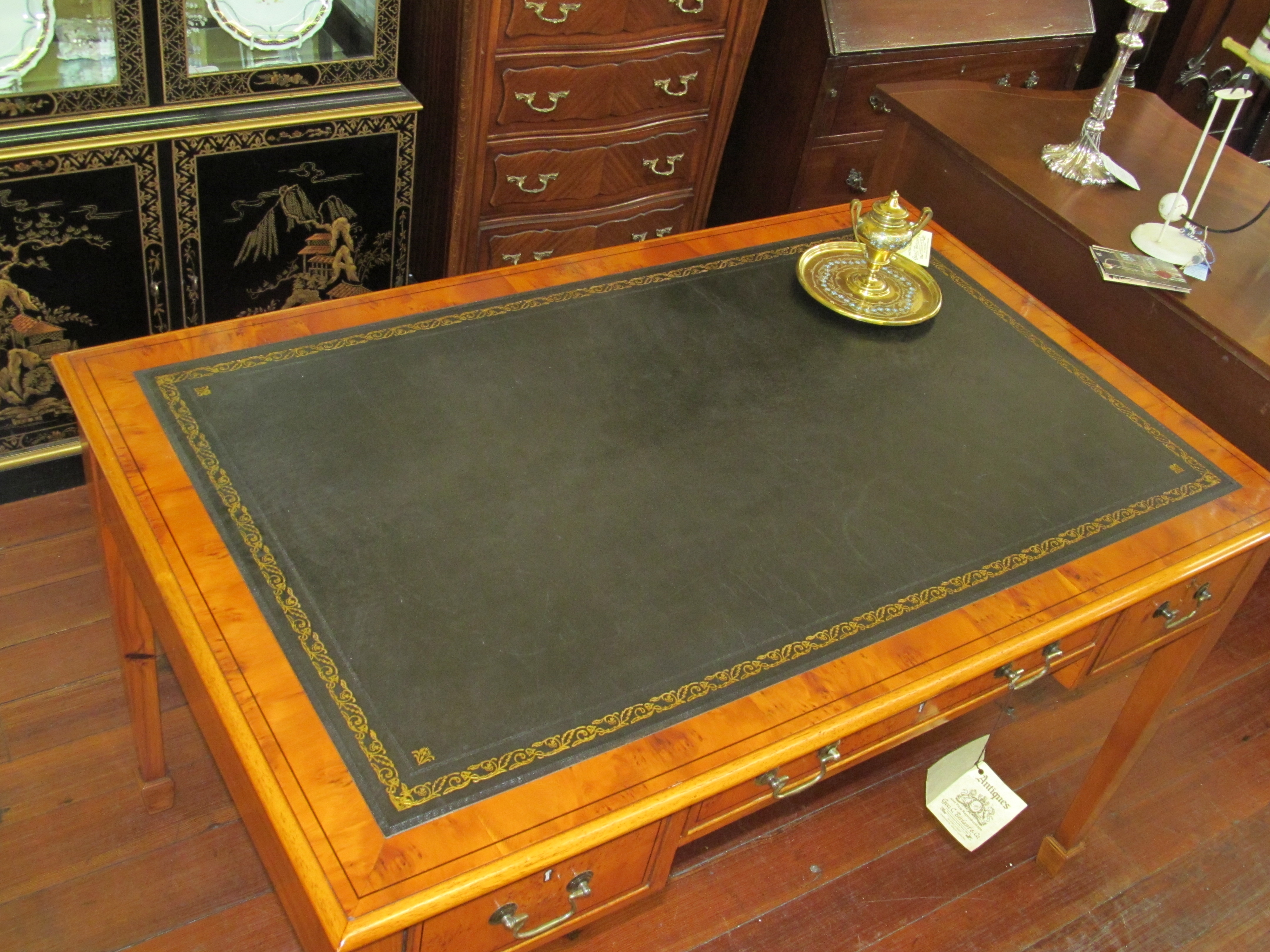 Superb Quality English Bench Made Inlaid “Pippy” Yewwood Hepplewhite Style Freestanding Writing Table with tooled and gilt leather.