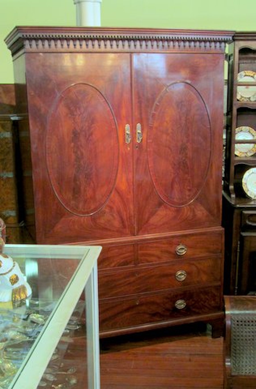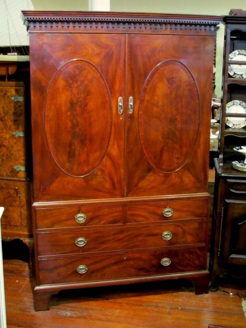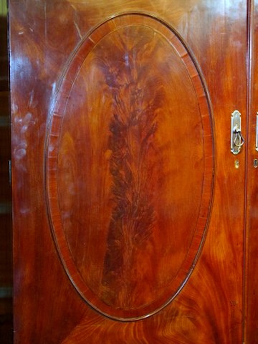 Fabulous Quality Antique English Figured Mahogany Chippendale Style Linen Press with Inset Oval Panel Doors and Peardrop Moulding