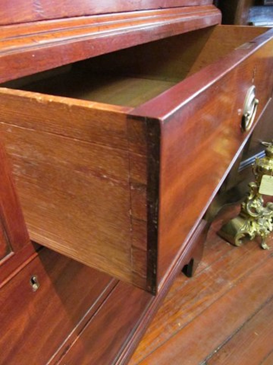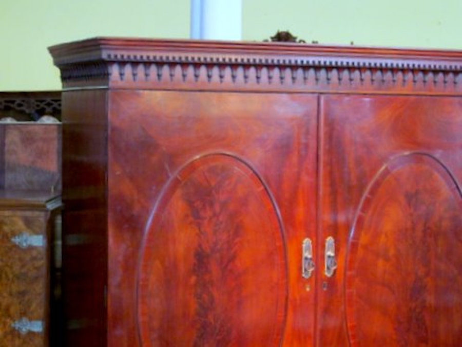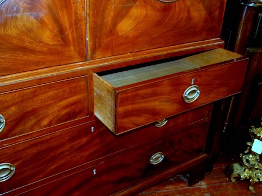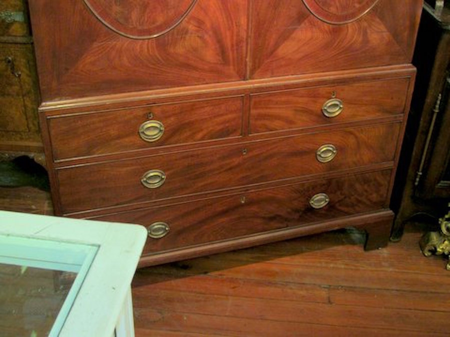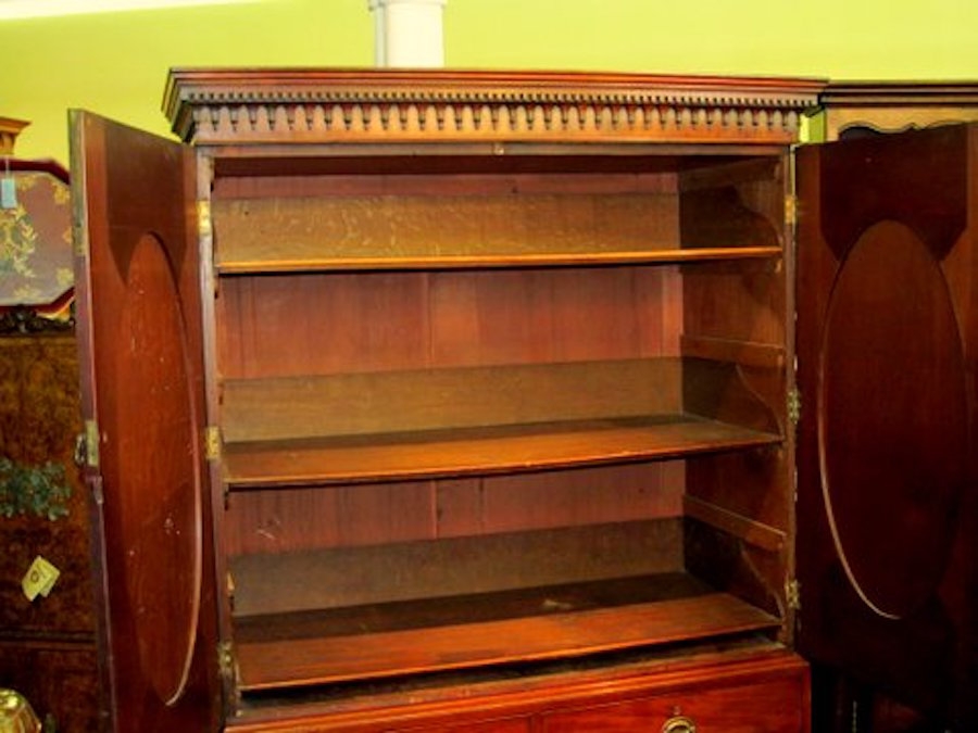 Fabulous Quality Antique English Figured Mahogany Chippendale Style Linen Press with Inset Oval Panel Doors and Peardrop Moulding