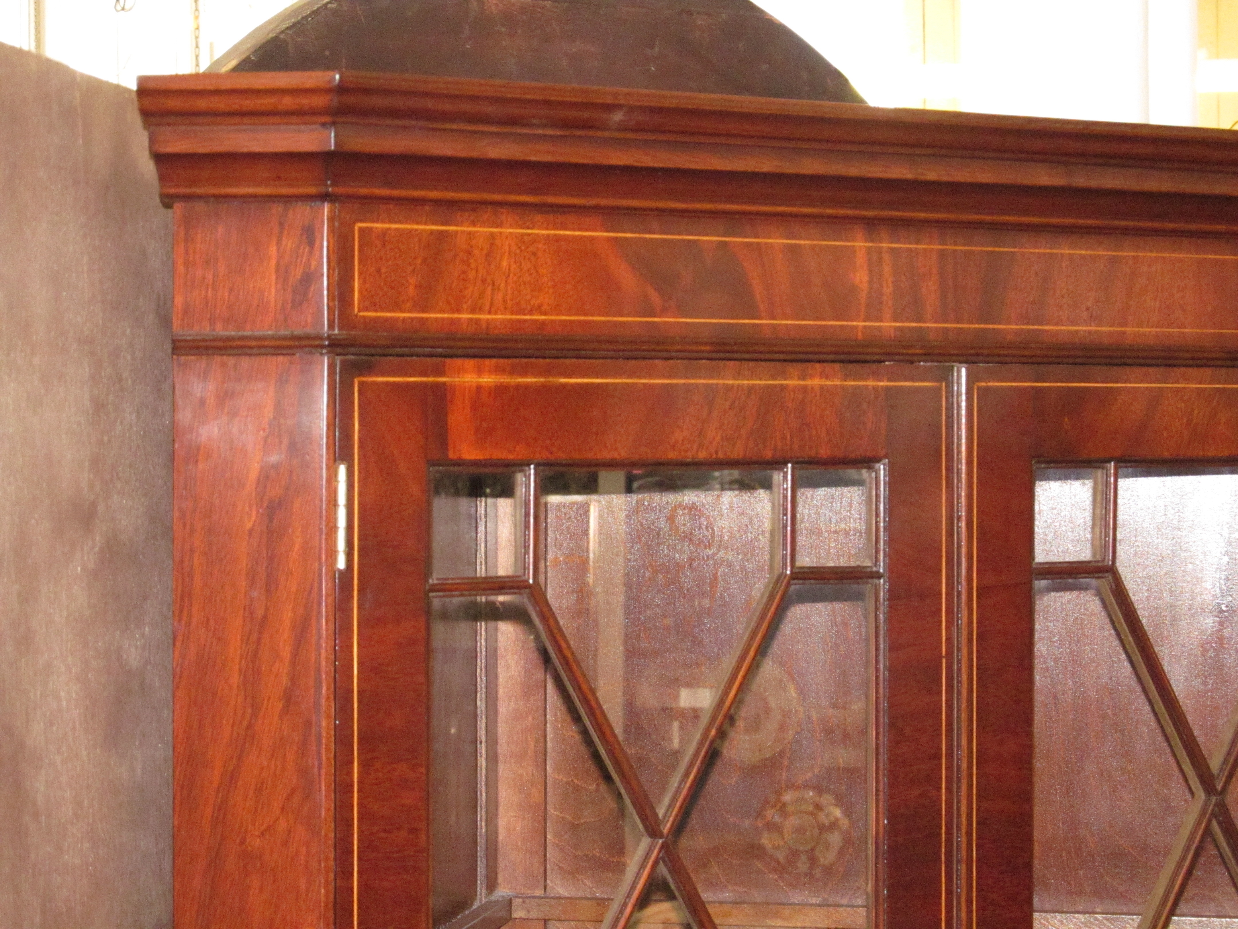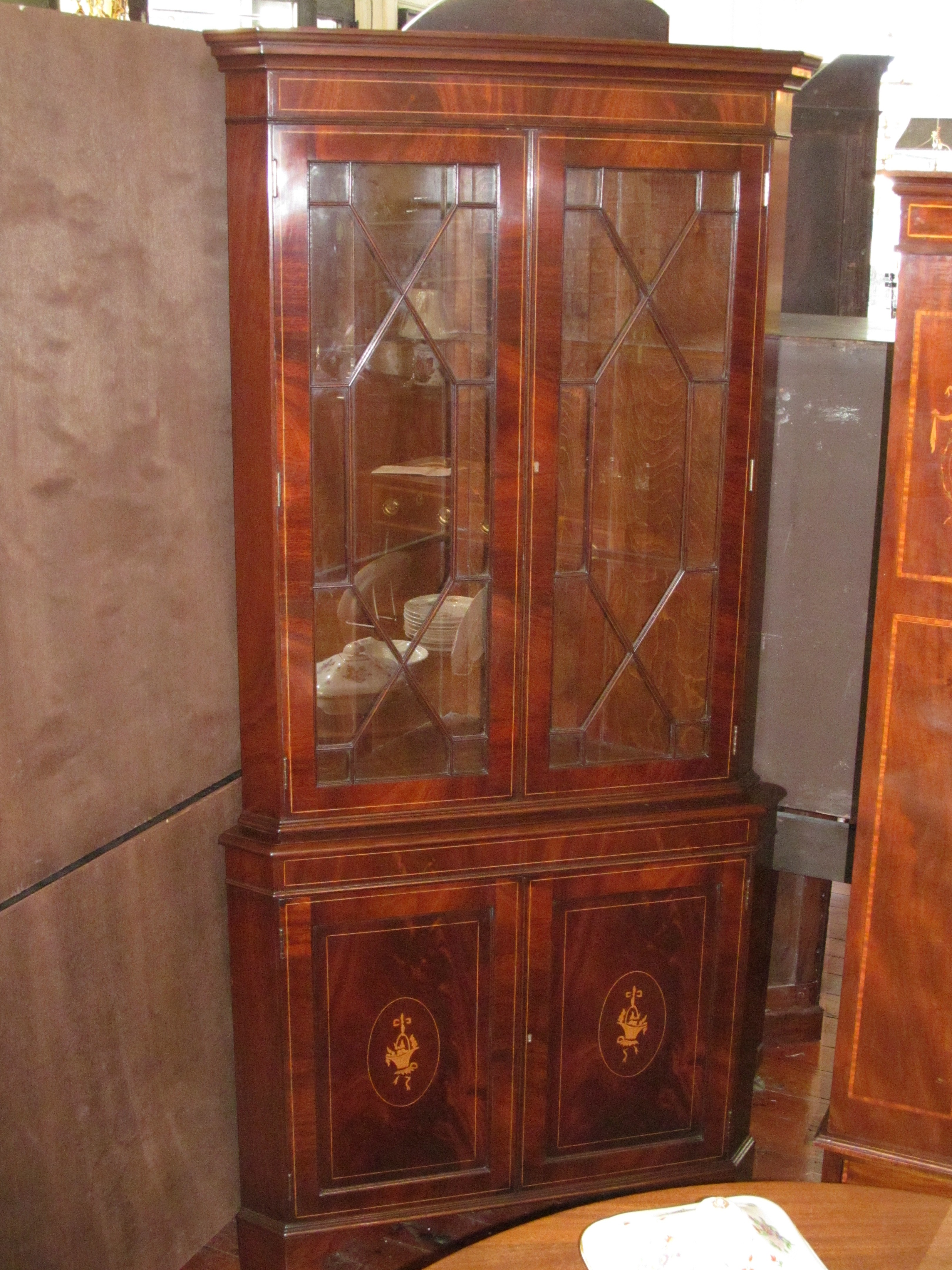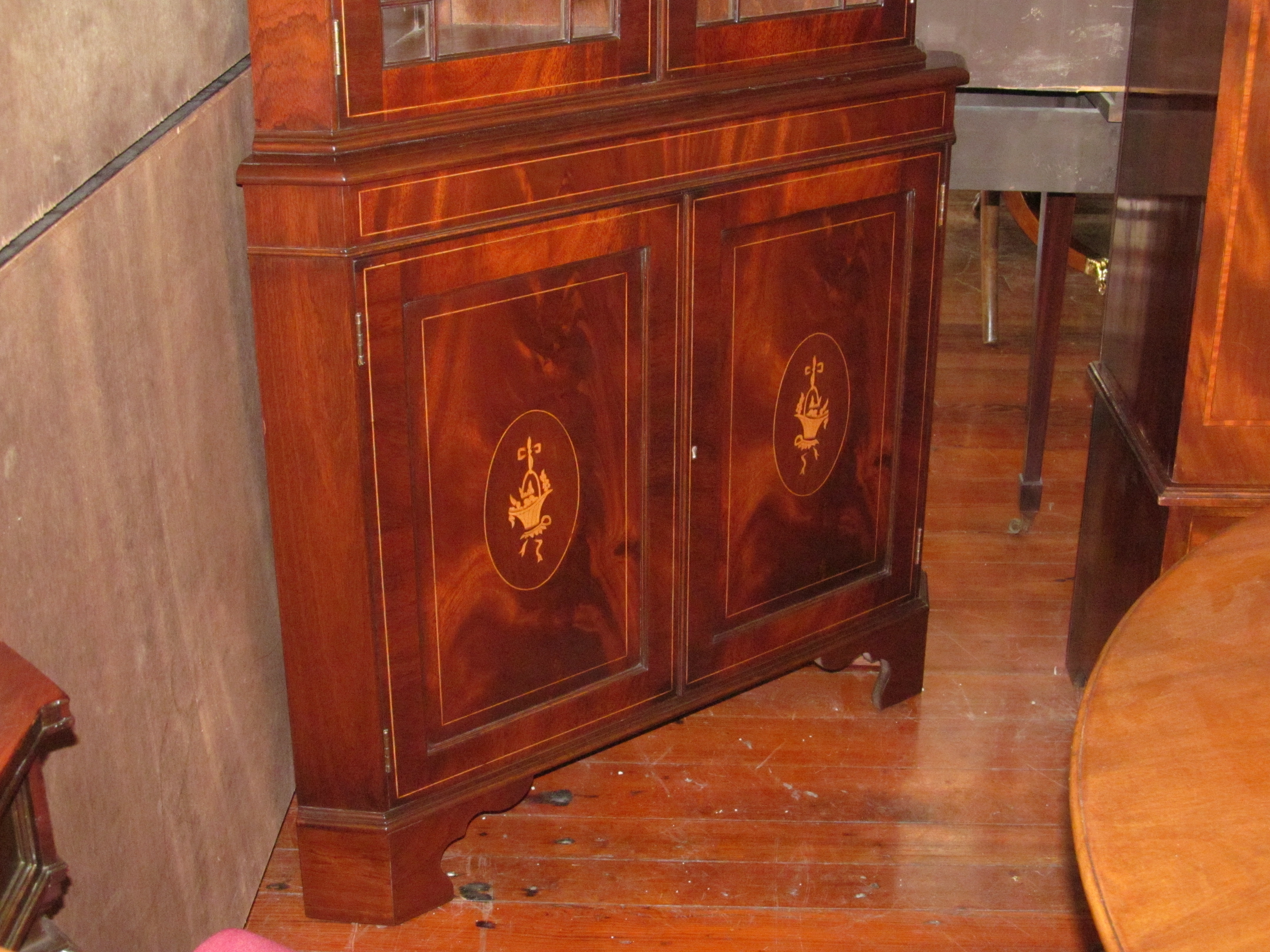 Fine Quality English Bench Made Inlaid Flame Mahogany “Adam” Style Corner Cupboard.
