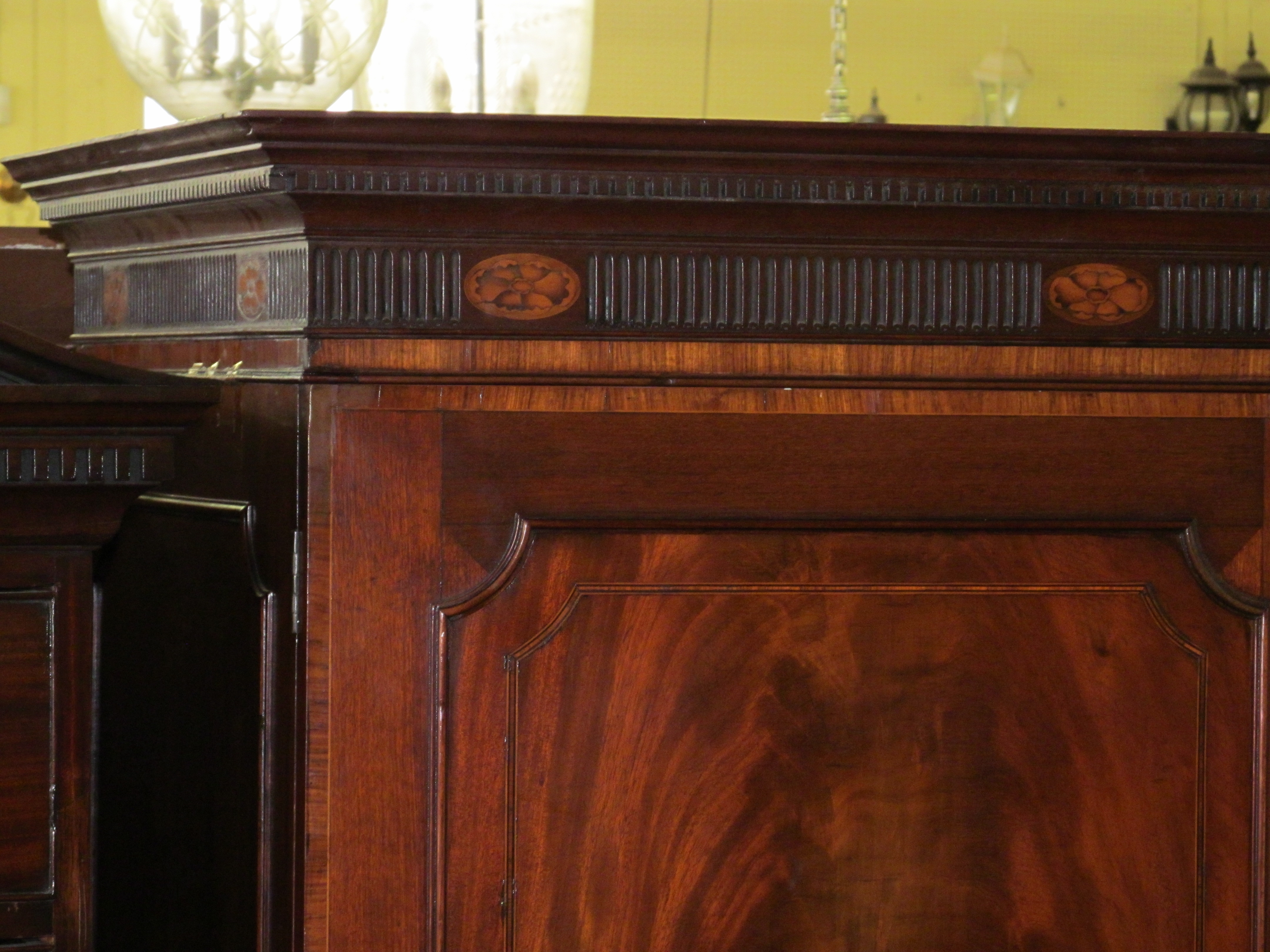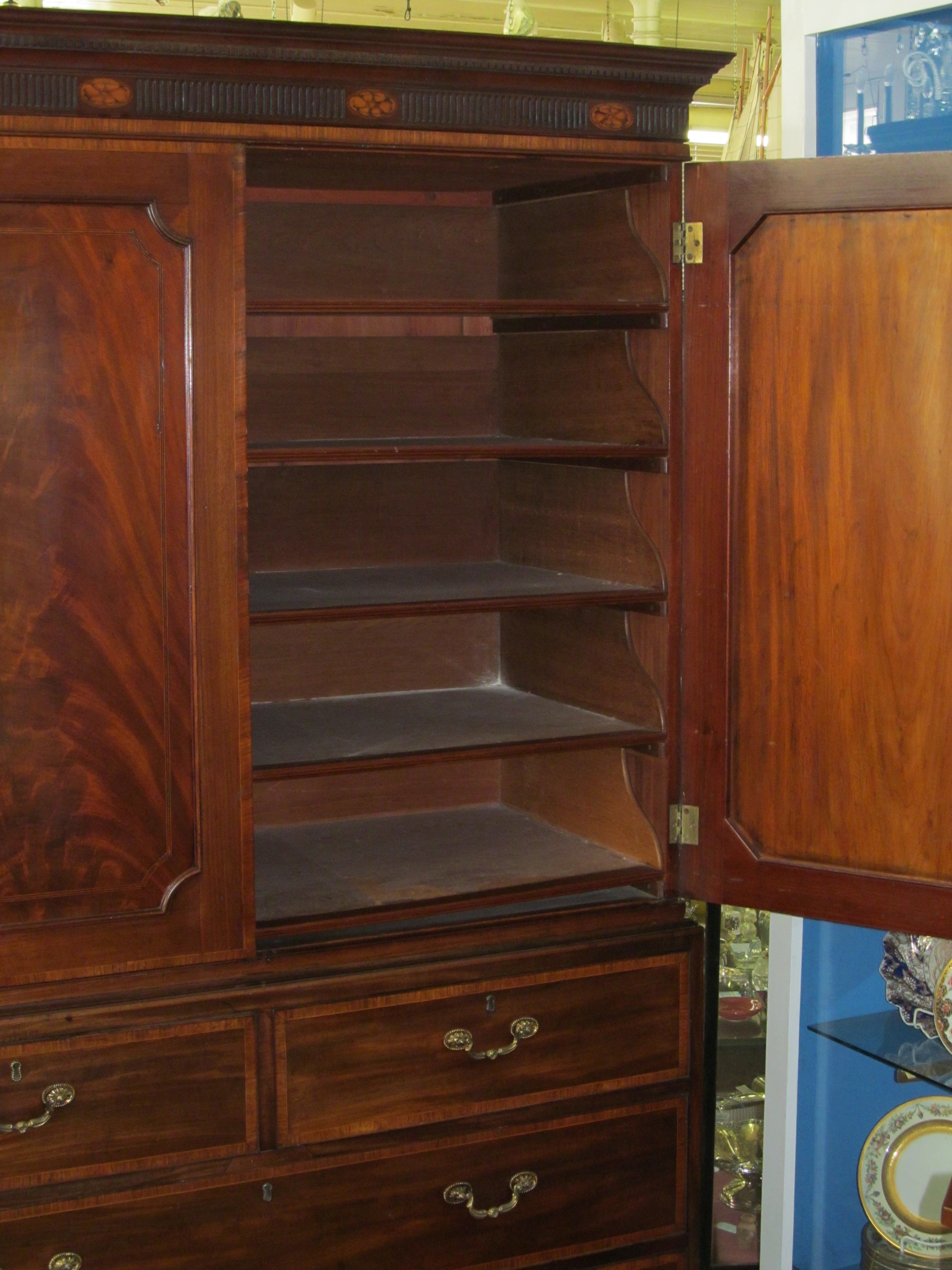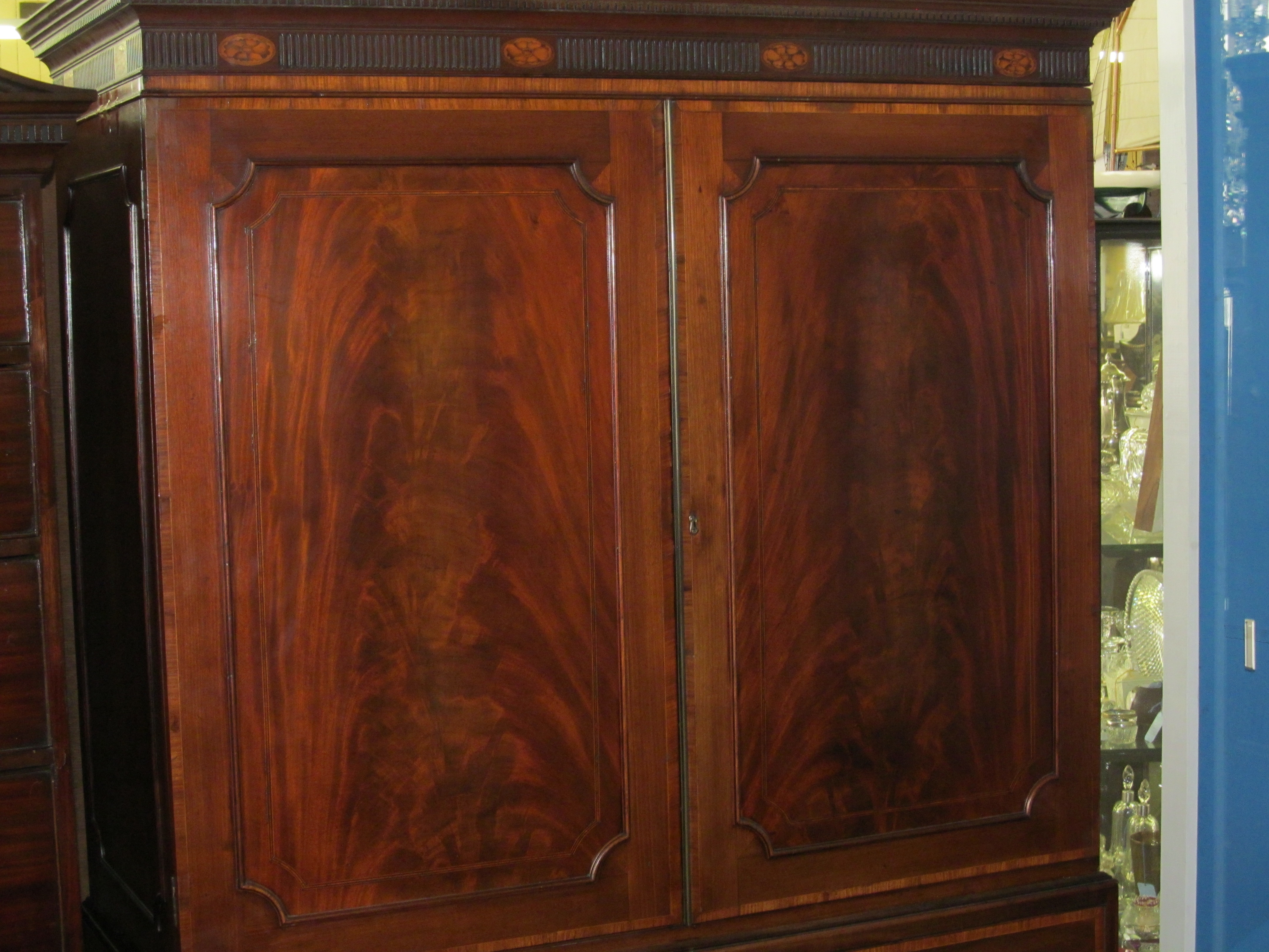 Finest Quality Antique English Geo. III Inlaid and Bookmatched Flame Mahogany Chippendale Style Linnen Press with marquetry inlaid cornice.
