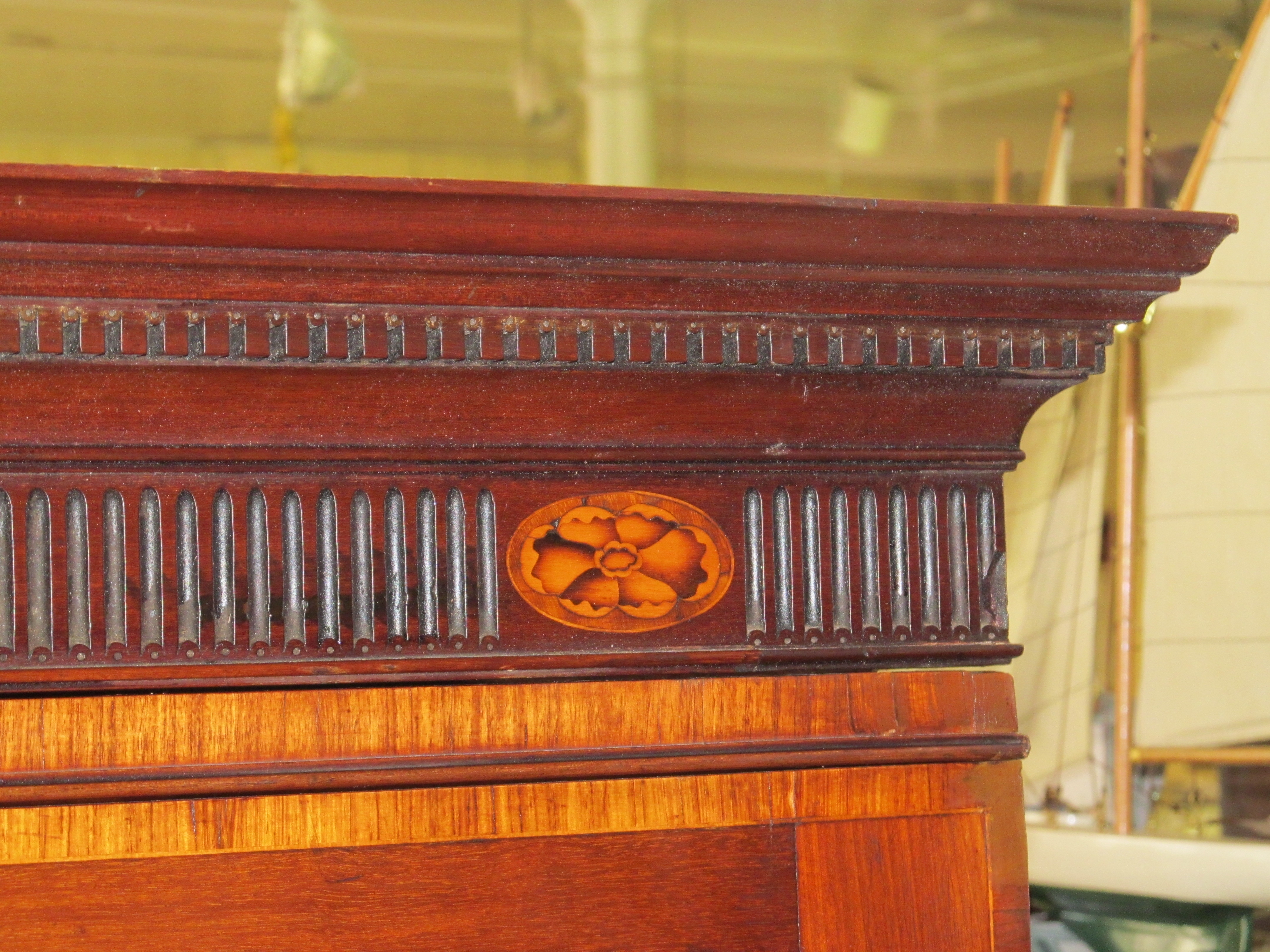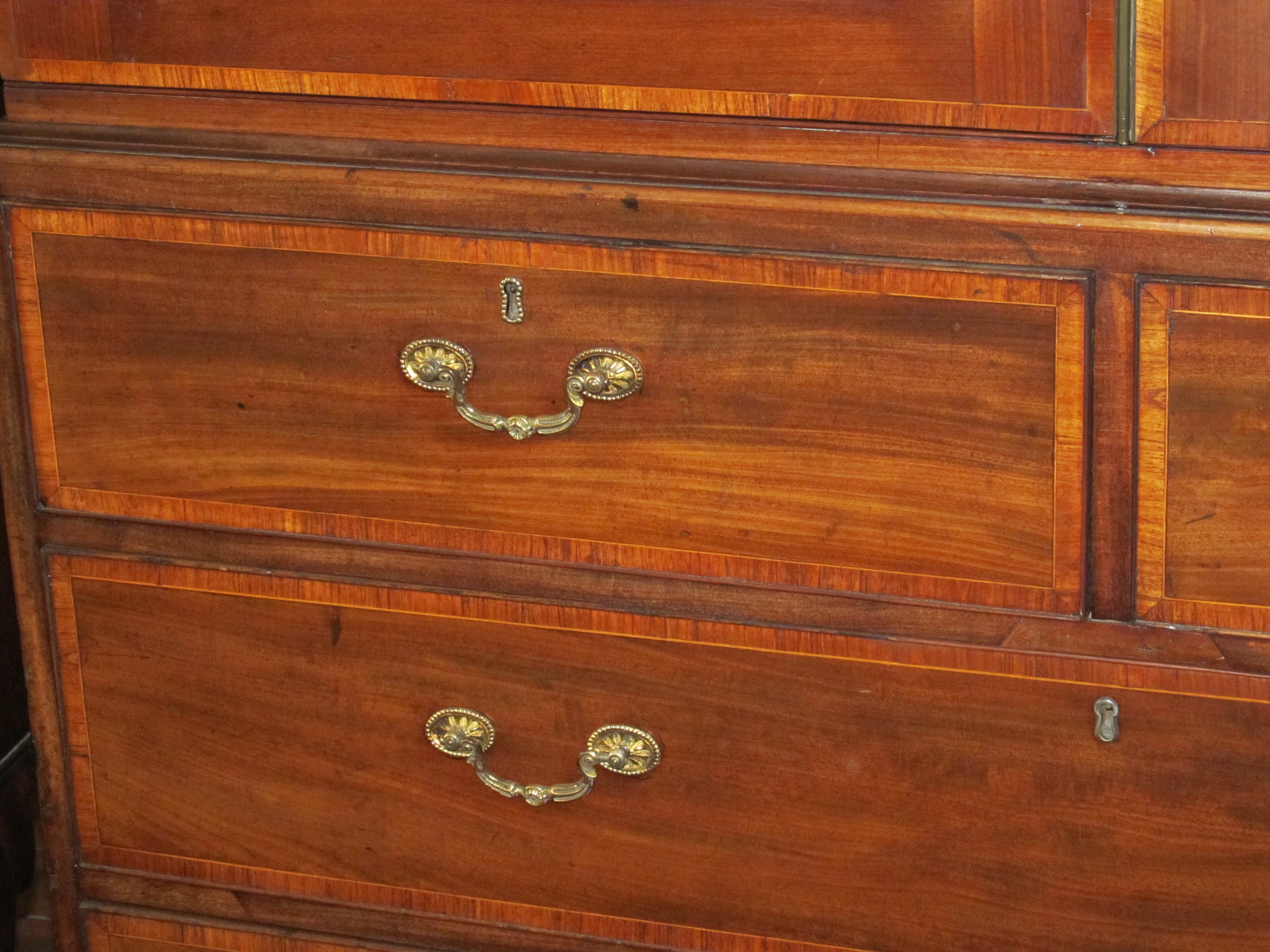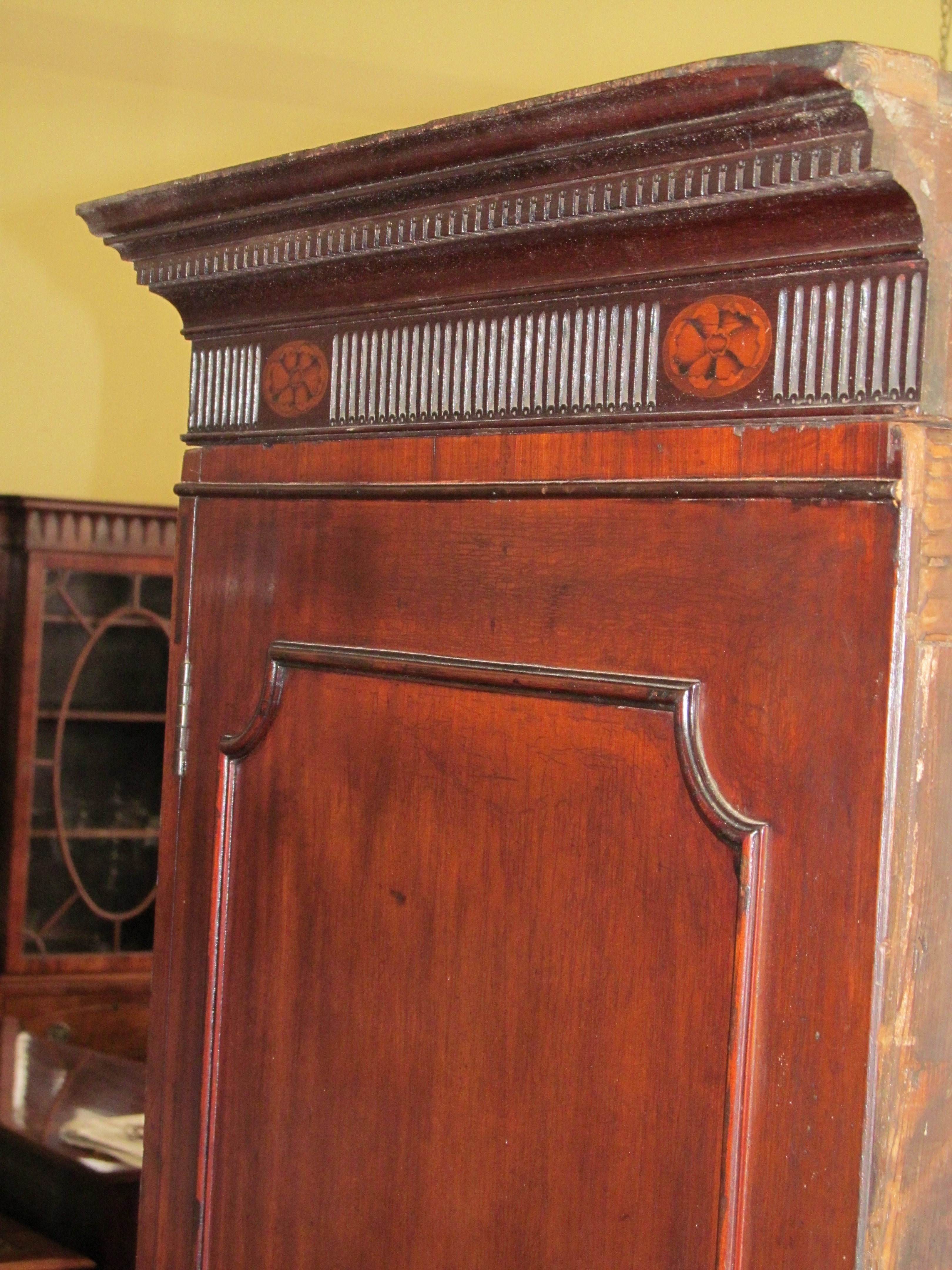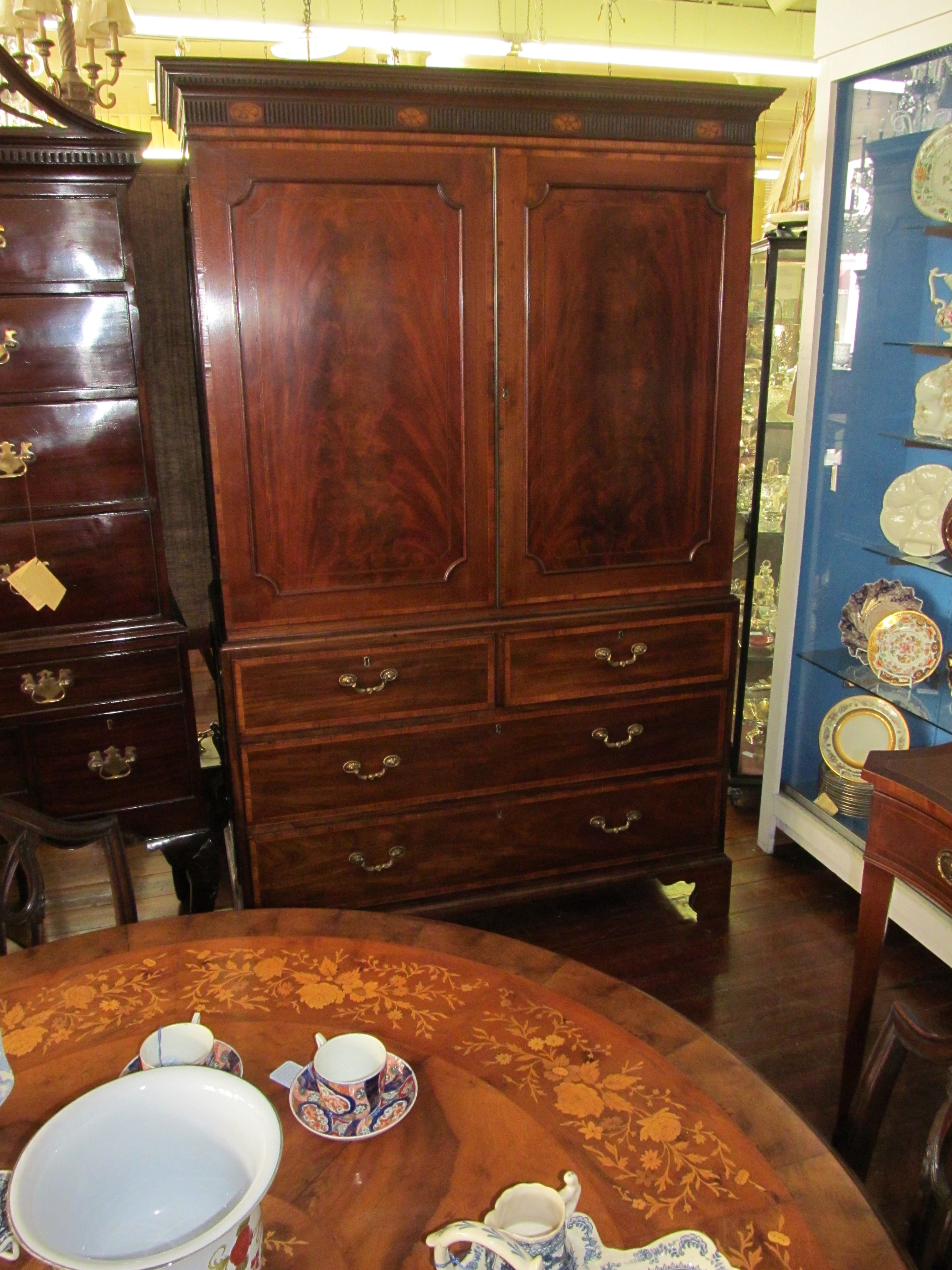 Finest Quality Antique English Geo. III Inlaid and Bookmatched Flame Mahogany Chippendale Style Linnen Press with marquetry inlaid cornice.