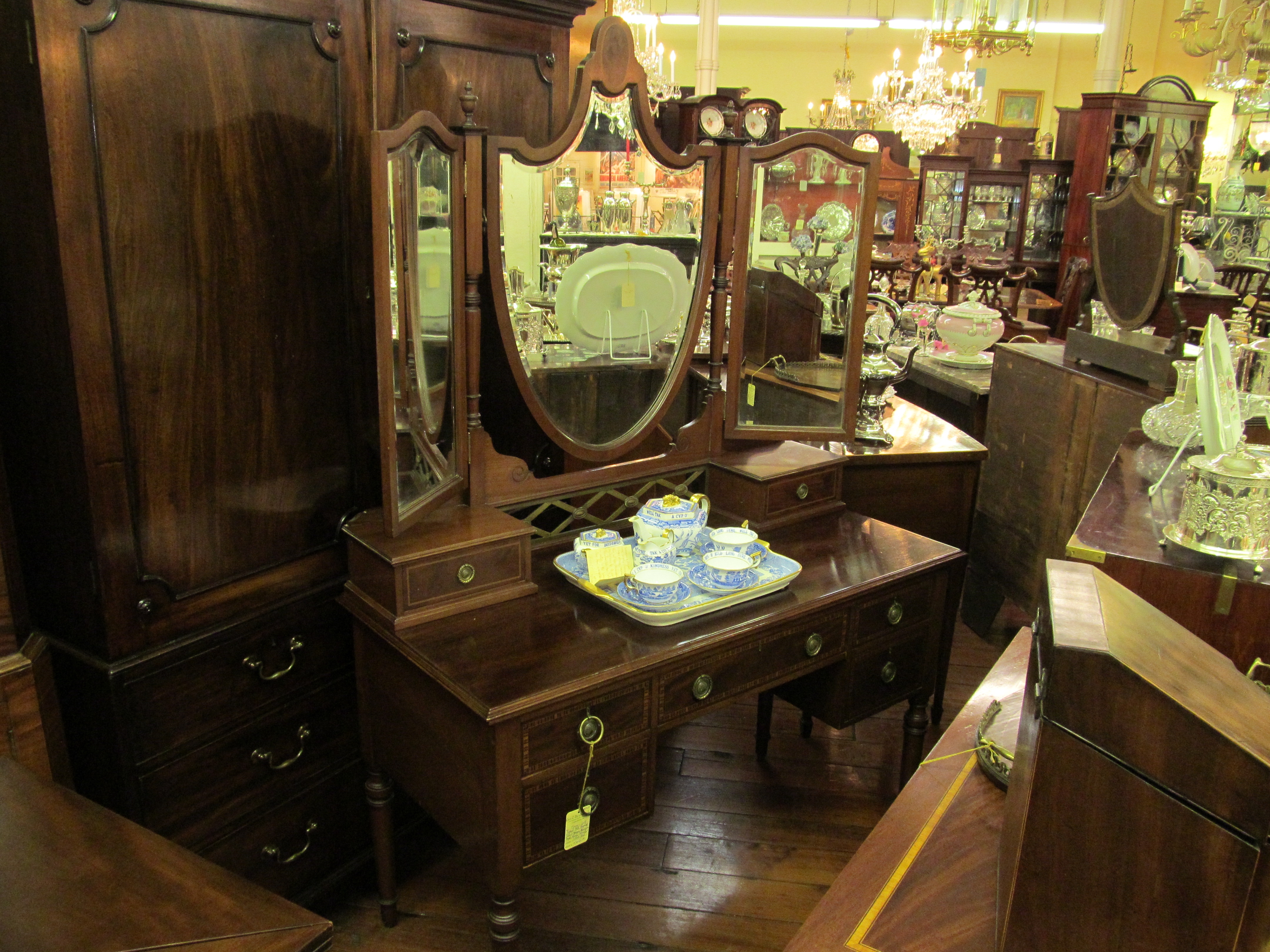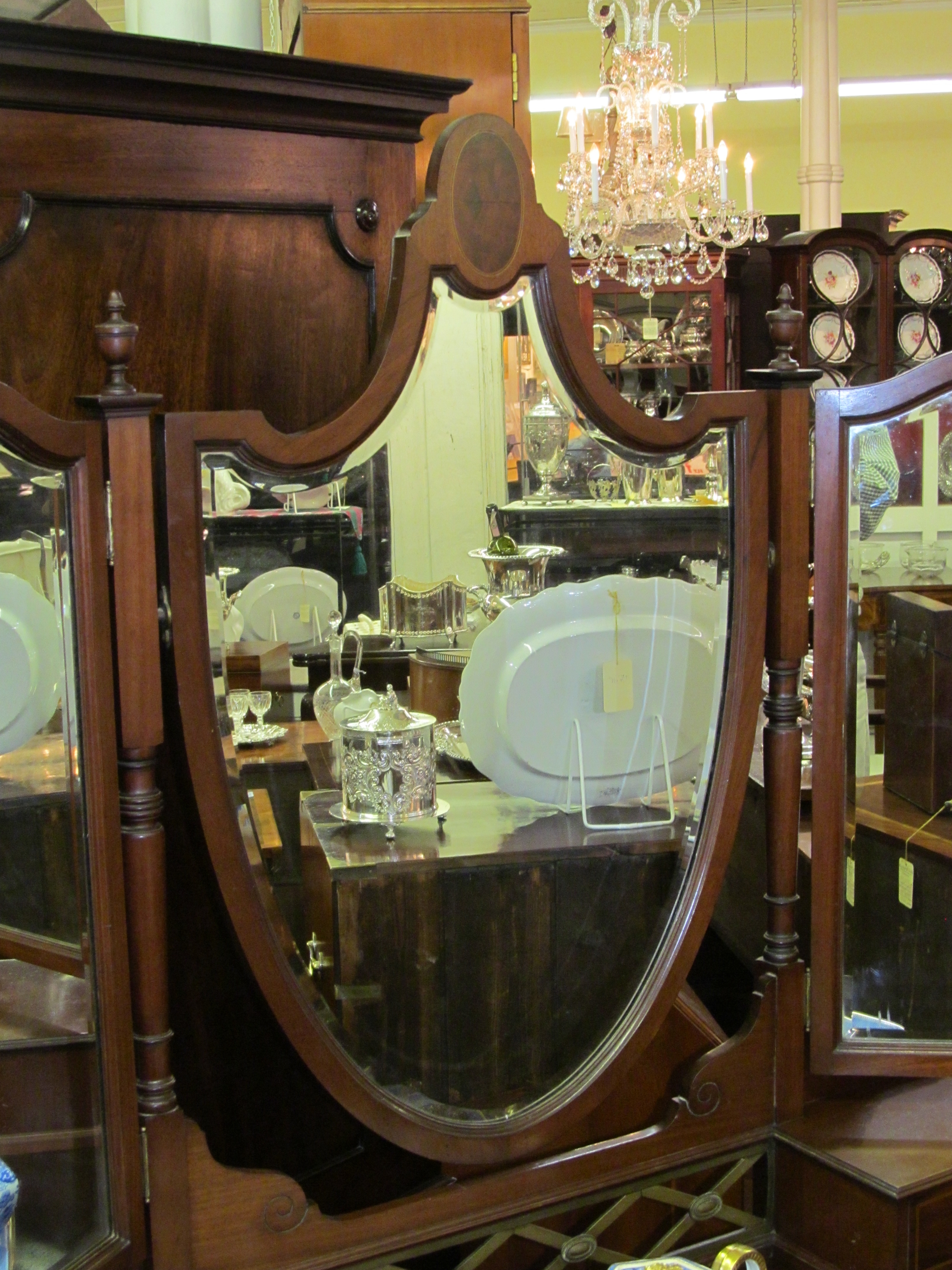 Superb Old English Inlaid Mahogany Edwardian Triple Mirror Vanity.