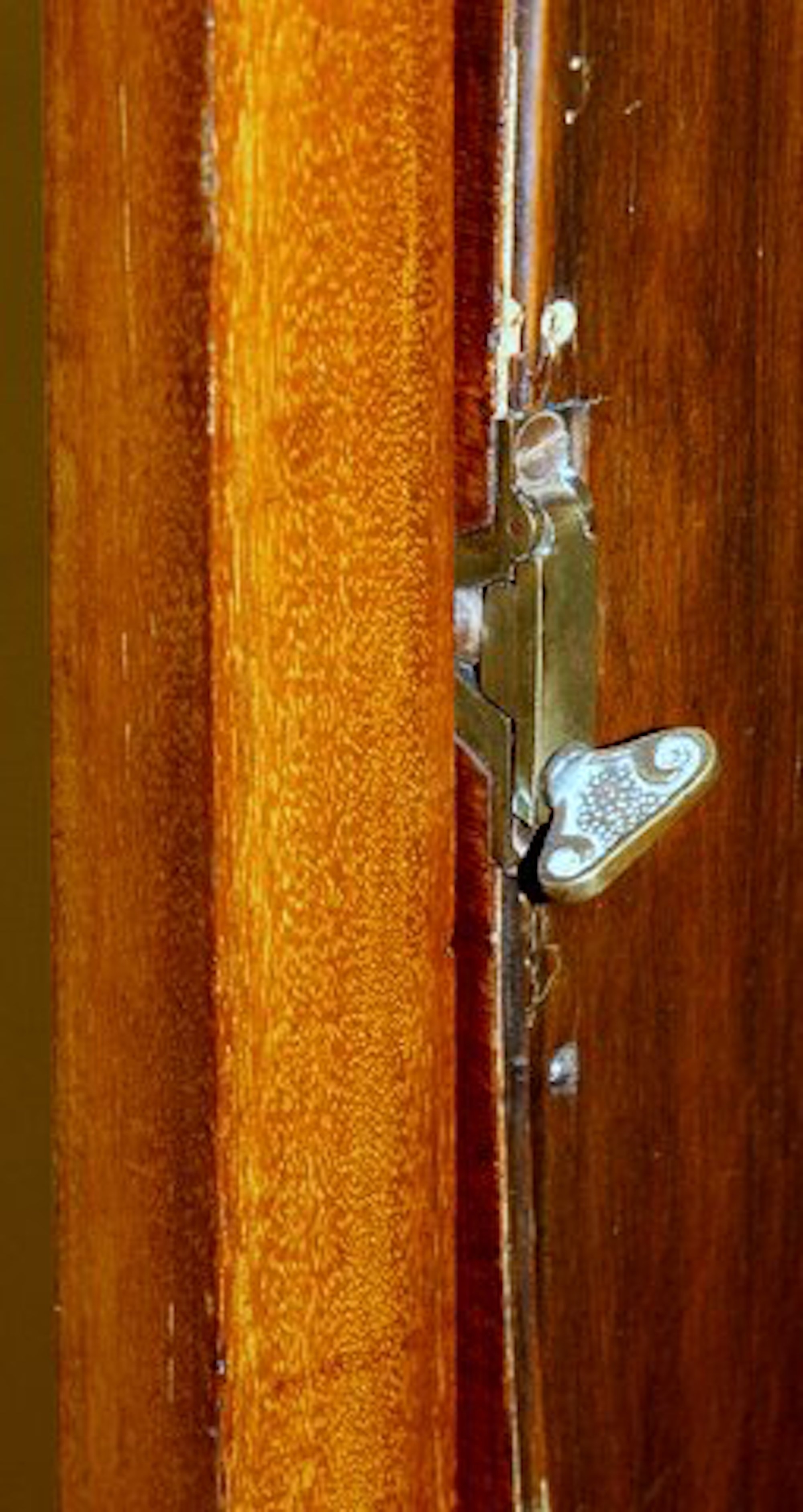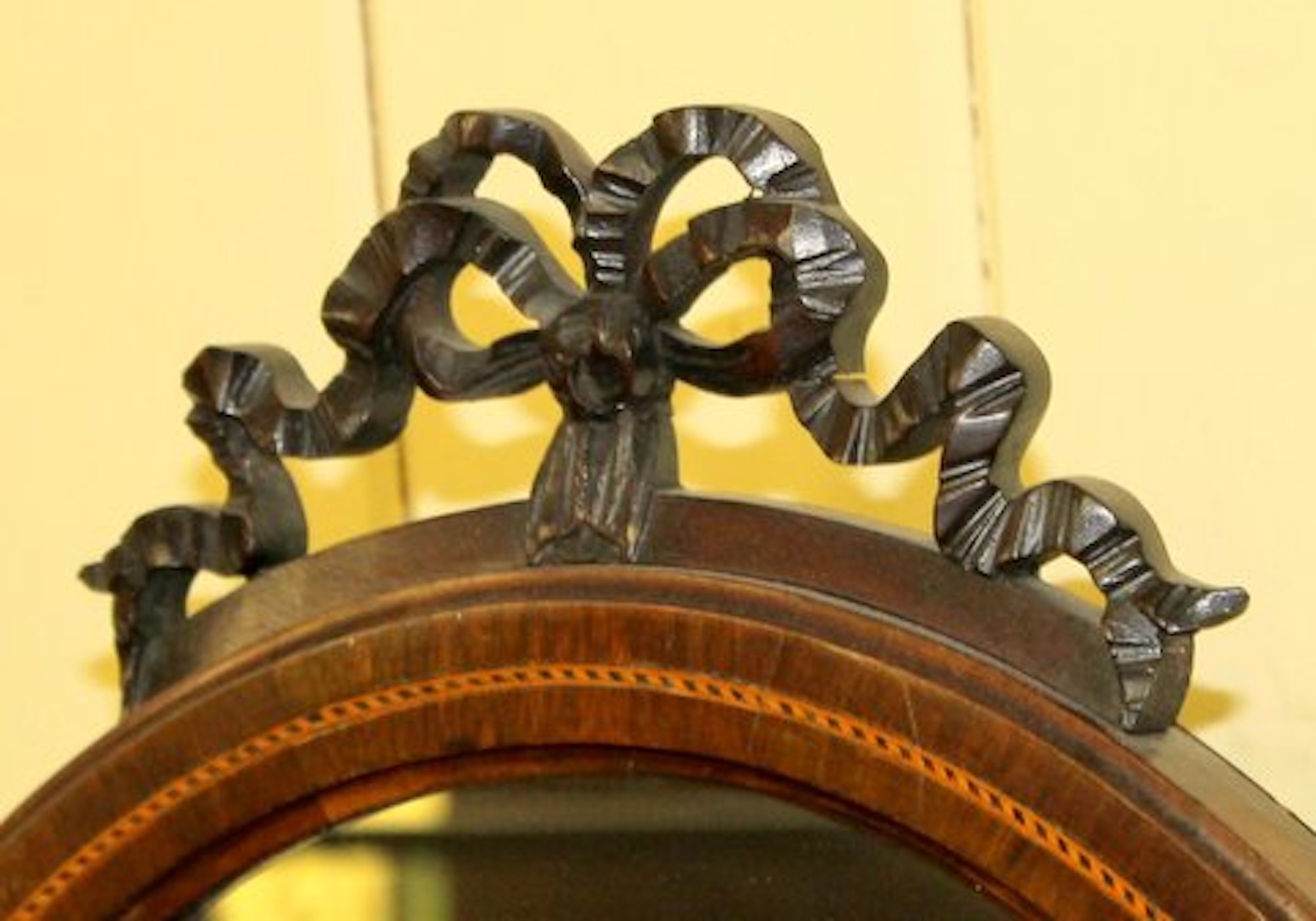 Please note fine and rare “checkered” inlay and beautifully hand-carved mahogany bow on top.