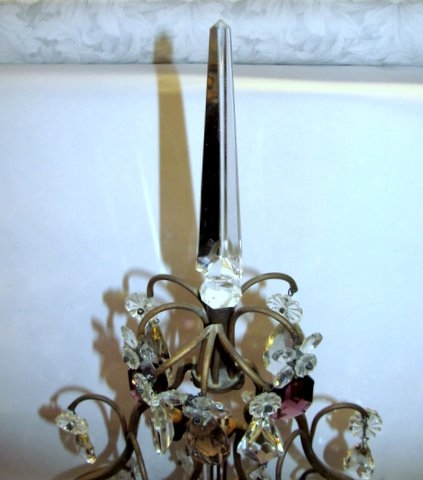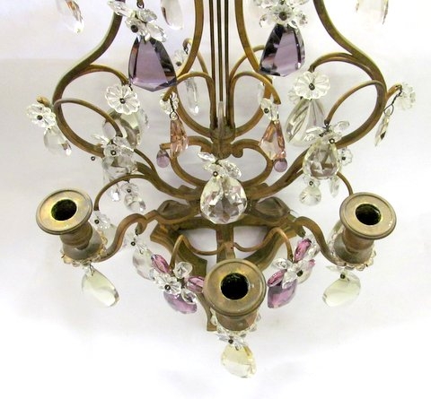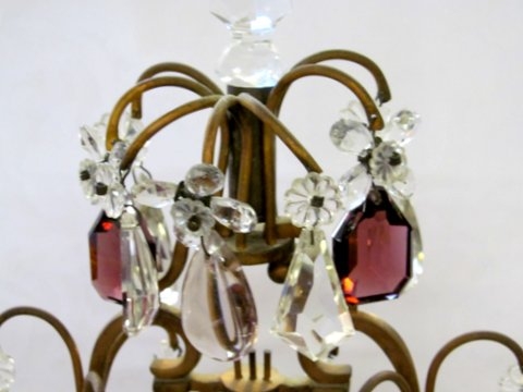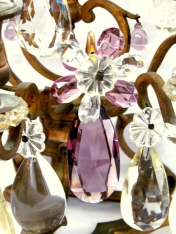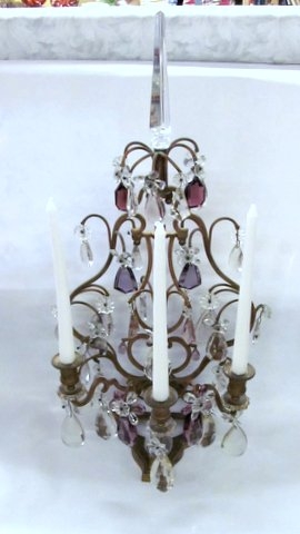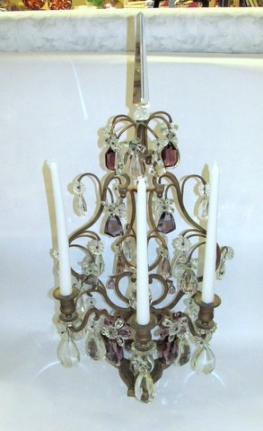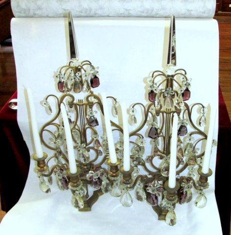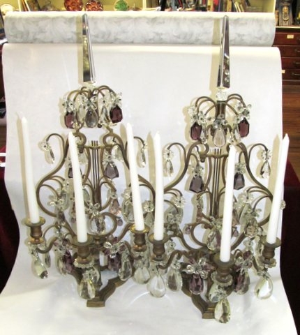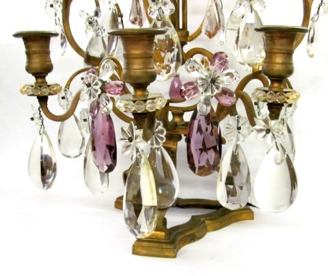 PAIR of Fabulous Quality Antique French Ormolu (gilt brass) and Cut Crystal 3- light Candelabra with Clear and Amethyst Prisms