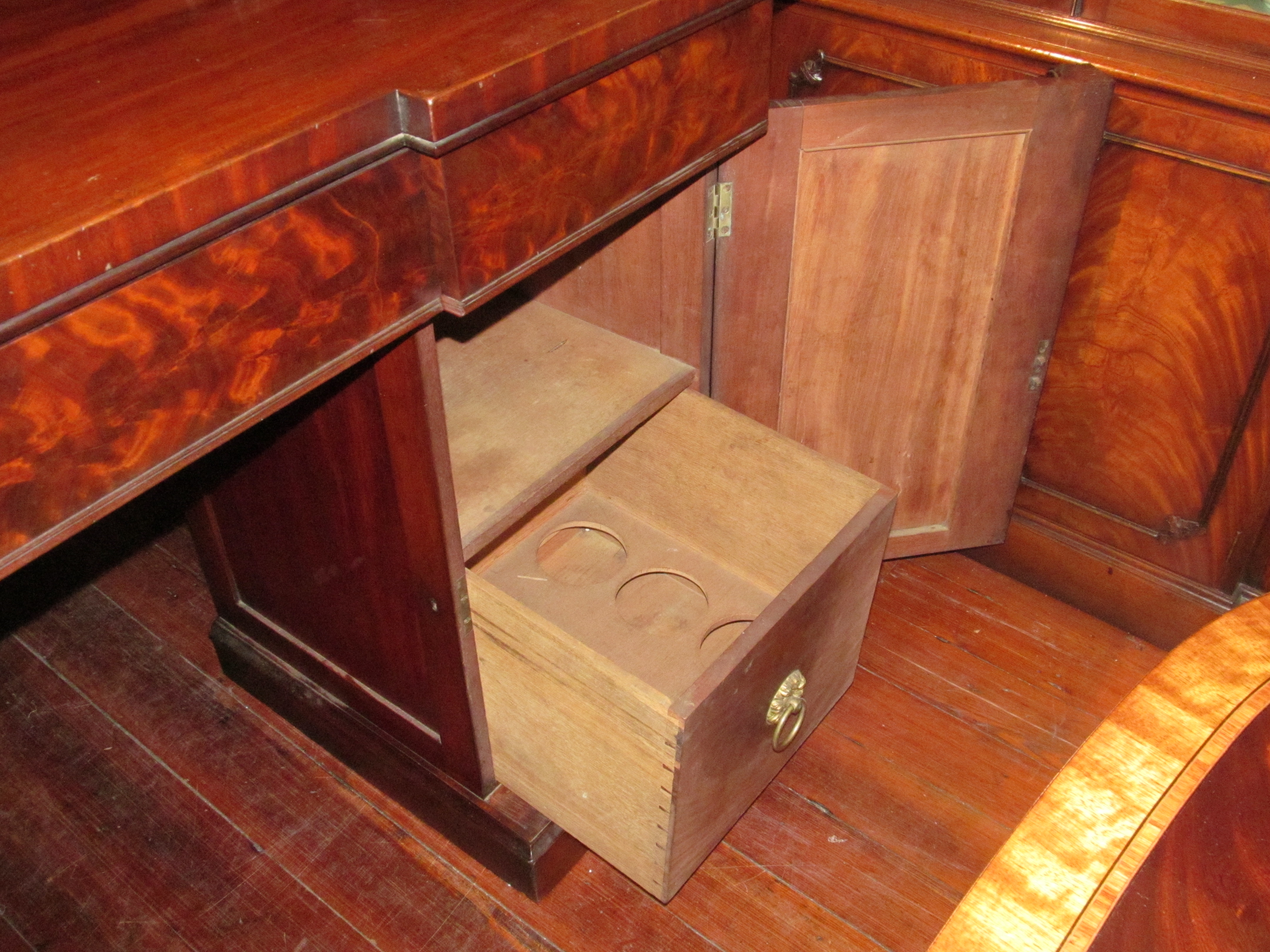 Please note superb bookmatched flame mahogany and cellarette drawer behind right side cupboard.