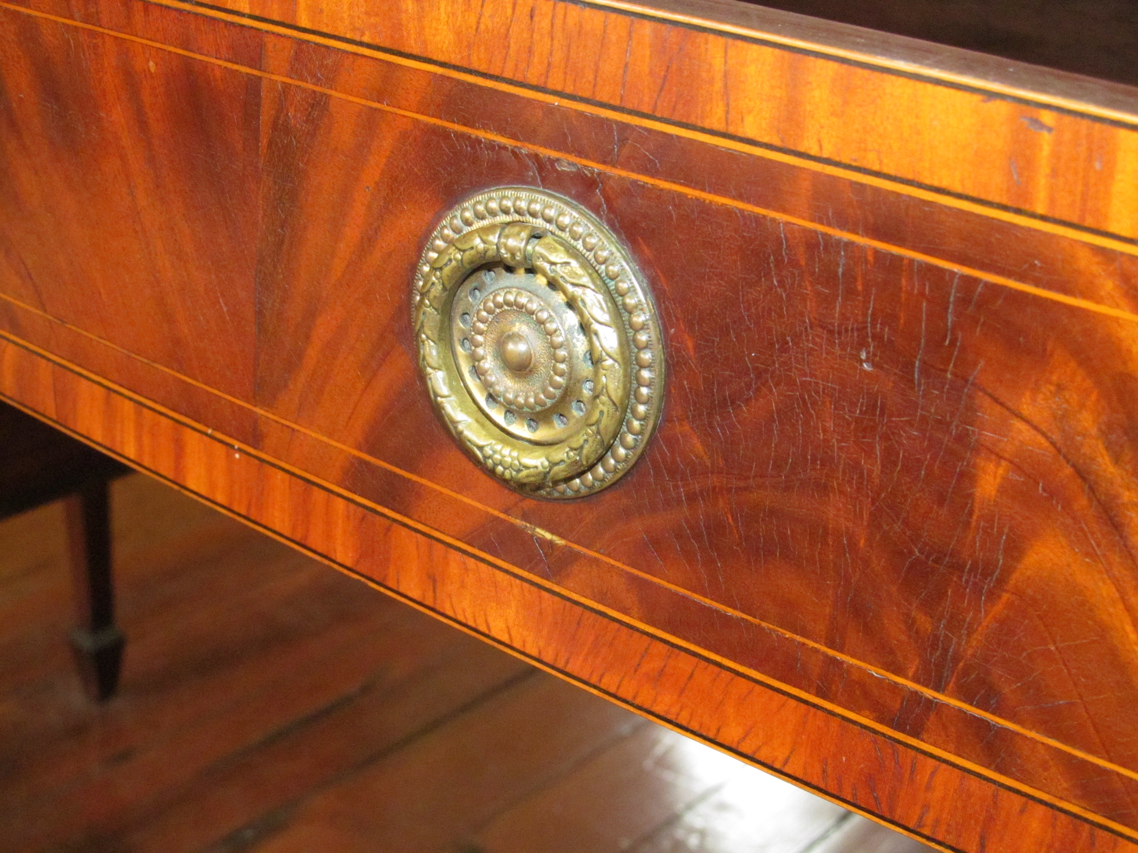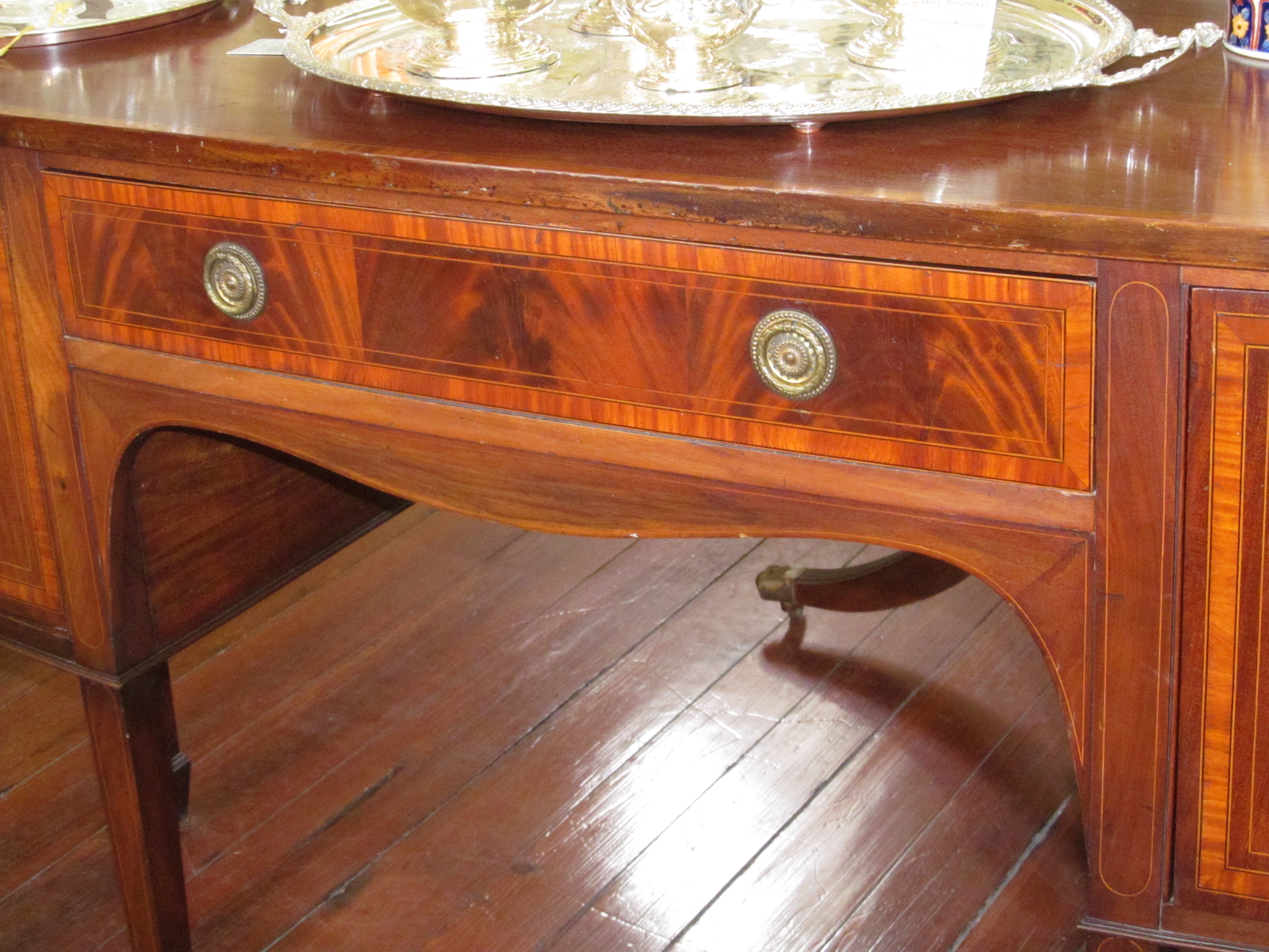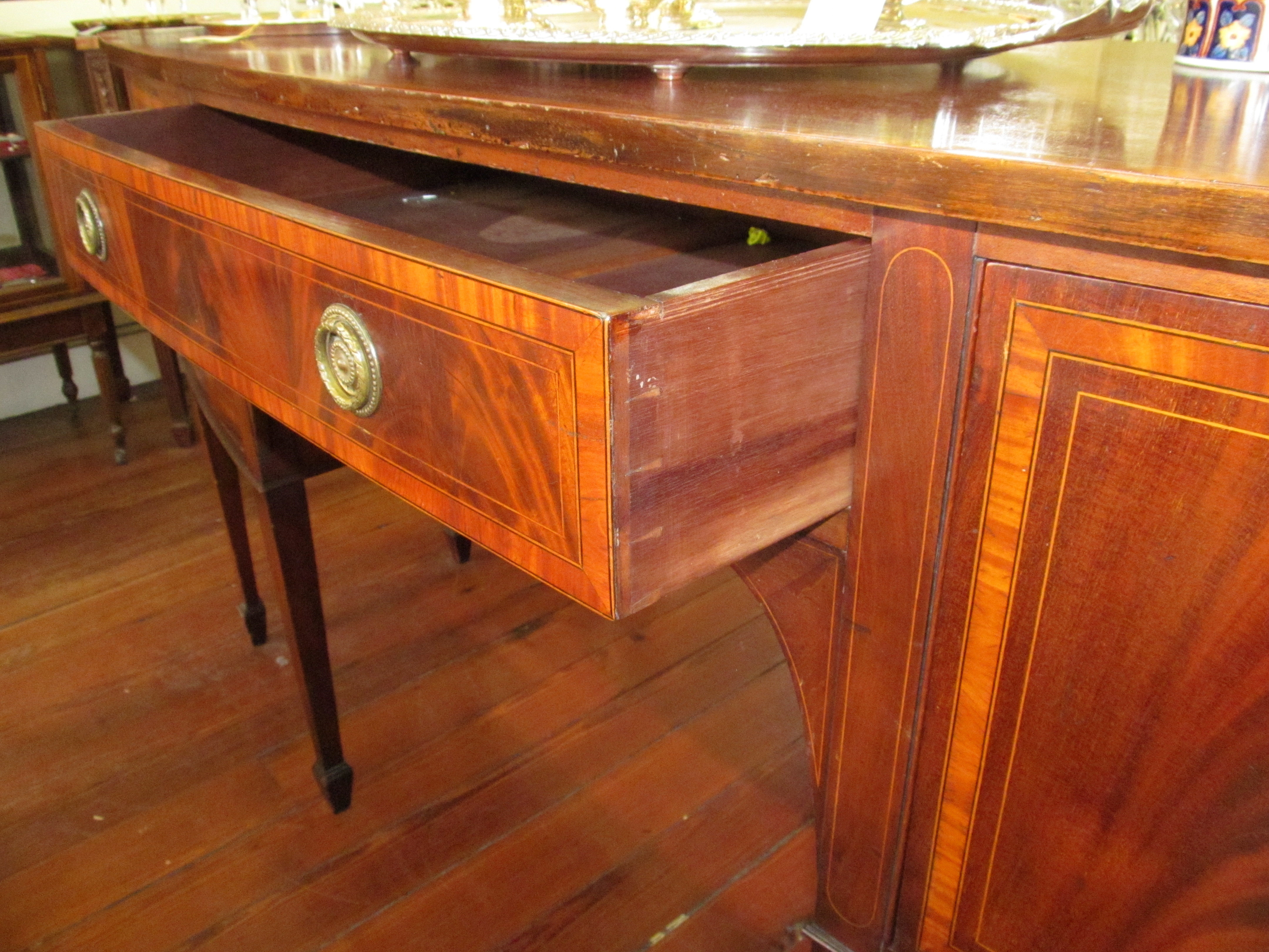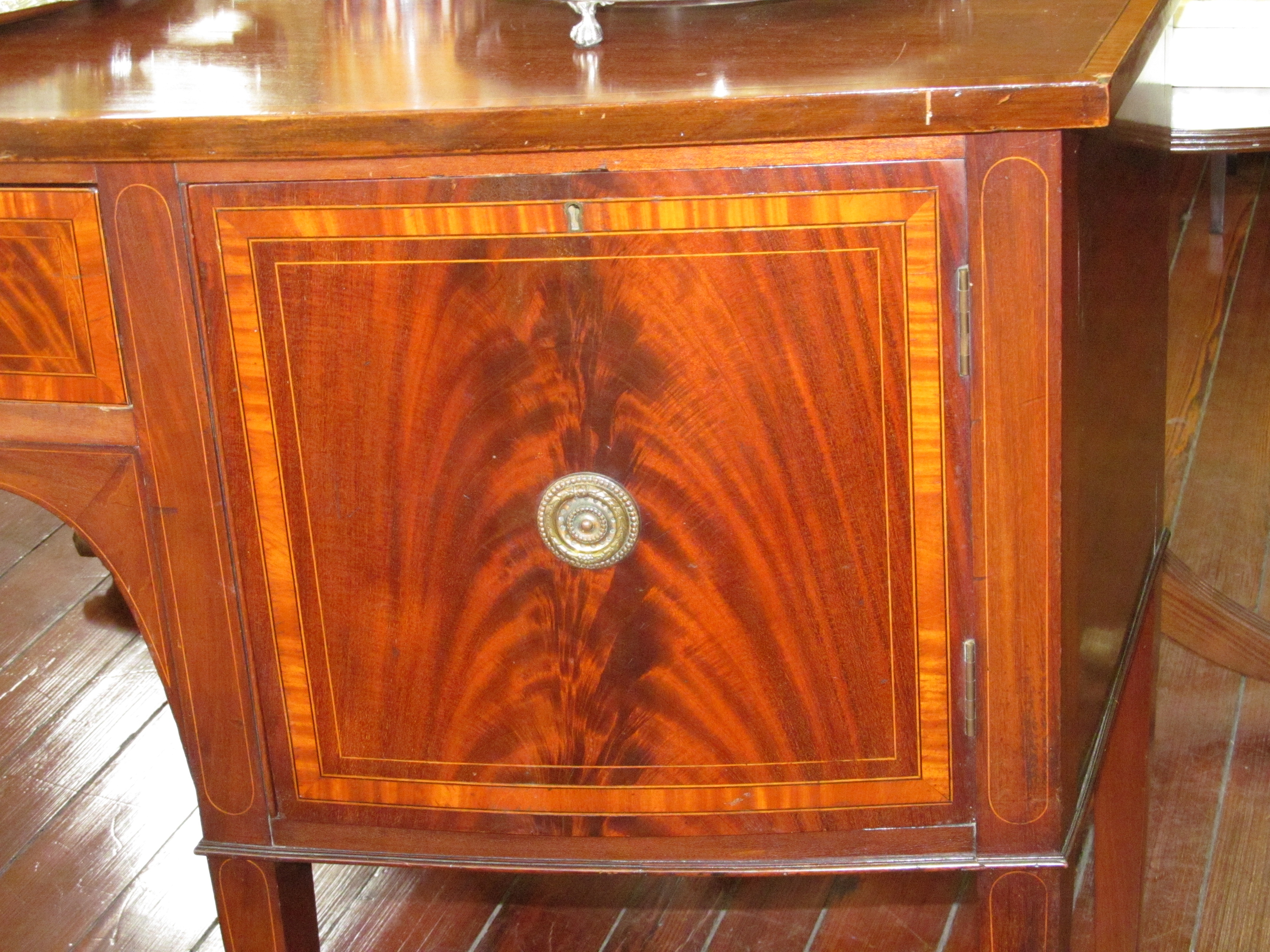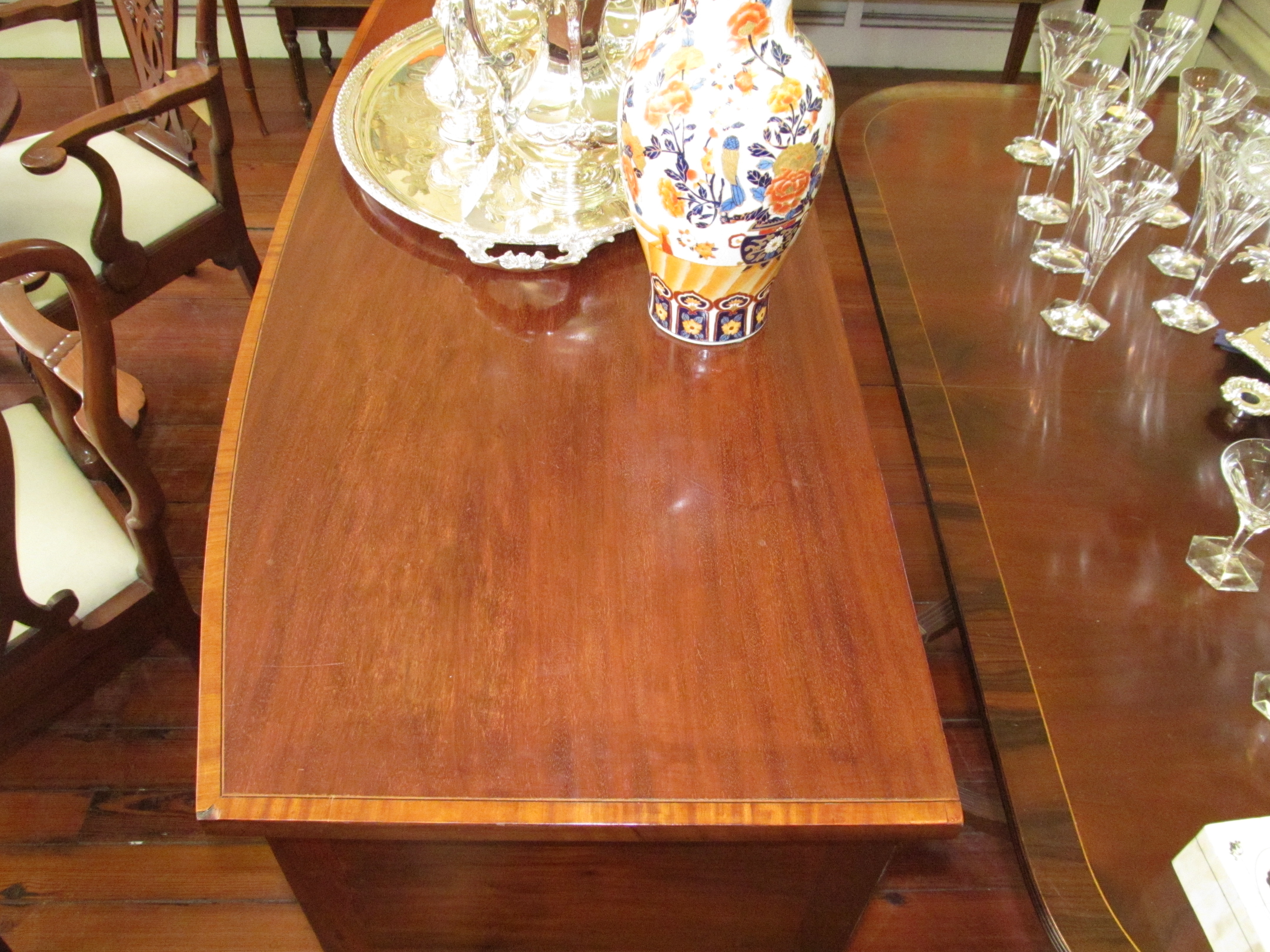 Superb Quality Antique English Inlaid Flame Mahogany Hepplewhite Style “Signed” Bowfront Sideboard.