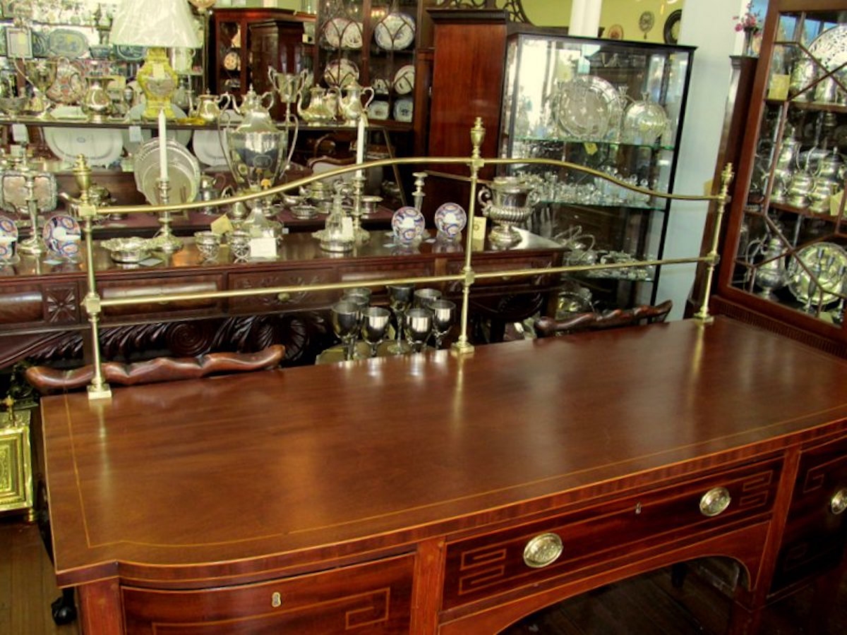You are here: Home / All Inventory / Antique Inlaid Mahogany Sideboard with Original Brass Gallery