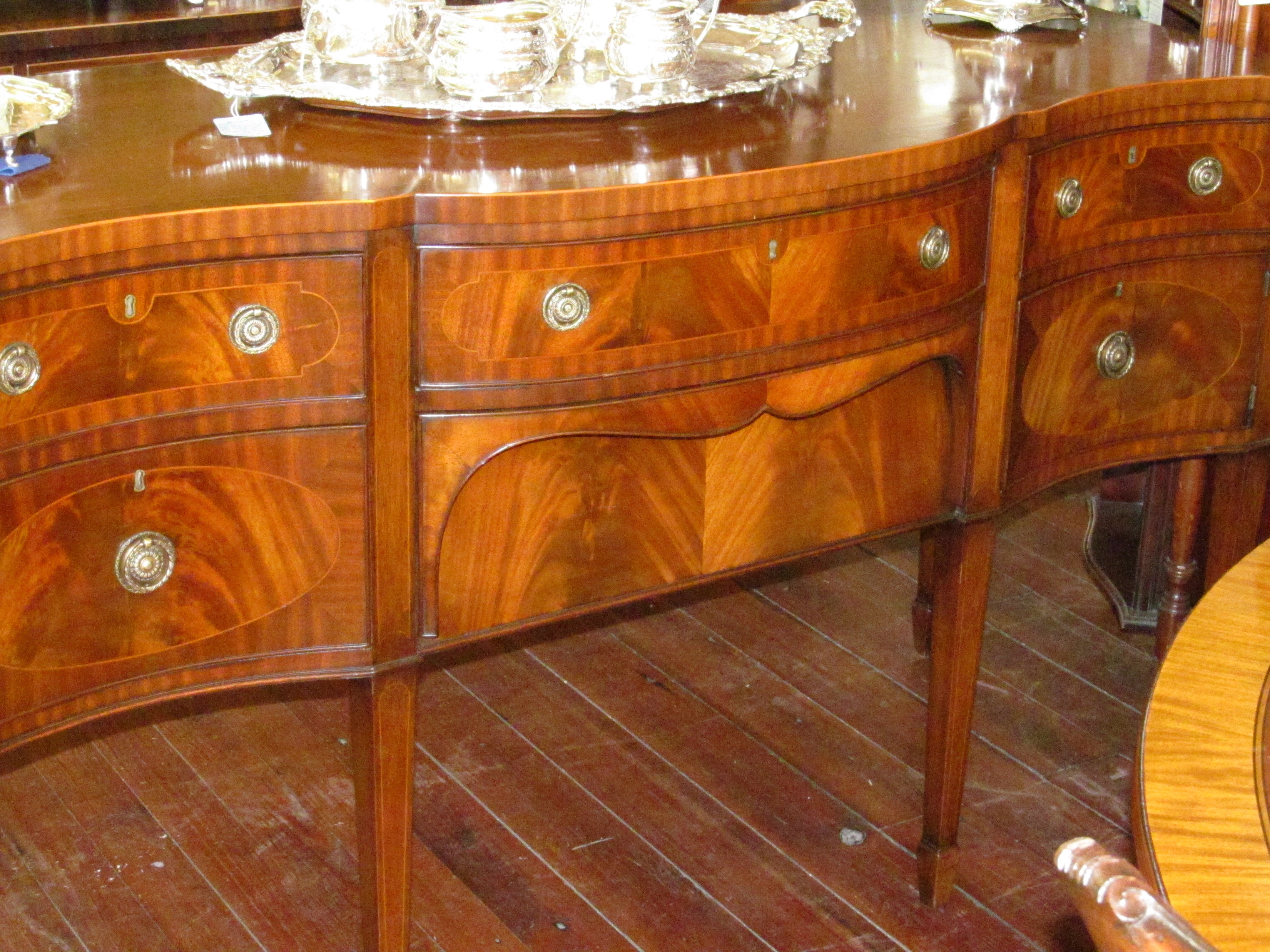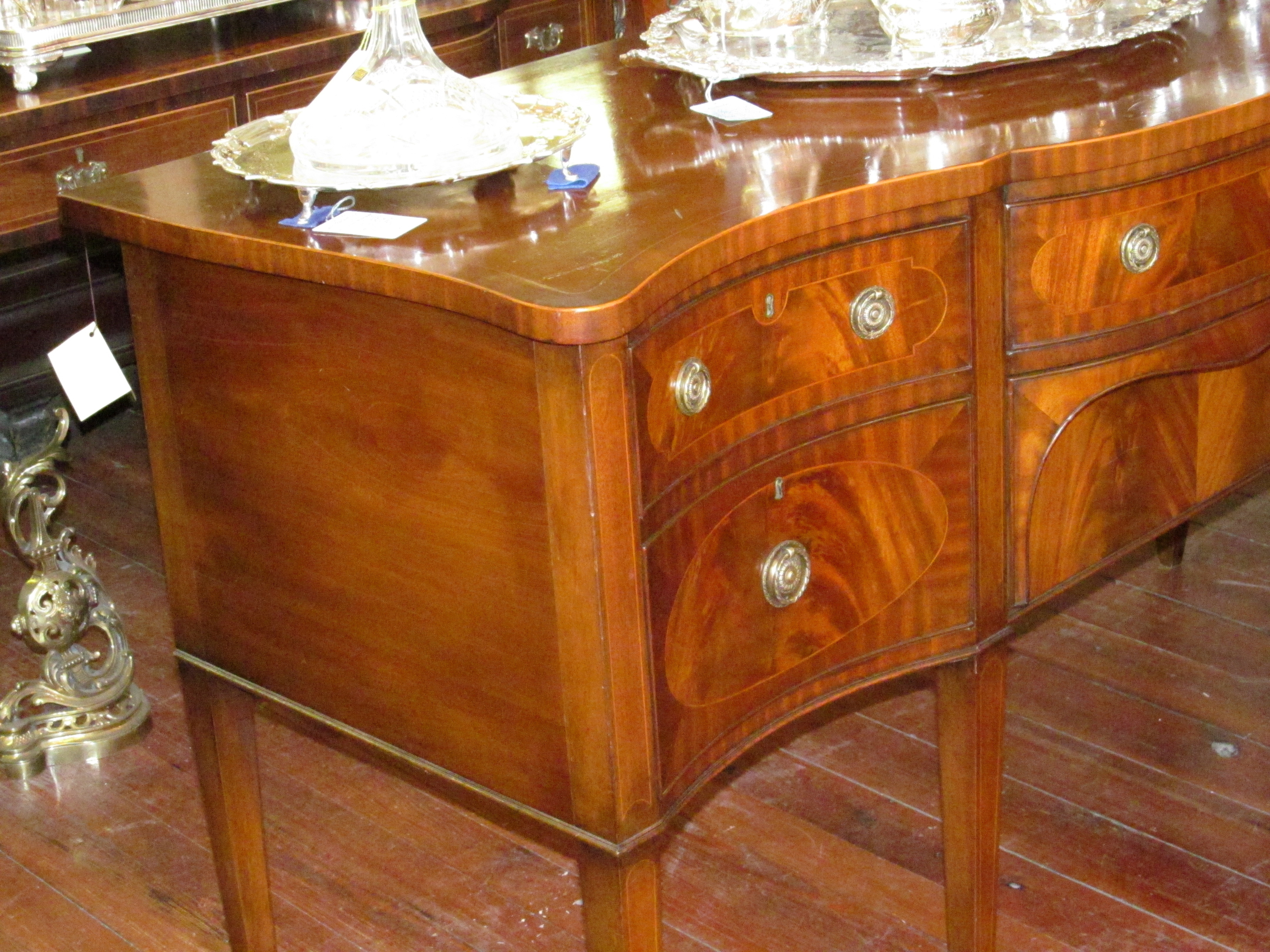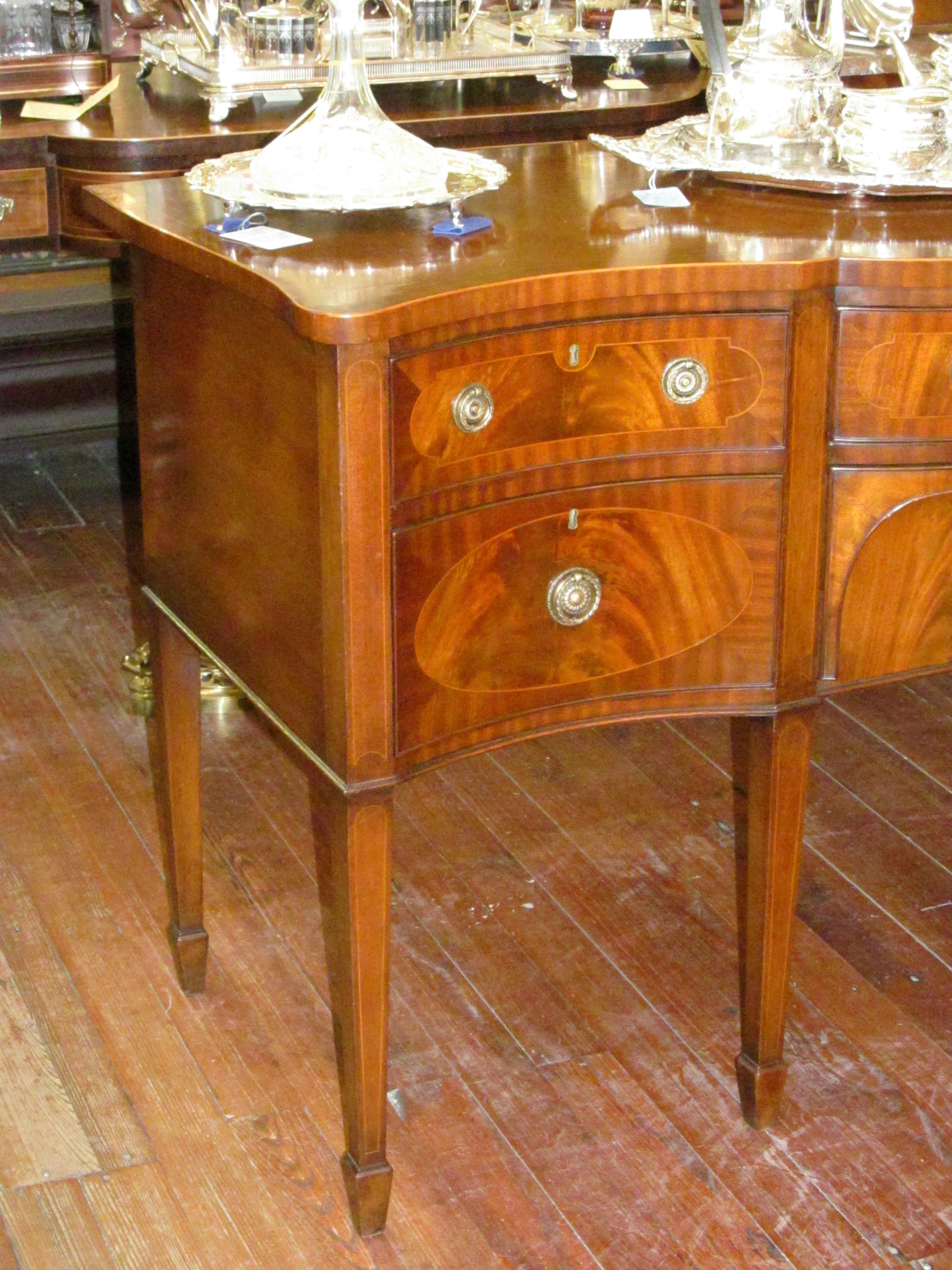 Fabulous Quality Old English Inlaid Flame Mahogany Hepplewhite Style Serpentine Sideboard.