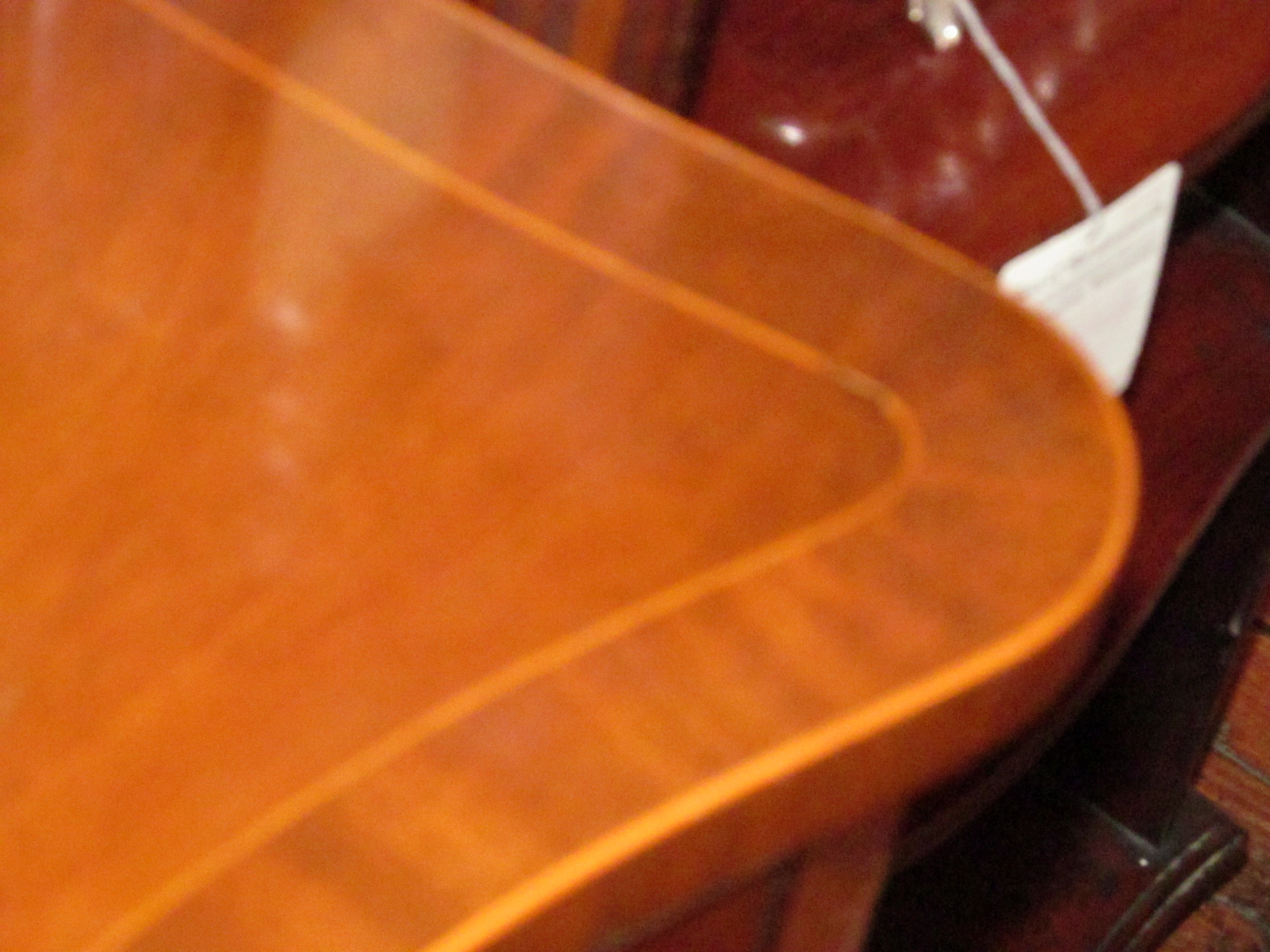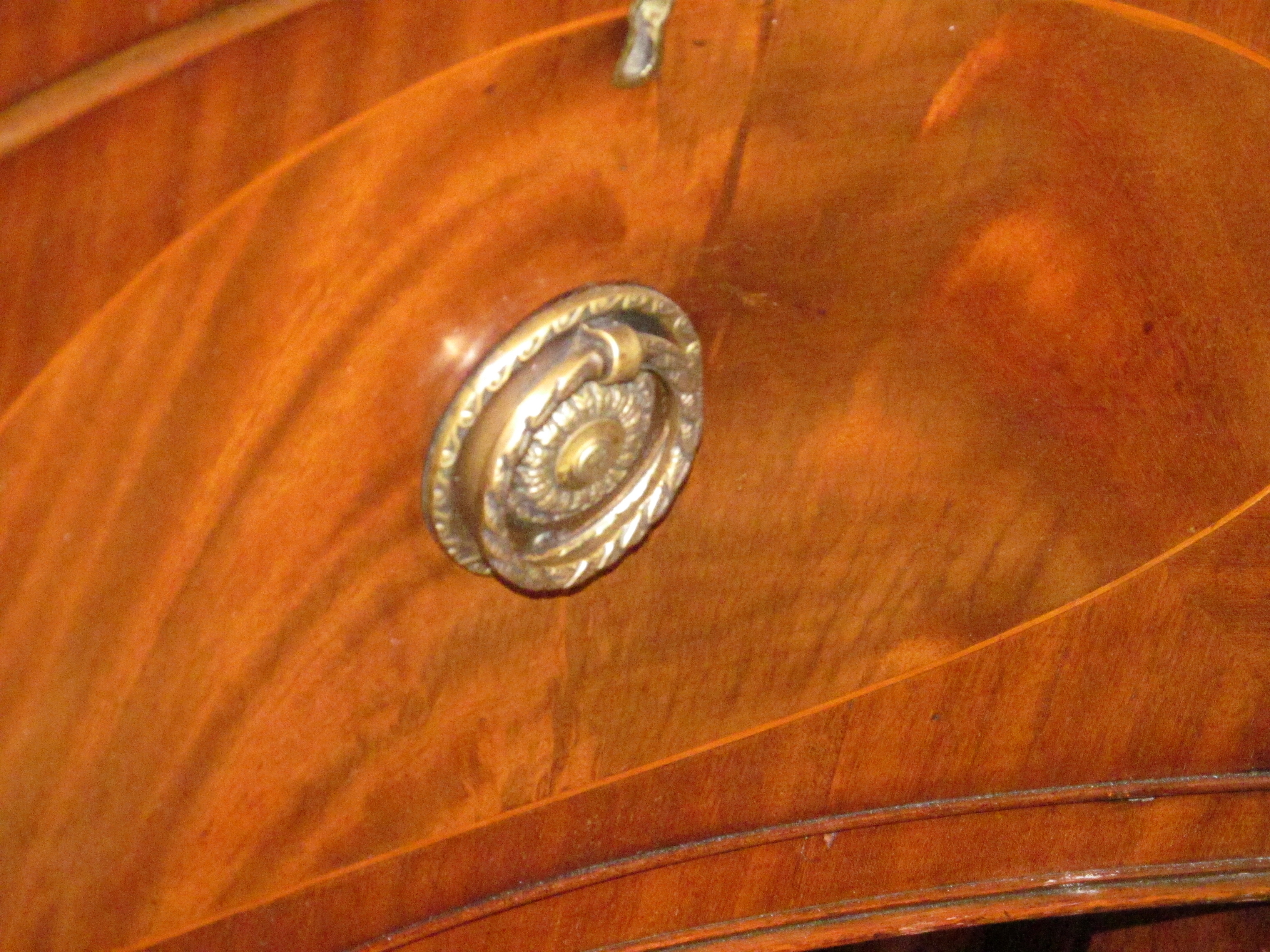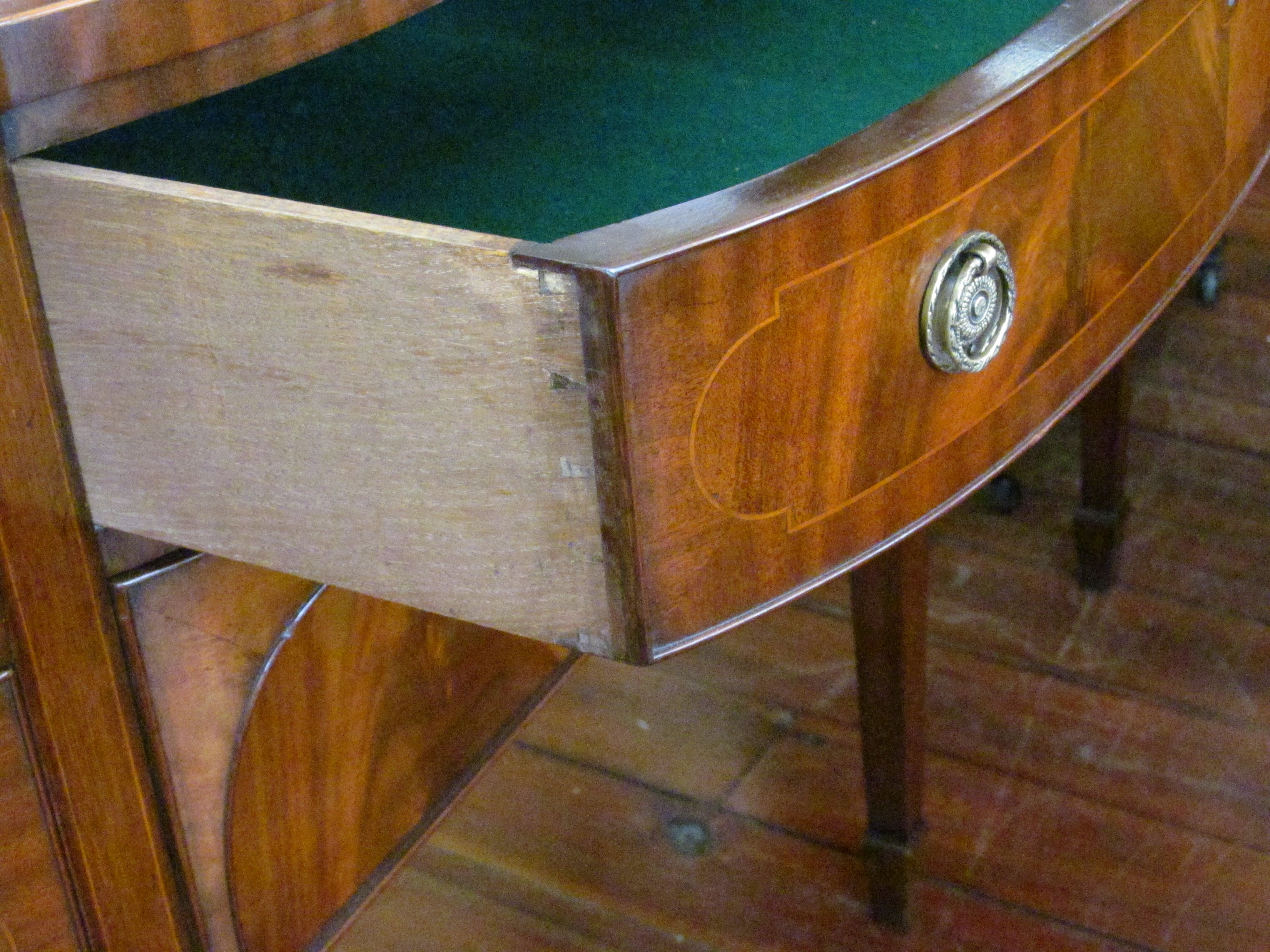 Fabulous Quality Old English Inlaid Flame Mahogany Hepplewhite Style Serpentine Sideboard.