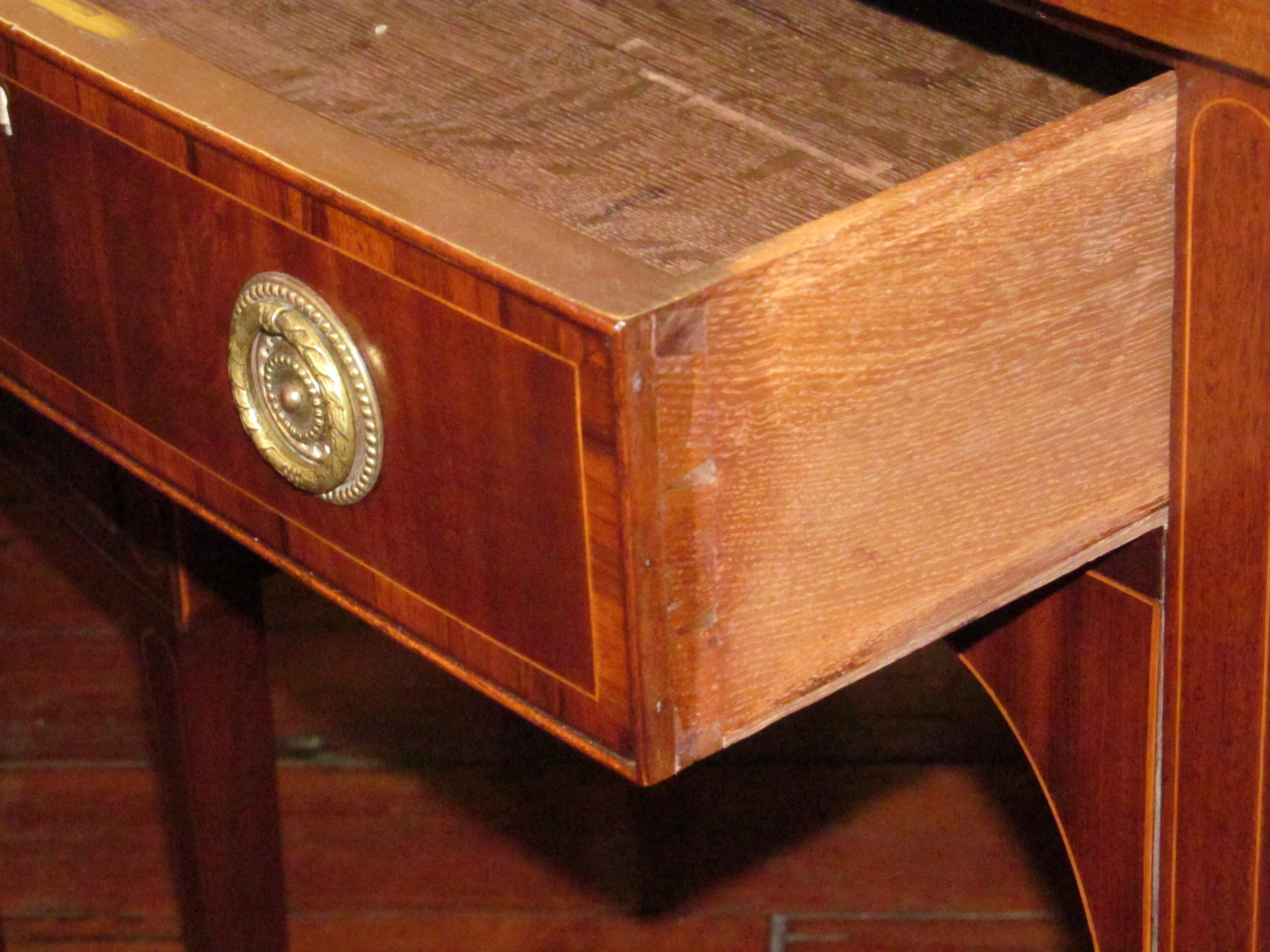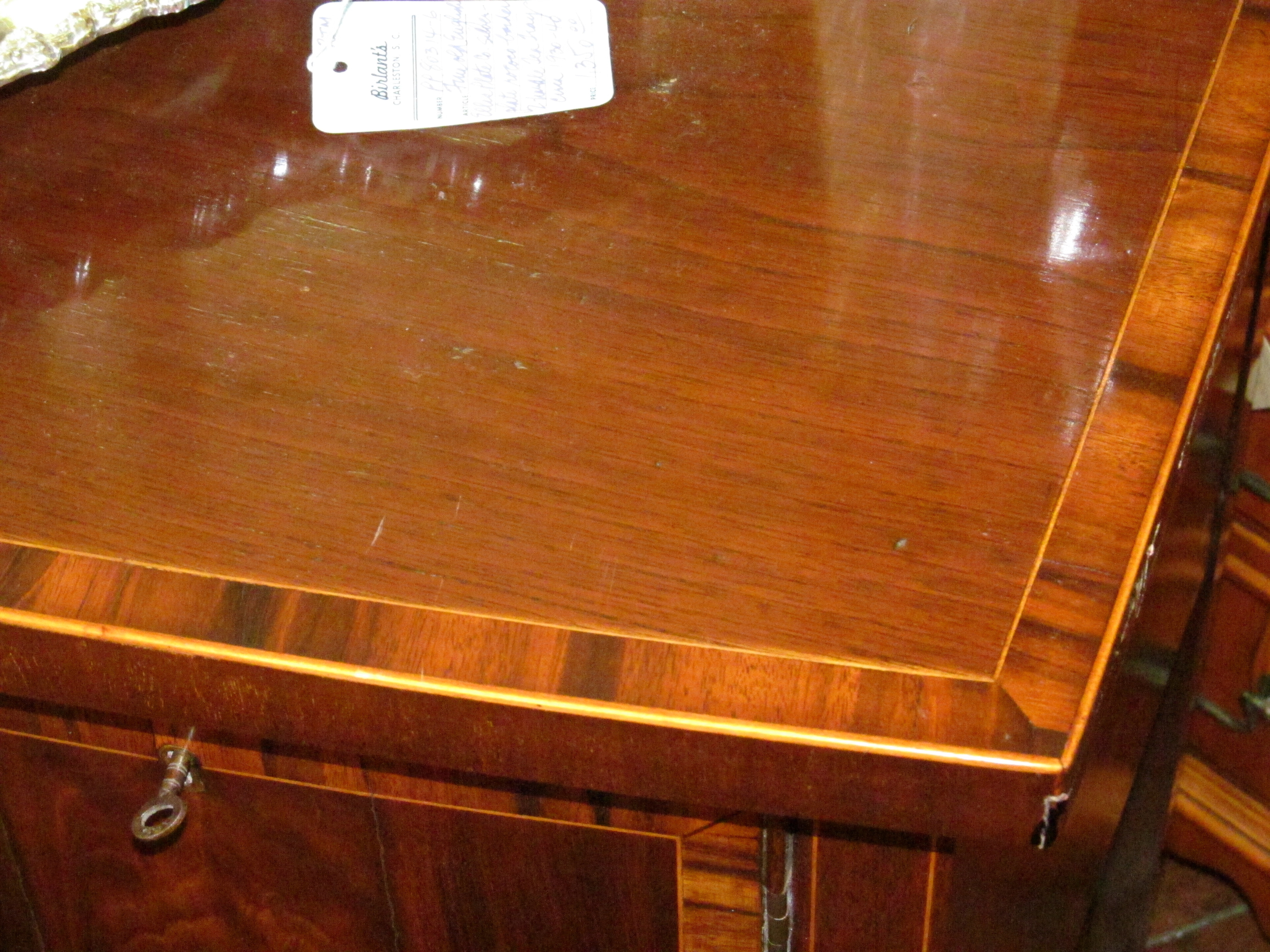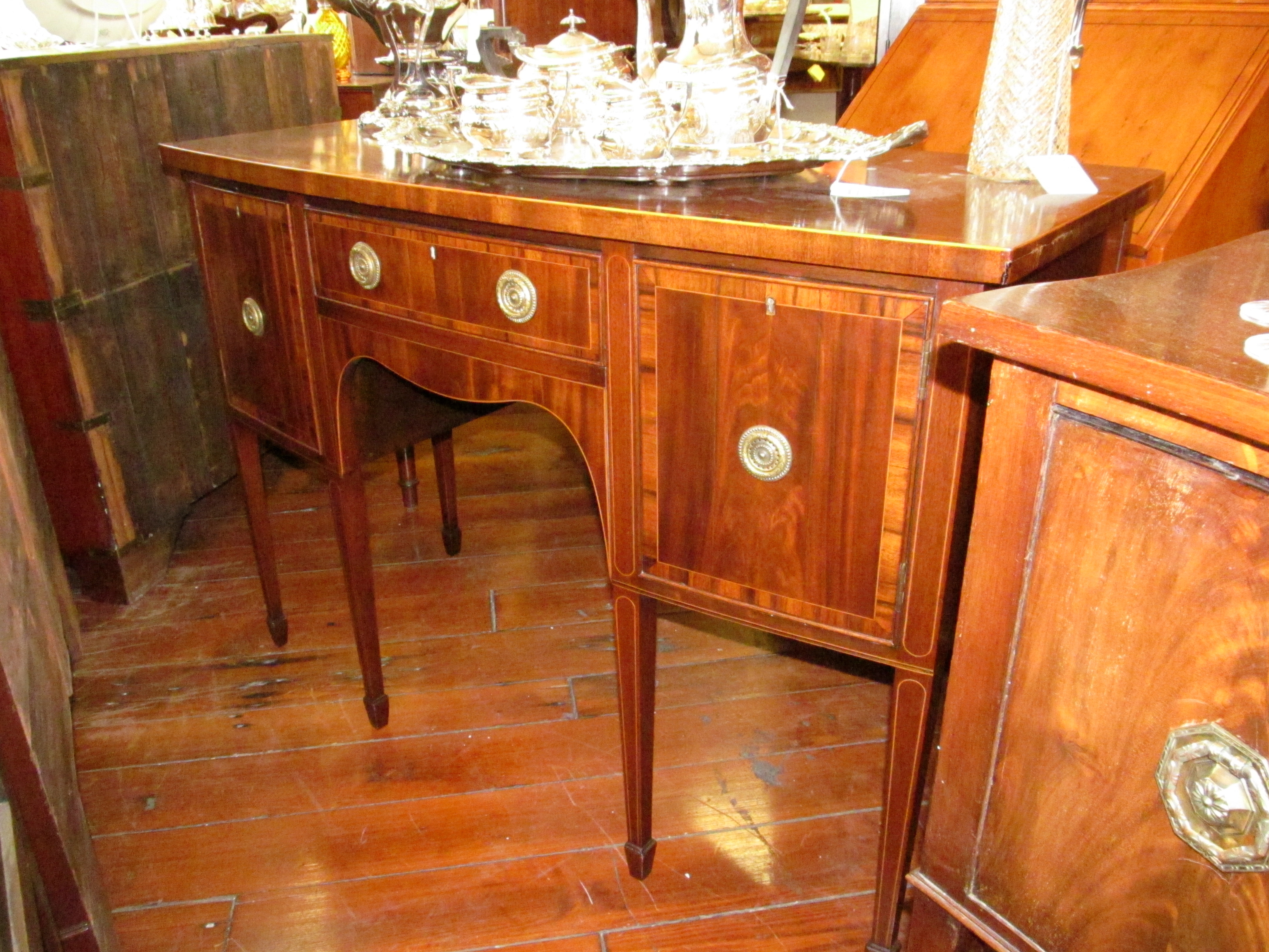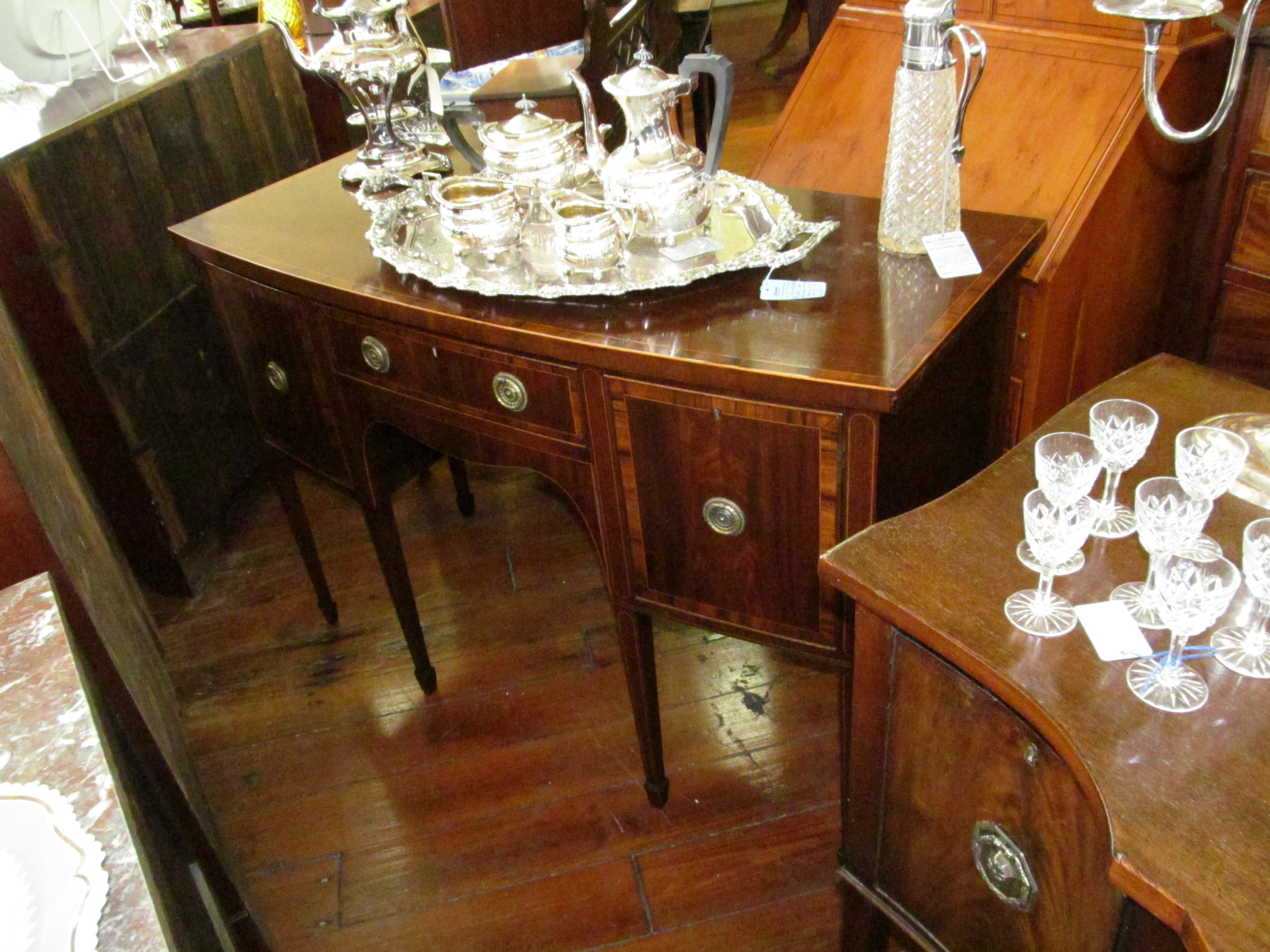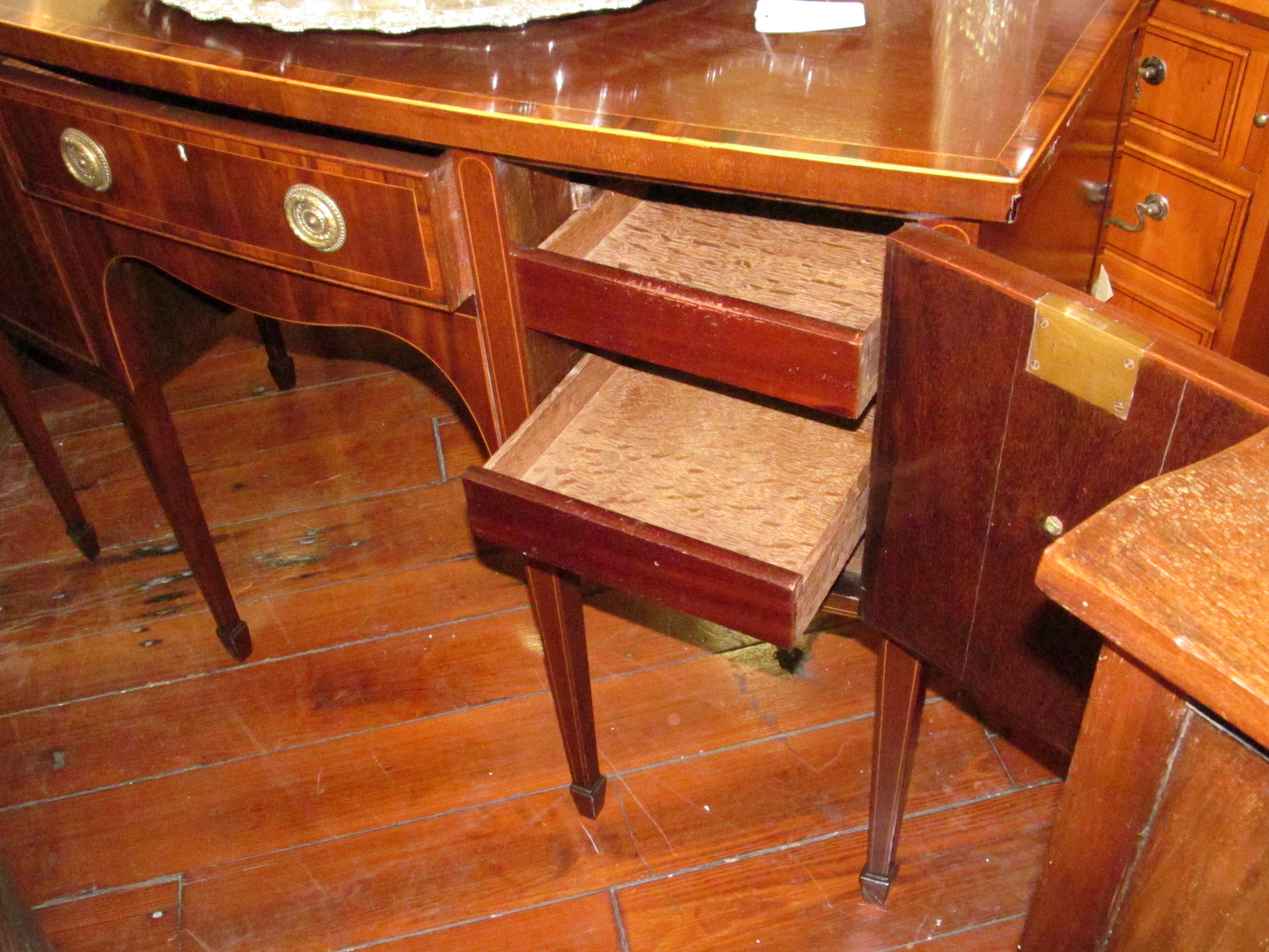 Very Fine Antique English Inlaid Mahogany Hepplewhite Style Bowfronted Sideboard with Rosewood Crossbranded Border.