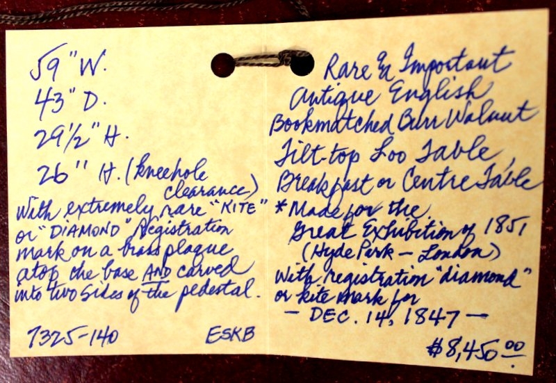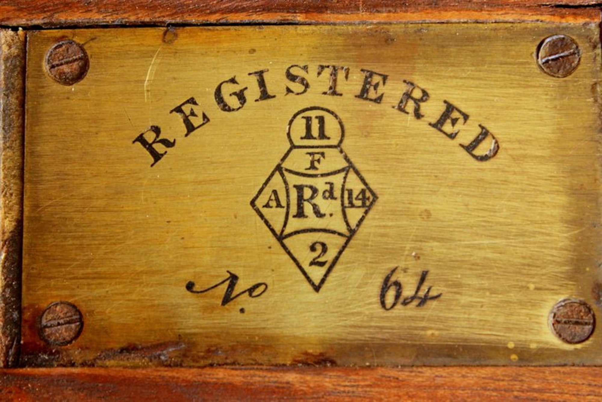 With Extremely rare “kite” or “diamond” registration mark on a brass plaque atop the base and carved into two sides of the pedestal.