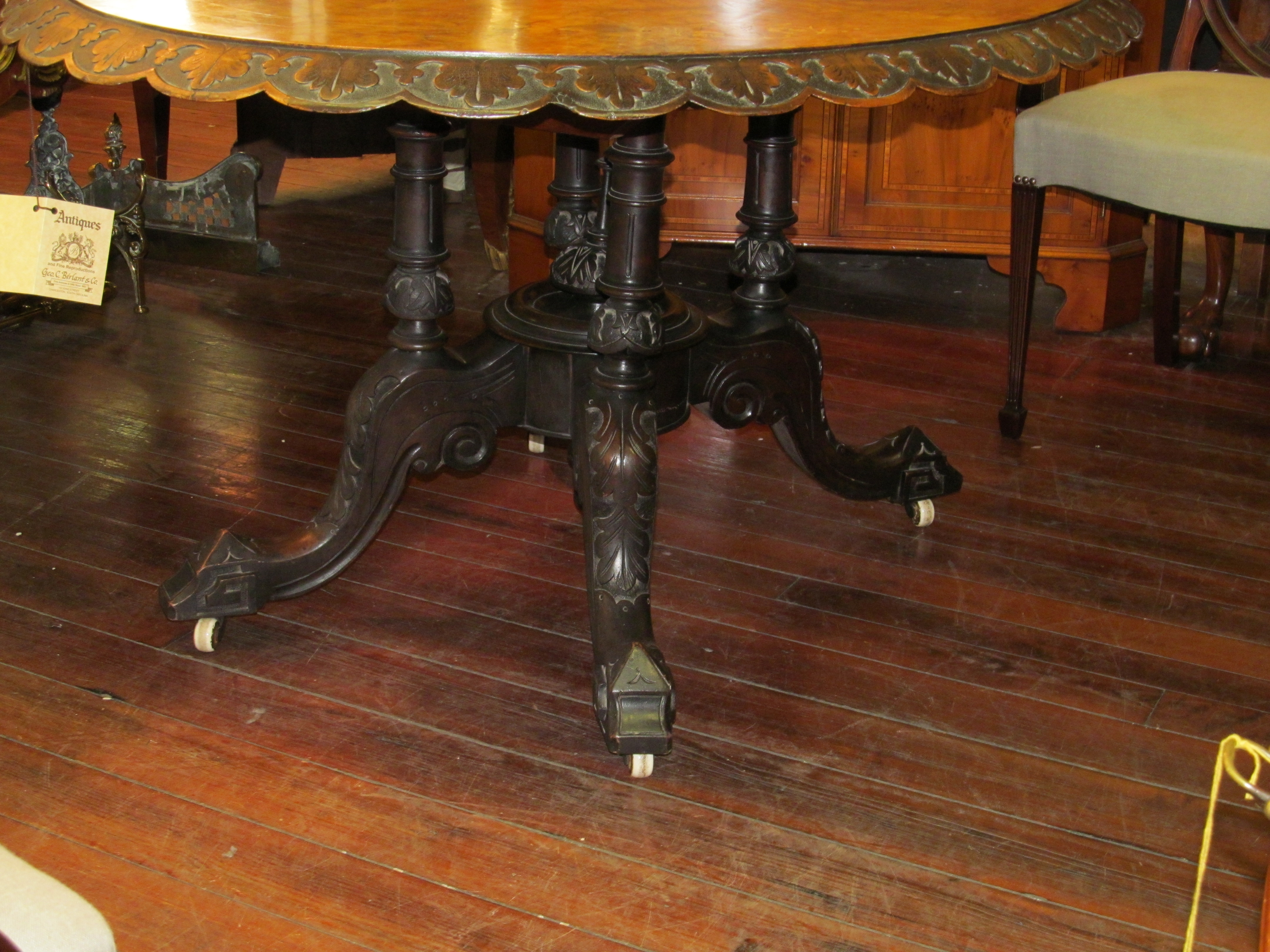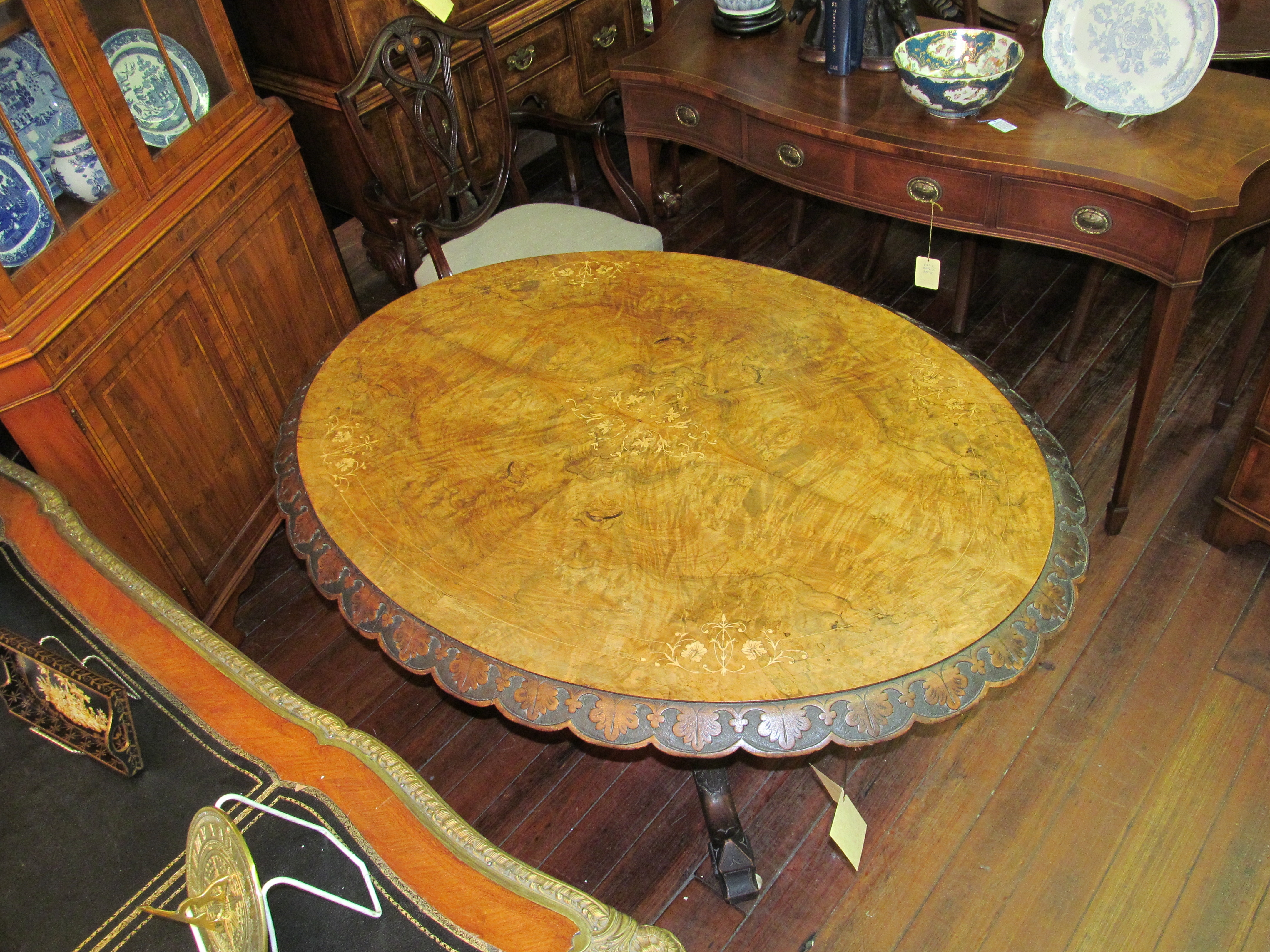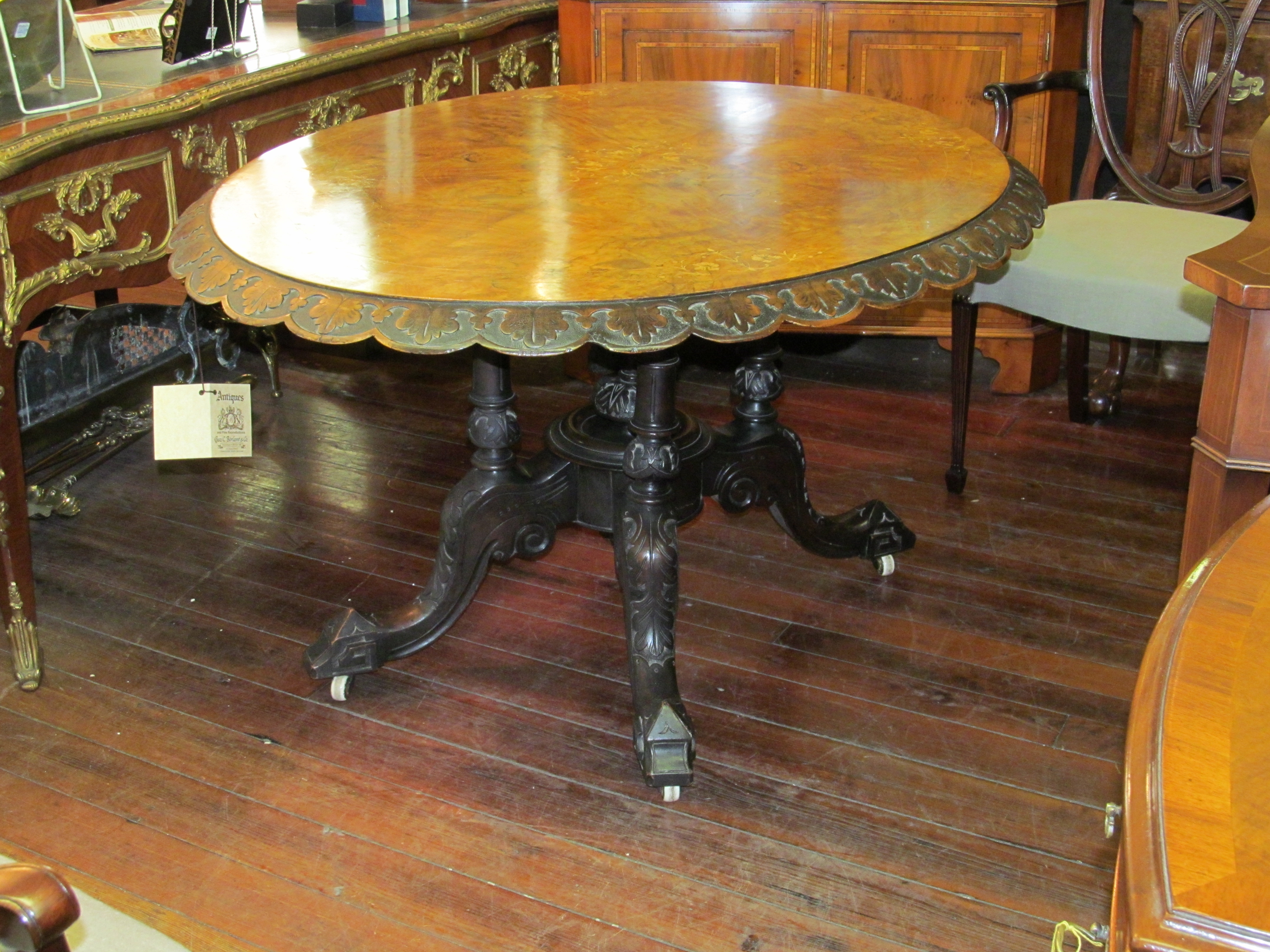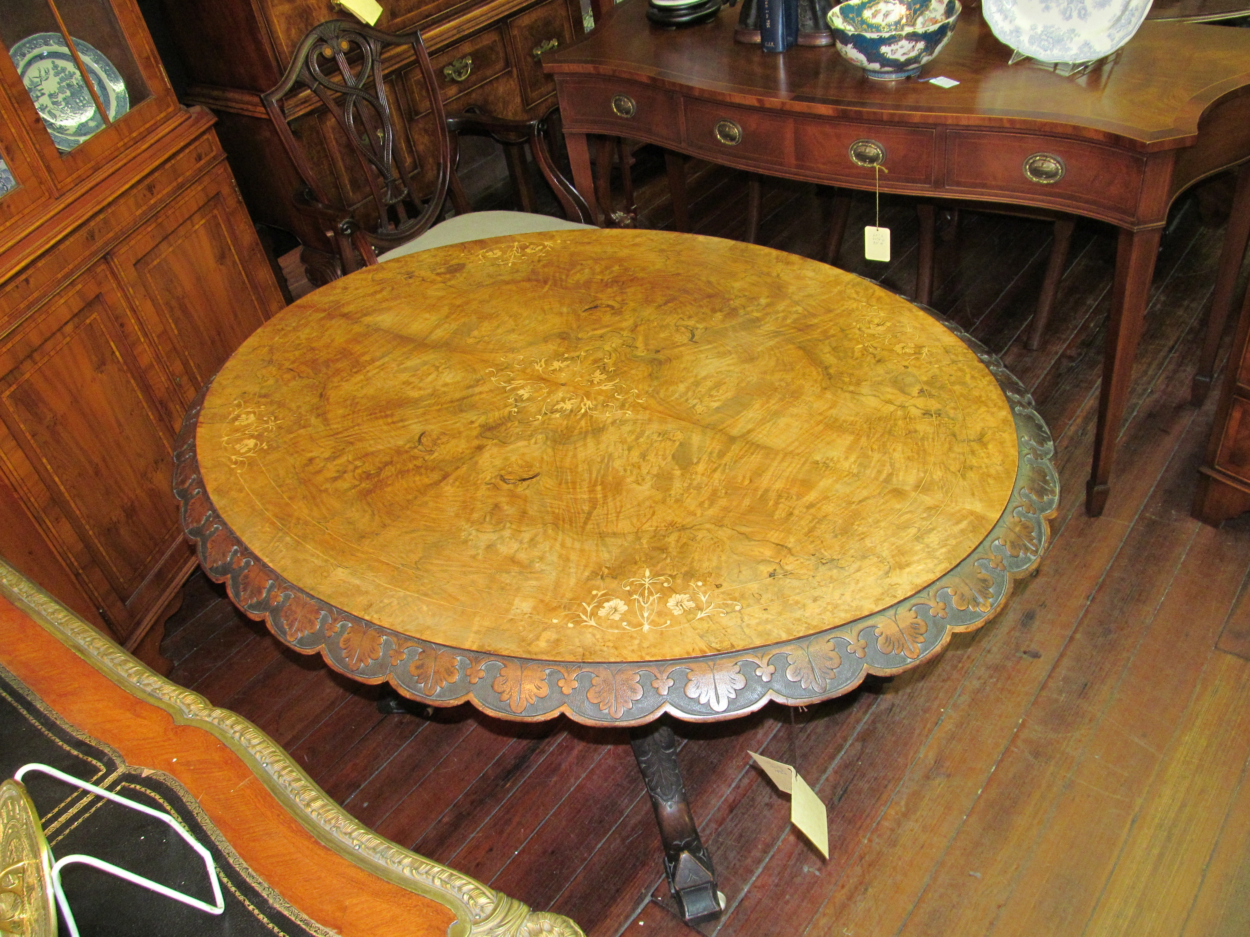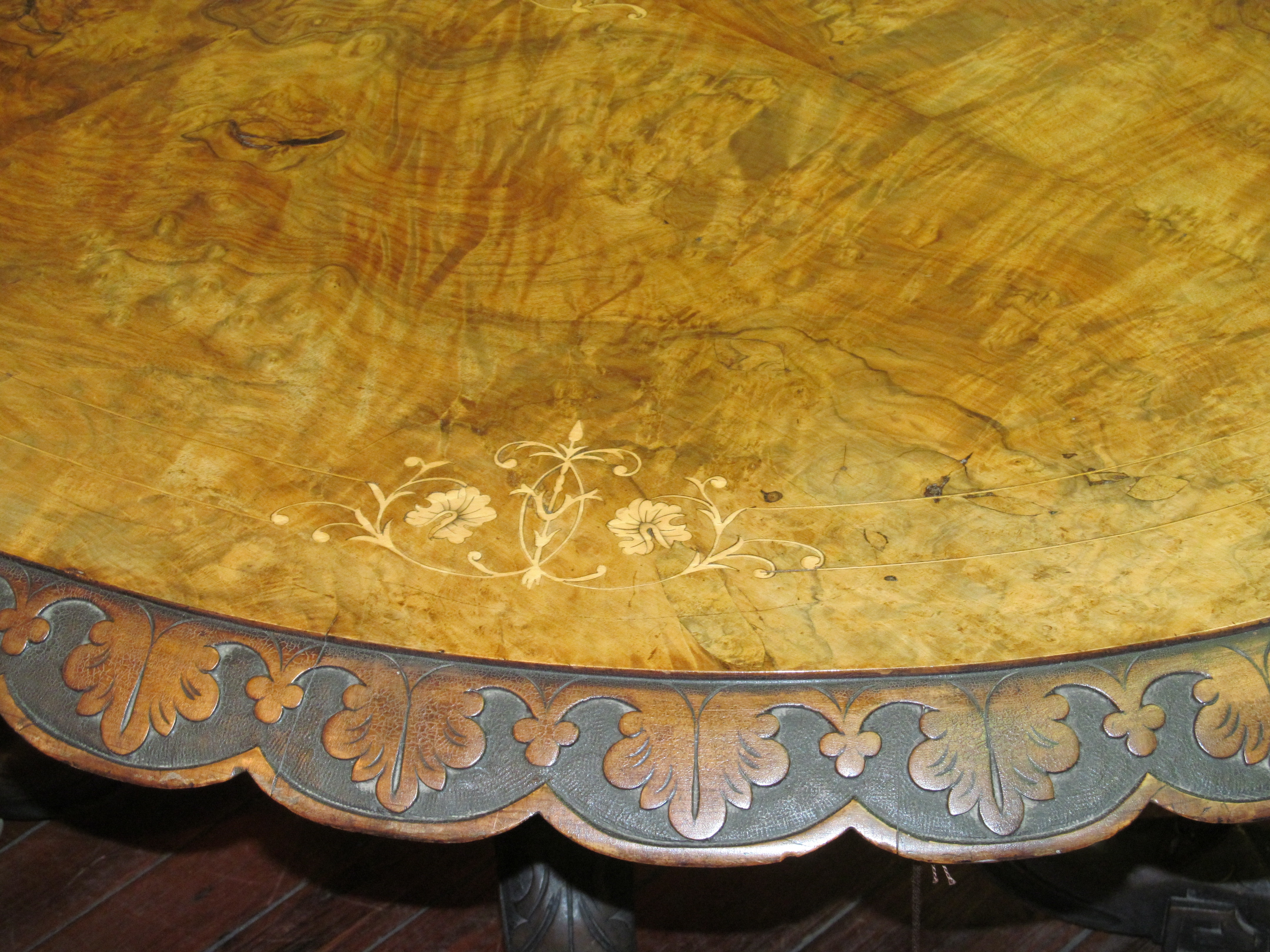 Magnificent Quality Antique English Marquetry Inlaid Hand Carved Burl Walnut and Mahogany Tilt-Top Loo Table.