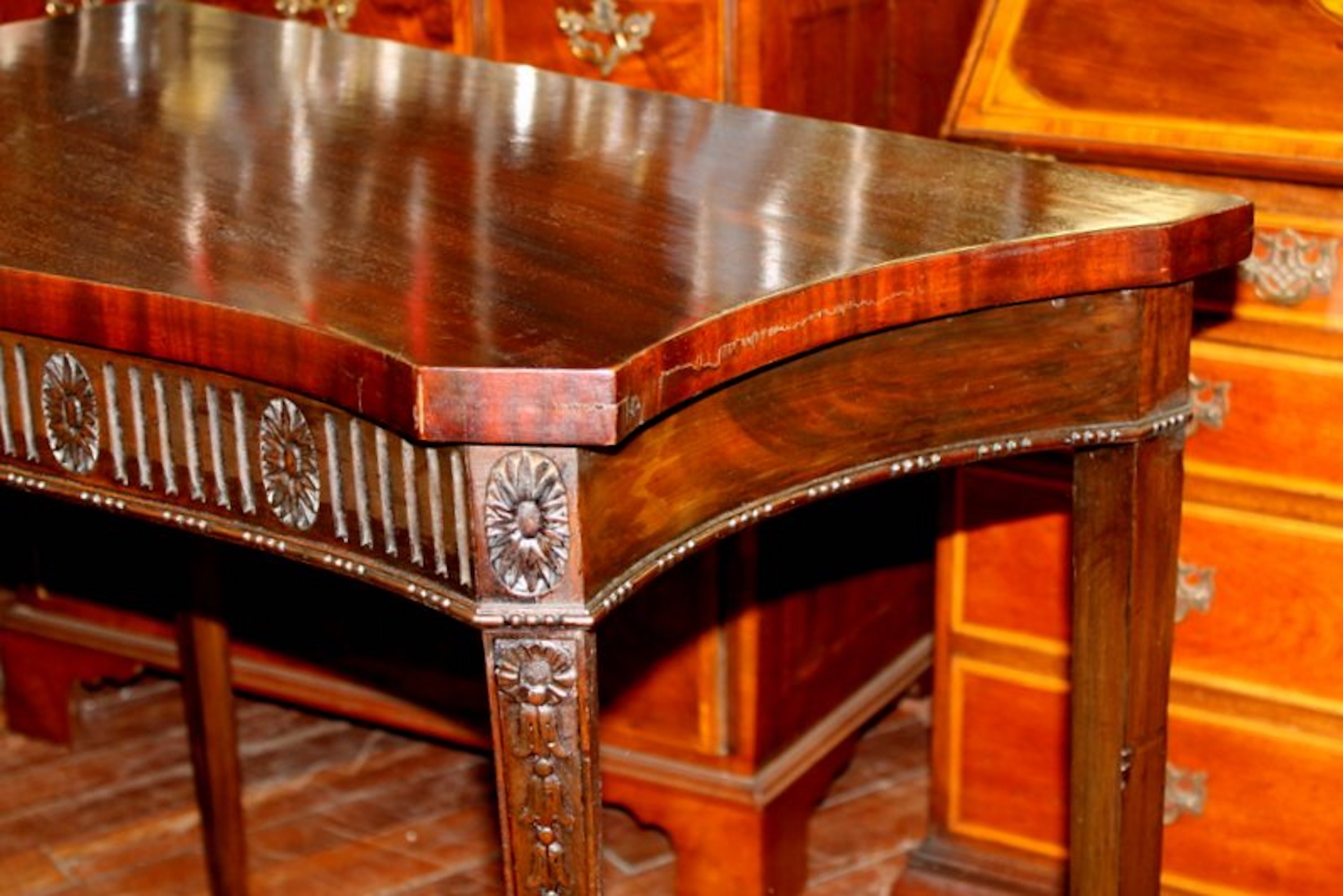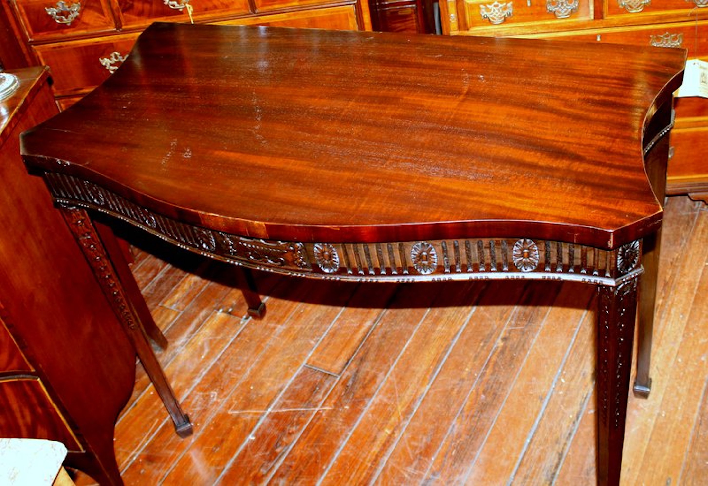 You are here: Home / All Inventory / Antique English Hand Carved Mahogany “Adam” Style Serpentine Server or Hall Console