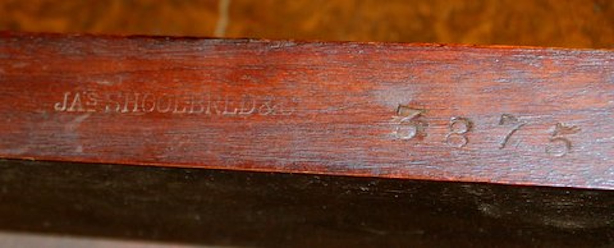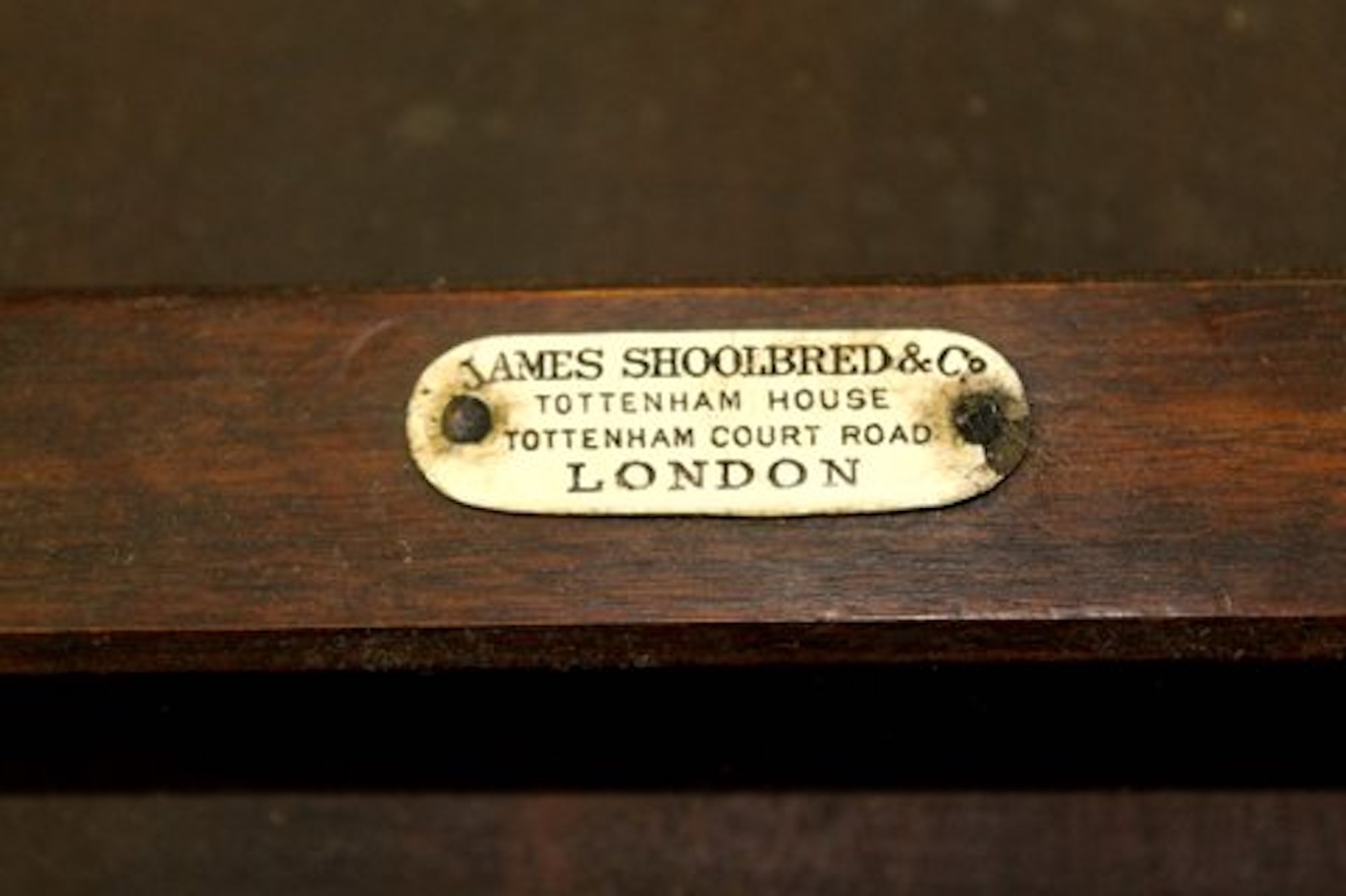 “Signed” and embossed on underside of table by one of London’s most famous cabinet makers: James Shoolbred and Co.