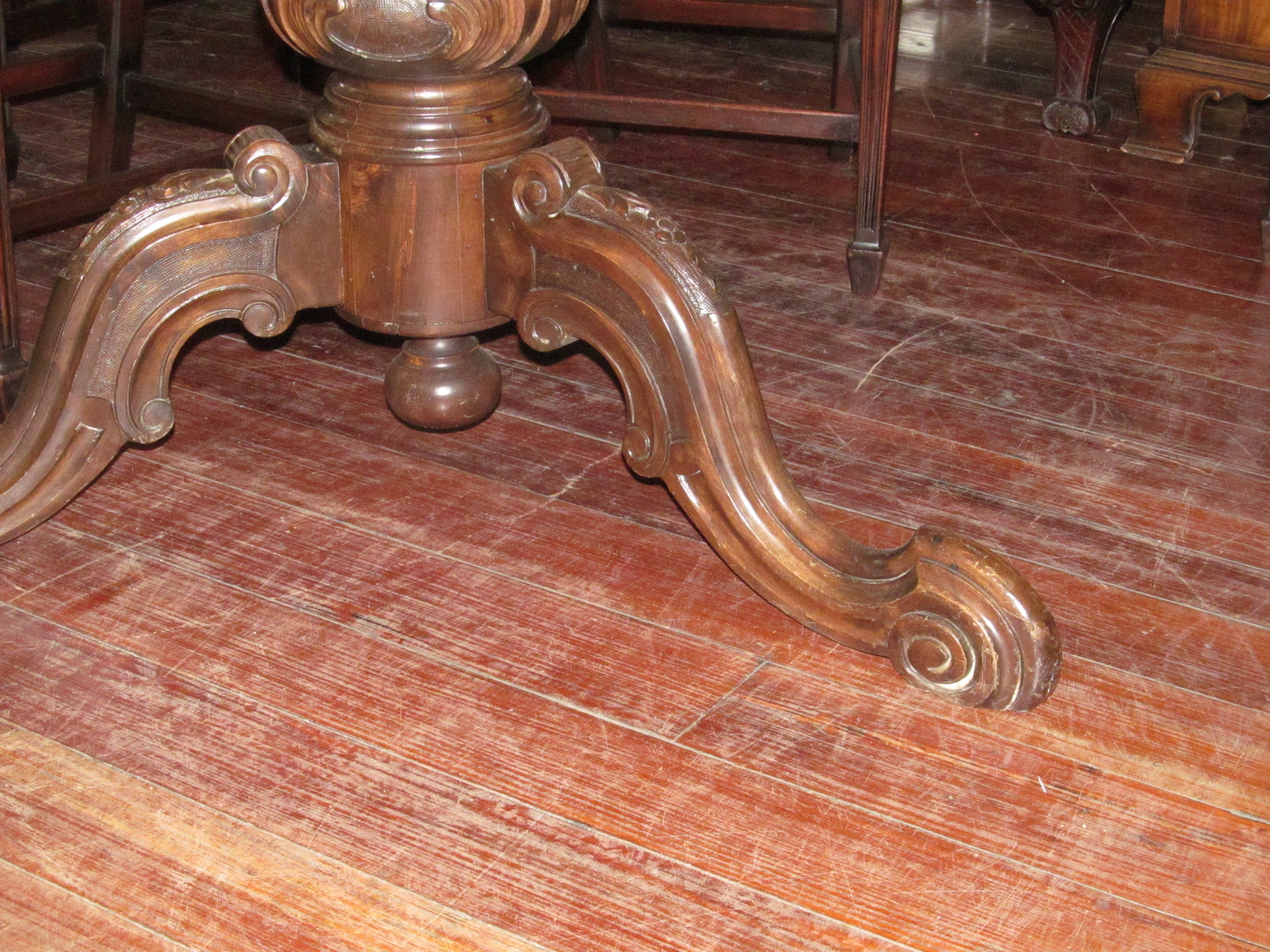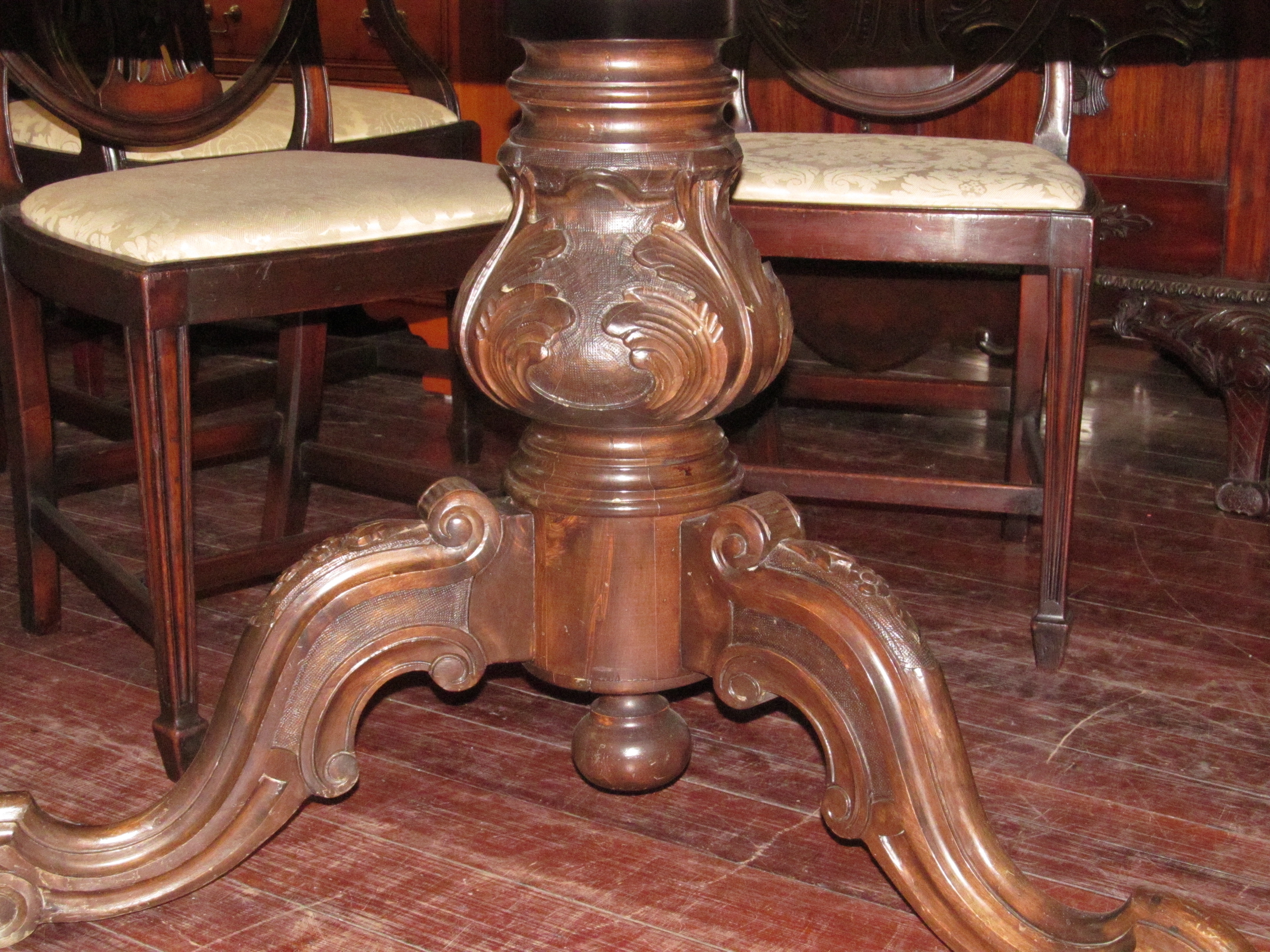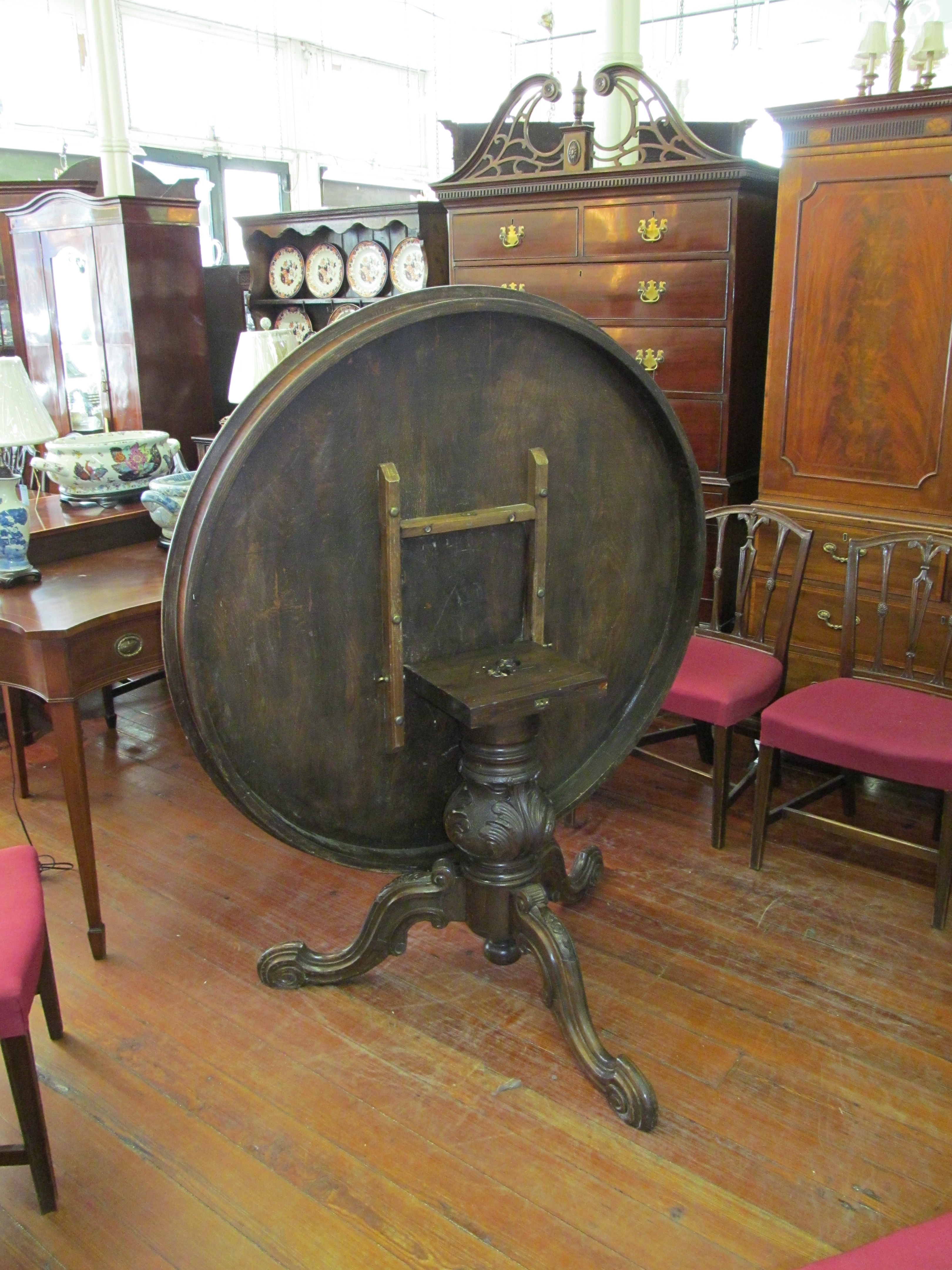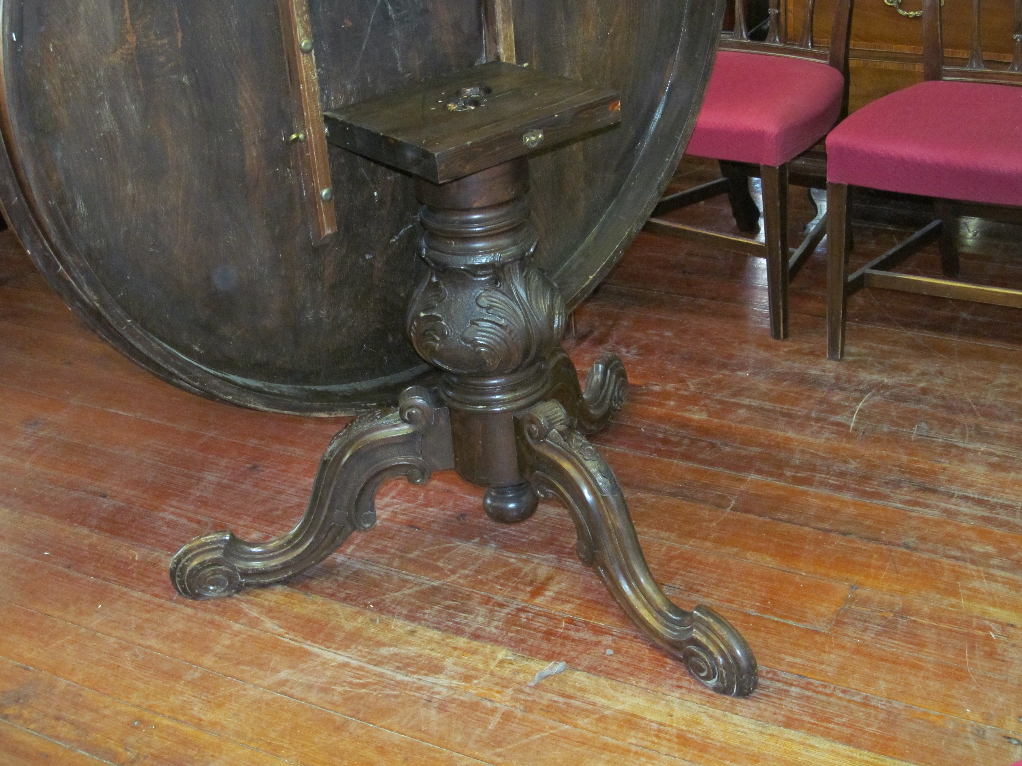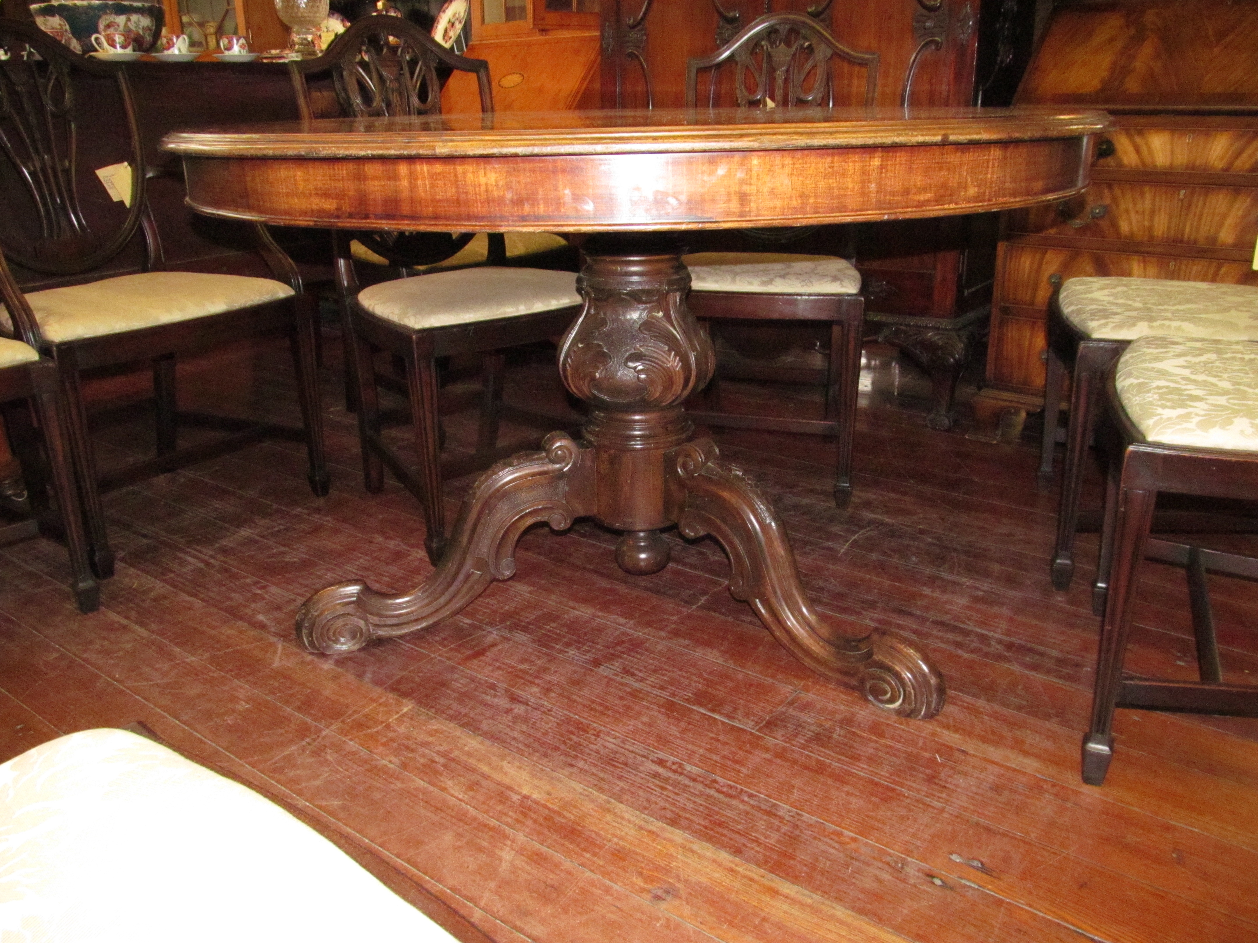 Fabulous Quality Antique English Marquetry Inlaid Tilt-Top Walnut Circular Table with extraordinary carved base.