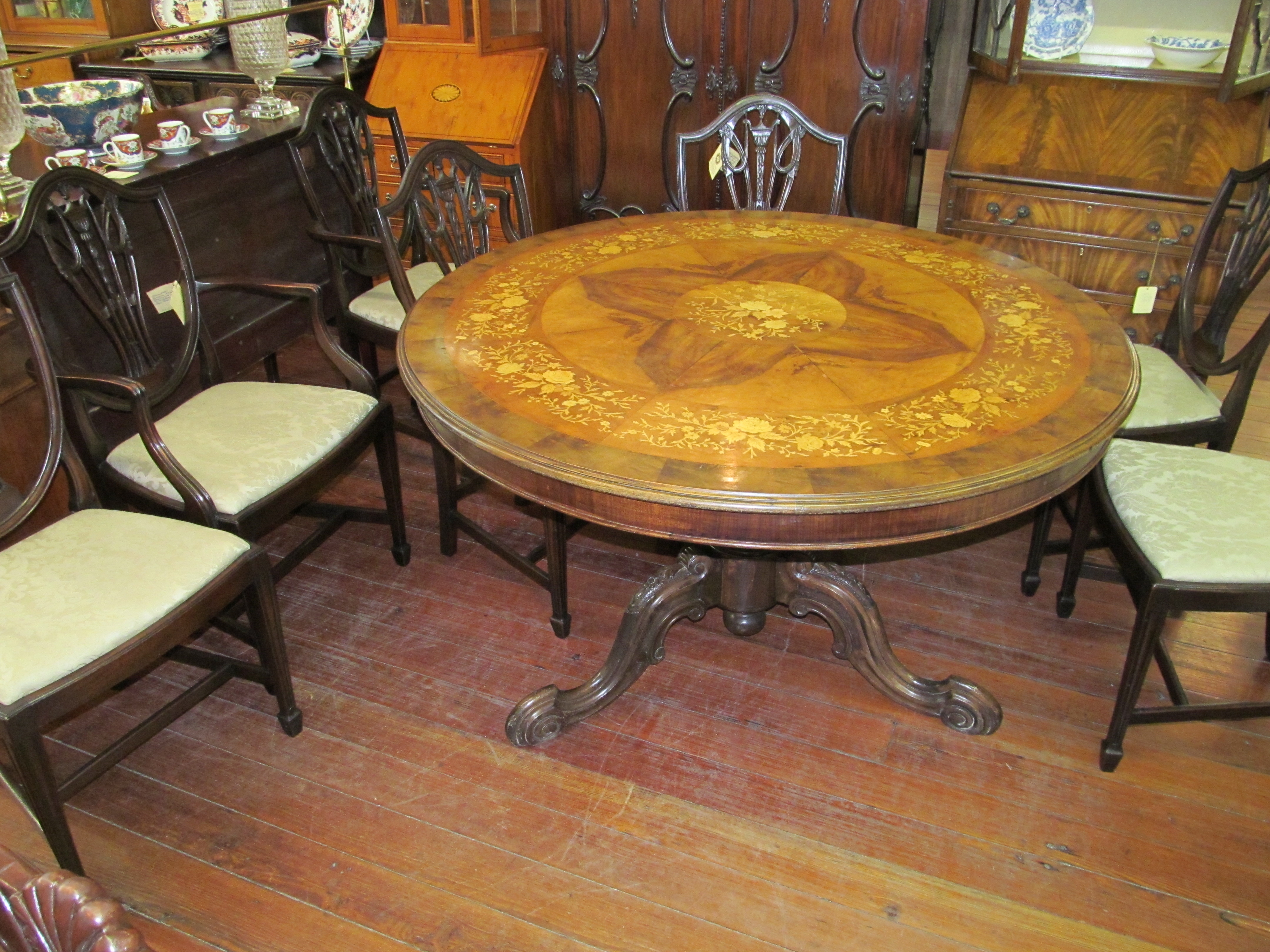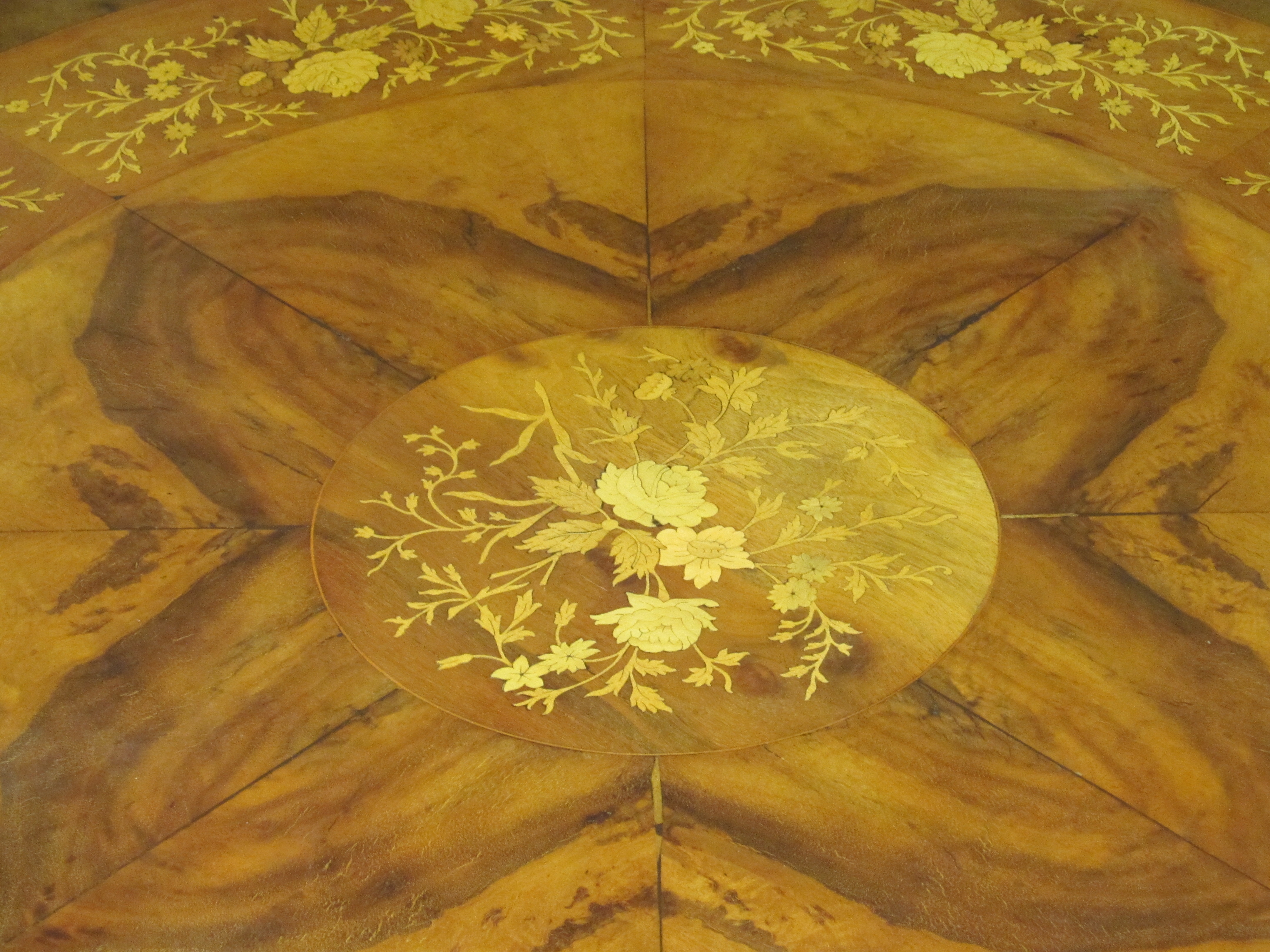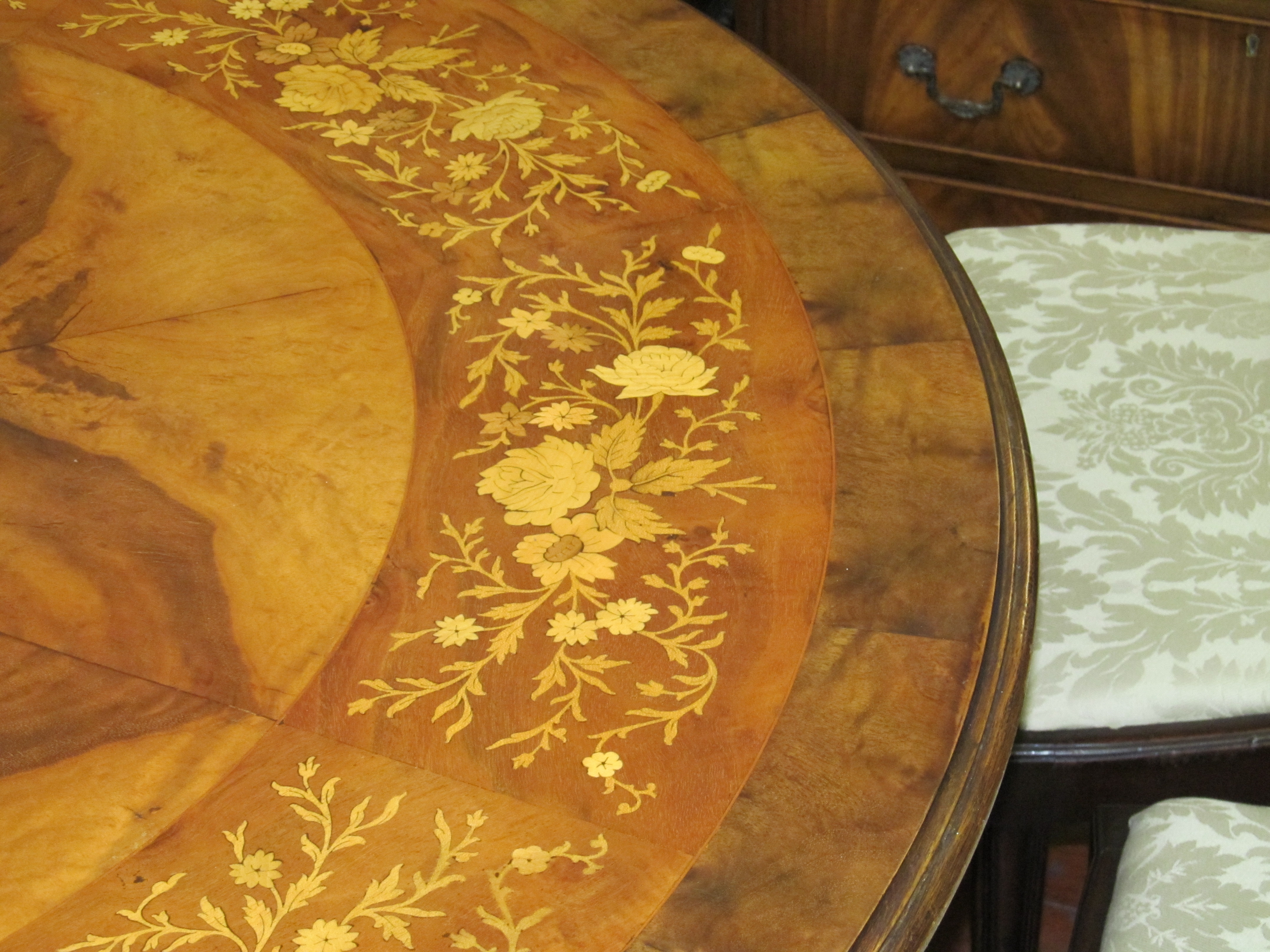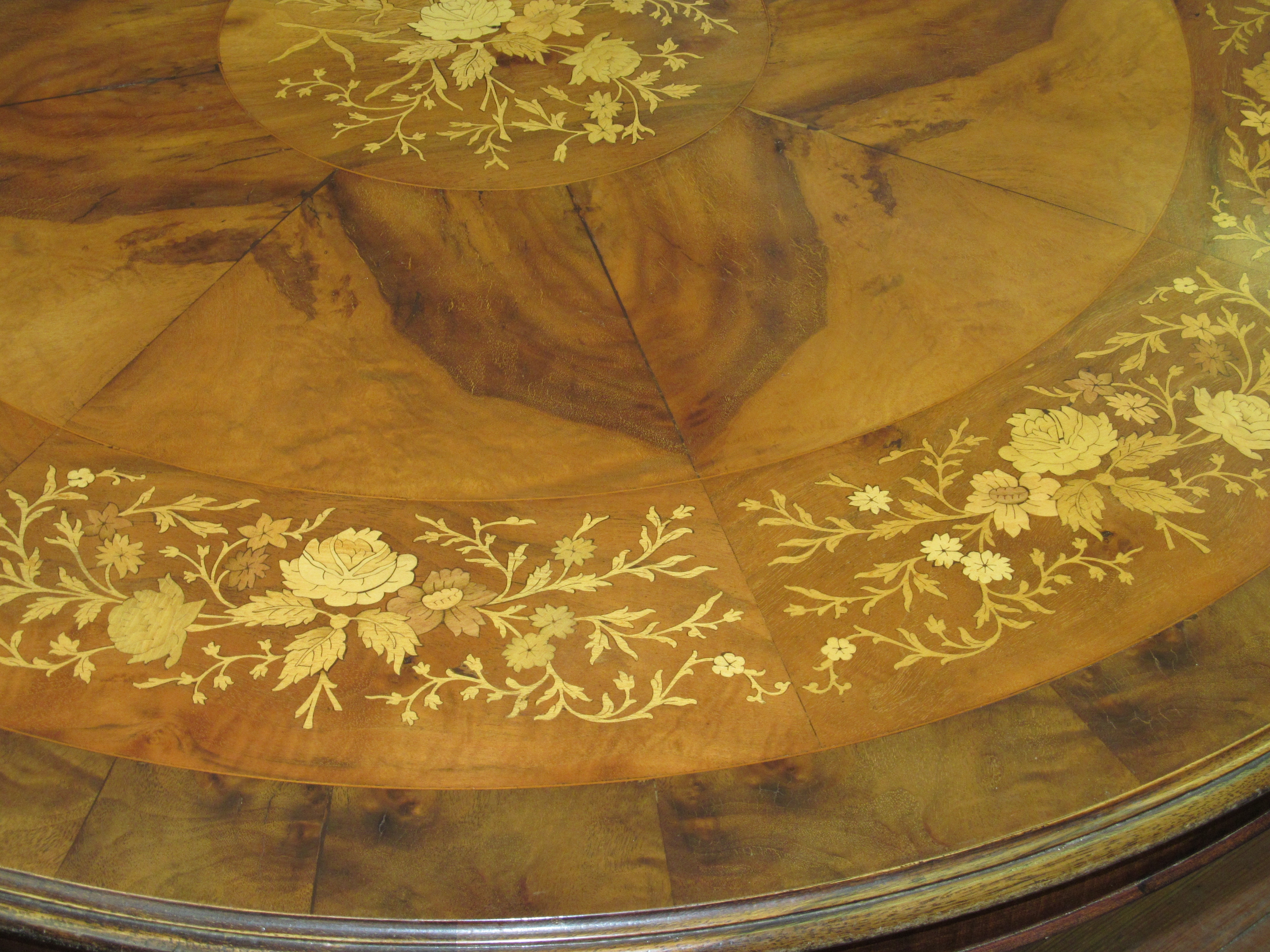 Please note superb marquetry inlaid flowers and radial veneers throughout.
