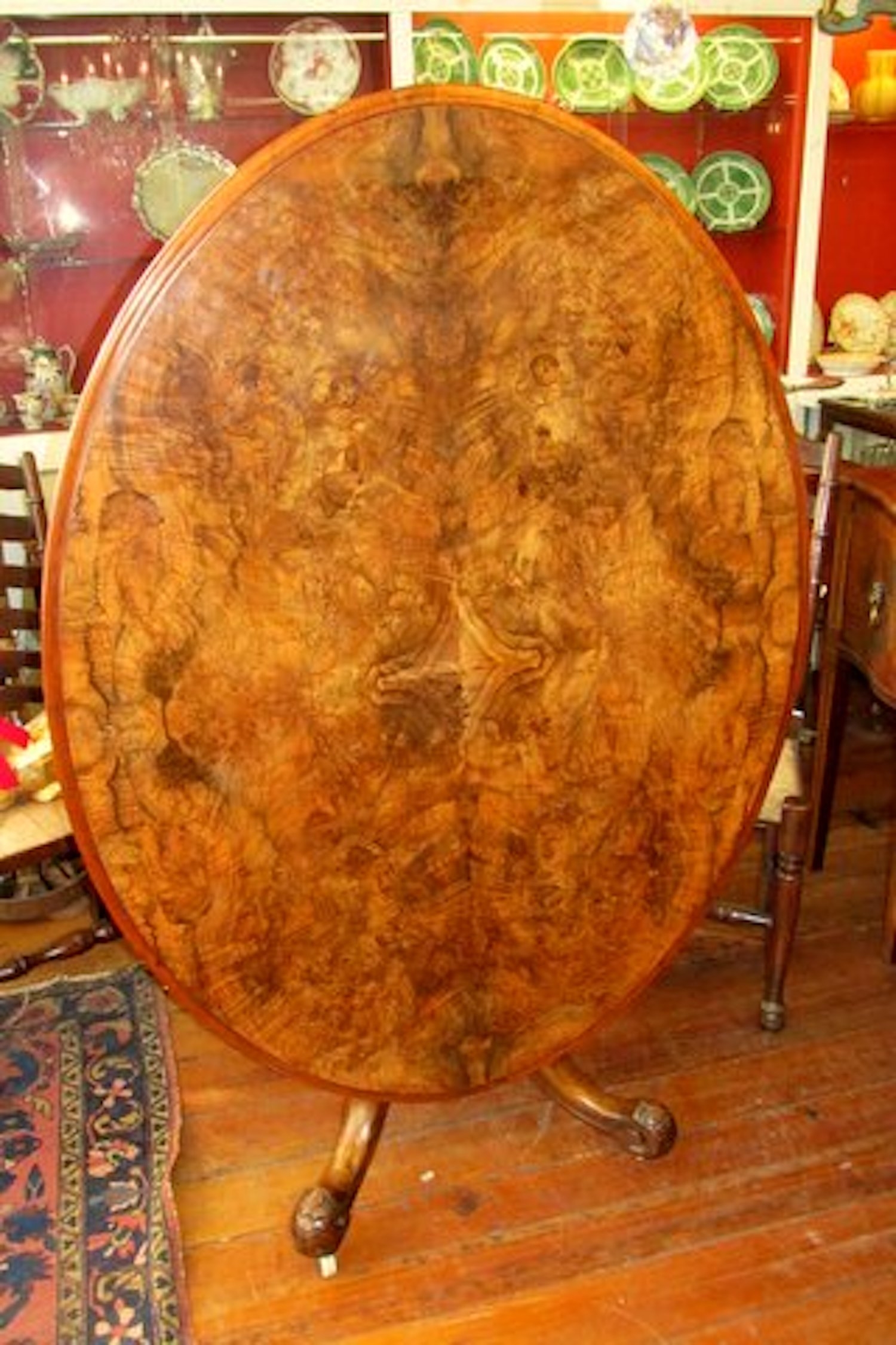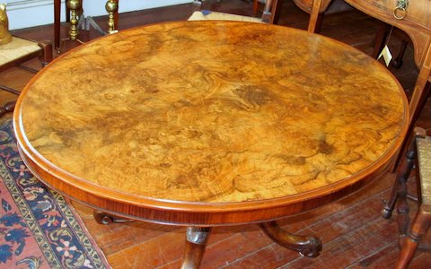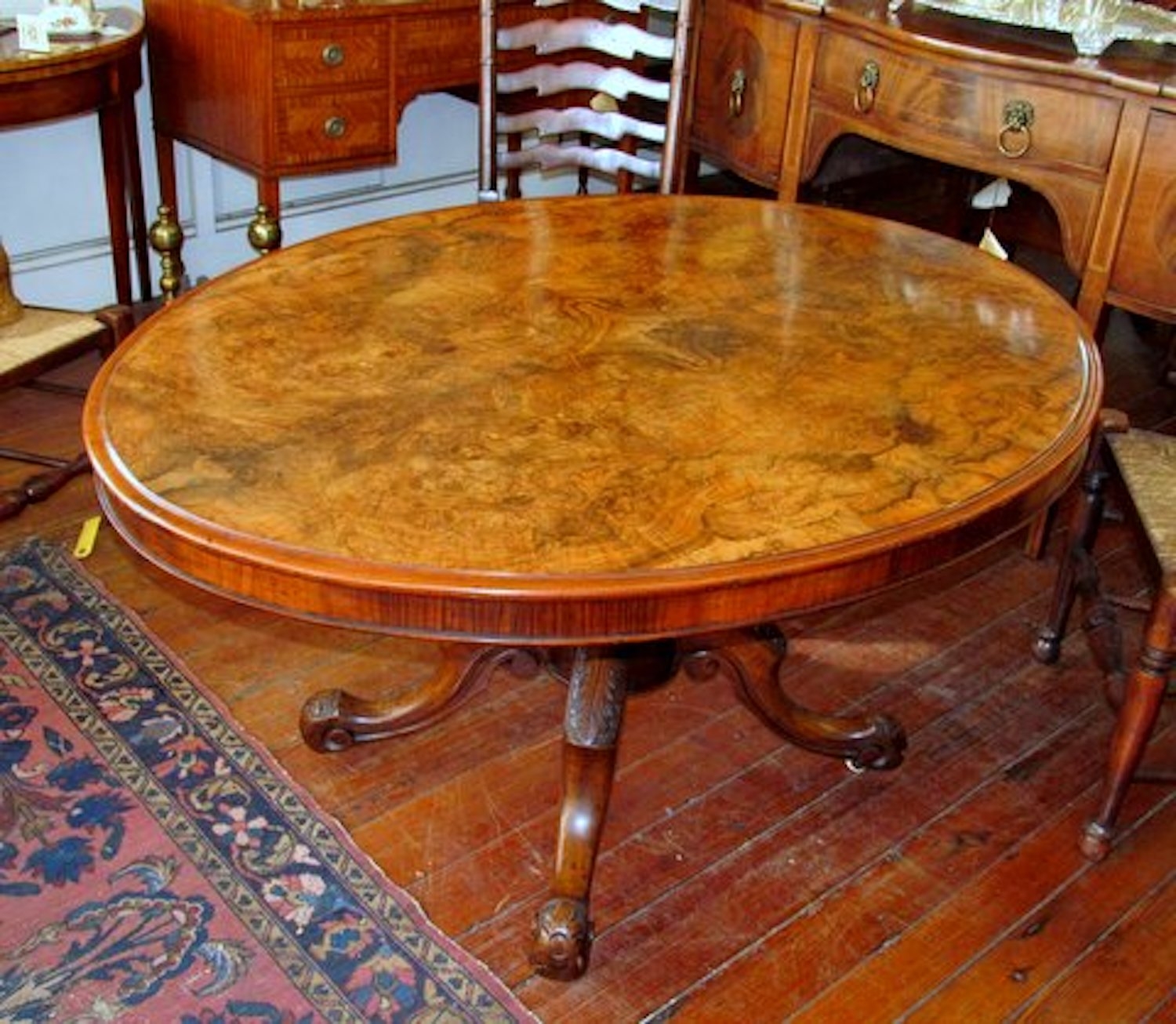 Please note superbly book-matched burr walnut and intricately hand-carved pedestal and legs
