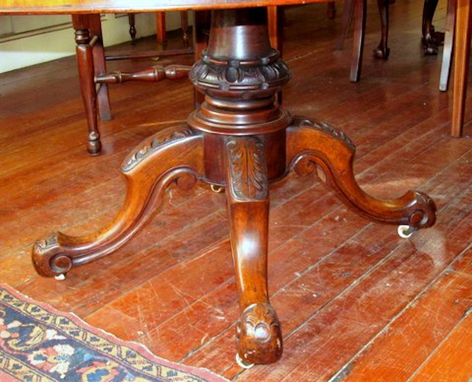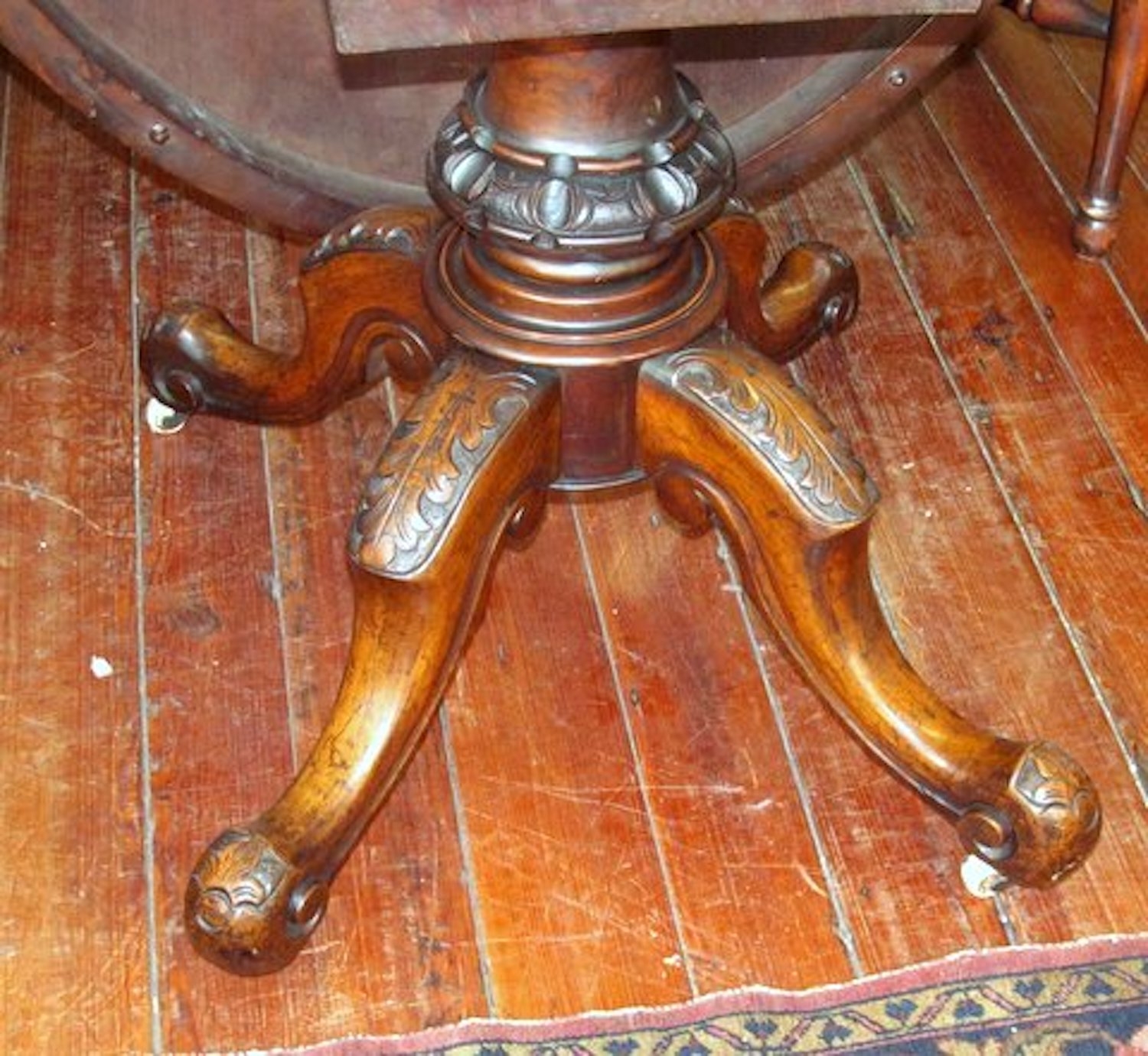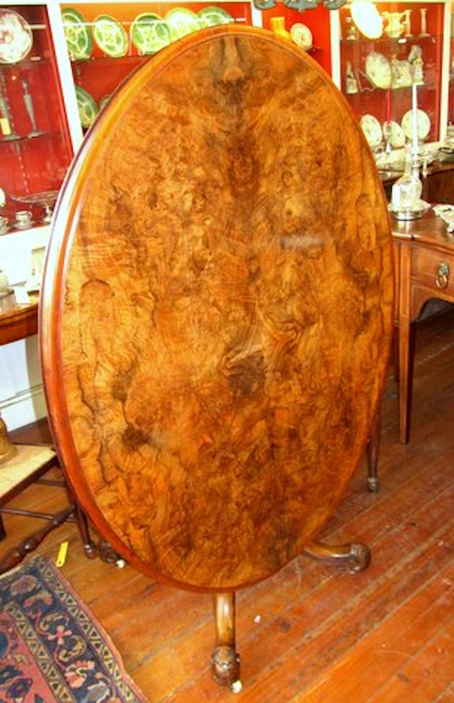 Please note superbly book-matched burr walnut and intricately hand-carved pedestal and legs