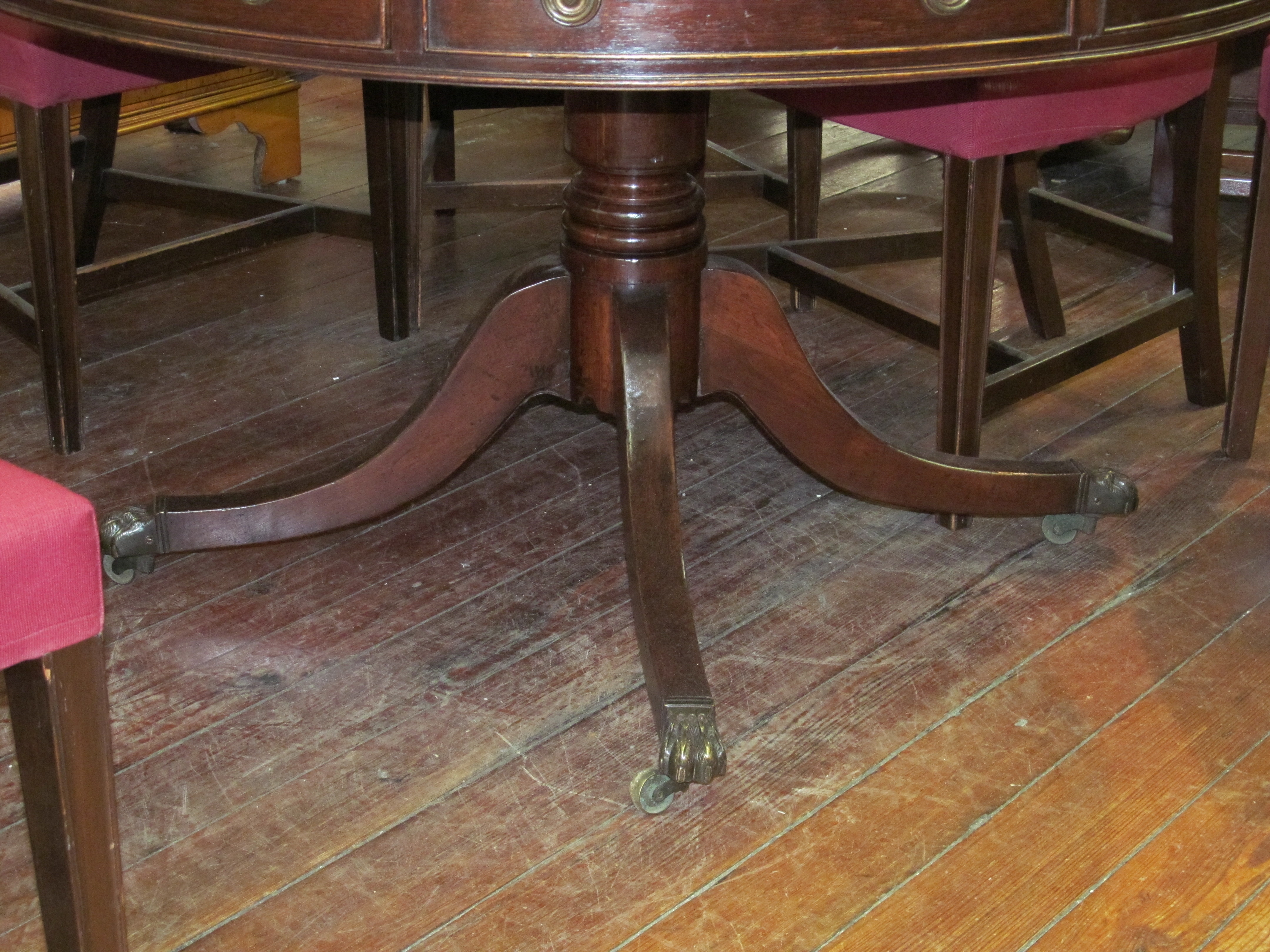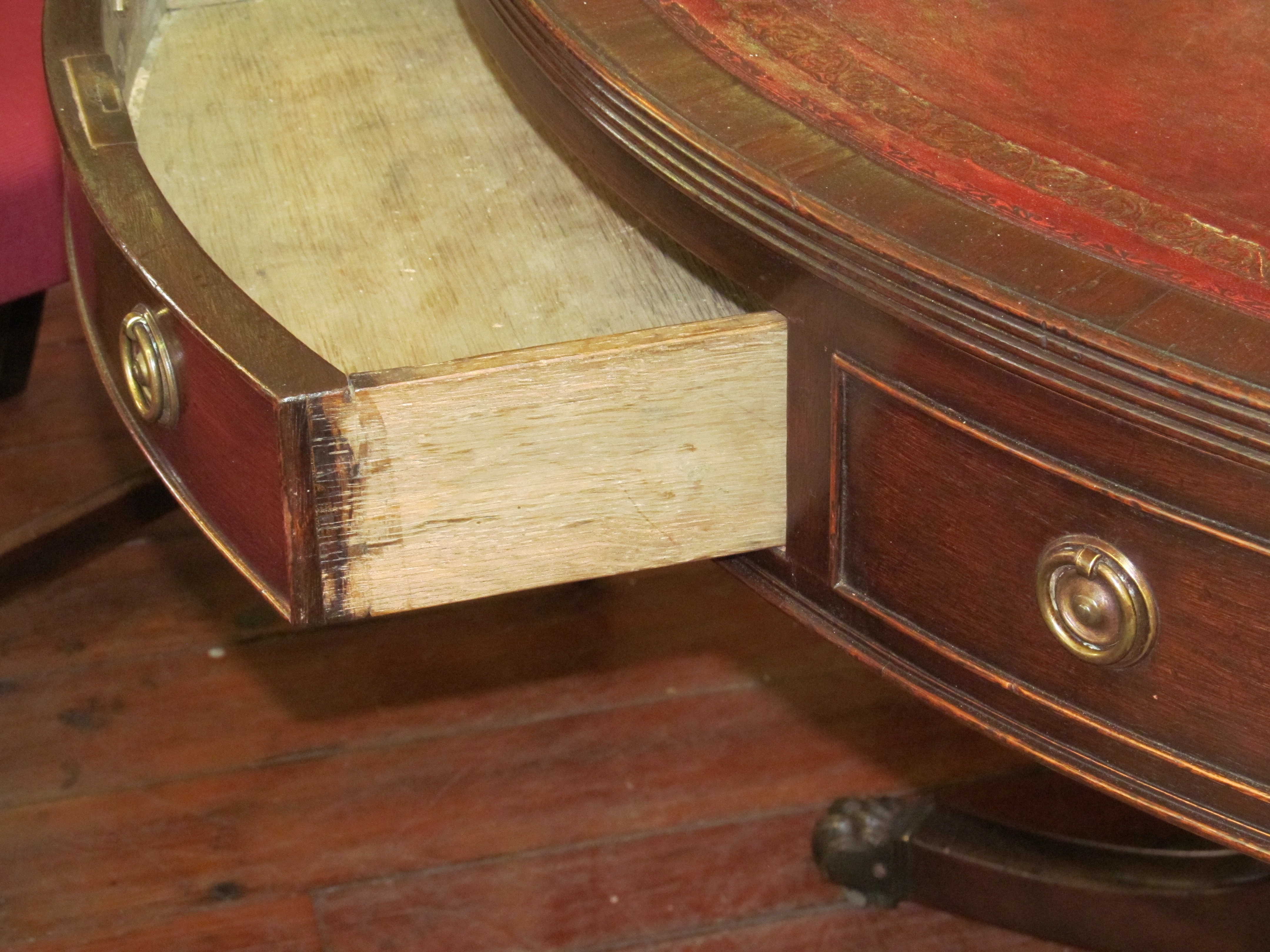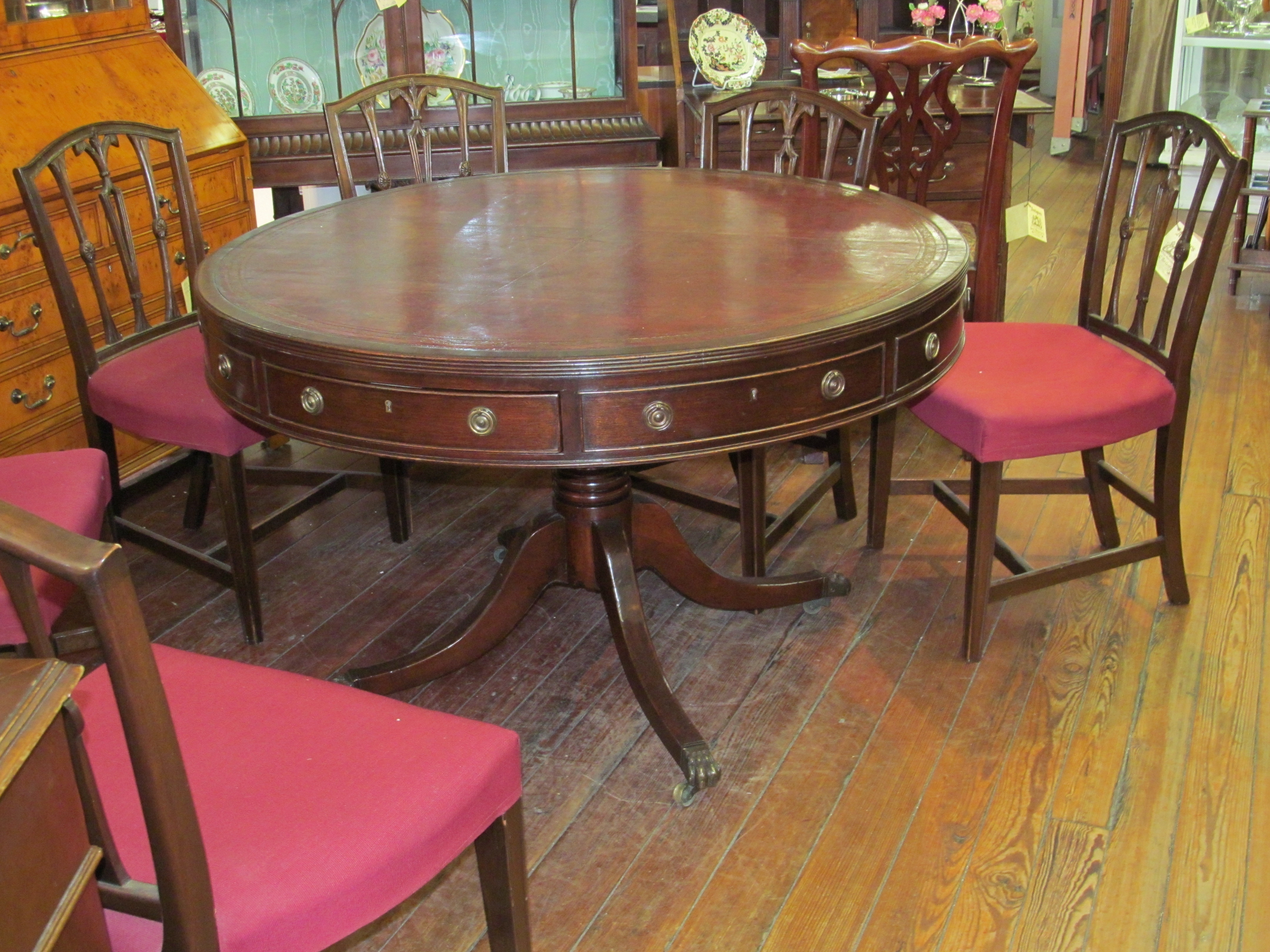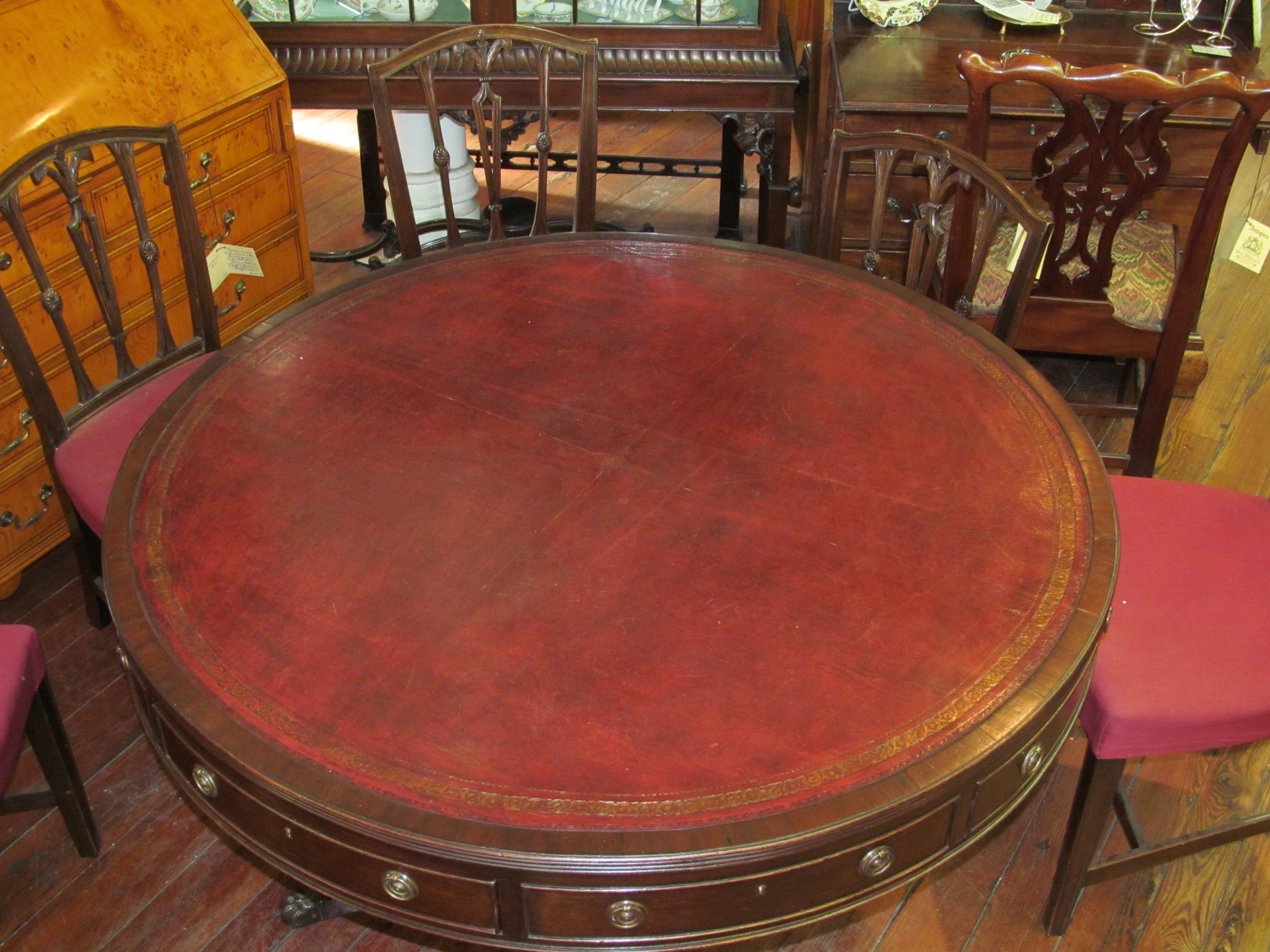 Very Fine and Important Antique English William IV Mahogany and tooled leather circular Library Table or Drum Top Rent Table.