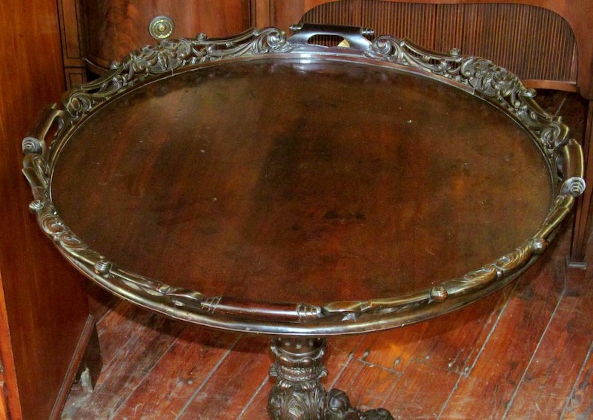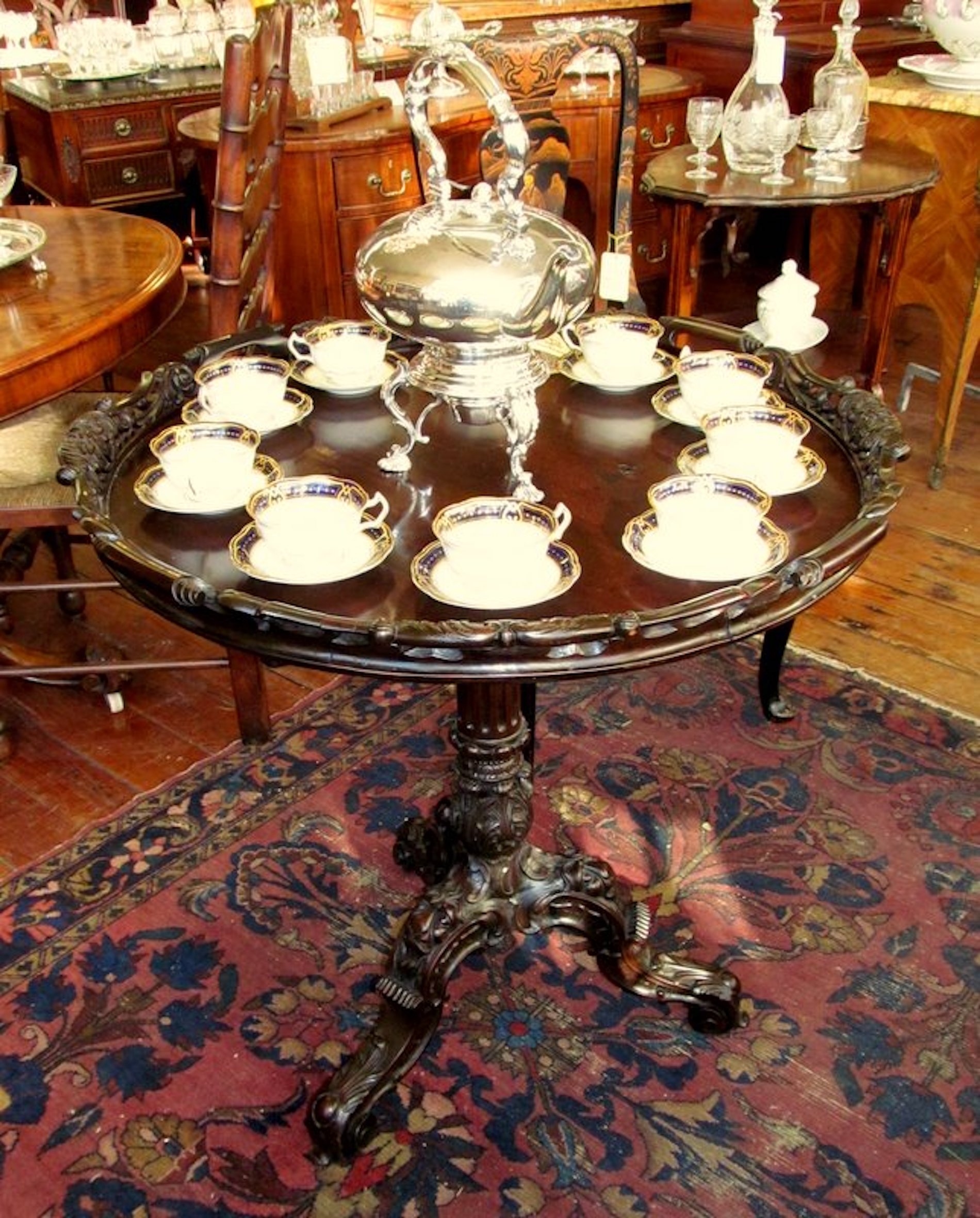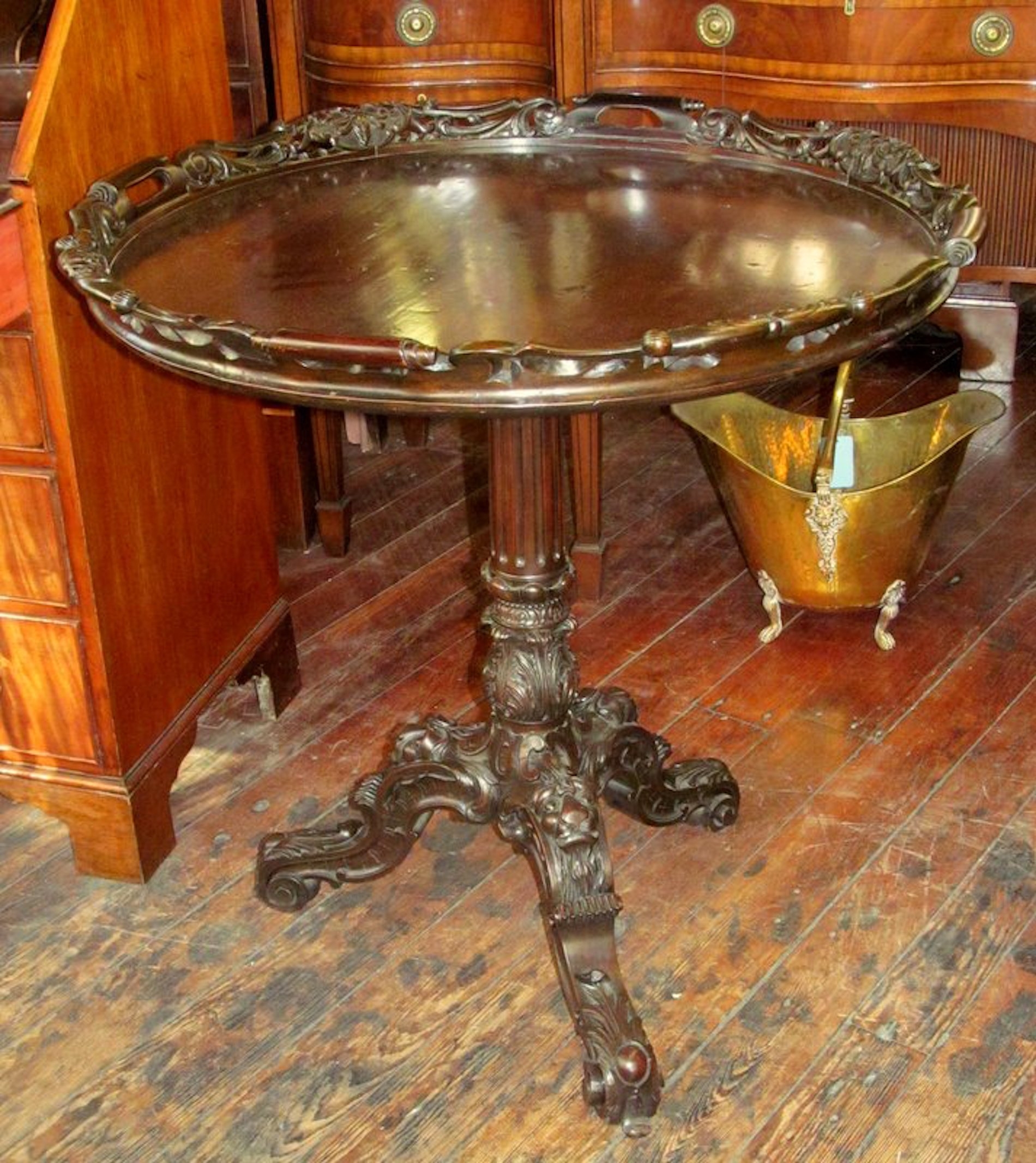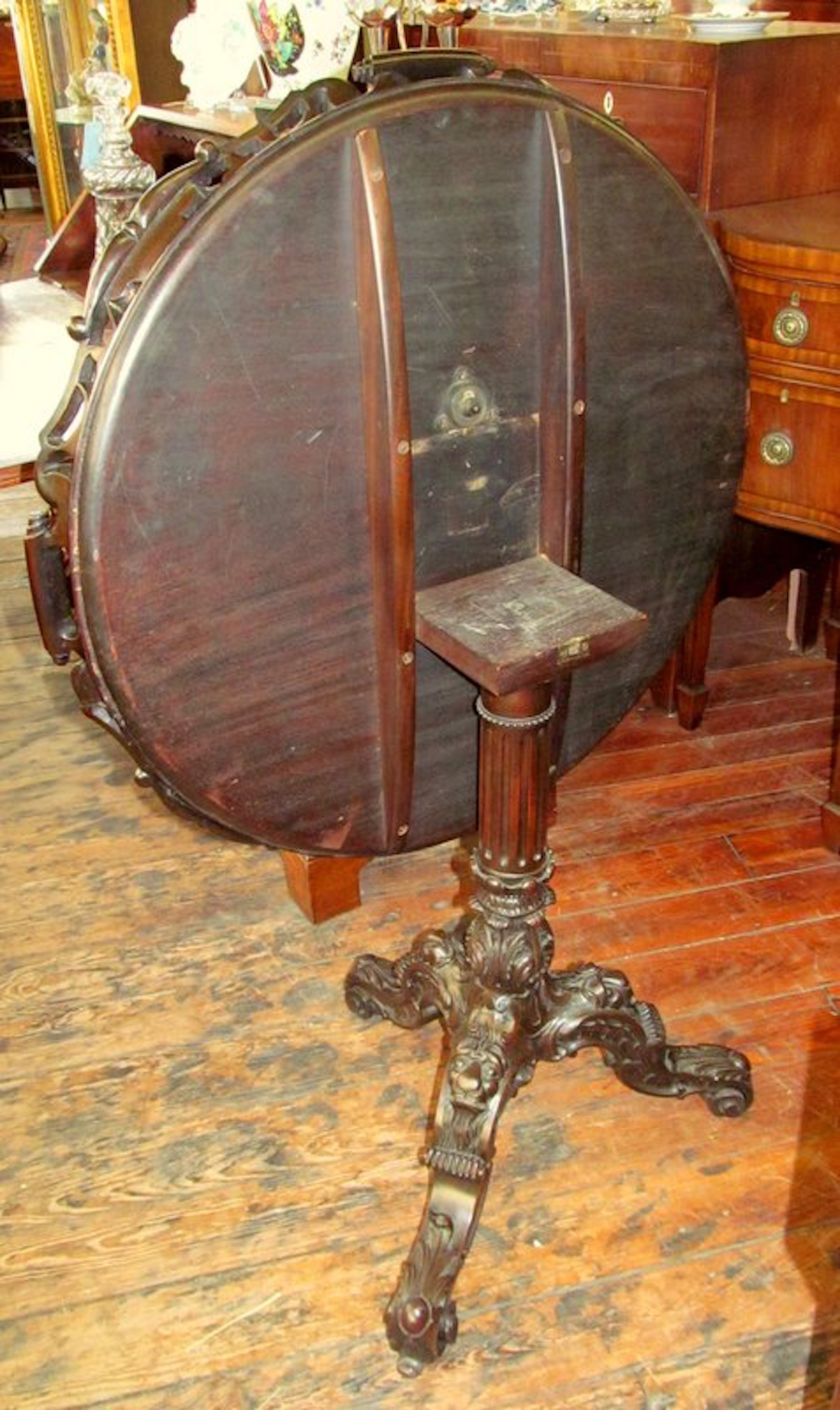 Please note extraordinary profusely carved pedestal and tripod in “bas relief” as well as pierced gallery.