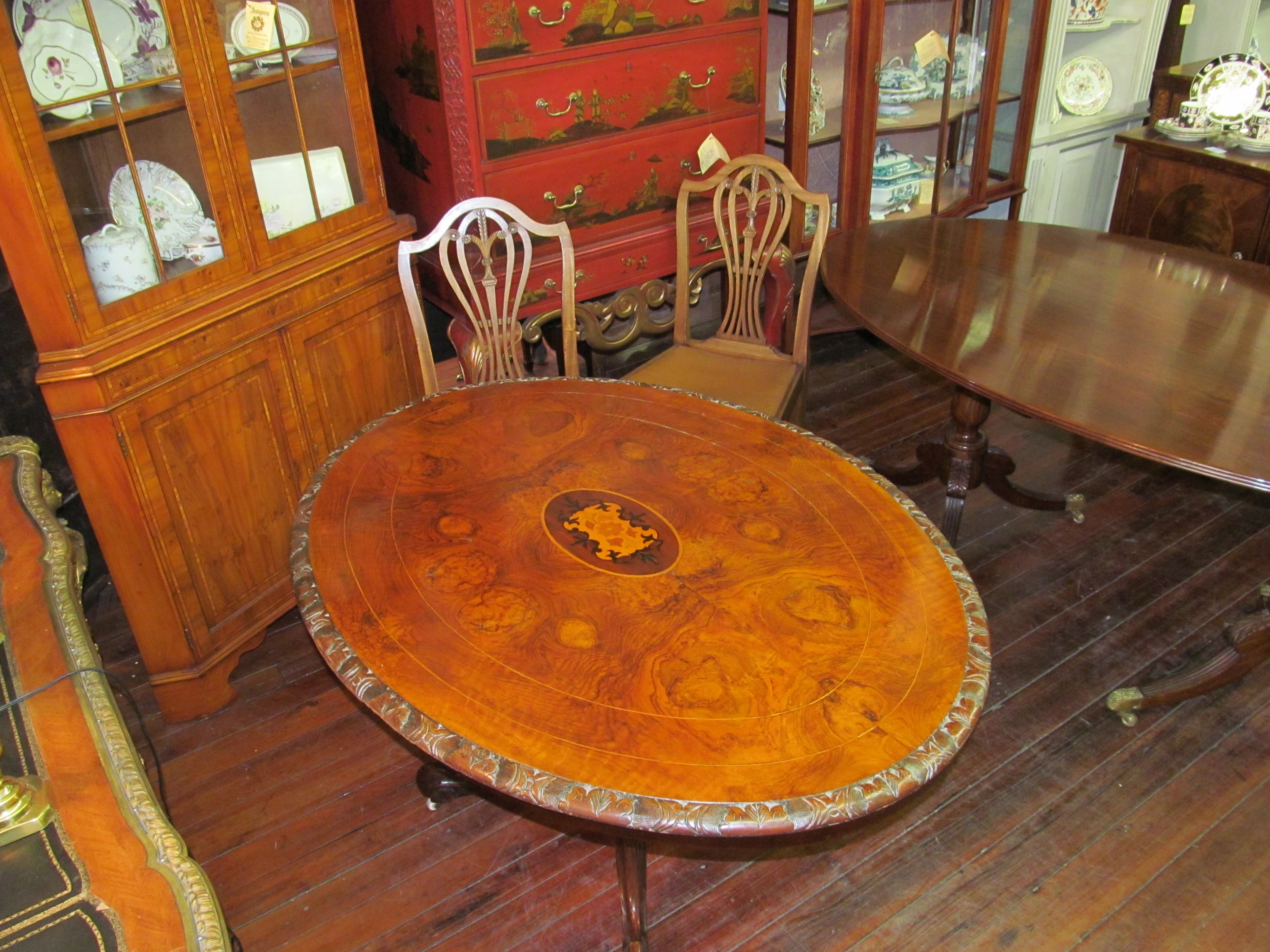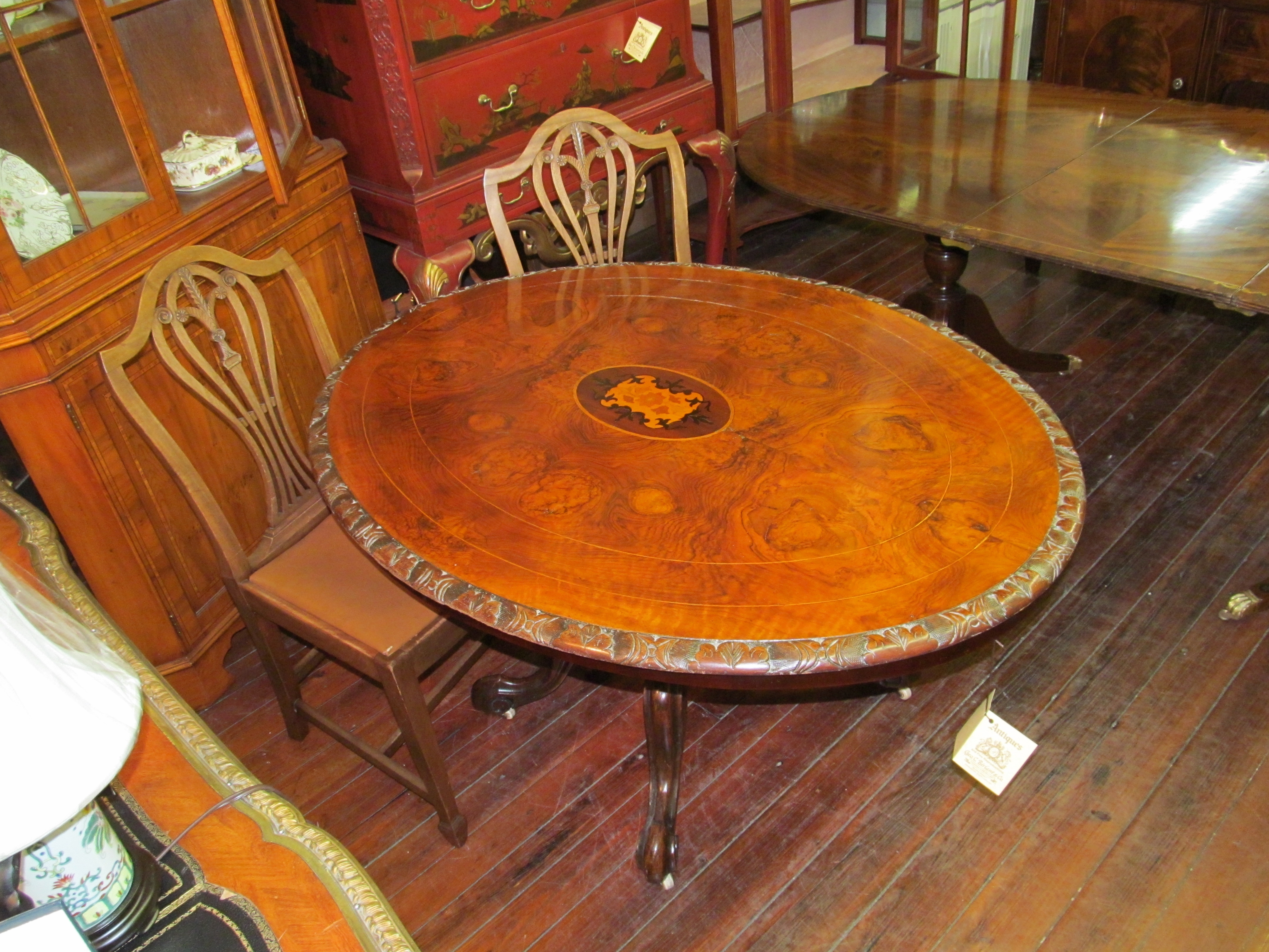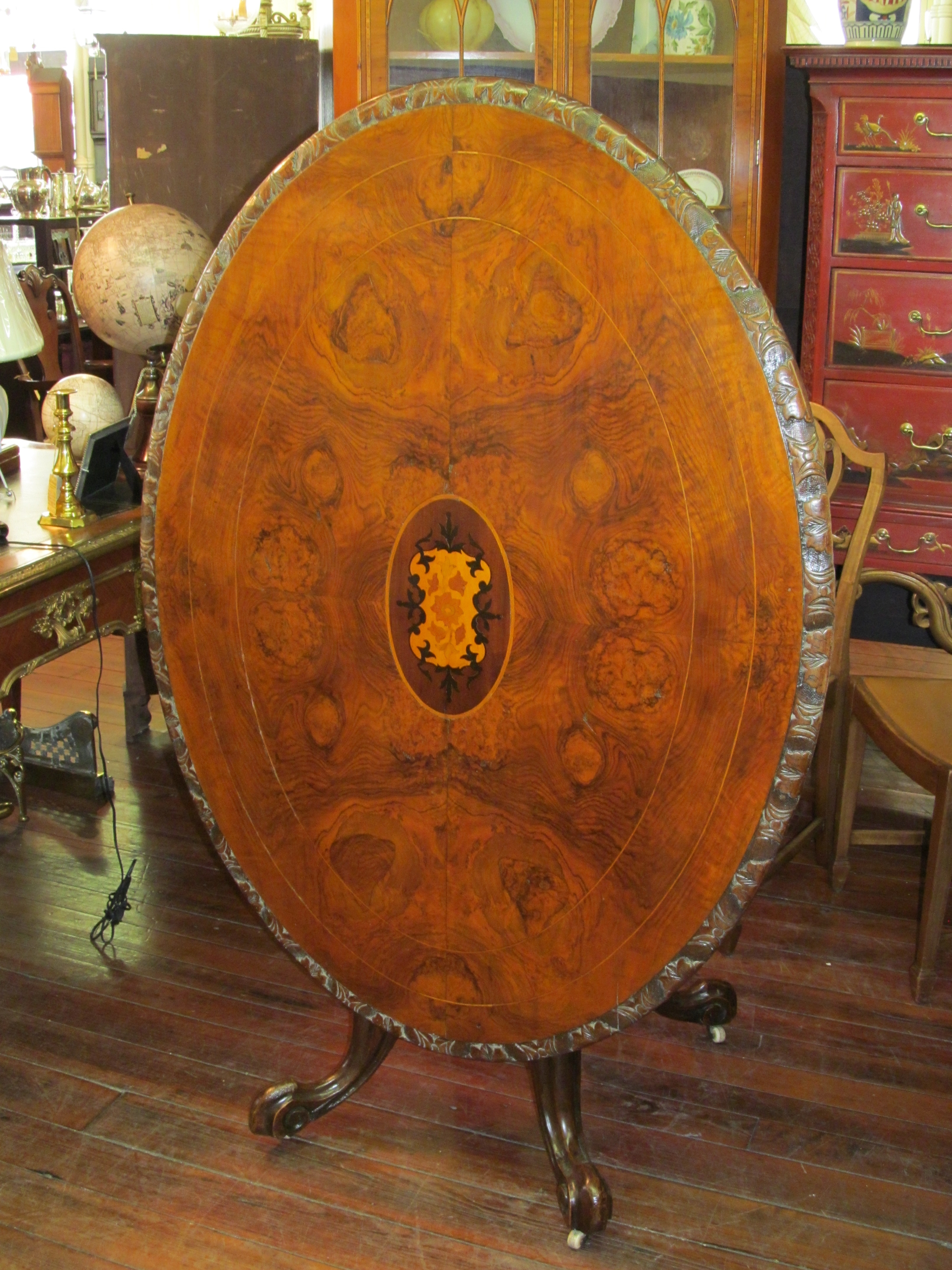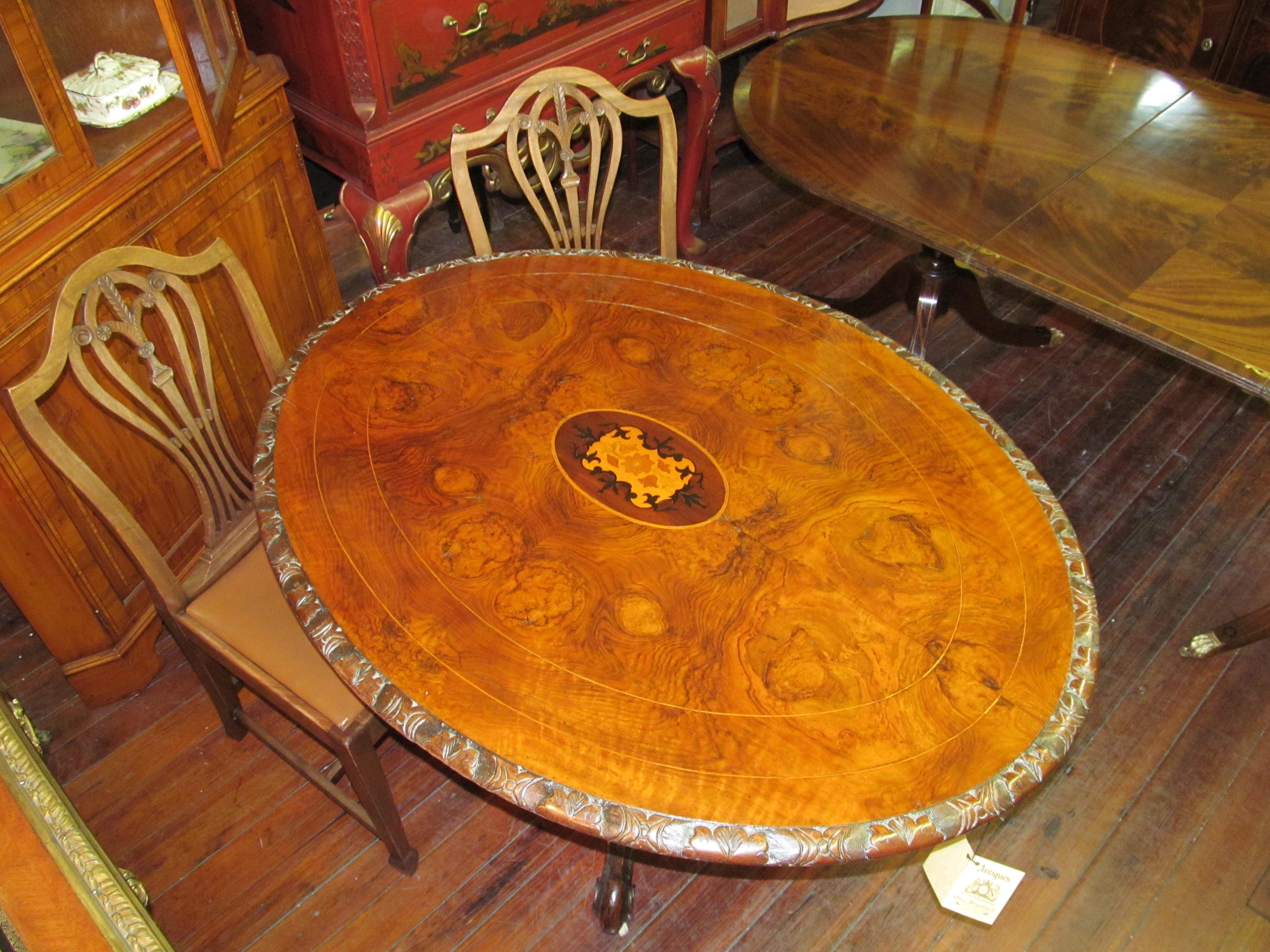 You are here: Home / All Inventory / Antique Scottish Marquetry Inlaid Burl Walnut Hand Carved Tilt-Top Loo Table