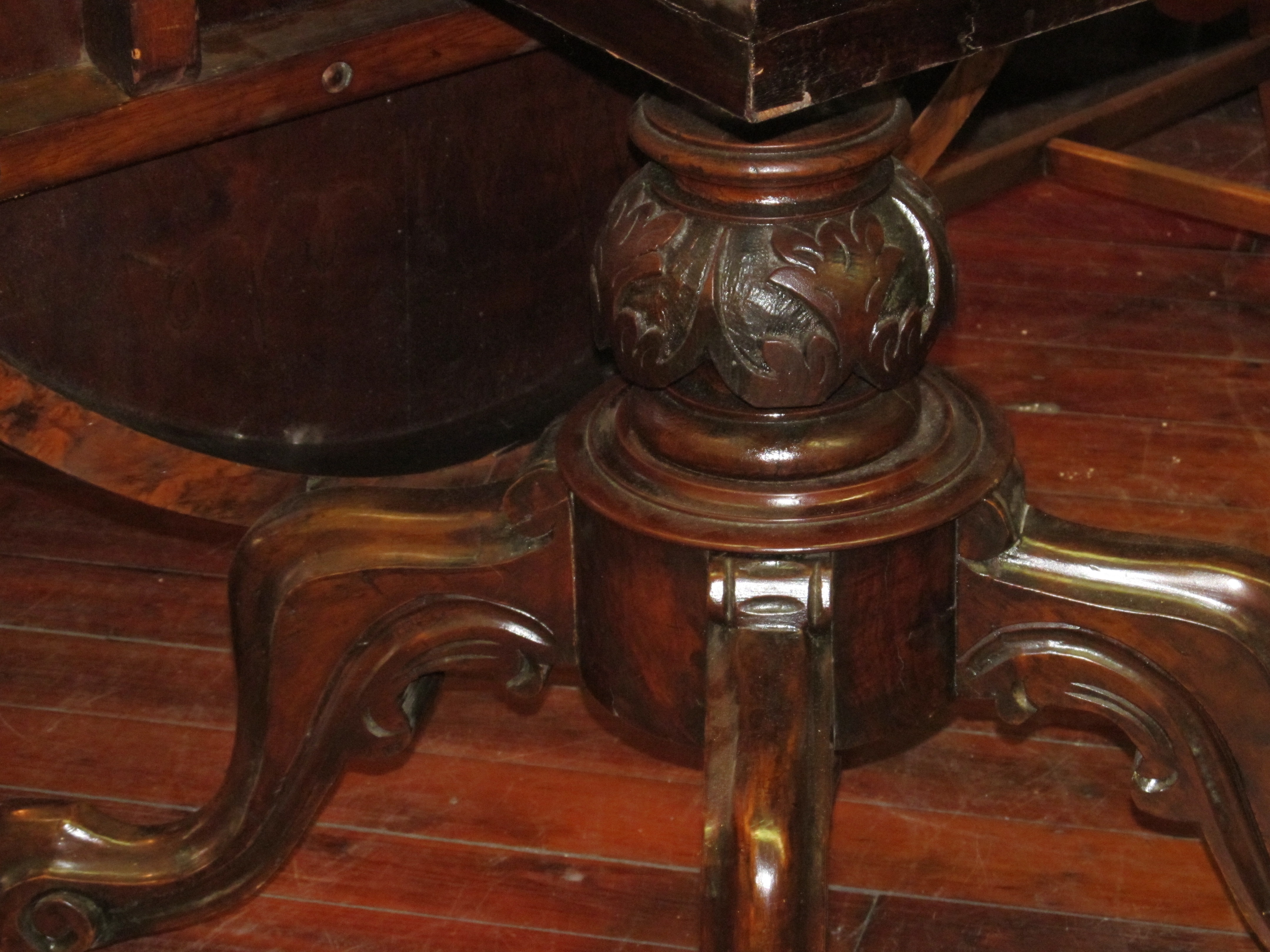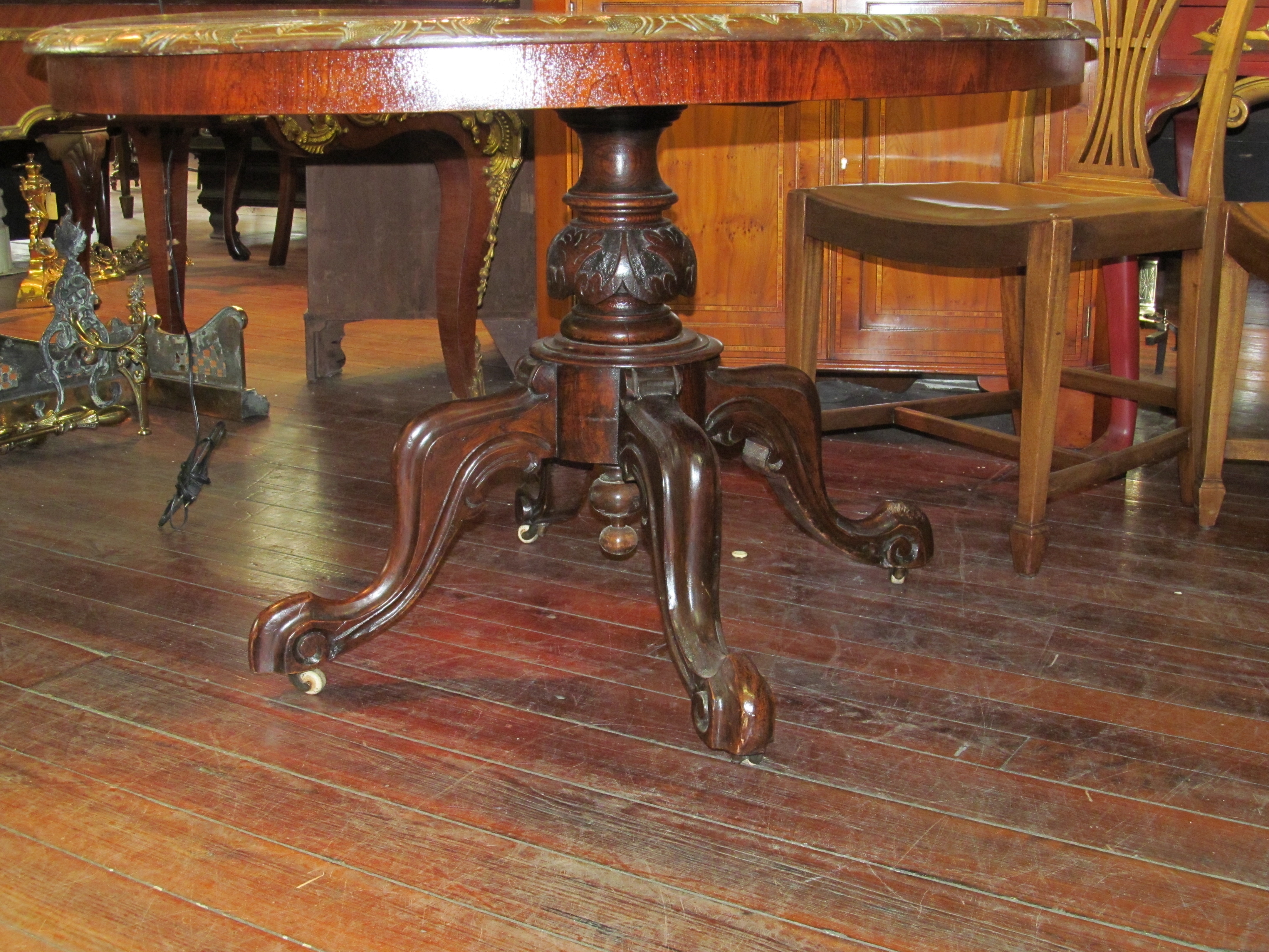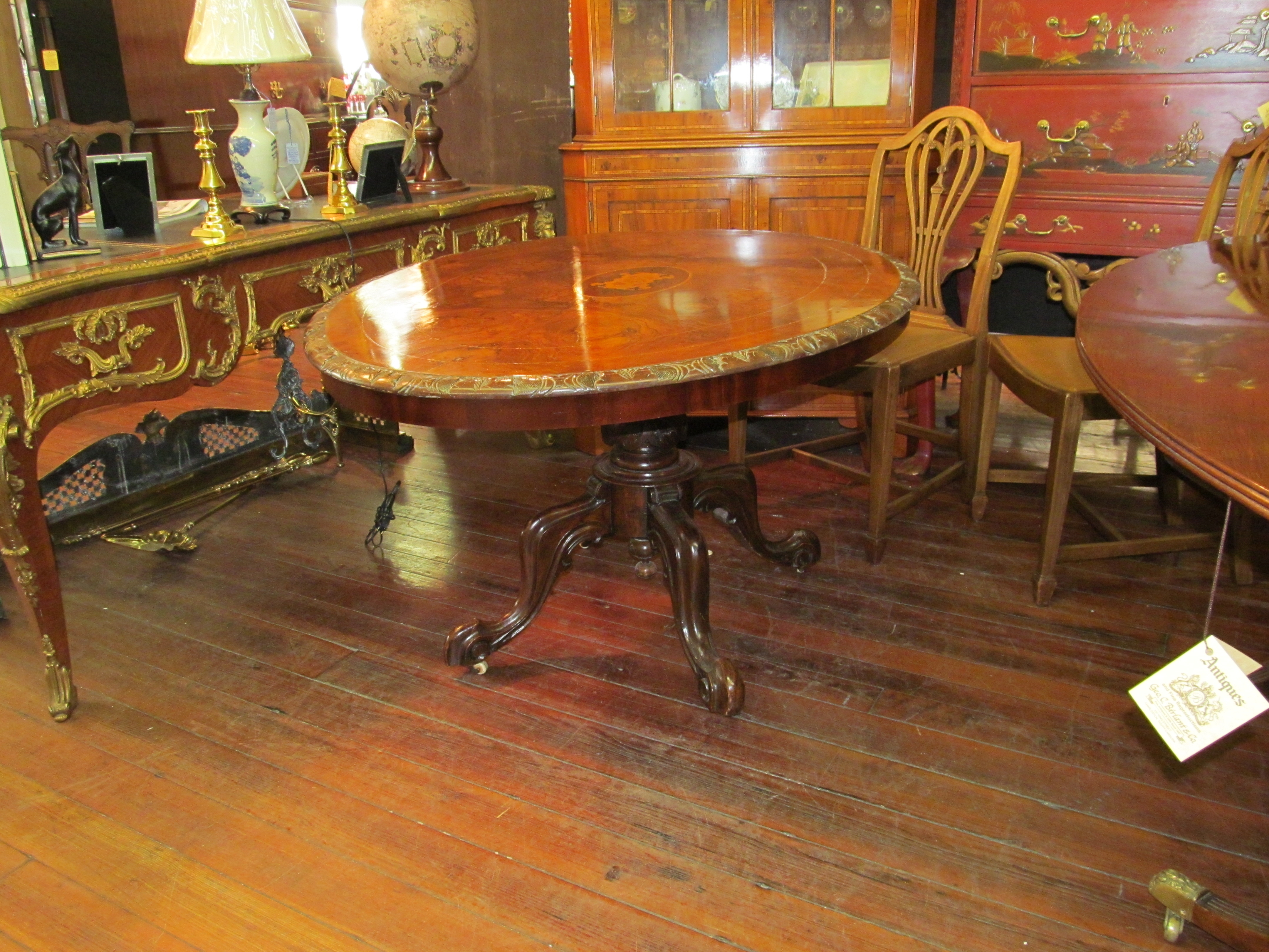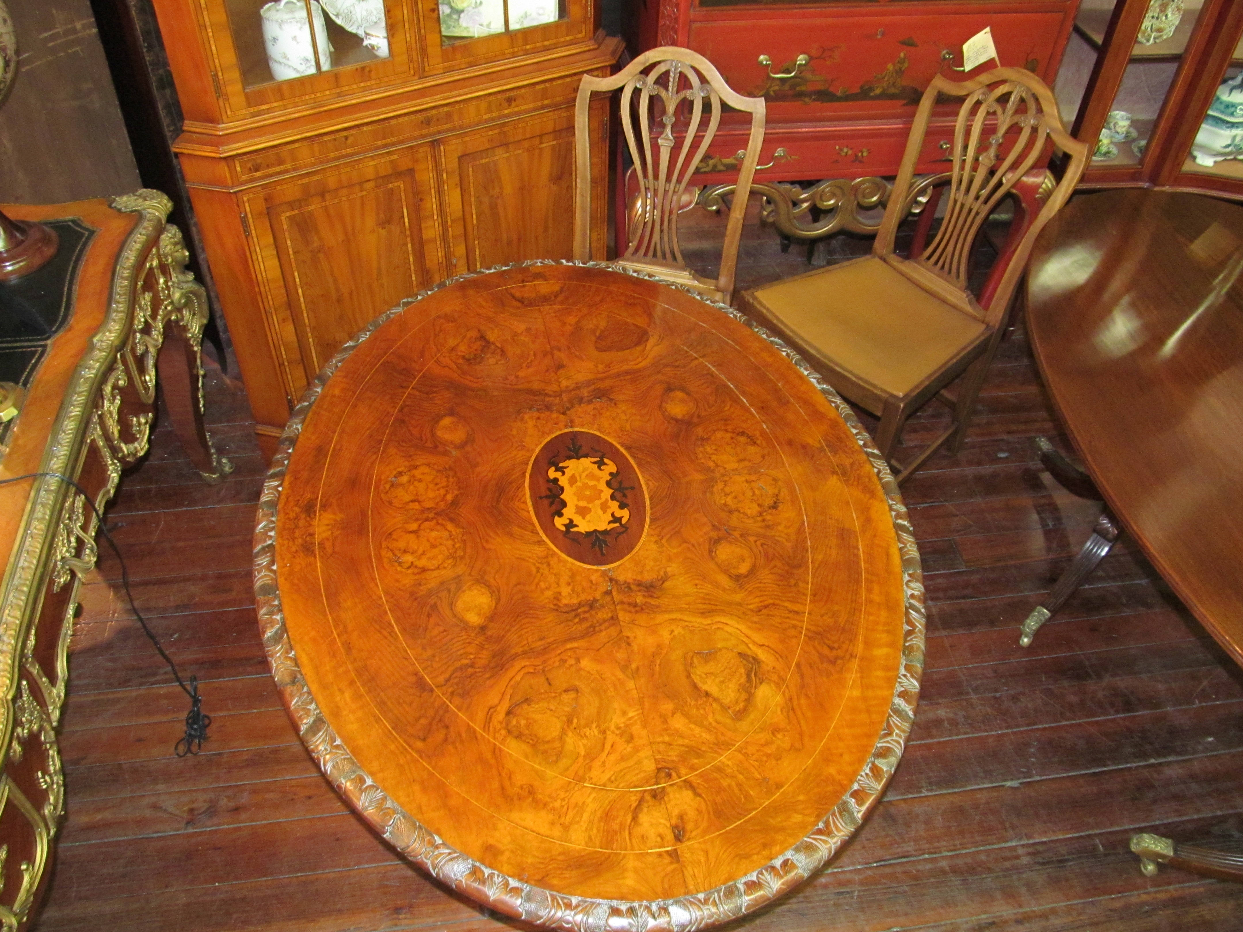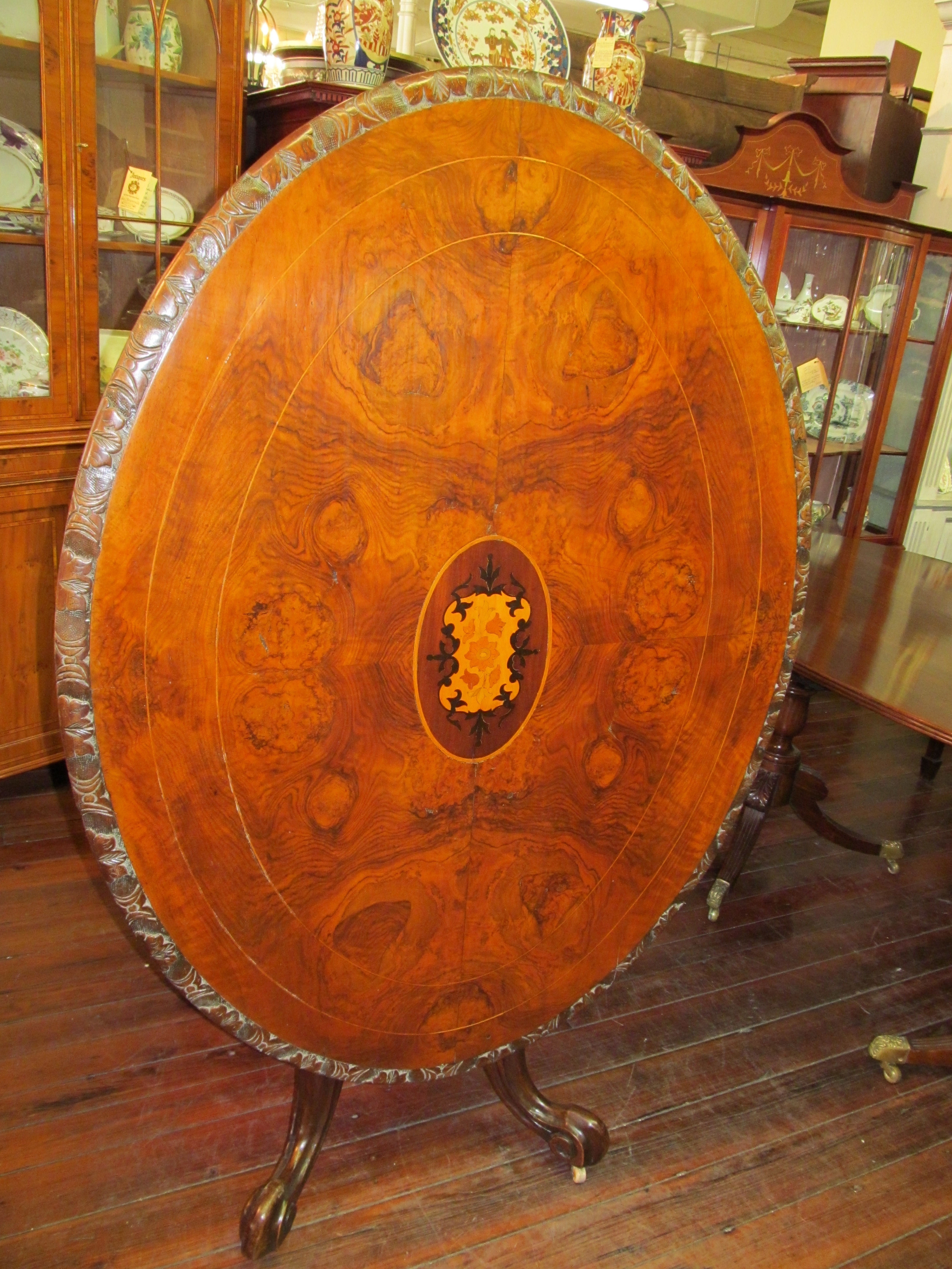 You are here: Home / All Inventory / Antique Scottish Marquetry Inlaid Burl Walnut Hand Carved Tilt-Top Loo Table