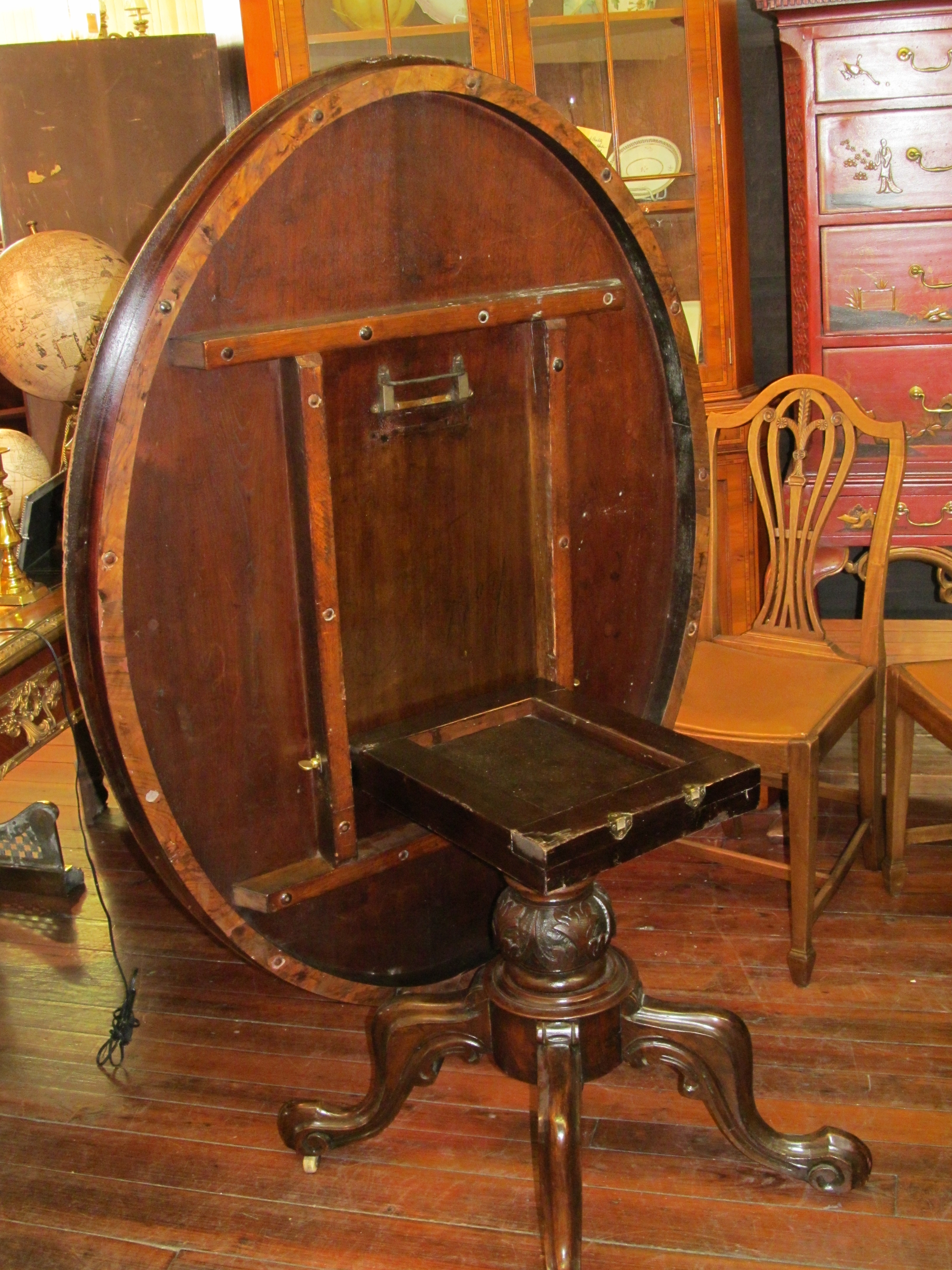 SKU: 7125-215 Categories: All Inventory, Furniture, Tables Tags: Antique, Burl Walnut, english, Loo Table, Table, Tilt-Top
