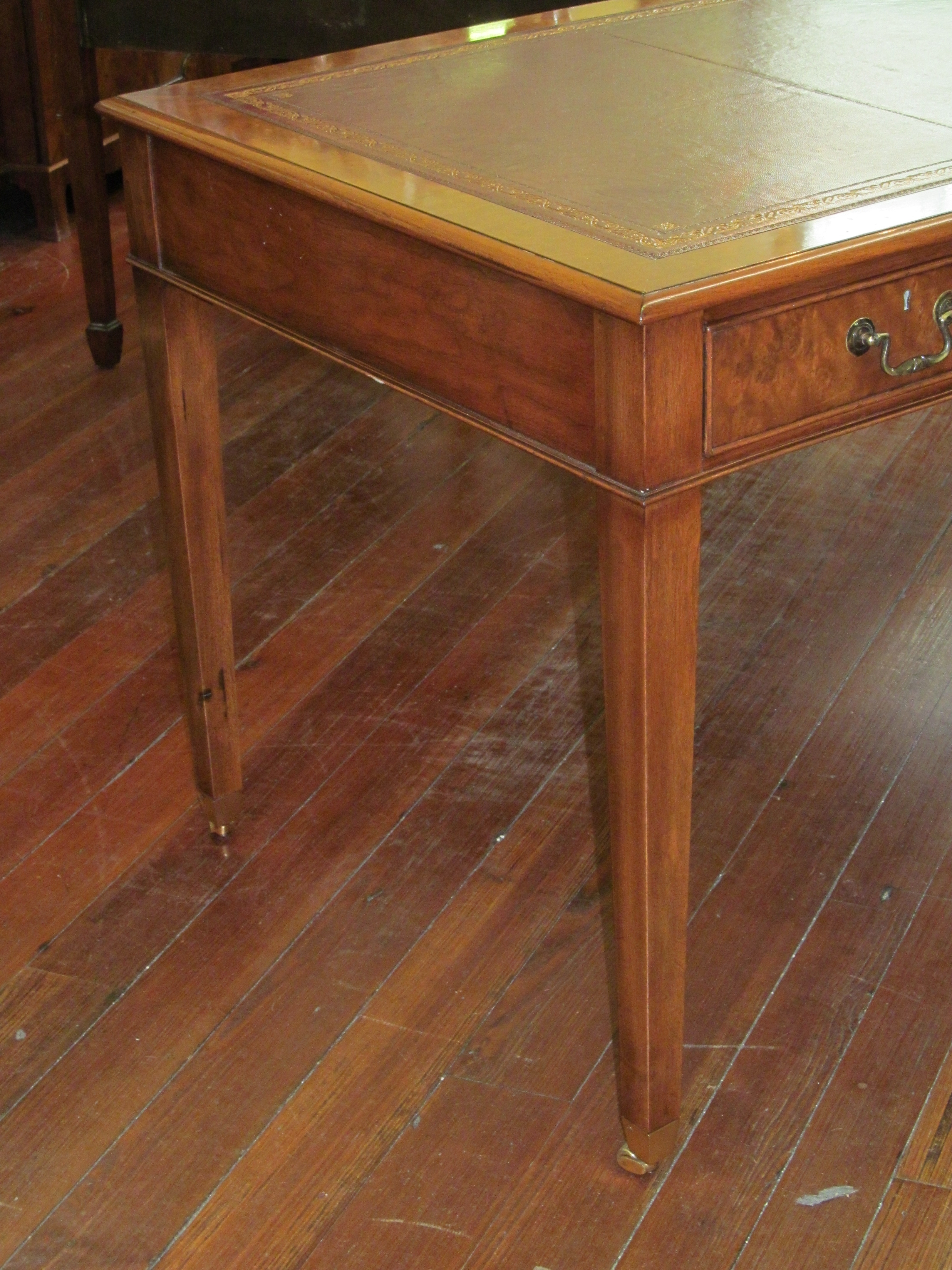 Superb Quality English Bench Made Burr Walnut Writing Table with footed and gilt leather hide surface.