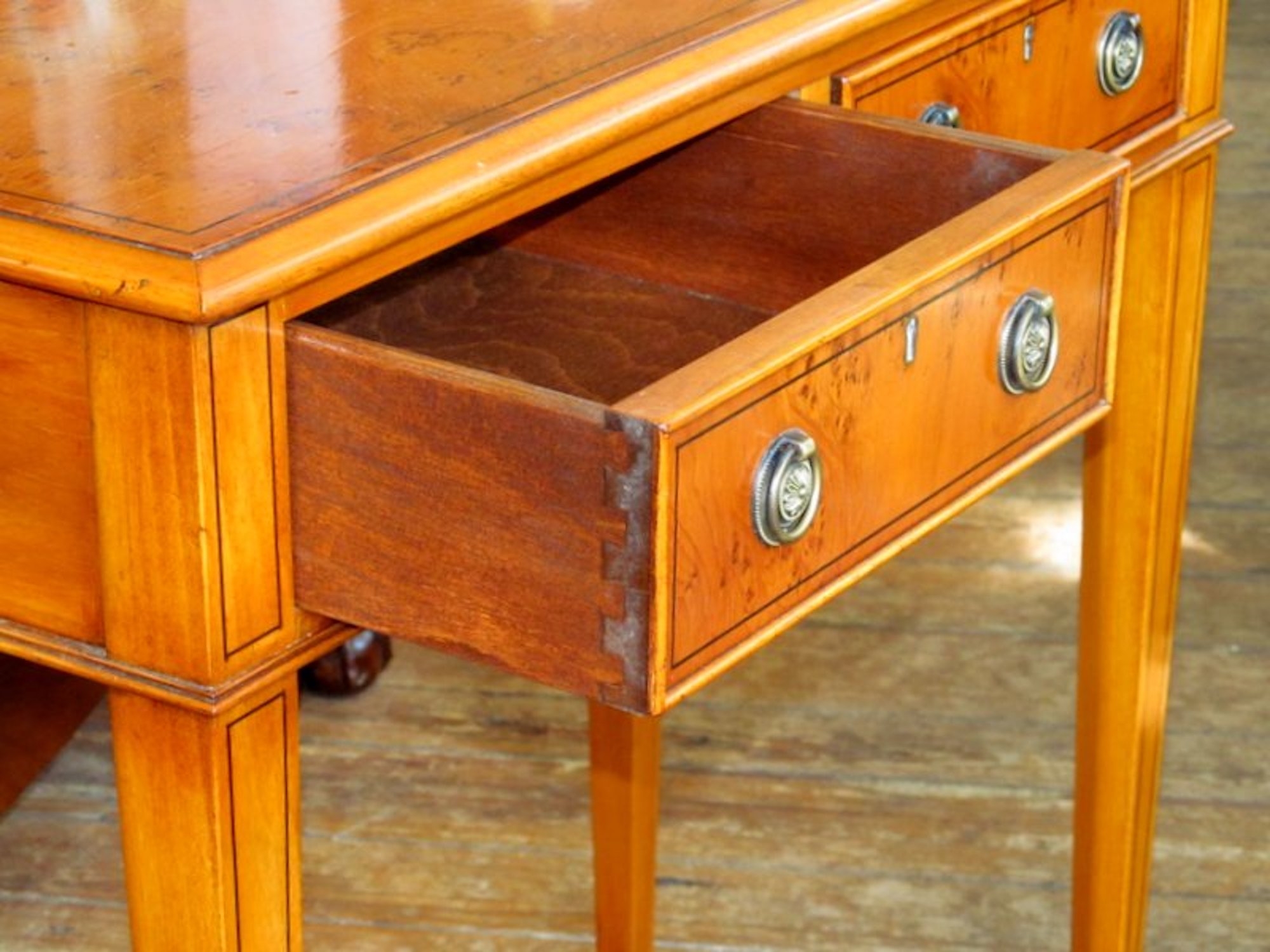 English Bench Made Inlaid Pippy Yew-wood Two-Drawer Side Table - Image 7