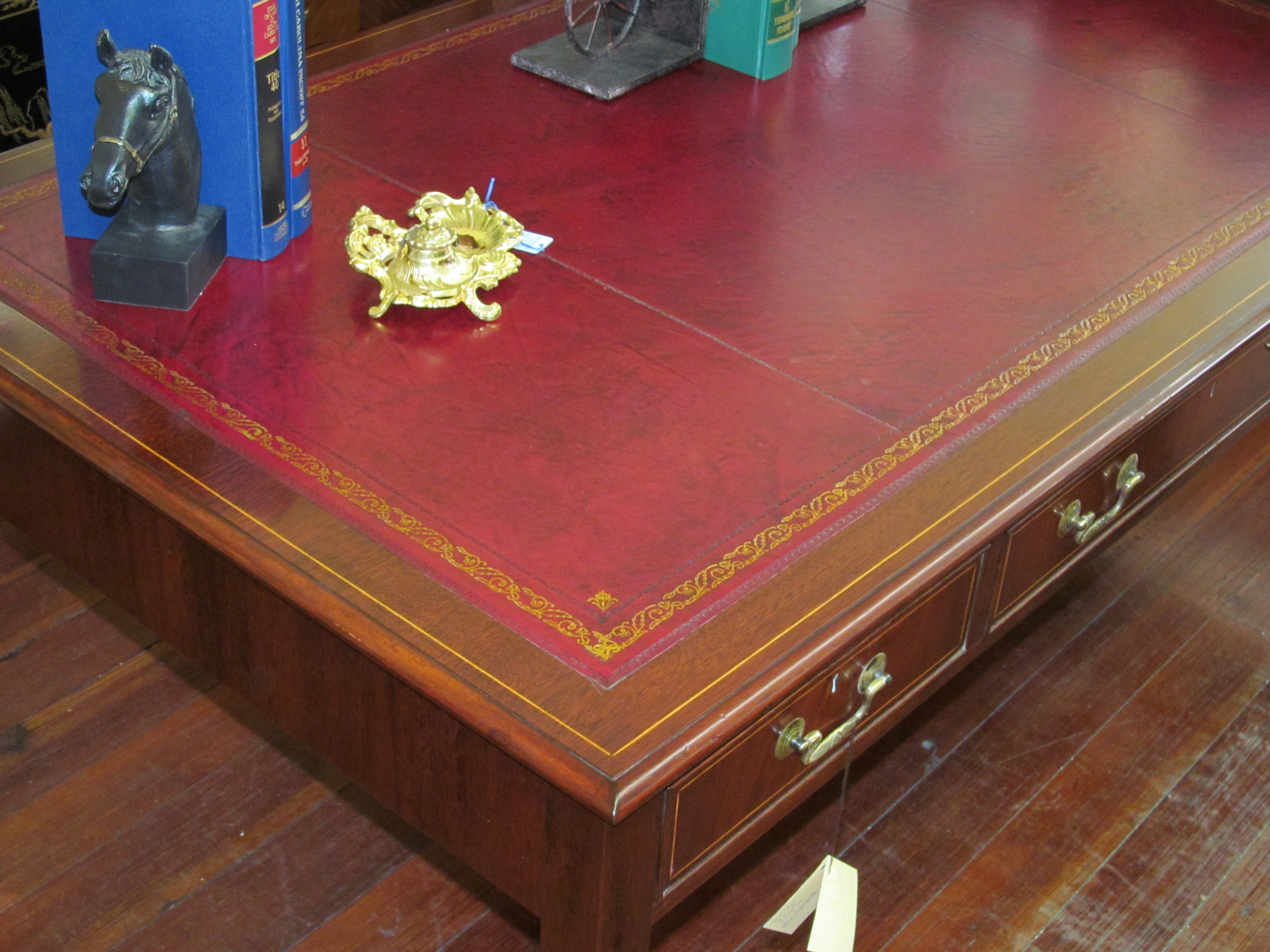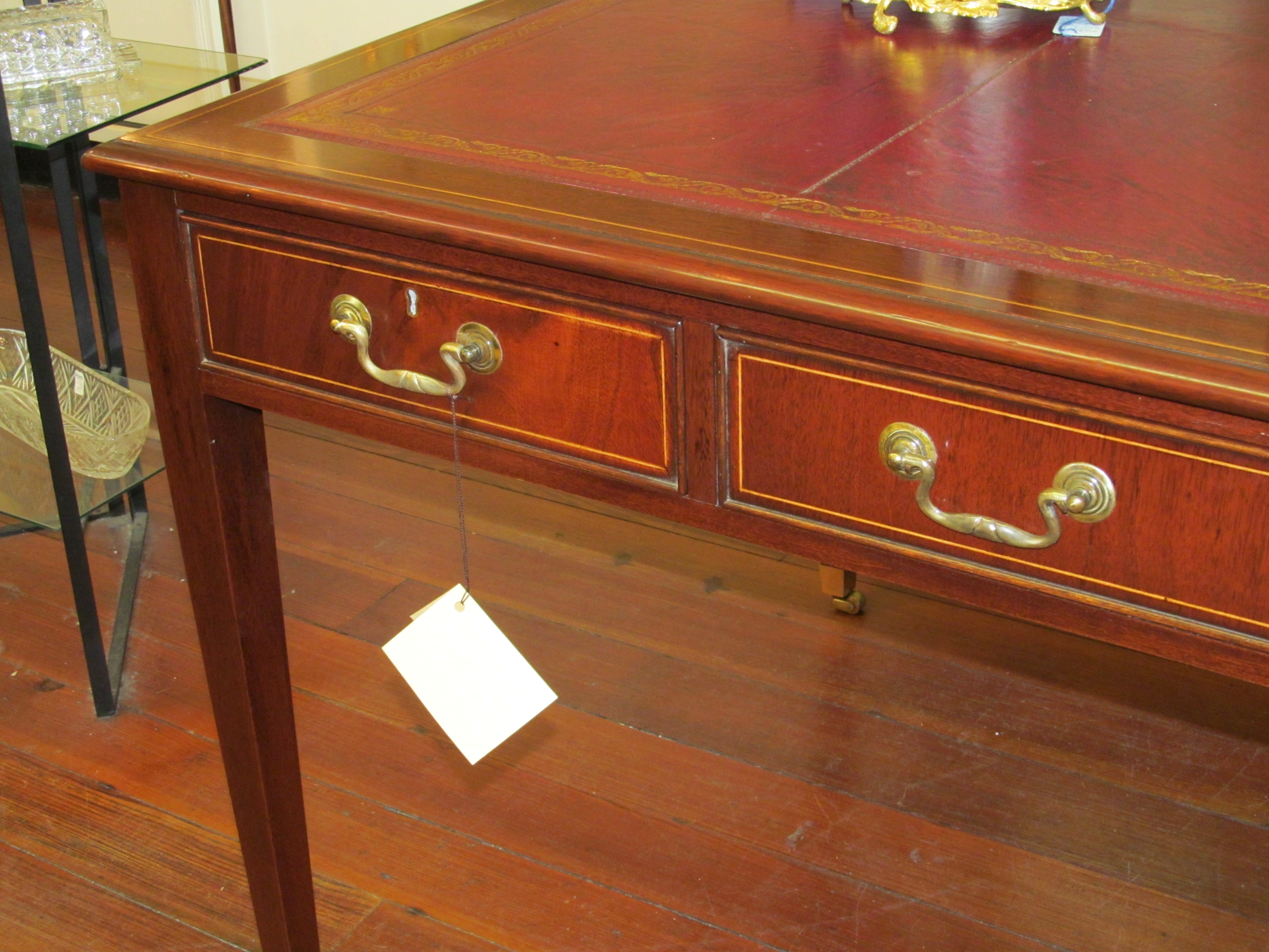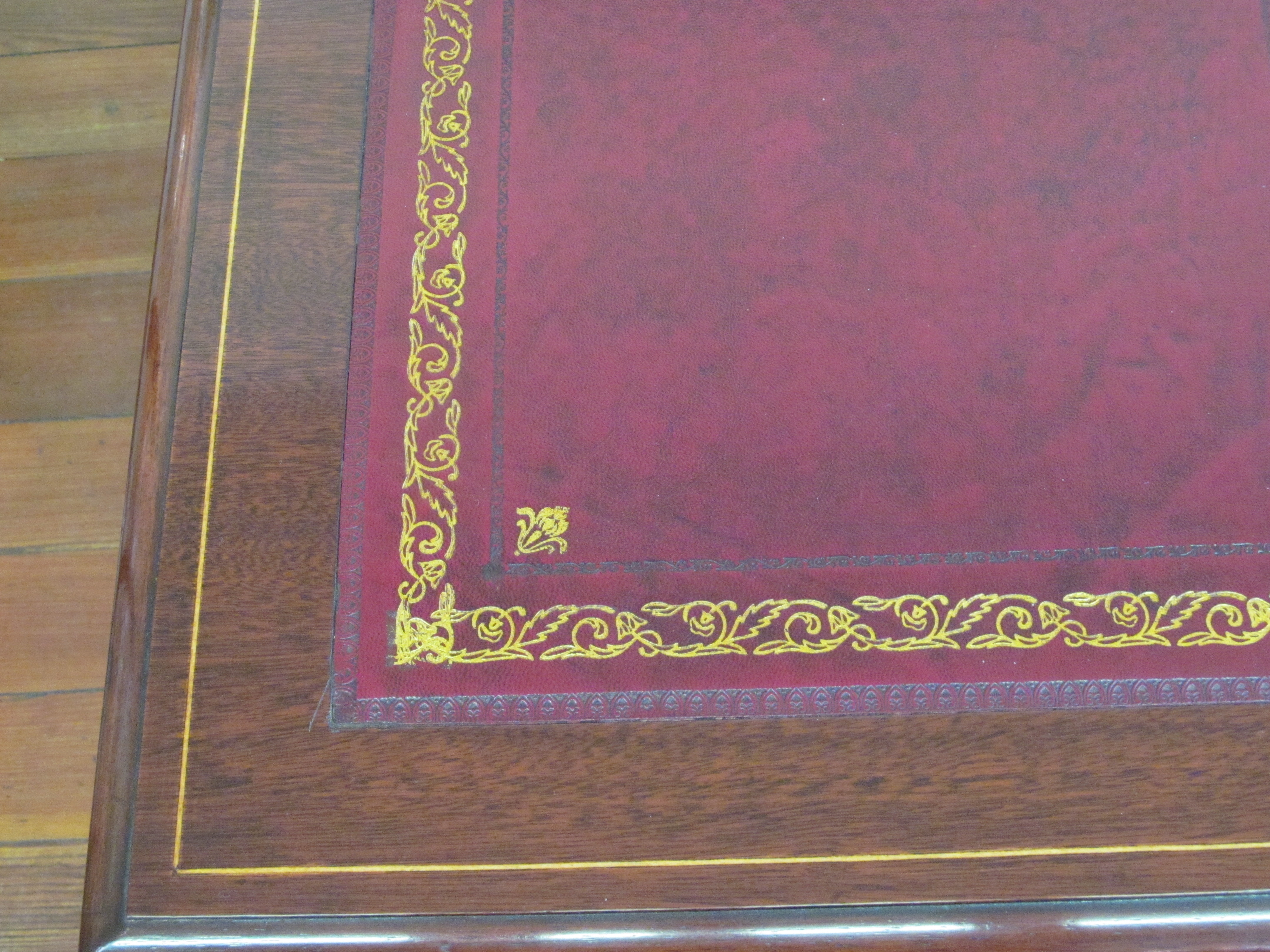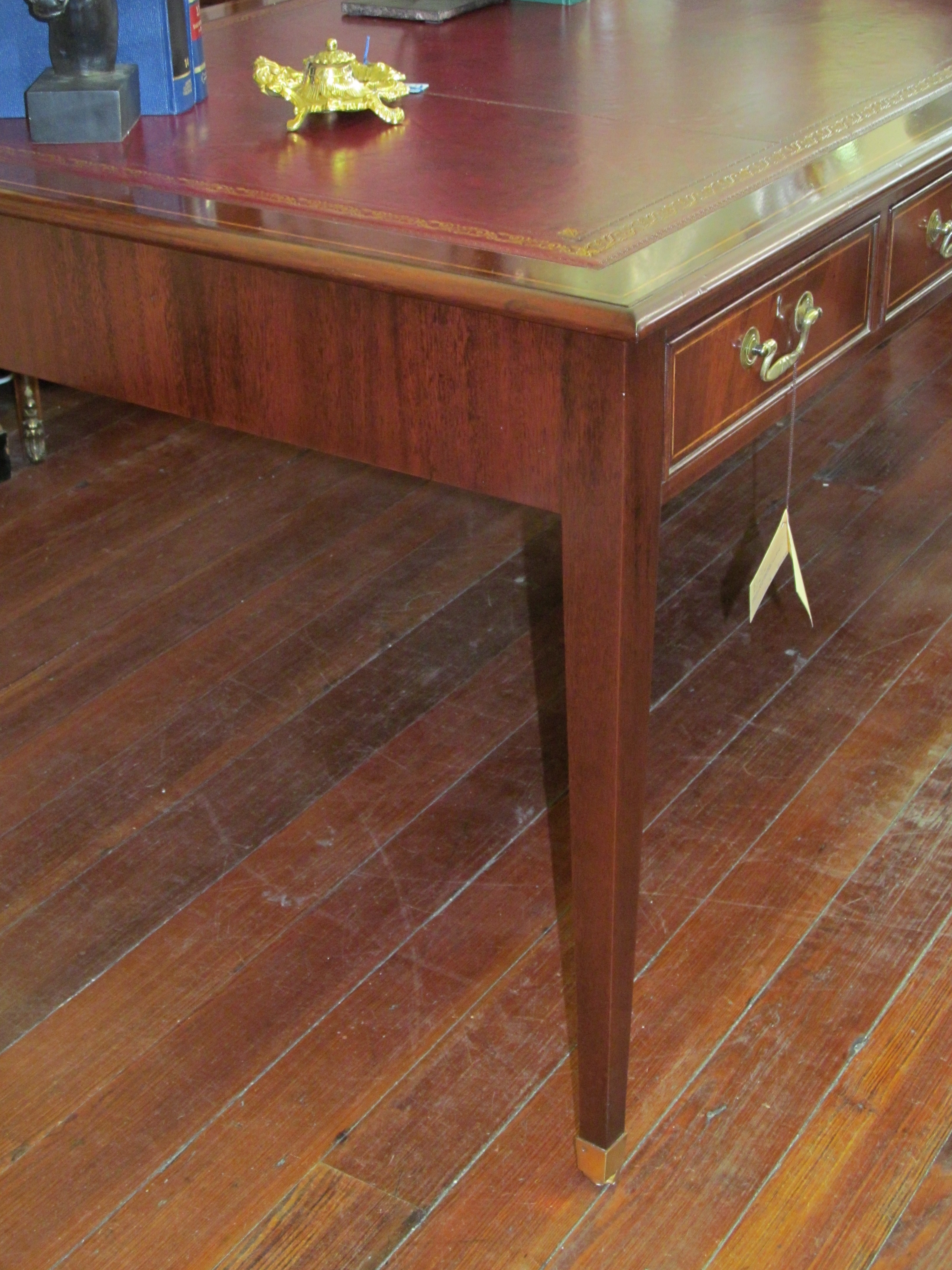 Superb Quality English Bench Made Inlaid Mahogany Hepplewhite Style Partner’s Writing Table with tooled and gilt leather.