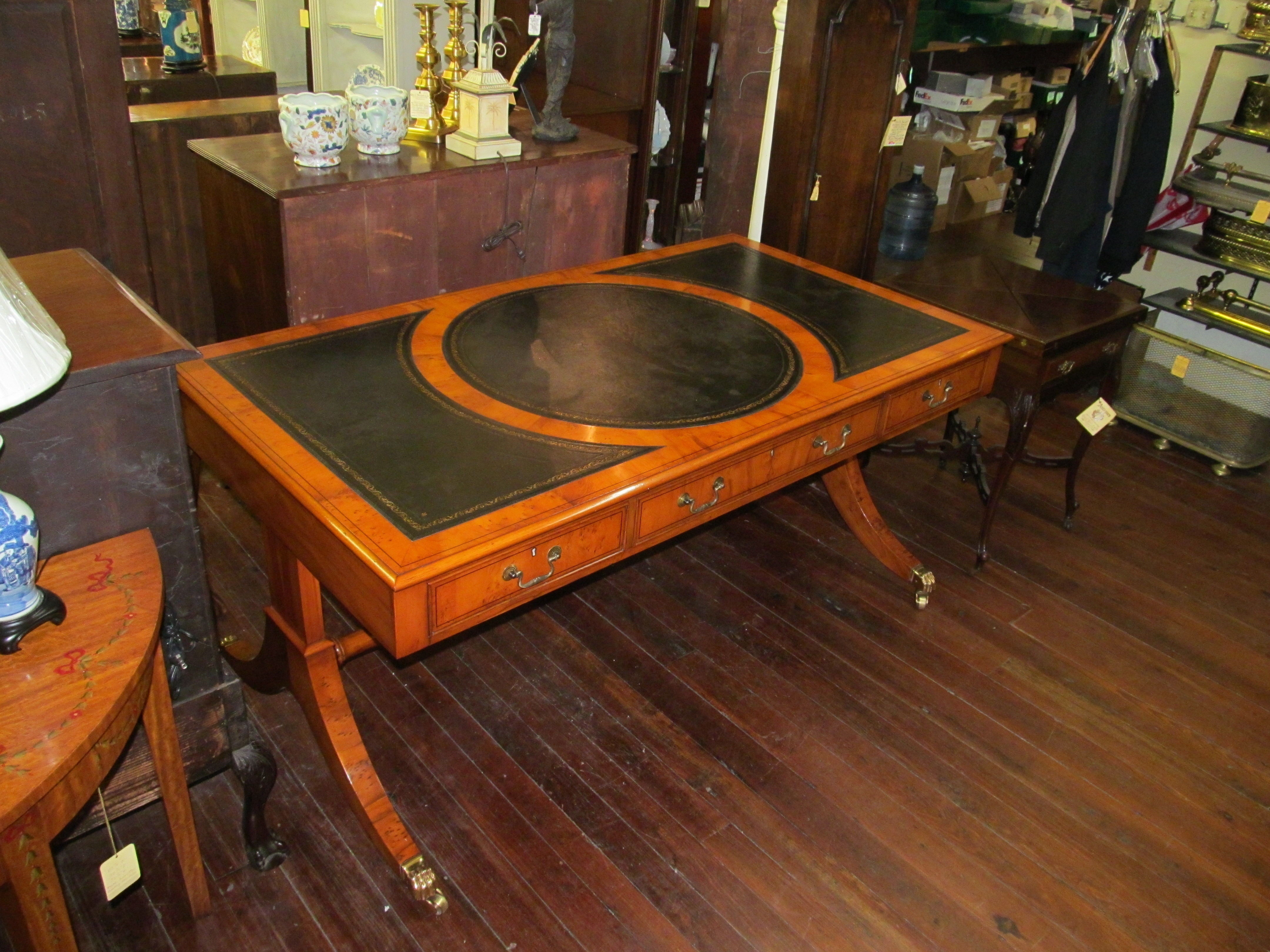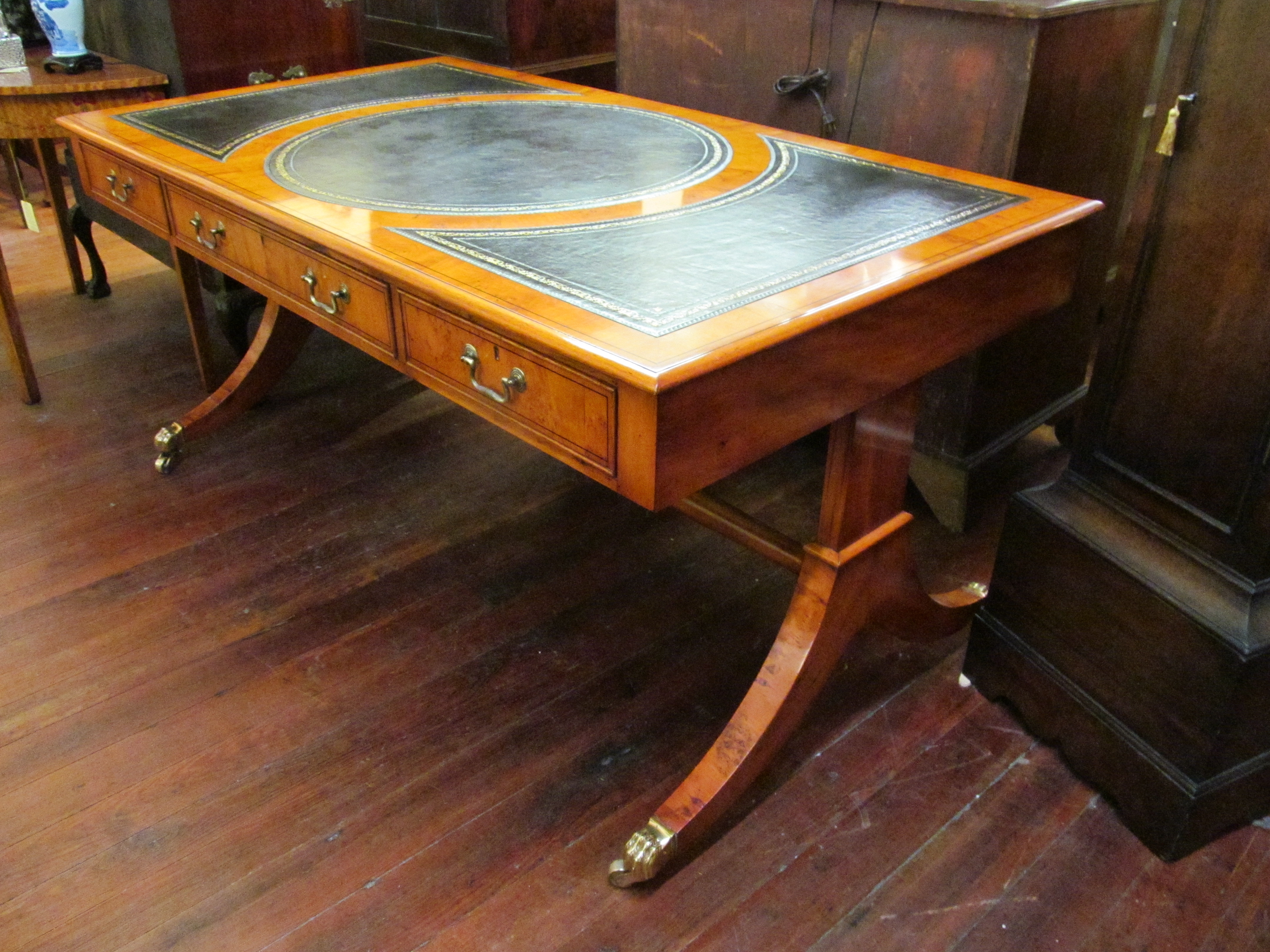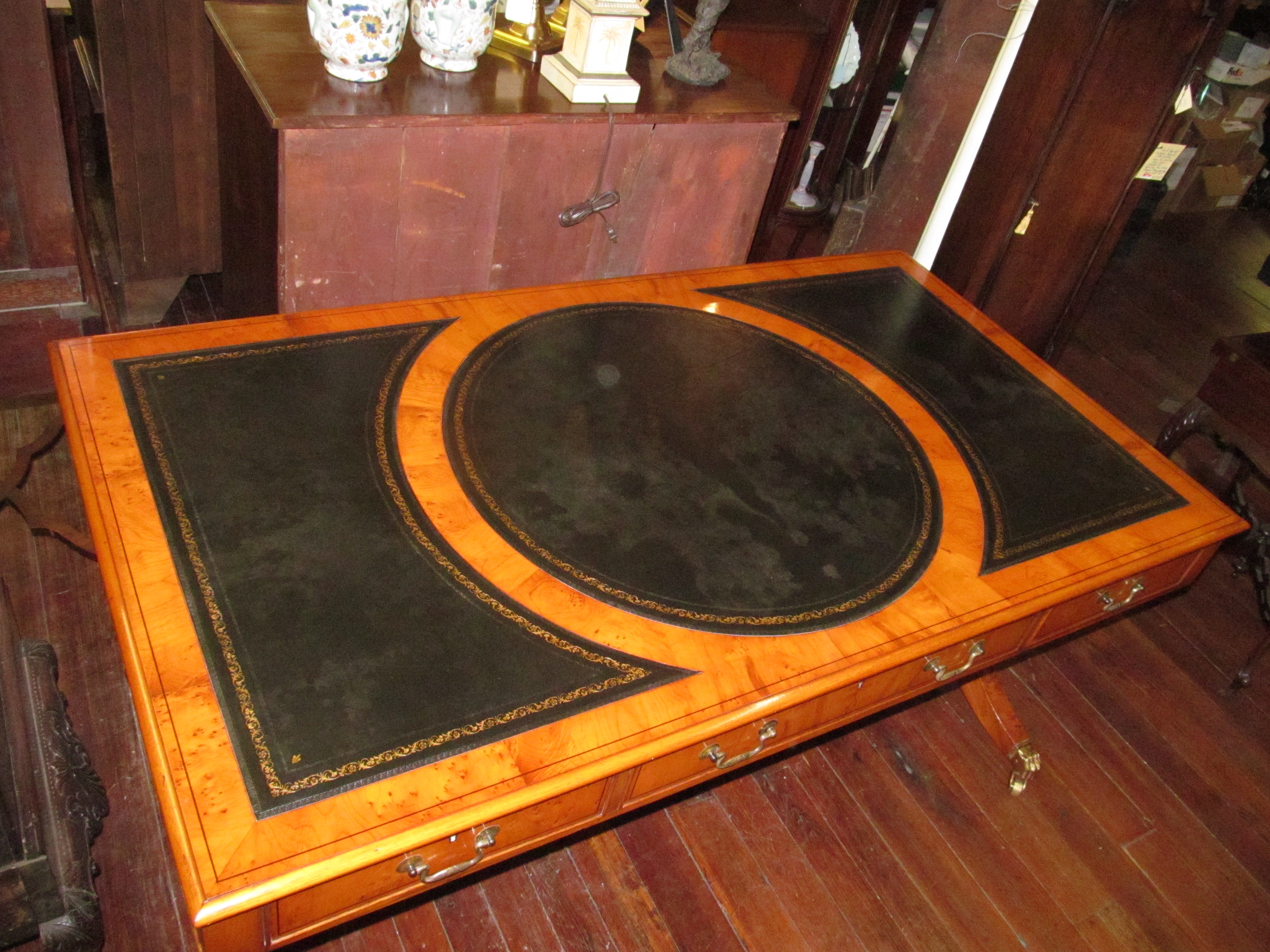 Fabulous Quality English Bench Made Pippy Yewwood Regency Style Partner’s Bureau Plateau with tooled and gilt leather.