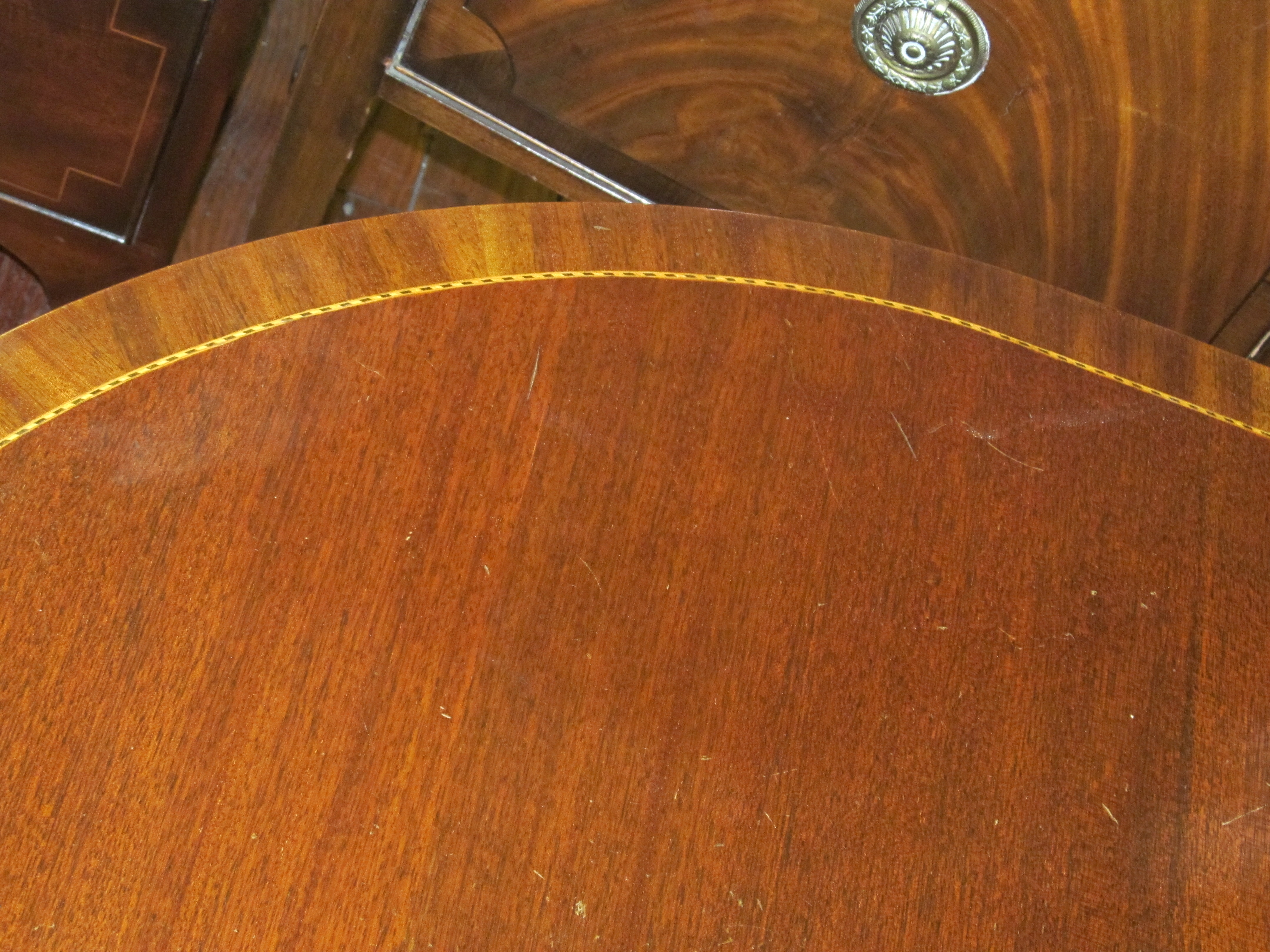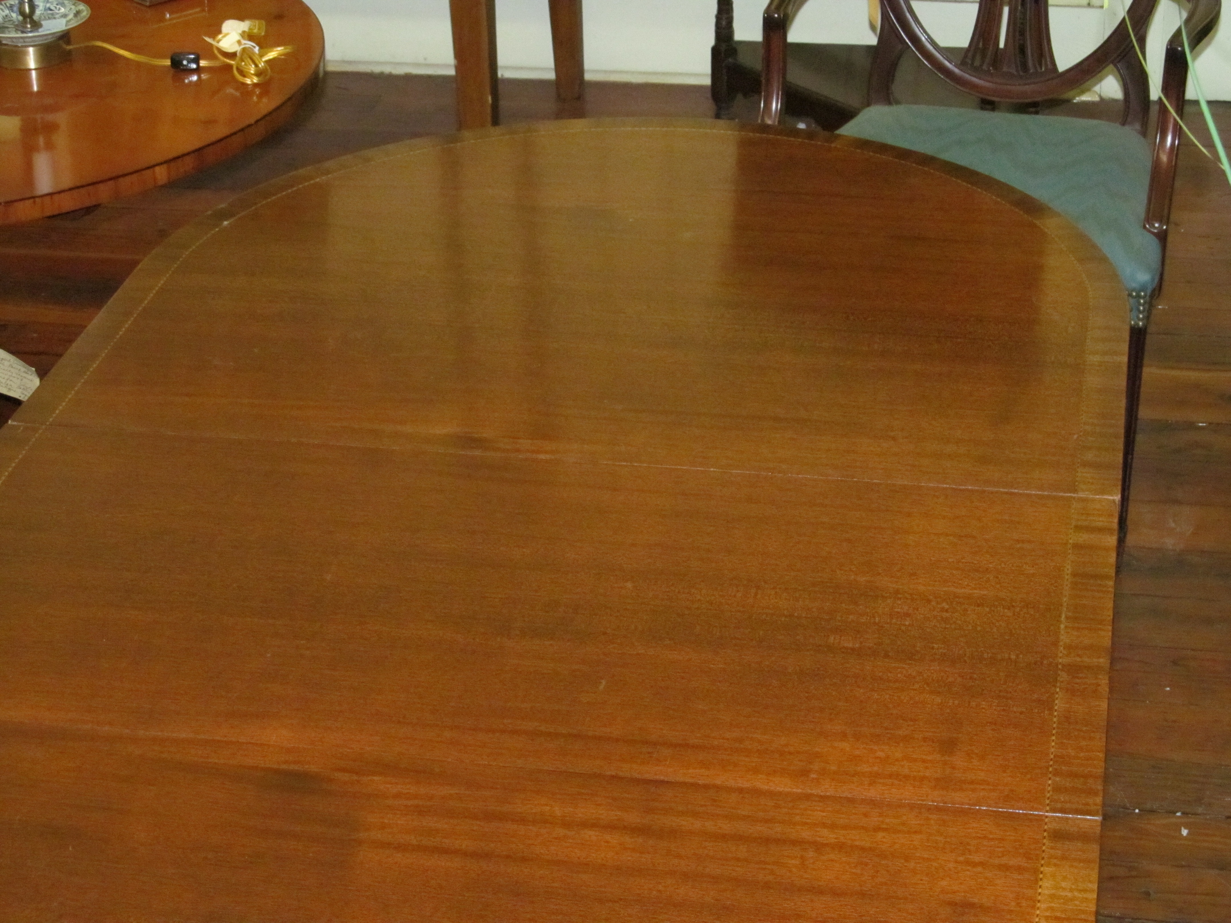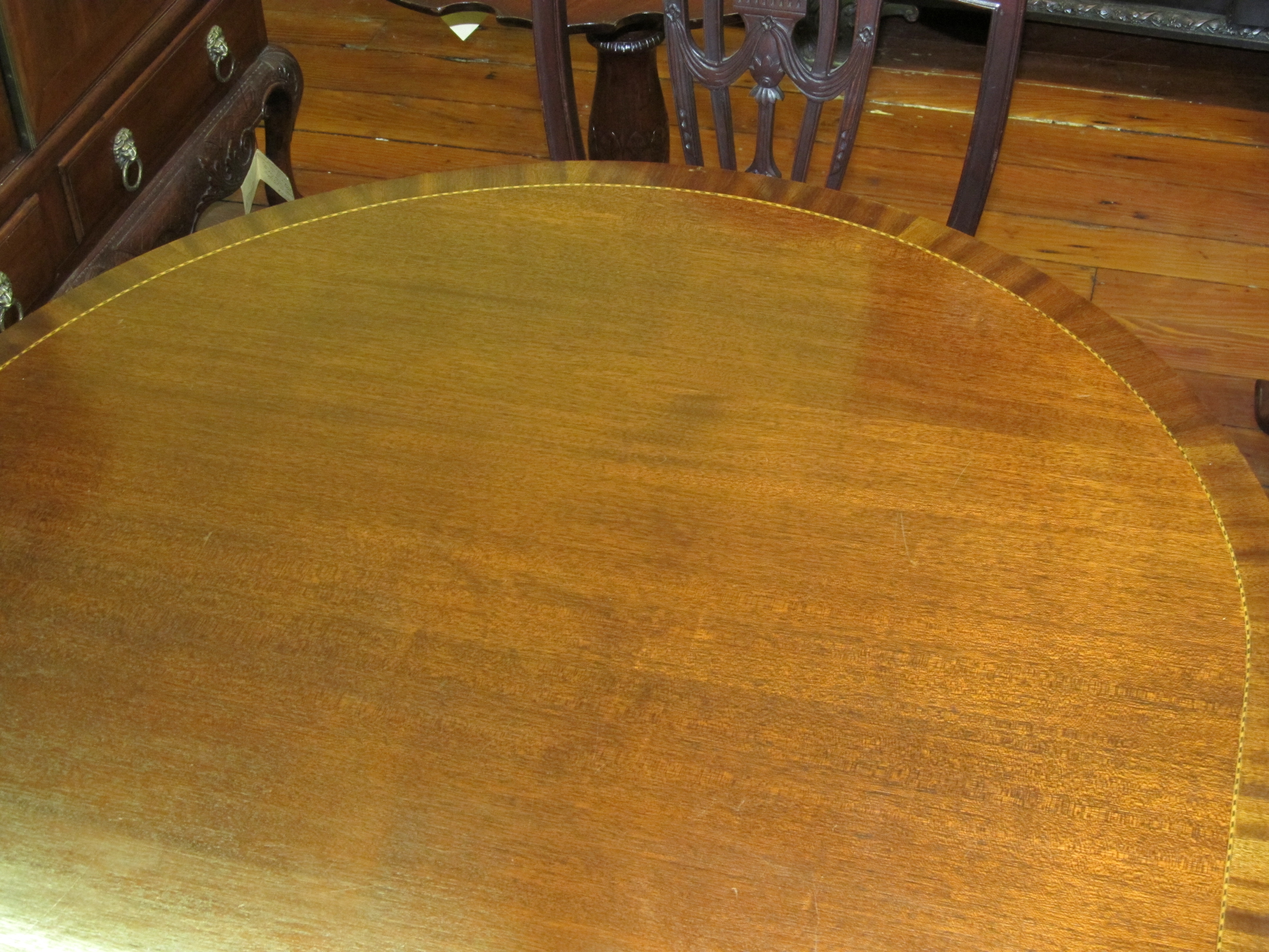 Fine Old English Inlaid Mahogany Cottage Size Dining Table.