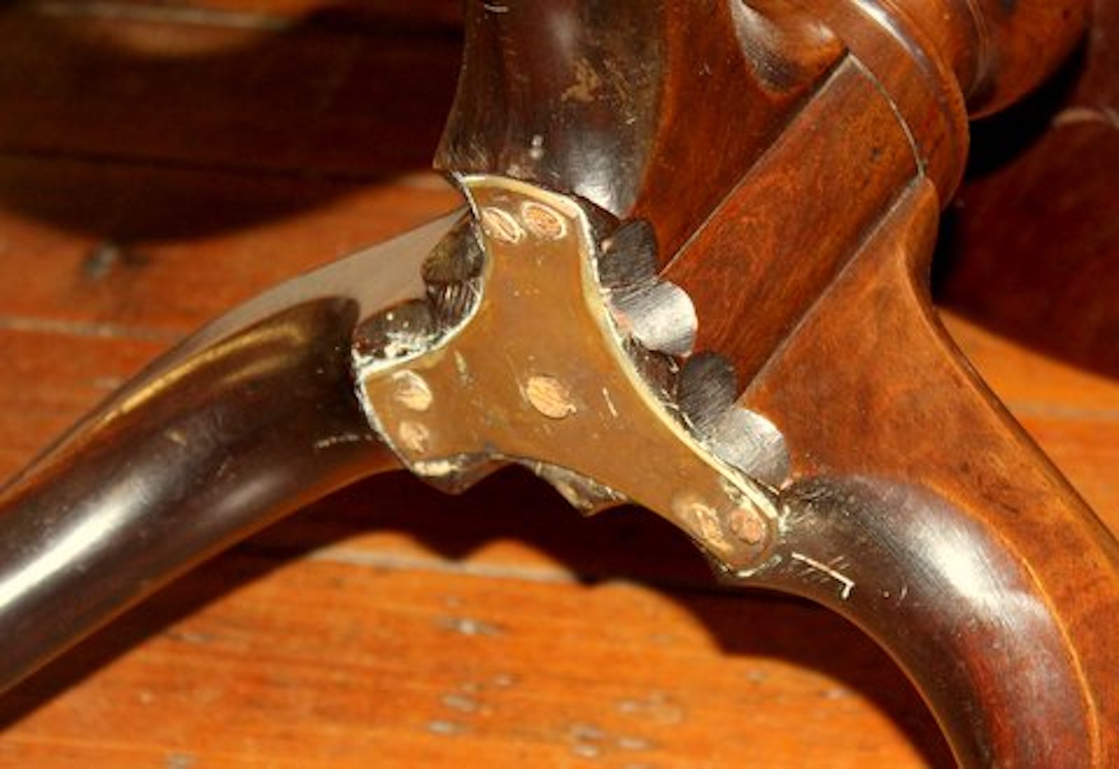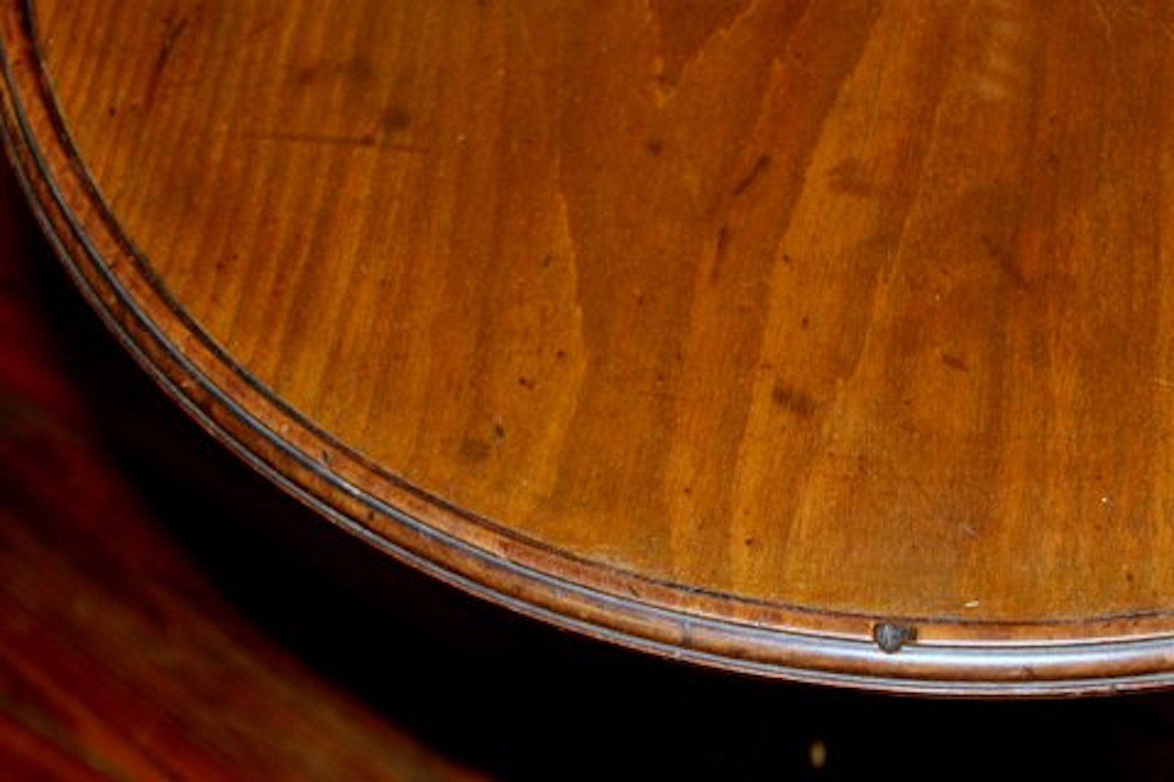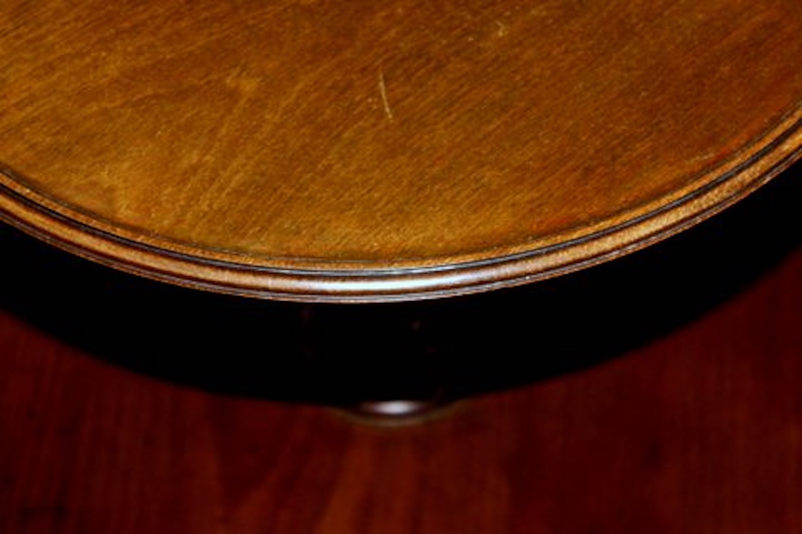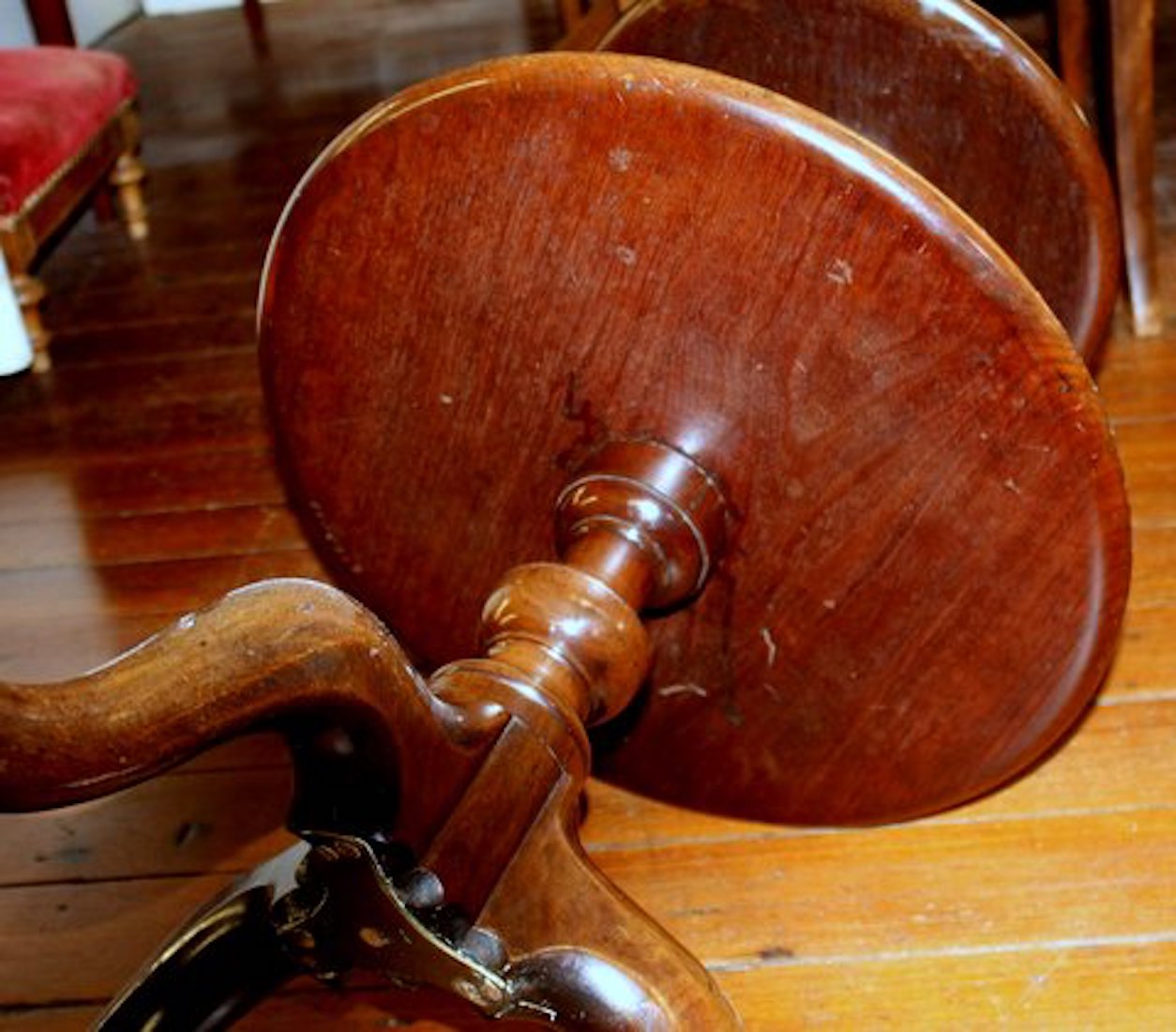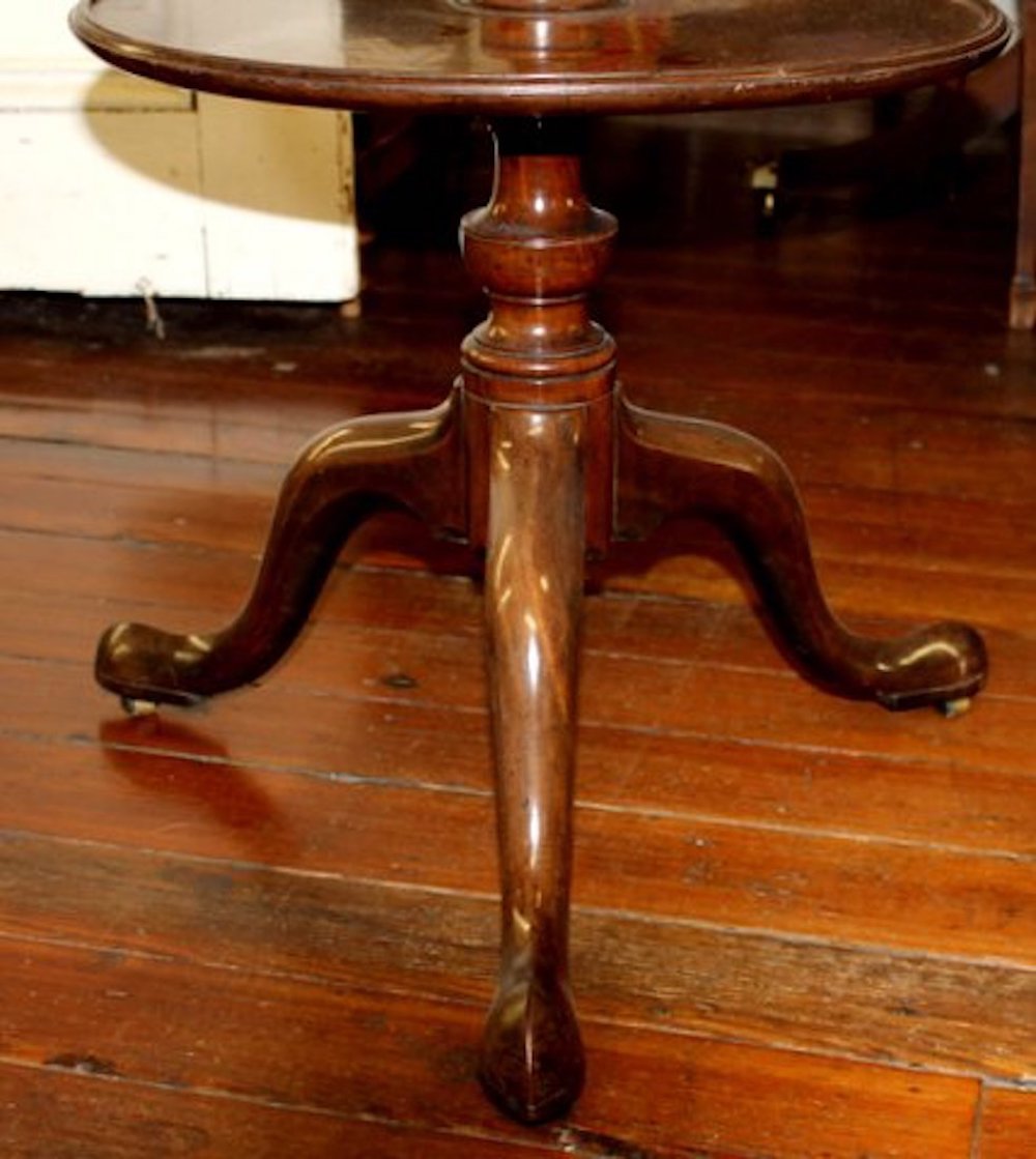 Please note original Georgian pad feet with “jester” toses and original casters beneath; also note handsome spiral carved urn within the turned pedestal. Both tiers revolve.