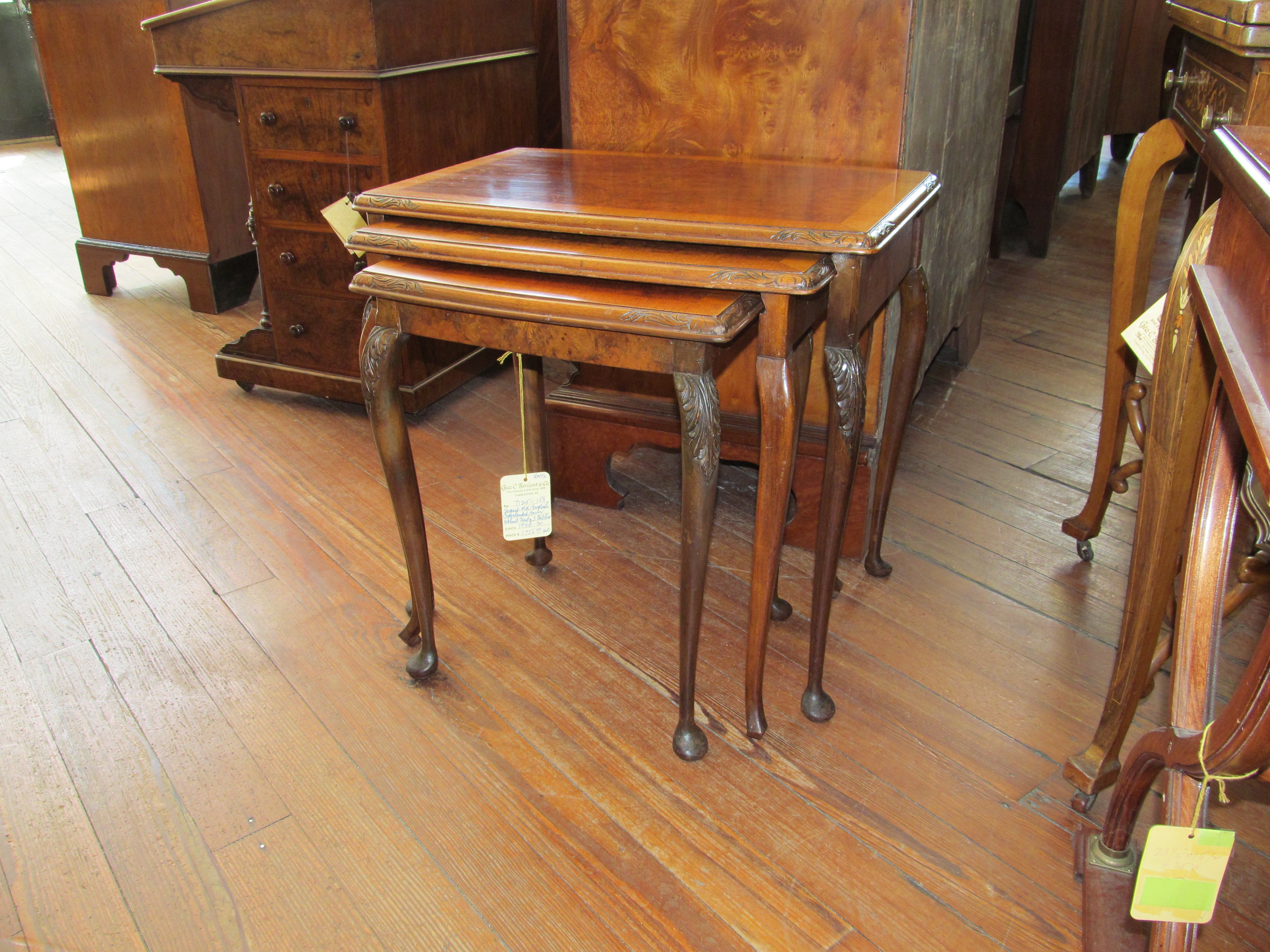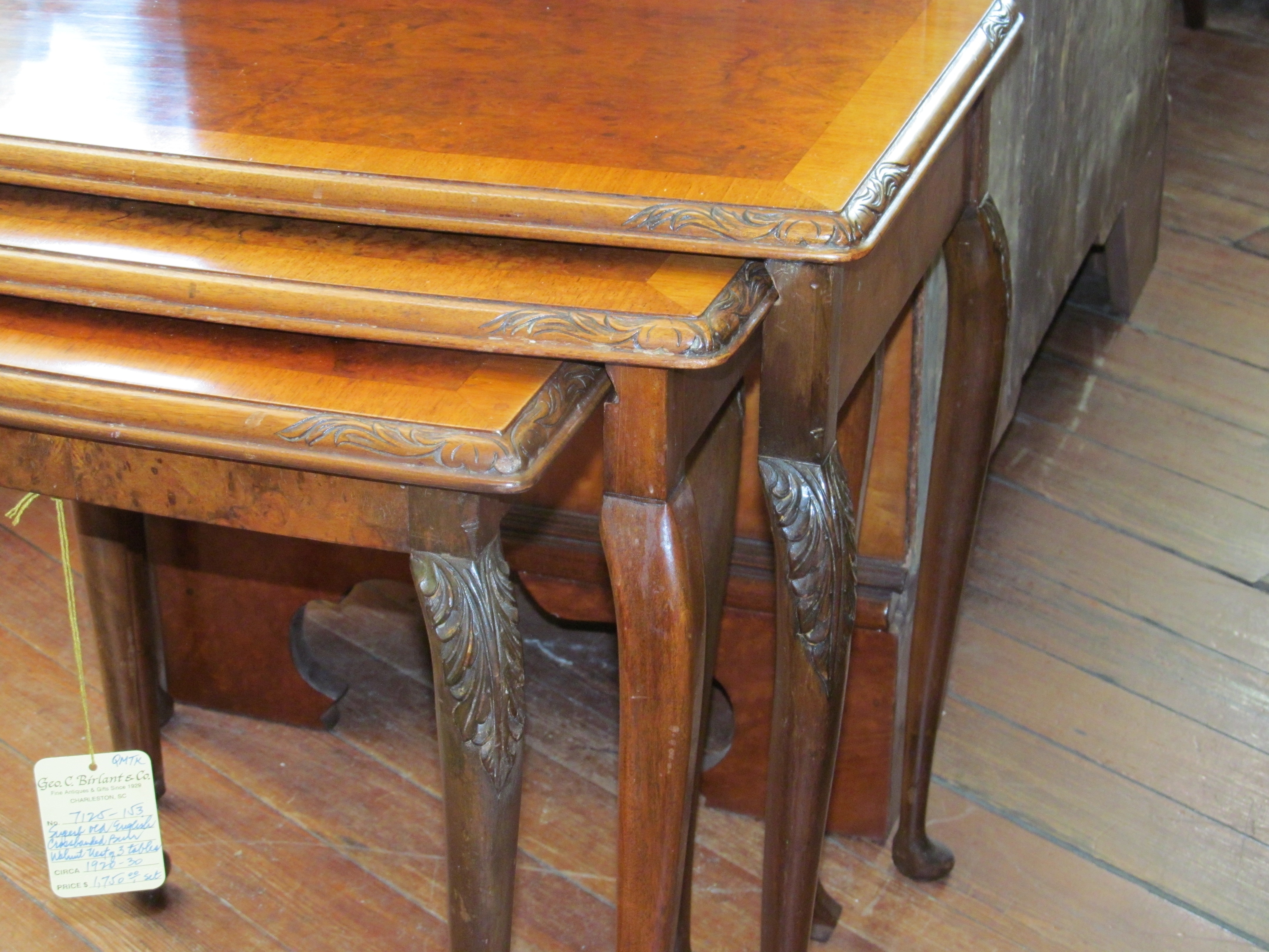 Superb Old English Crossbranded Burr Walnut Nest of 3 Tables.