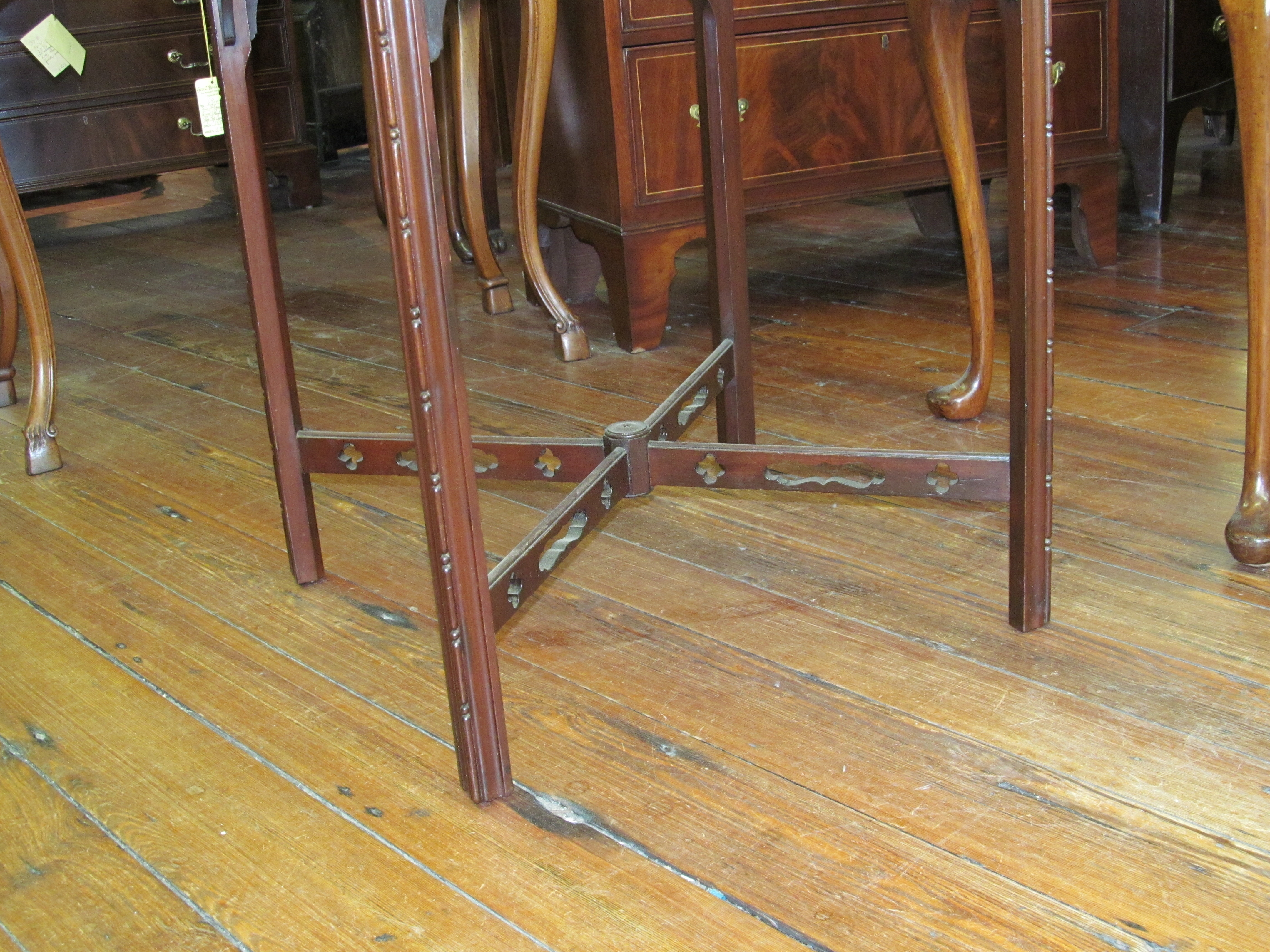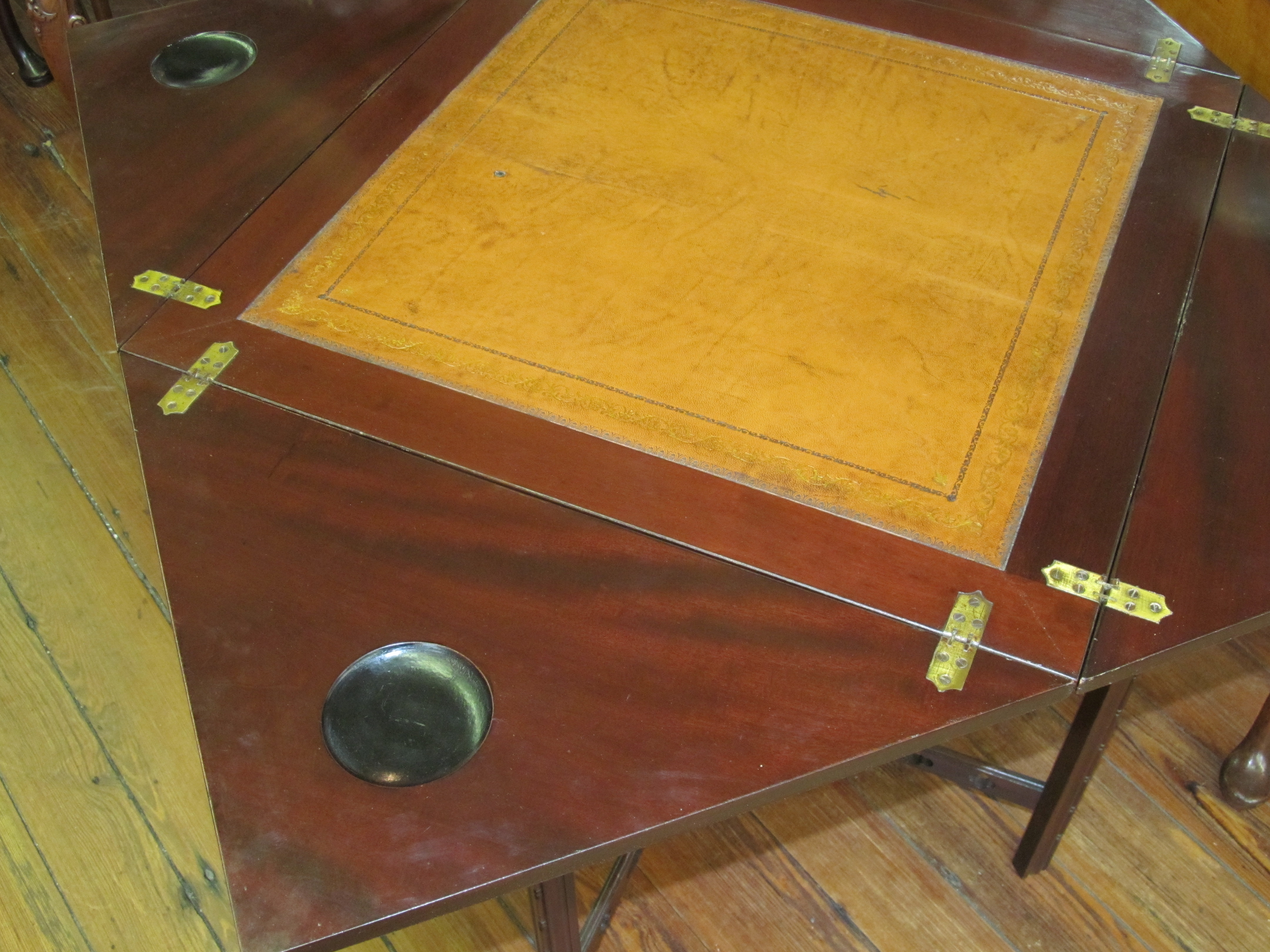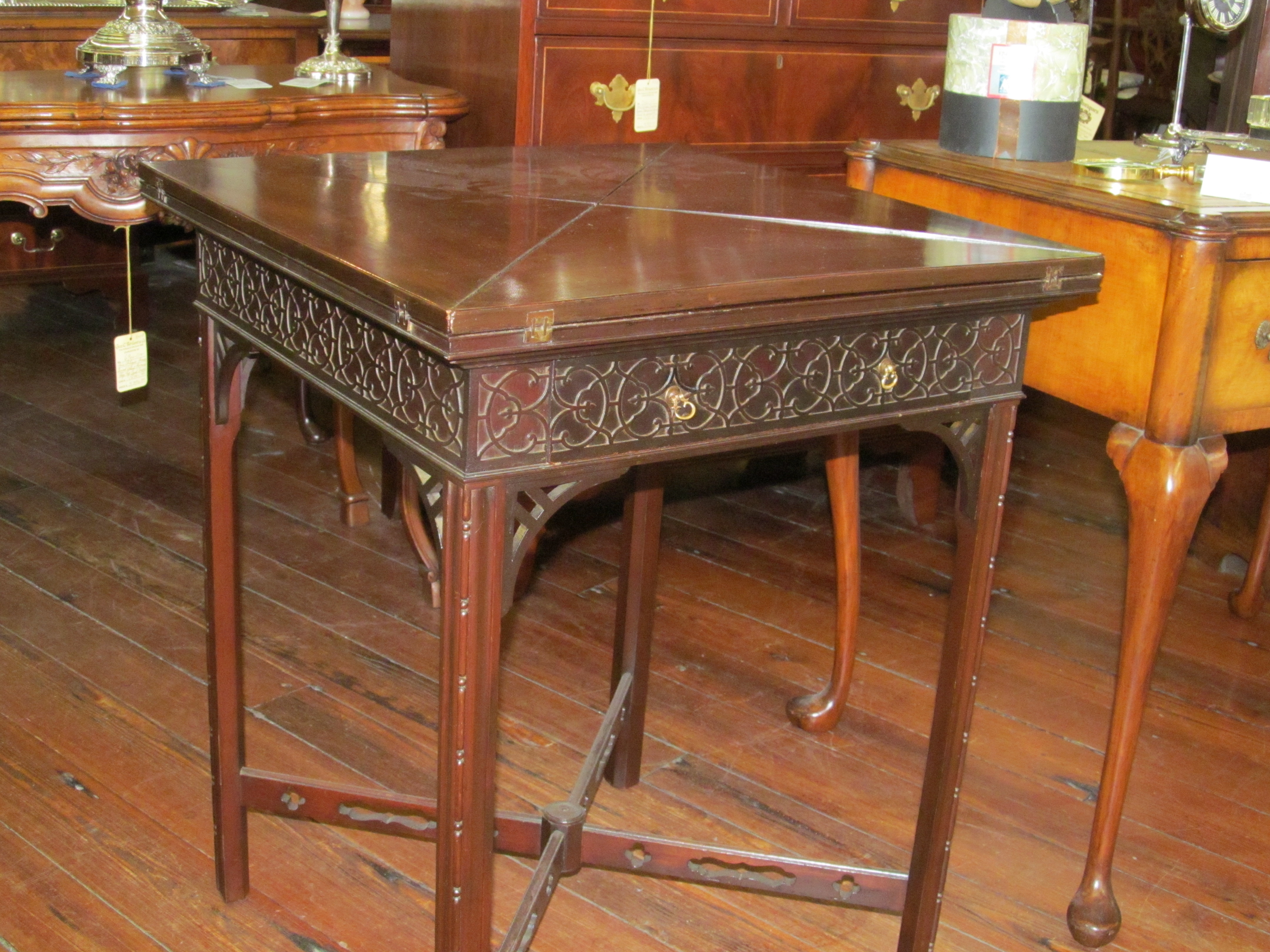 Fabulous Quality Old English Hand Carved and Fretted Solid Mahogany “Chinese Chippendale” Style Envelope folding Card or Games Table with tooled leather.