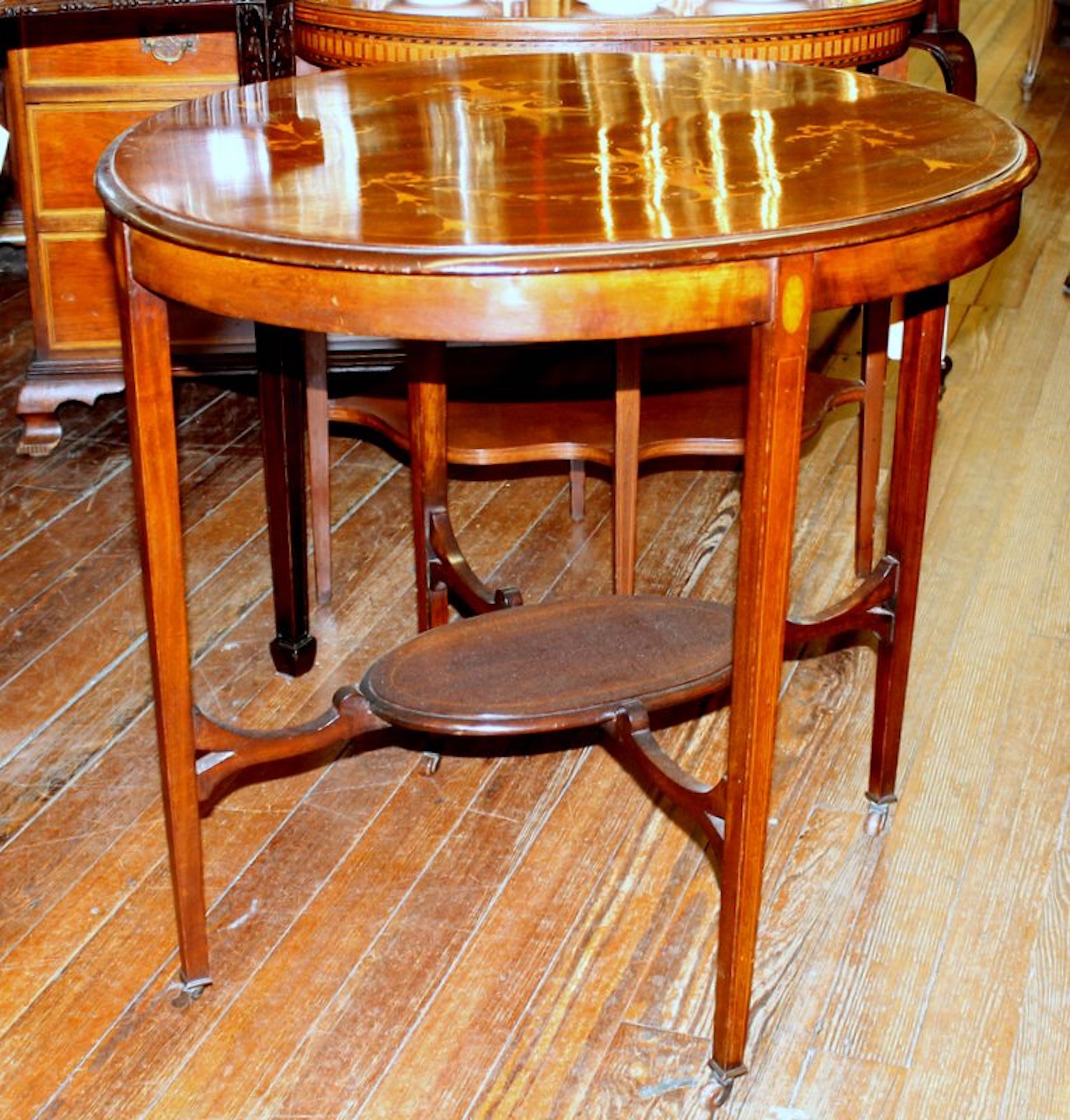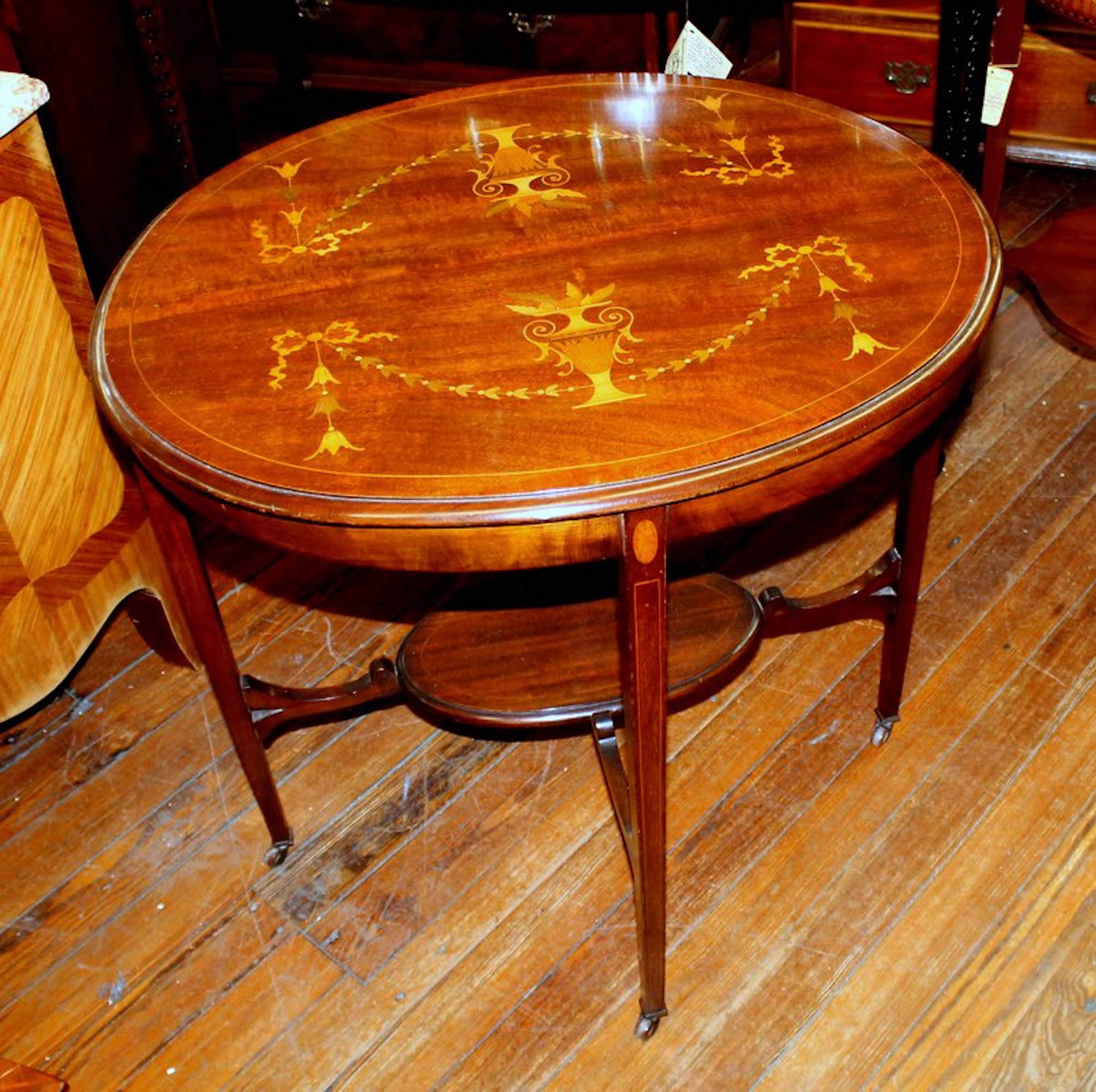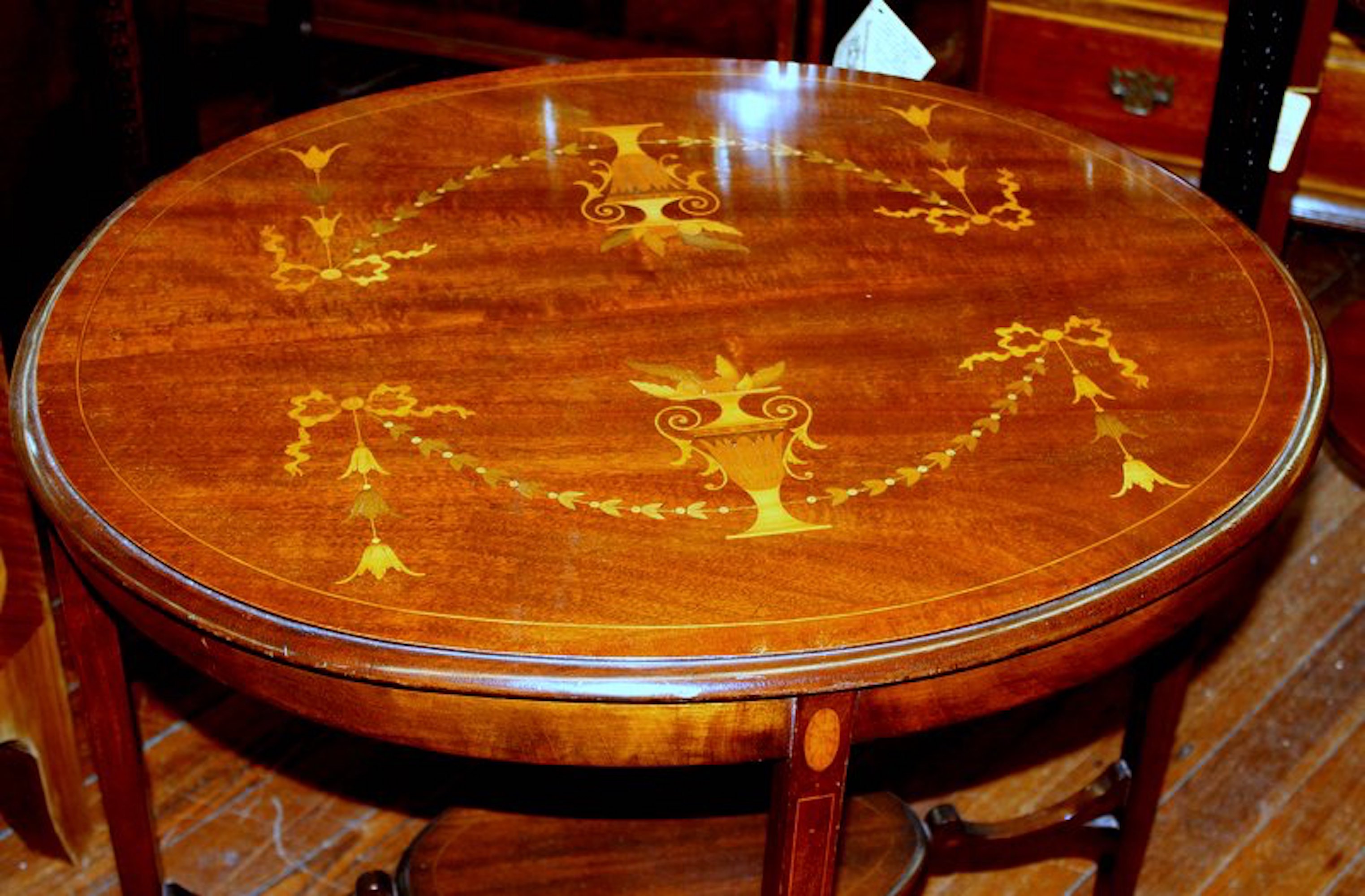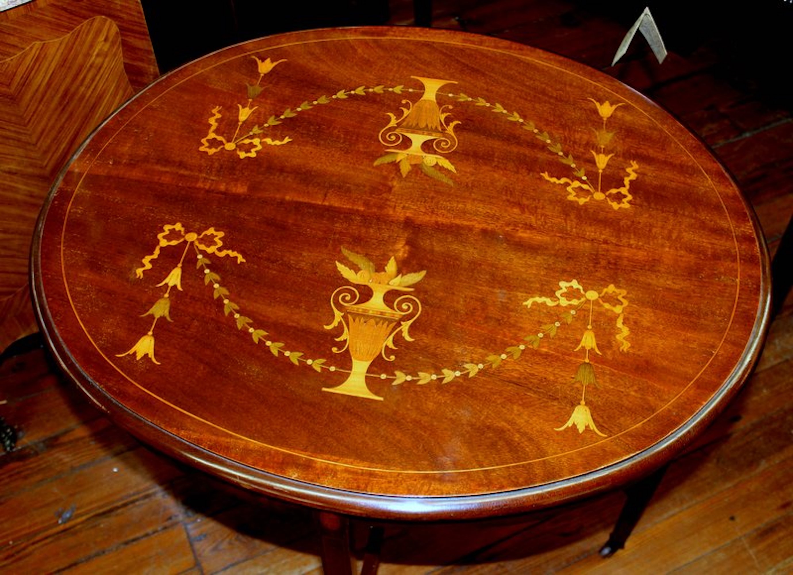 You are here: Home / All Inventory / Old English Marquetry Inlaid Mahogany “Adam” Style Occasional Table
