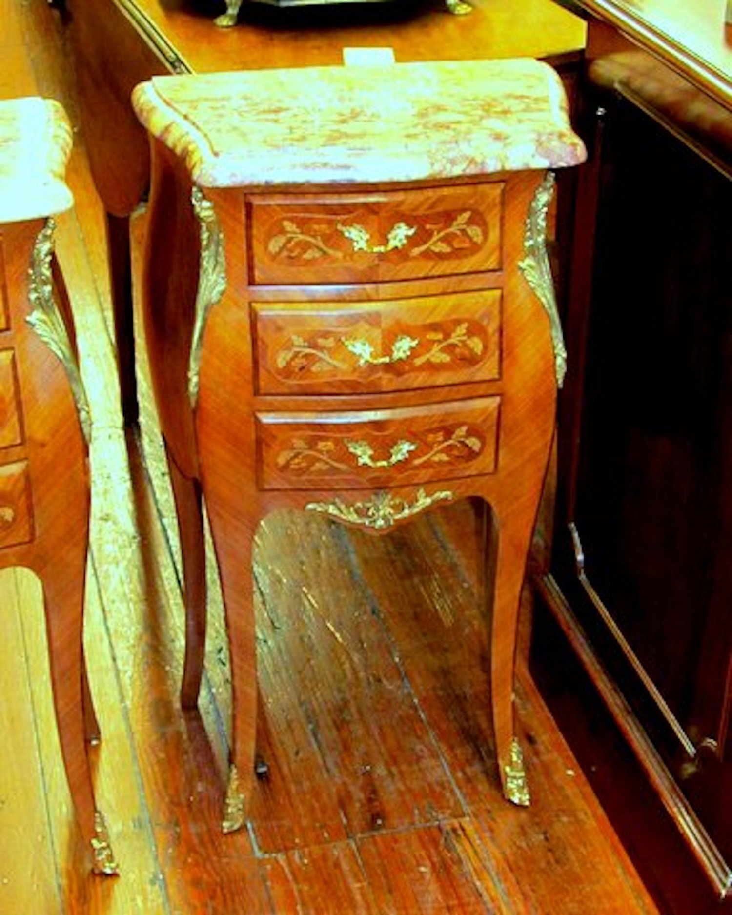 PAIR of Old French Marble Top 3- Drawer Bedside Tables - Image 3