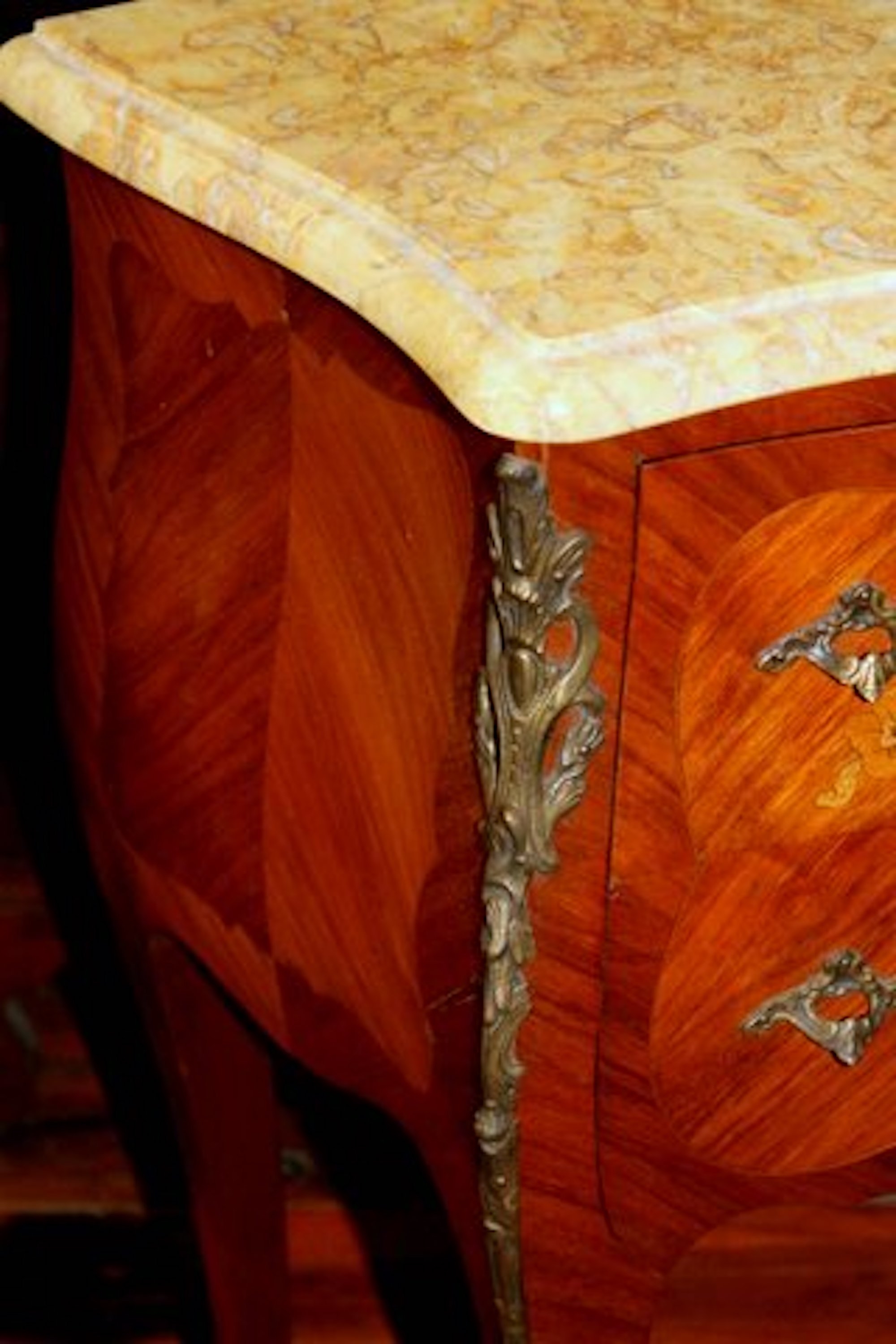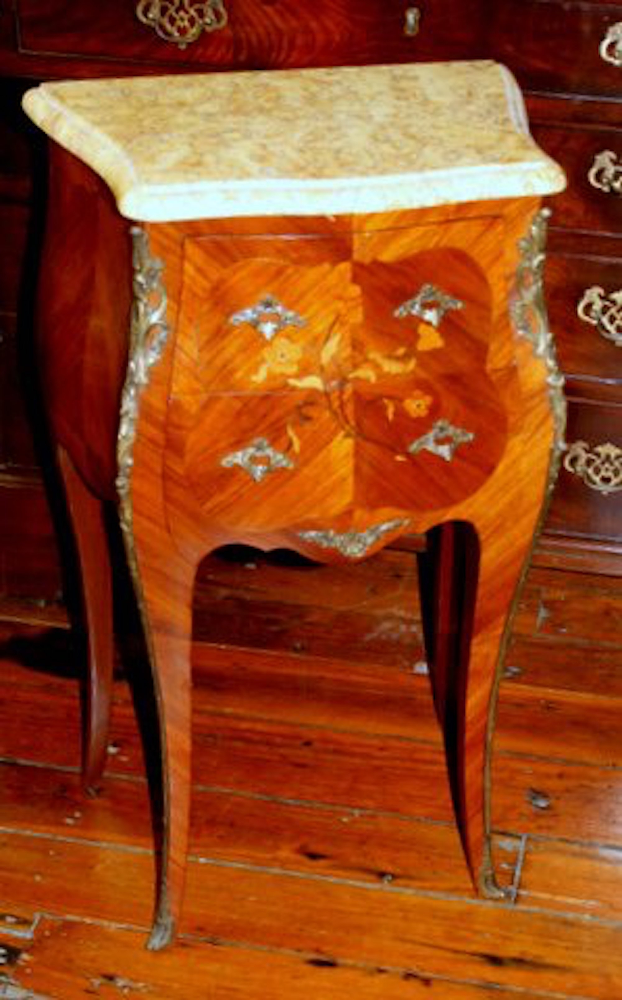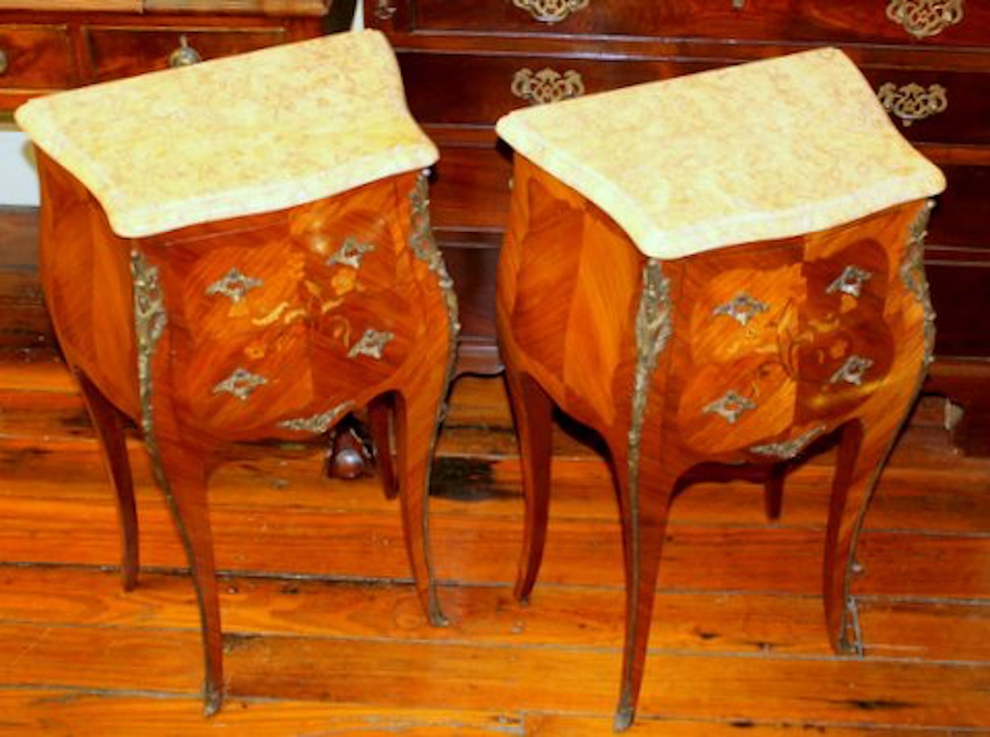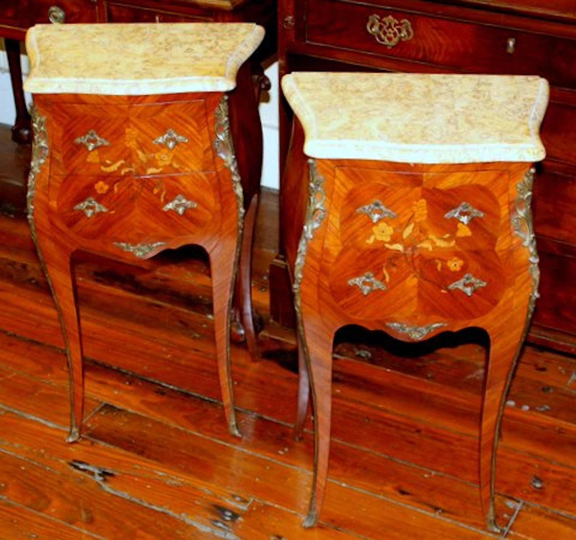 PAIR of Fine Quality Old French Marquetry Inlaid Kingwood Chair-side or Bedside Table with Ormolu Mounts and Marble Tops