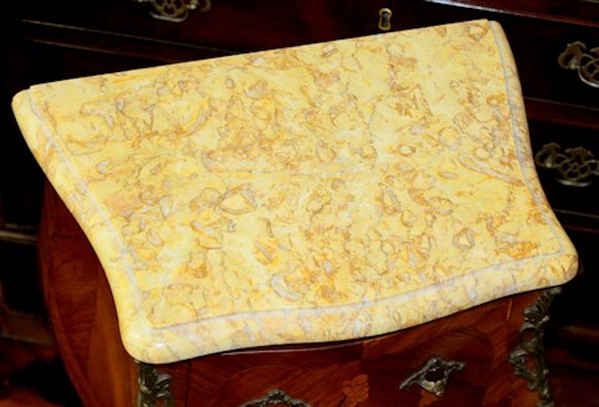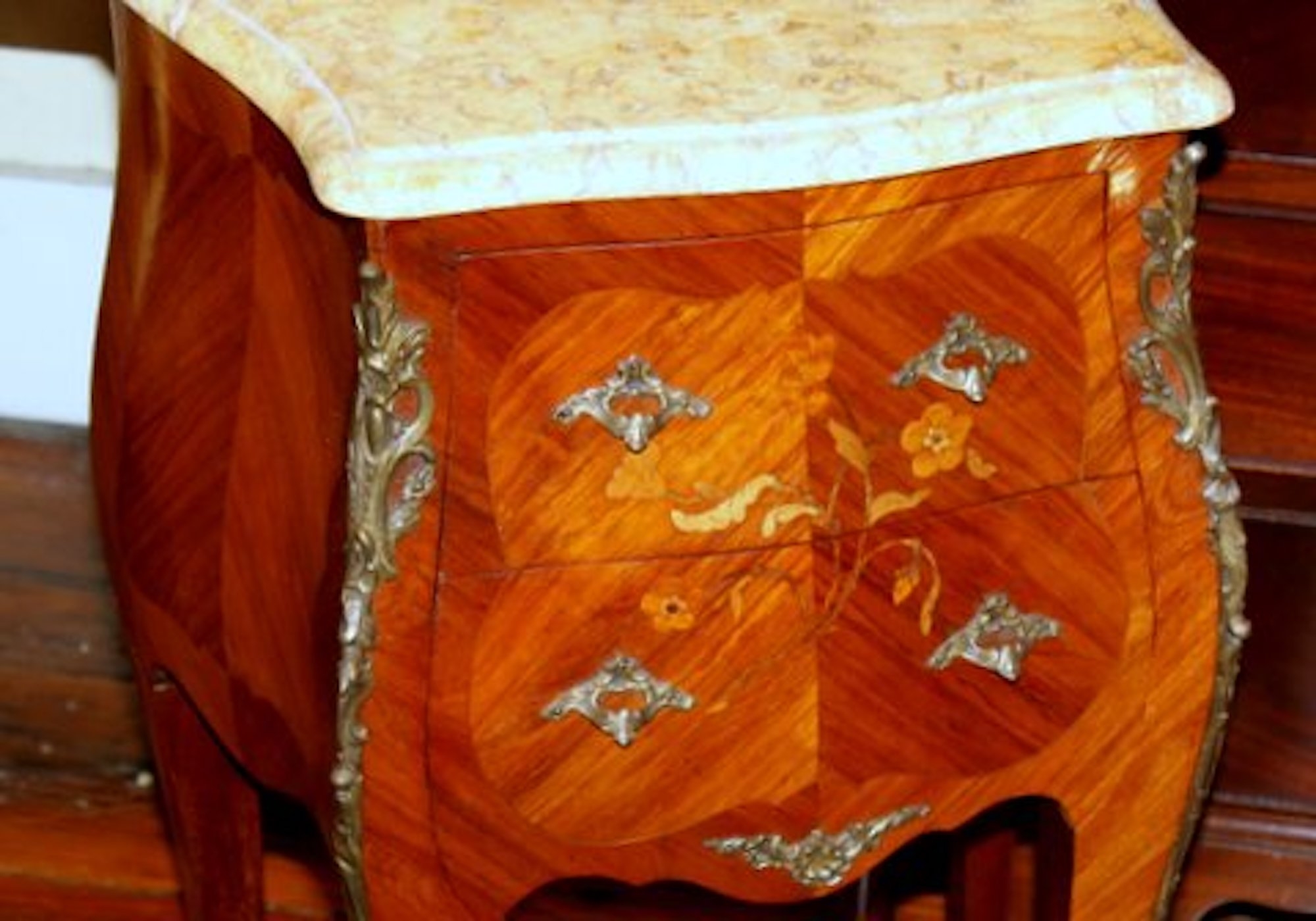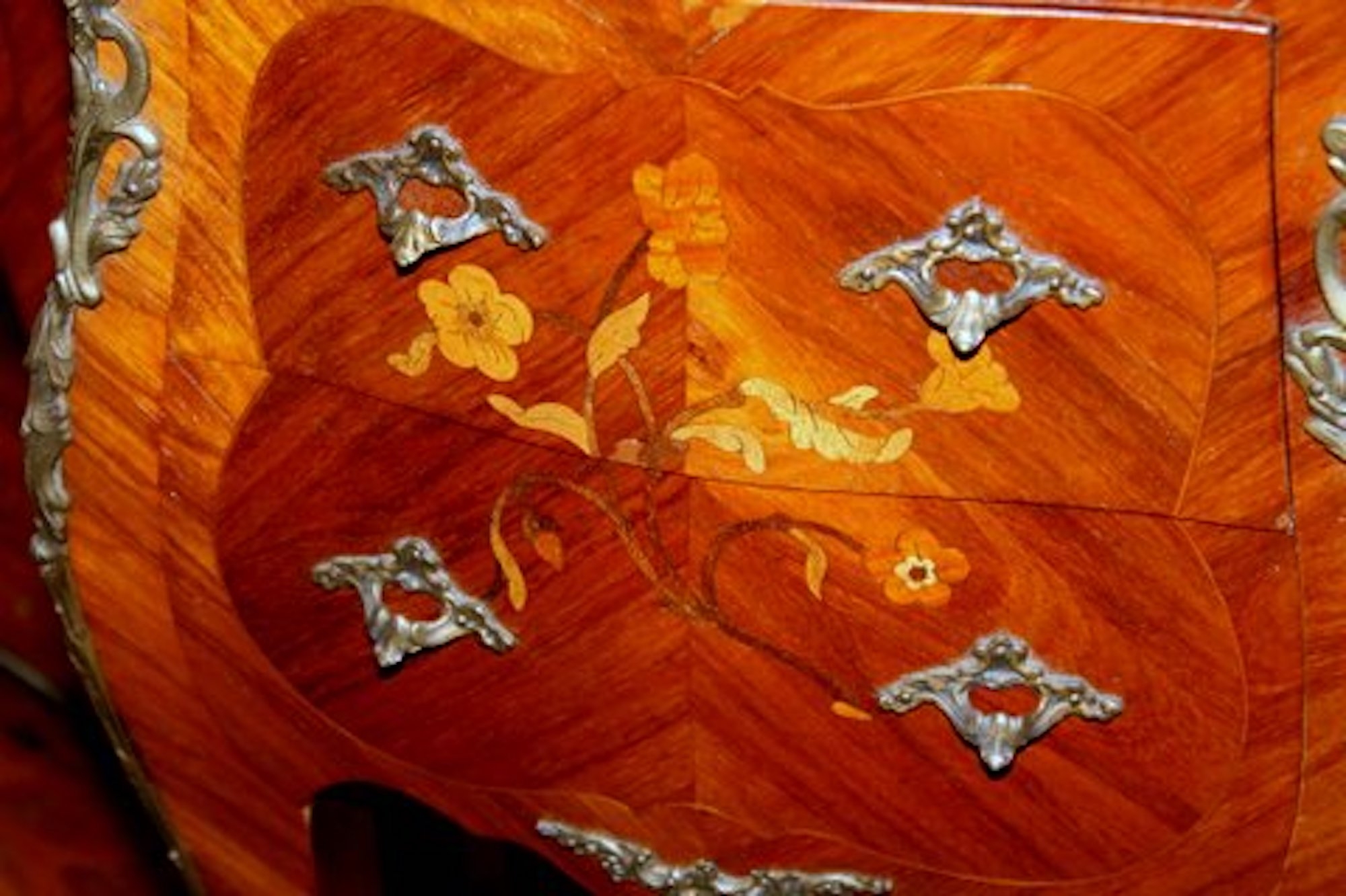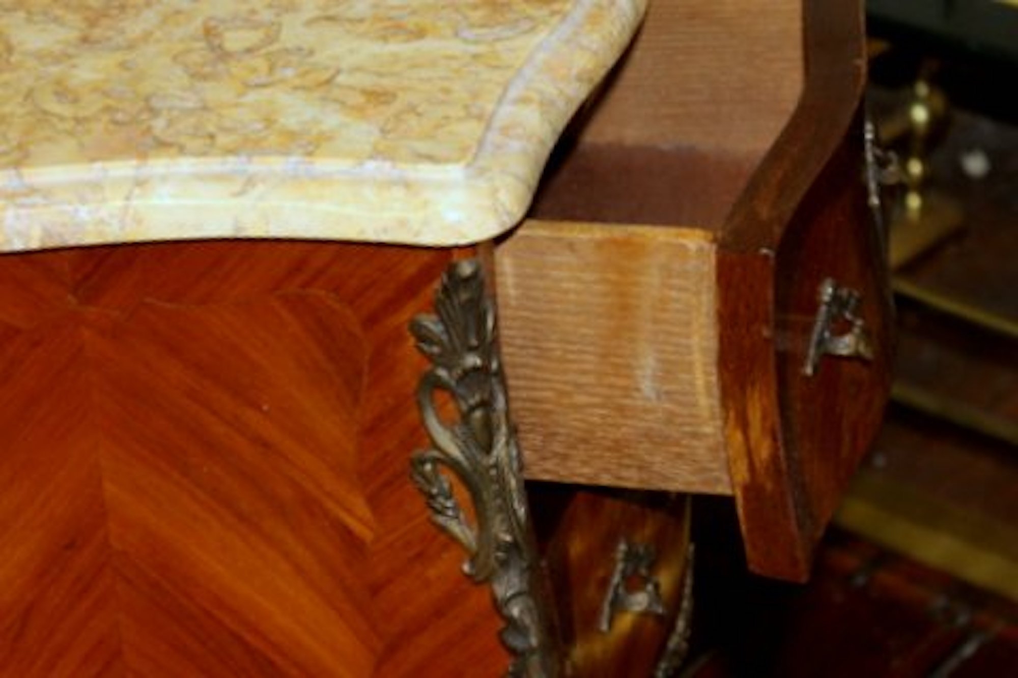 PAIR of Fine Quality Old French Marquetry Inlaid Kingwood Chair-side or Bedside Table with Ormolu Mounts and Marble Tops