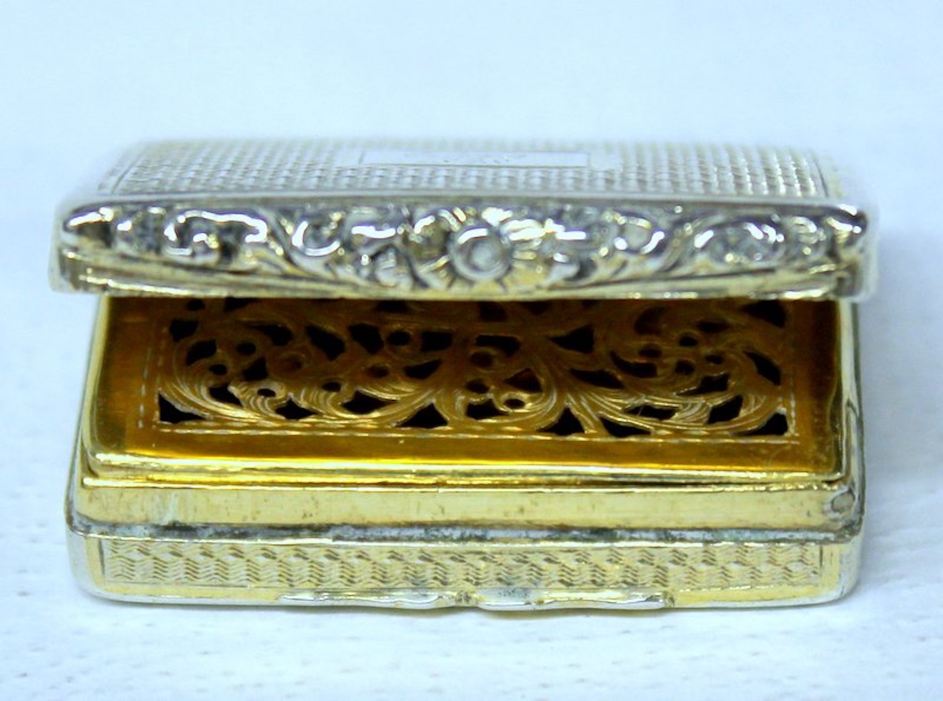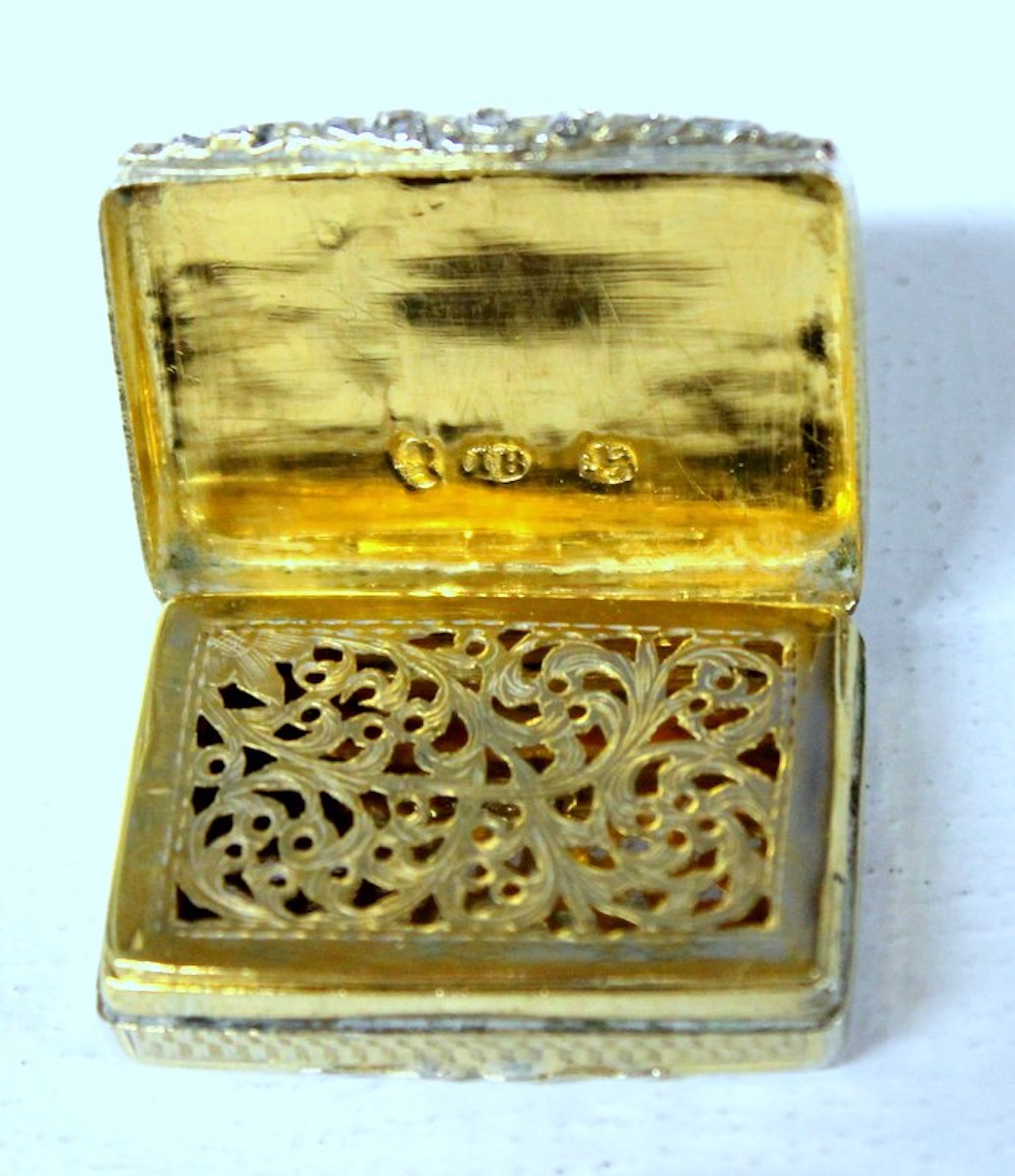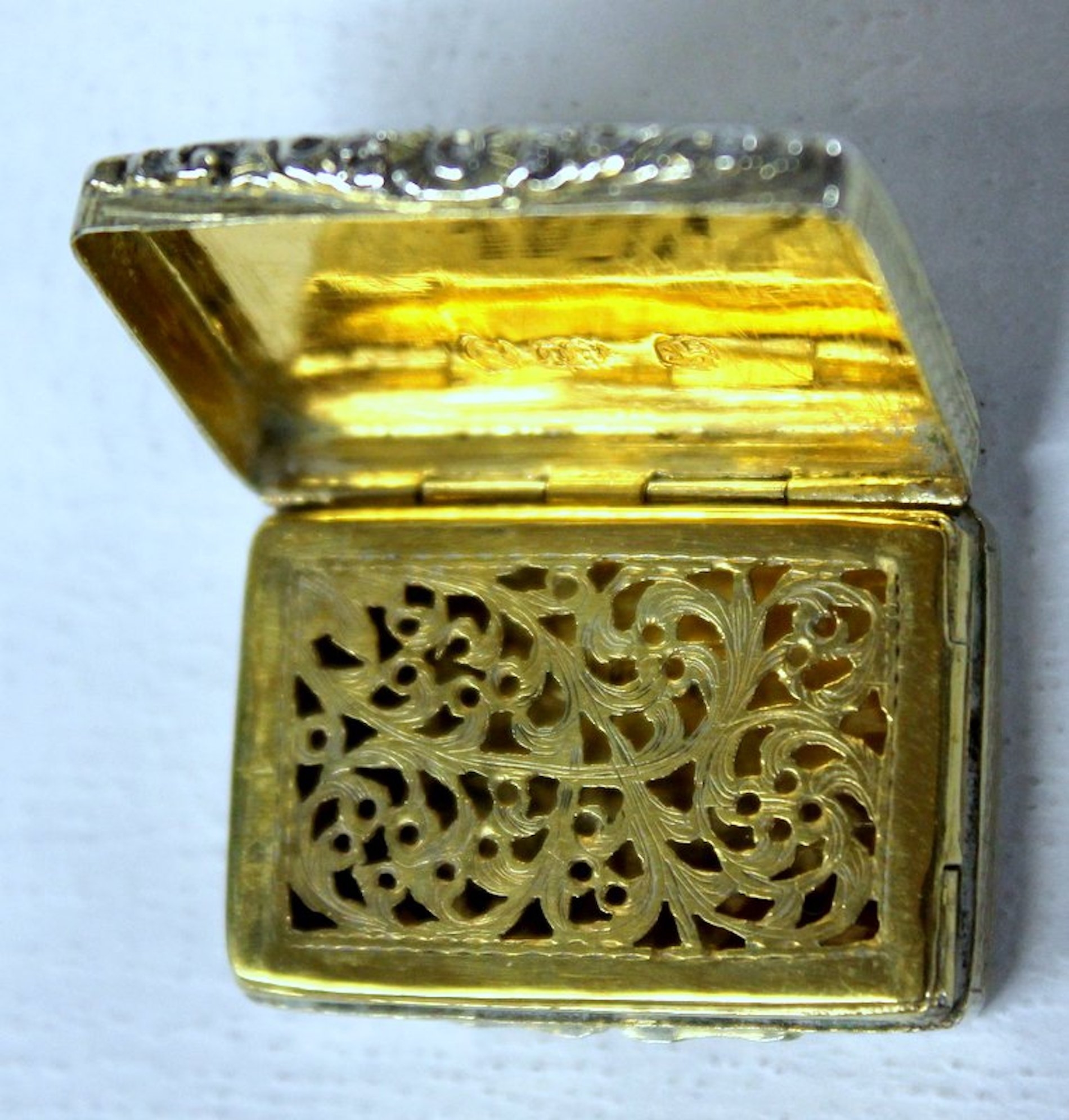 Highly Prized Antique English Hand Engraved Vinaigrette with Vermeil Pierced Grille Hallmarks
