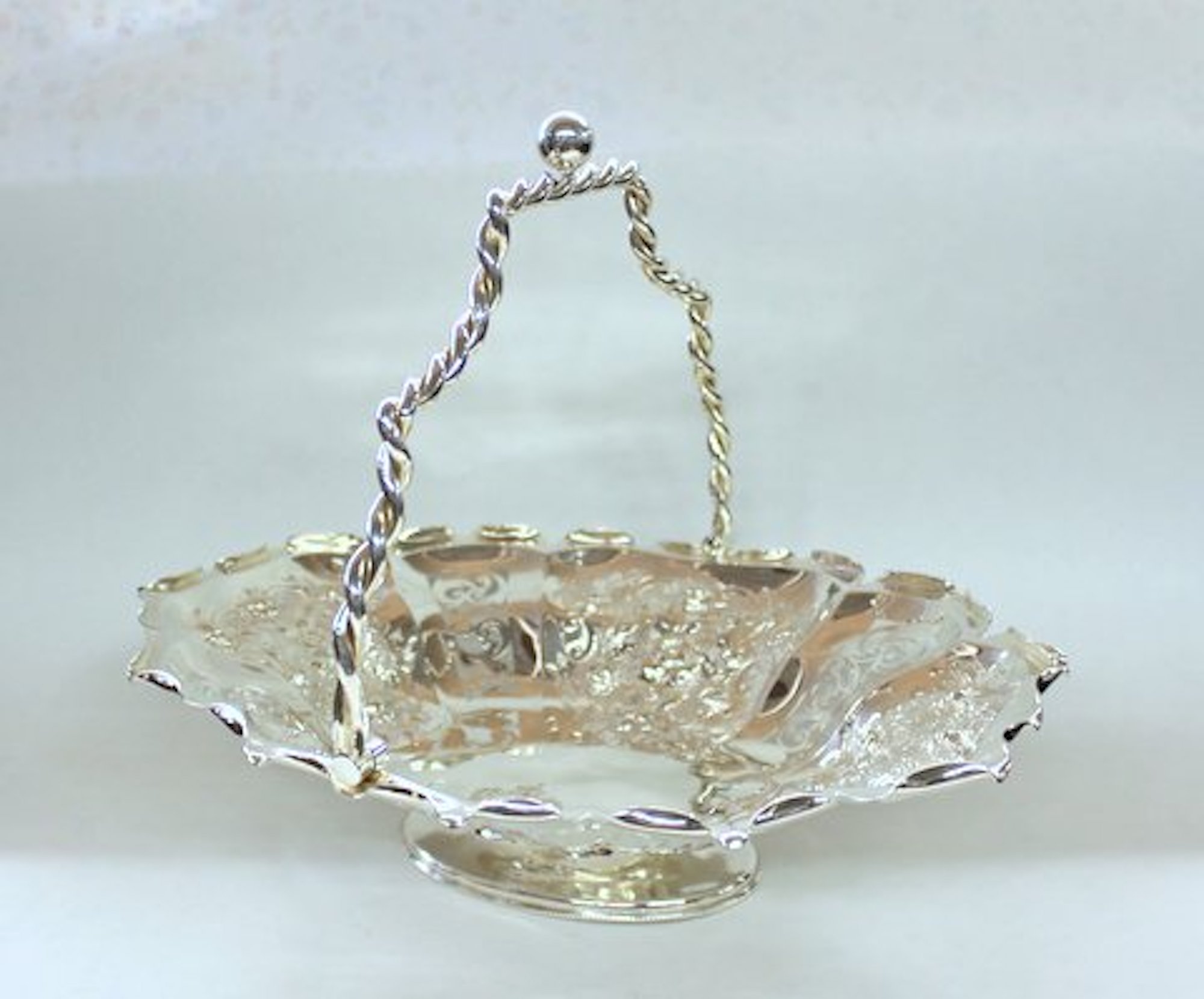 You are here: Home / All Inventory / Hand Chased and Pierced Oblong Cake or Bread Basket