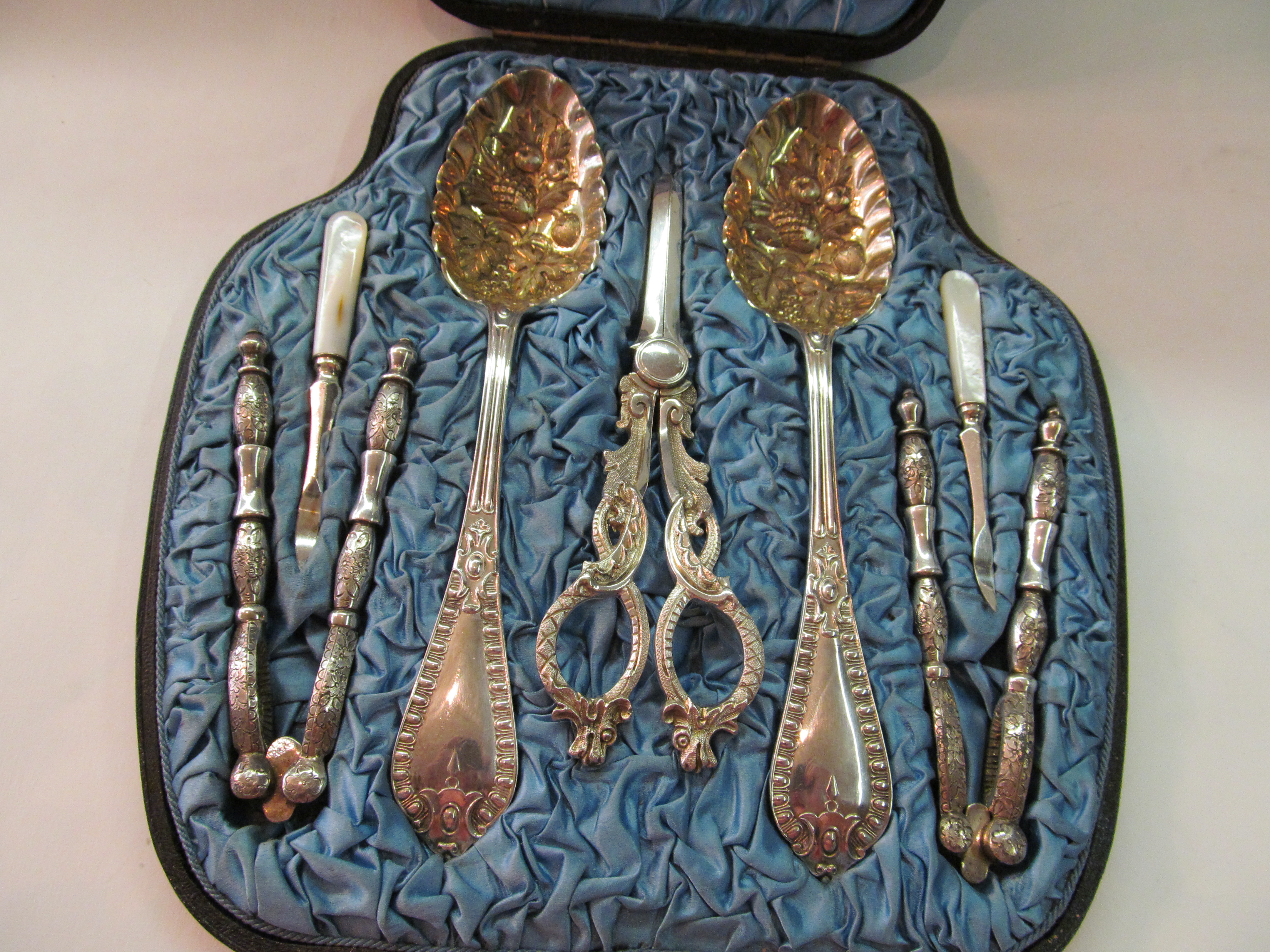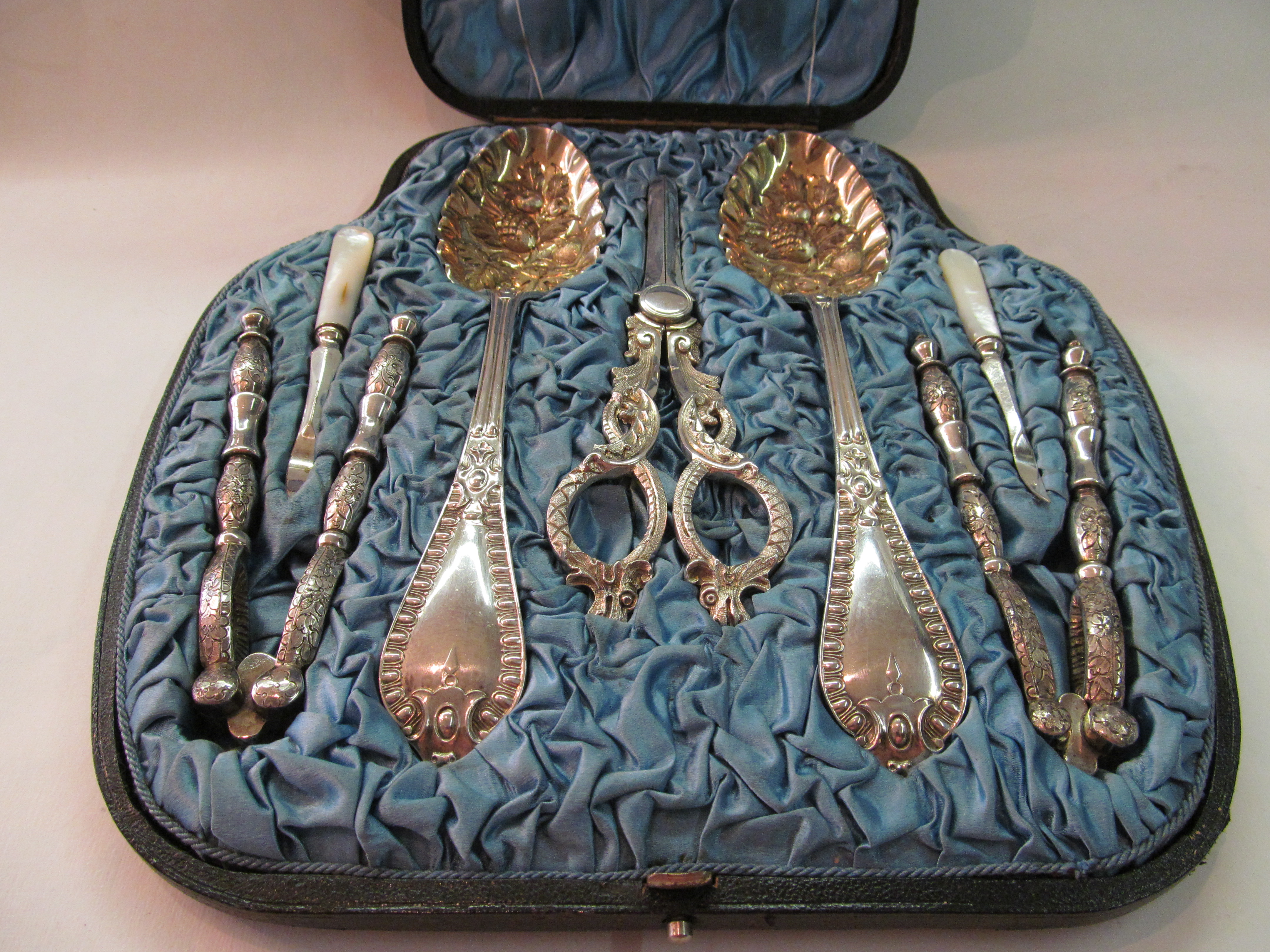 Finest Antique English Silverplate Hand Chased and Engraved 7 pc. Berry, Grape, and Nut set in Original Case.