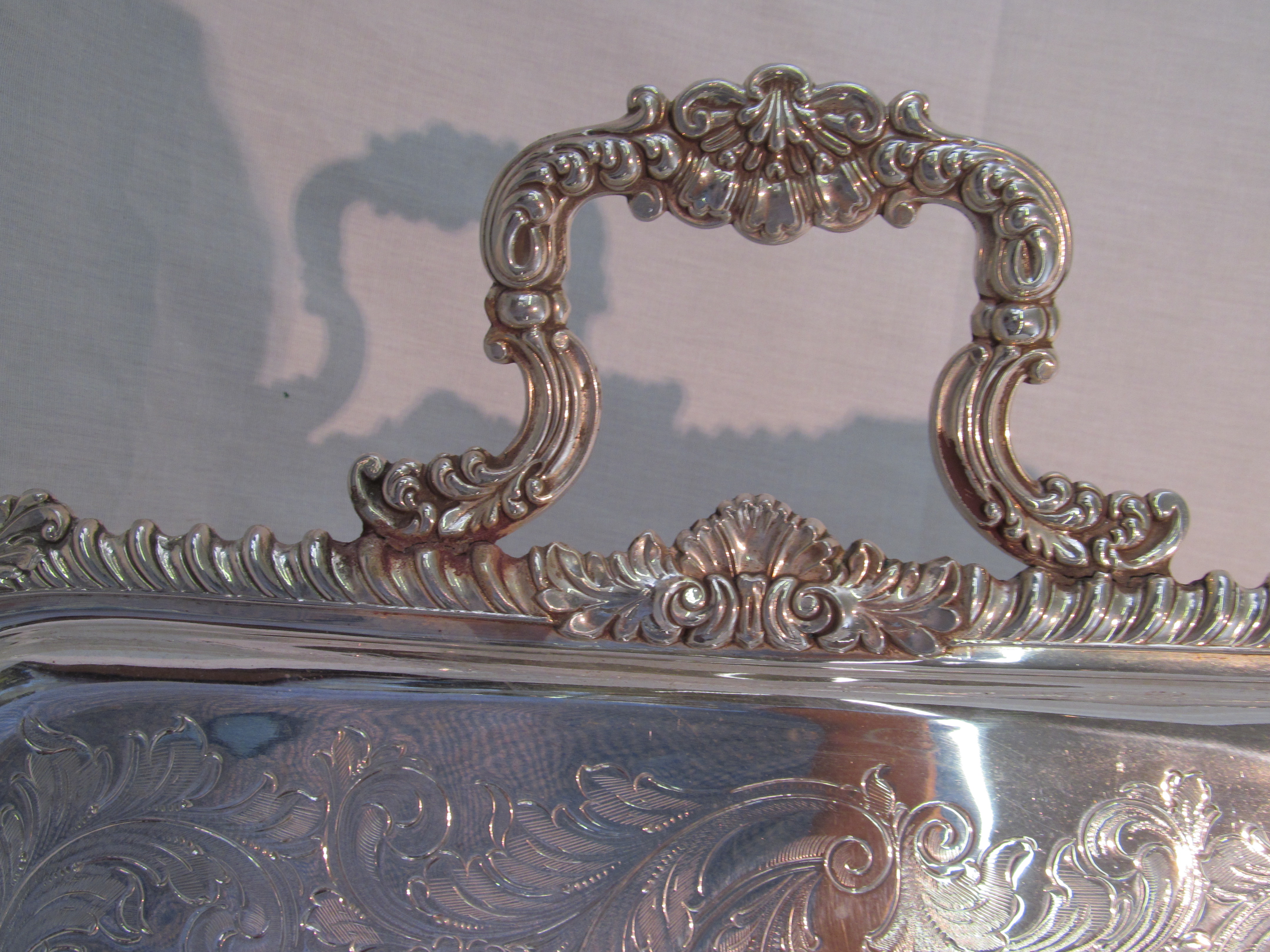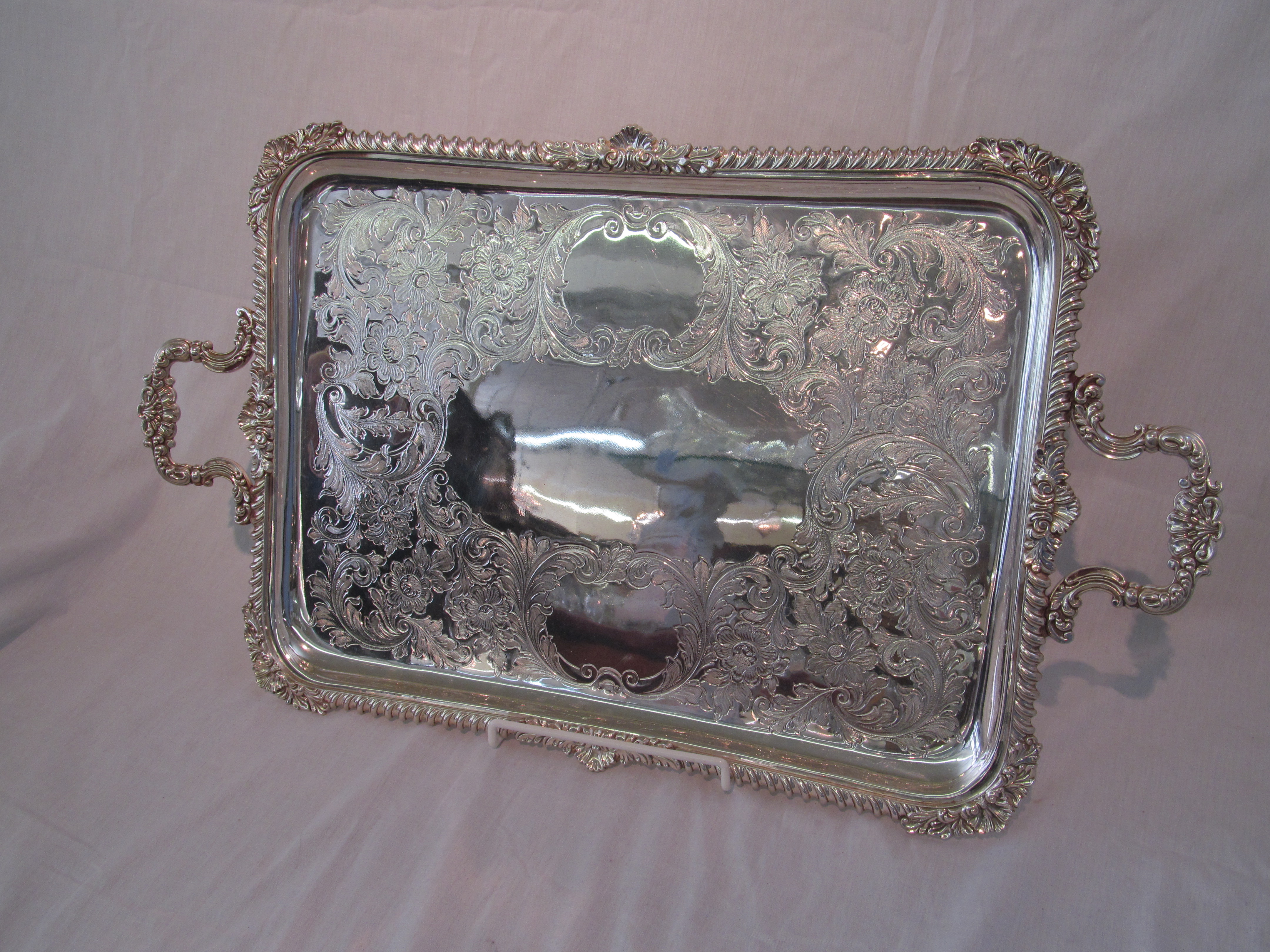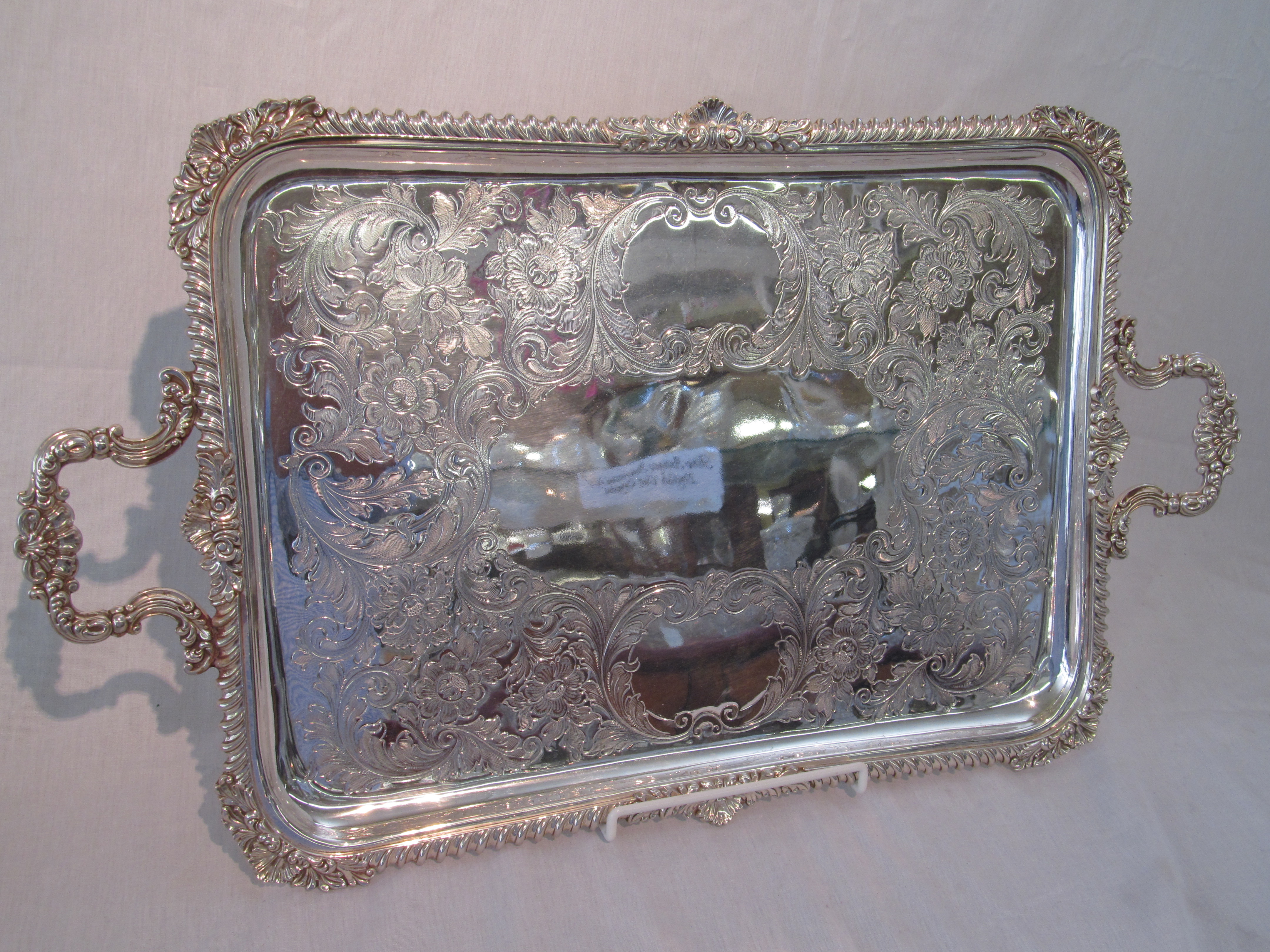 Great Quality Antique English Silverplate Hand Chased Gadroon and Shell Border Tea Tray.