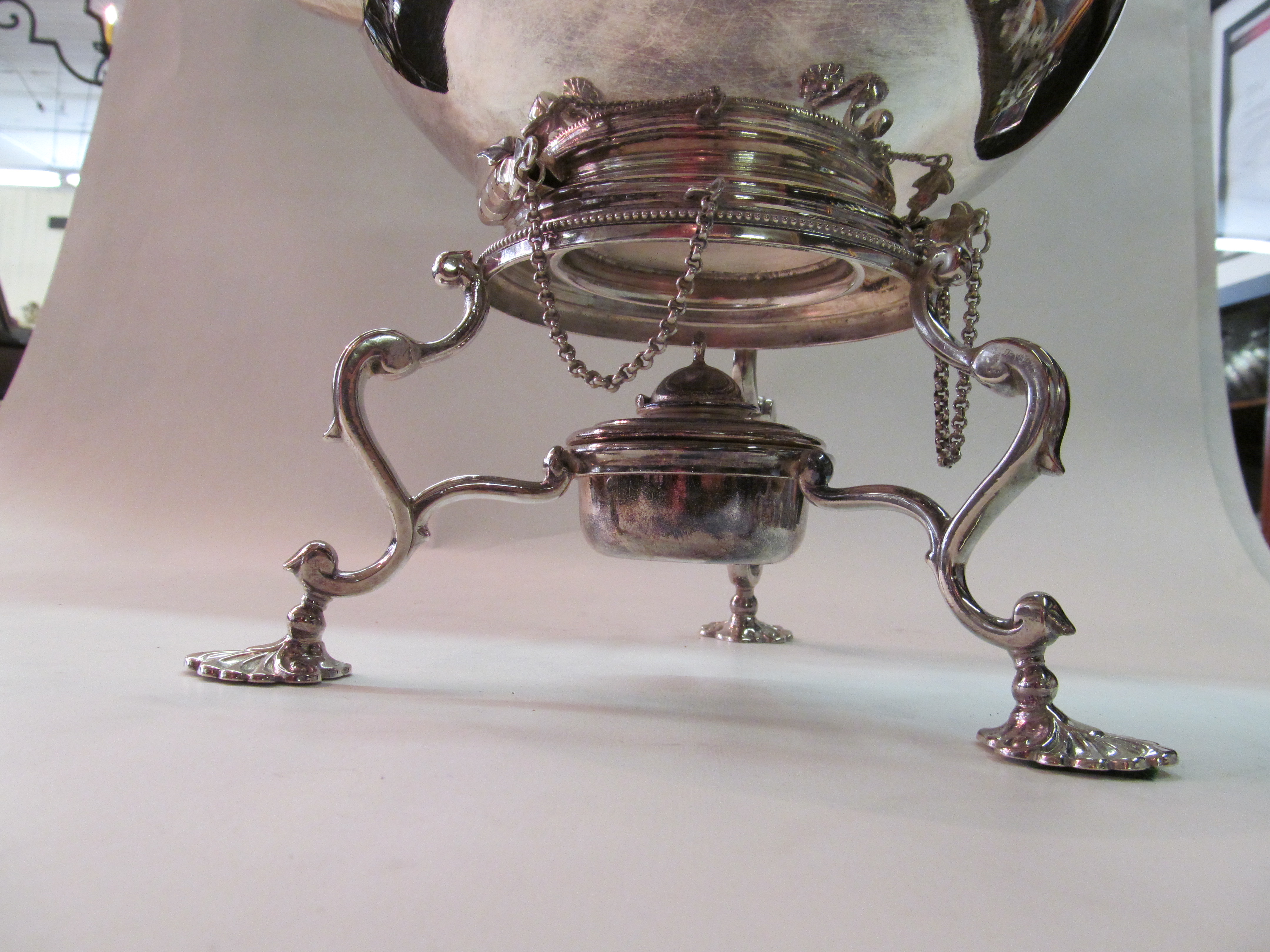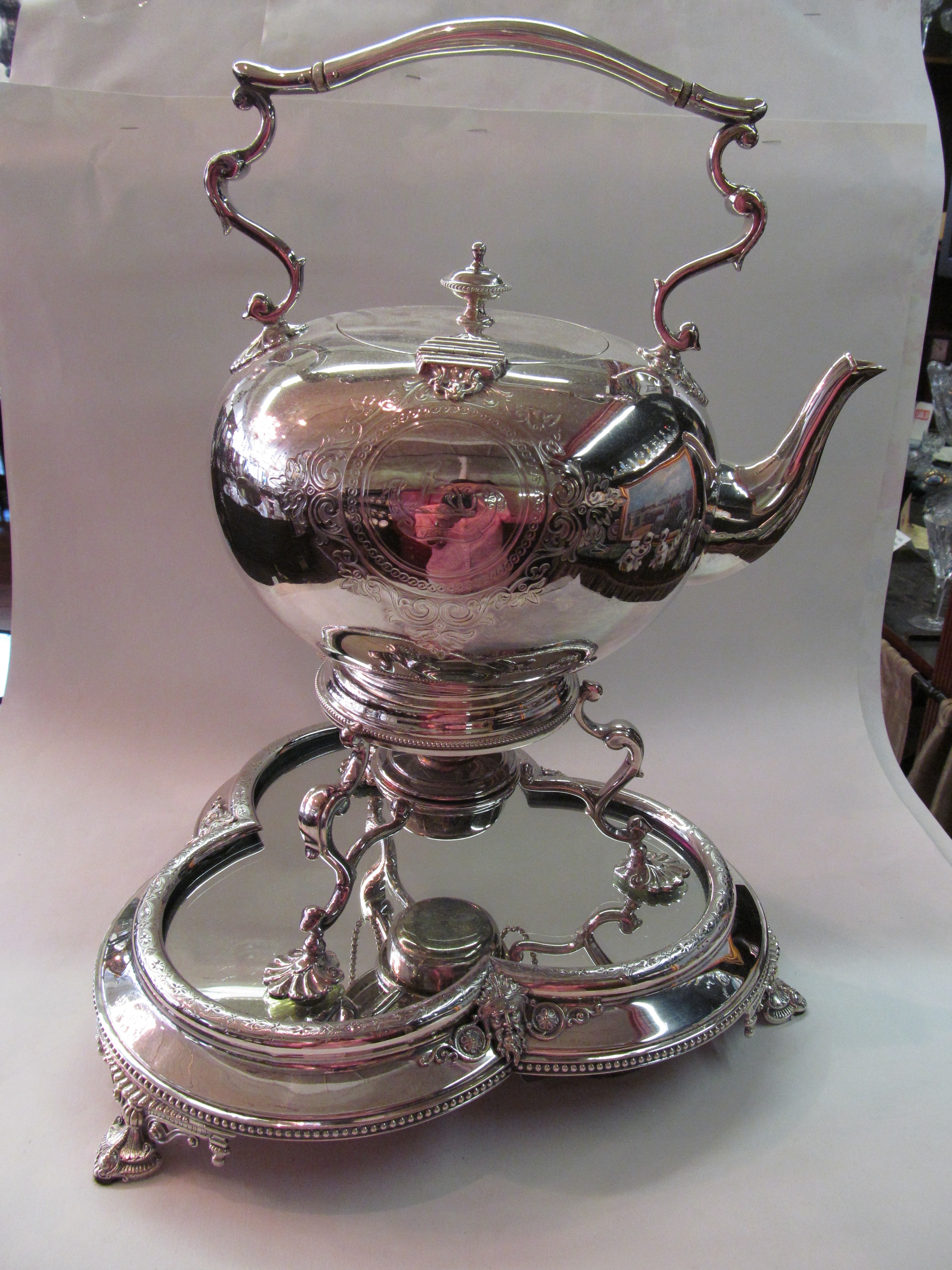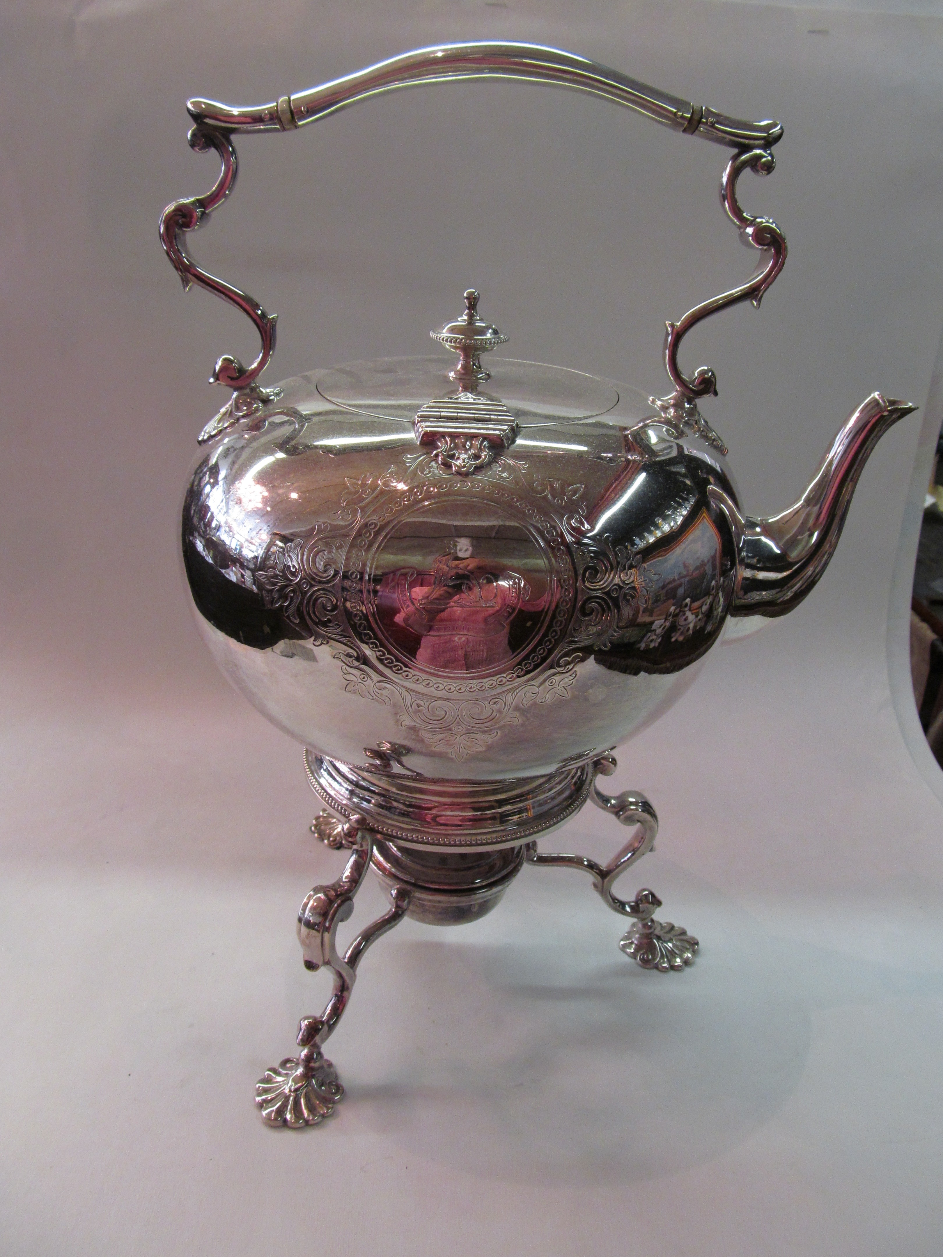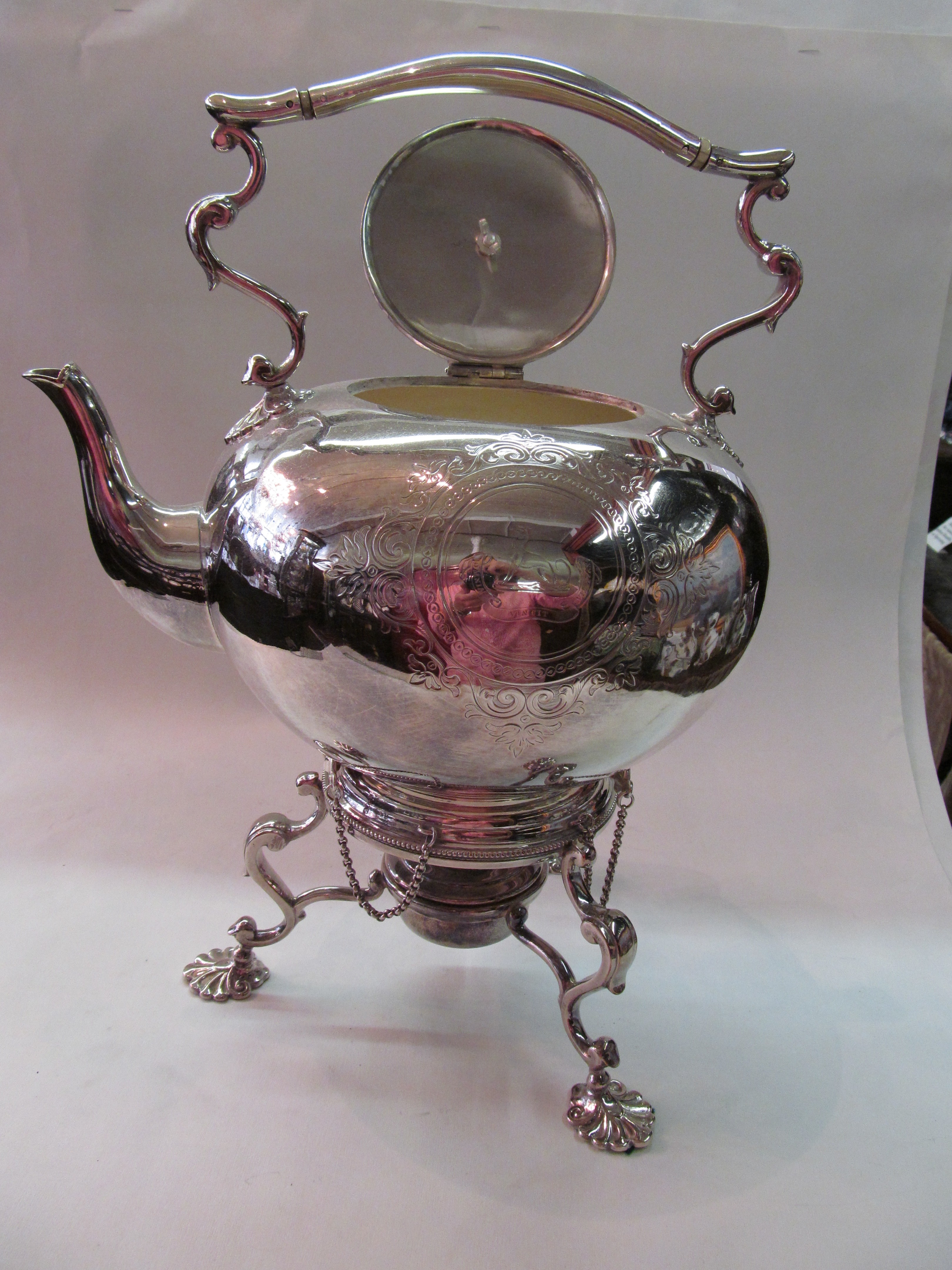 Antique English Silverplate Fabulous quality, hand-engraved and crested hot water kettle on stand with burner.